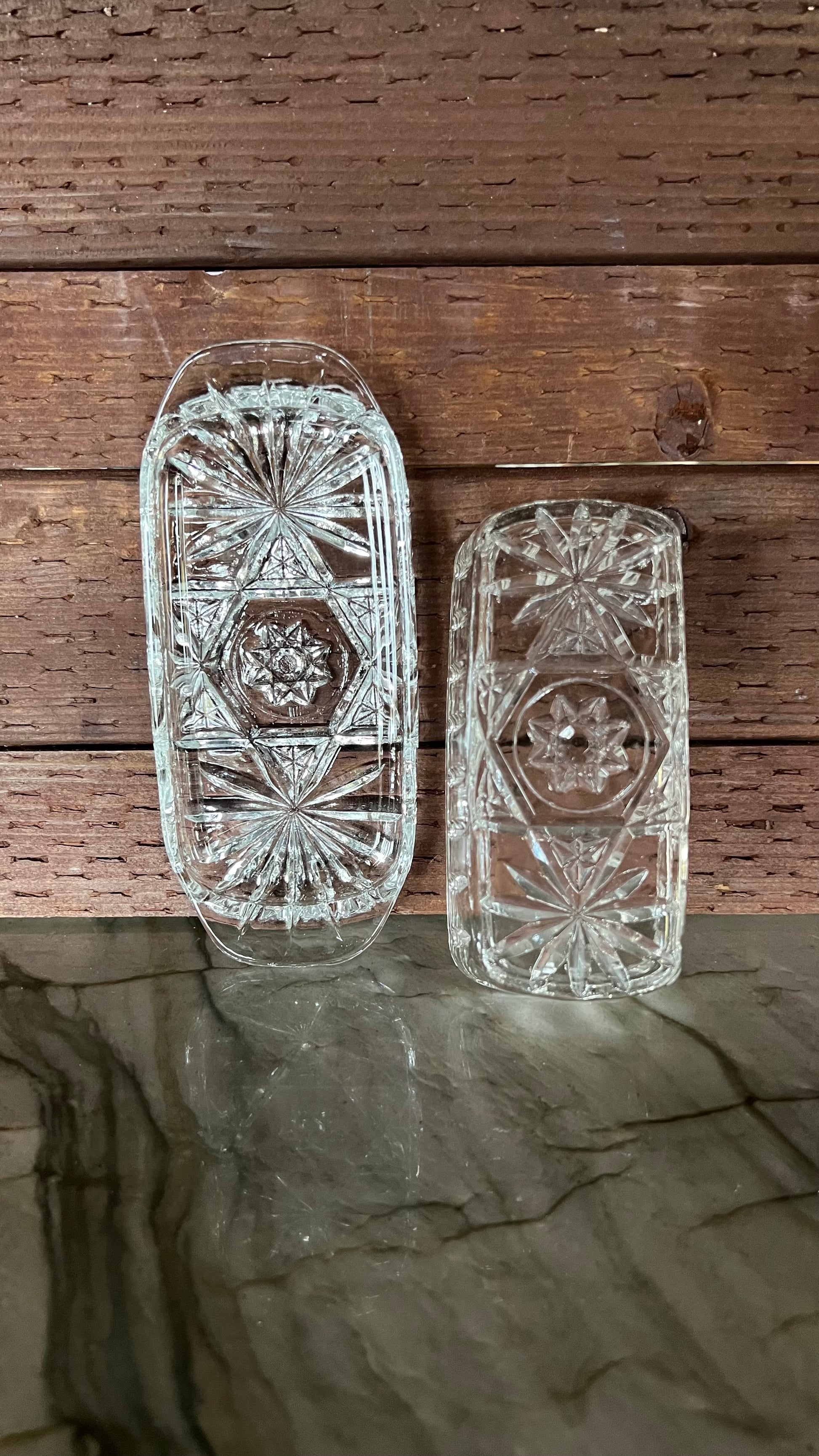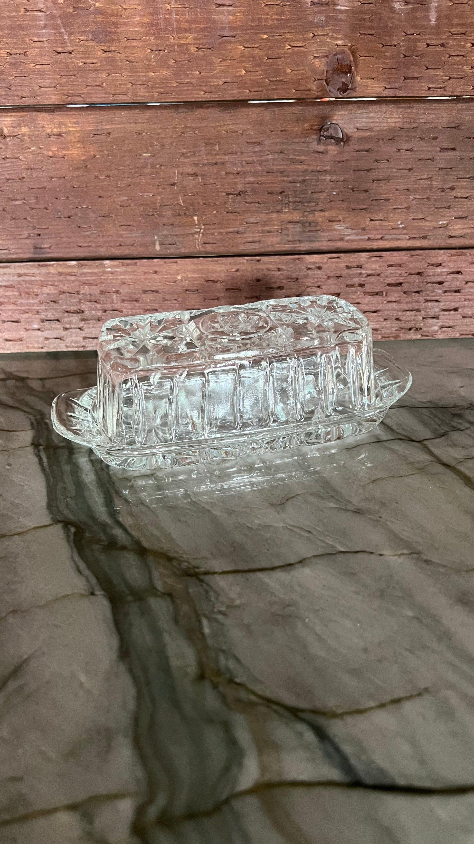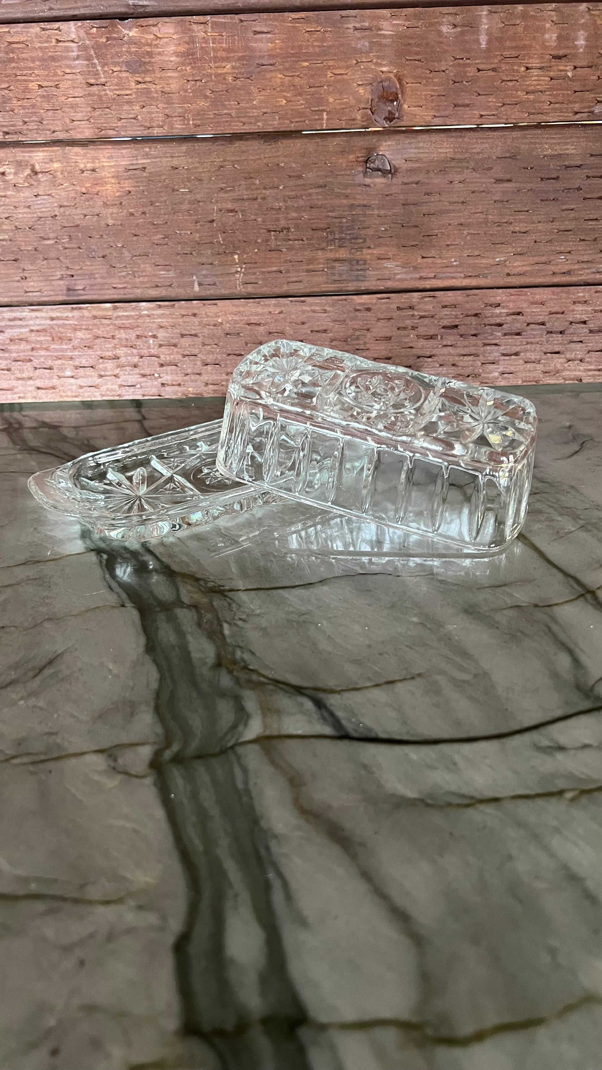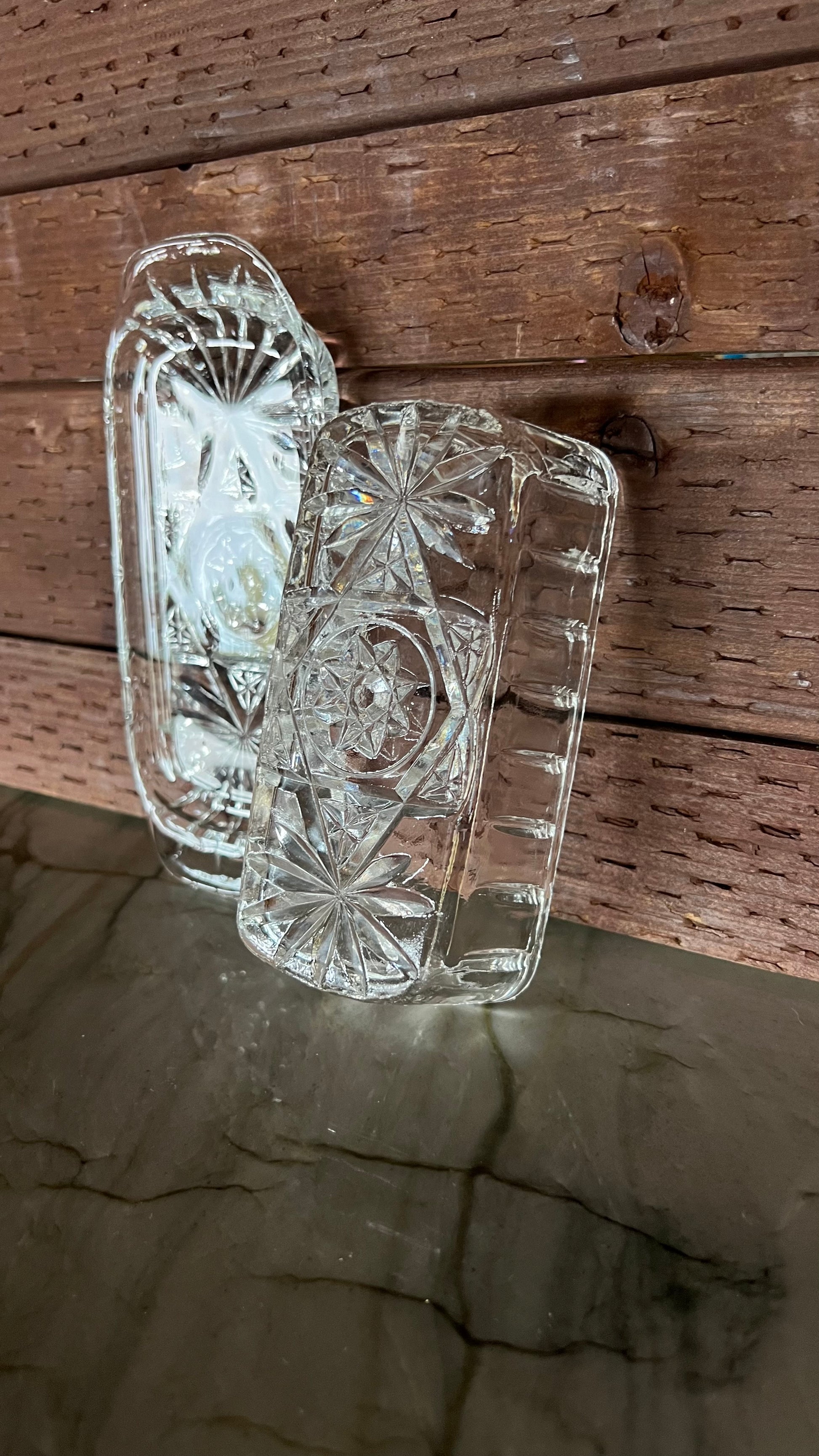 Vintage Anchor Hocking butter dish. This pattern is described as the Star of David, or a starburst. It measures about 7.25” from handle to handle of the base. This piece is in excellent vintage condition, no chips or cracks.