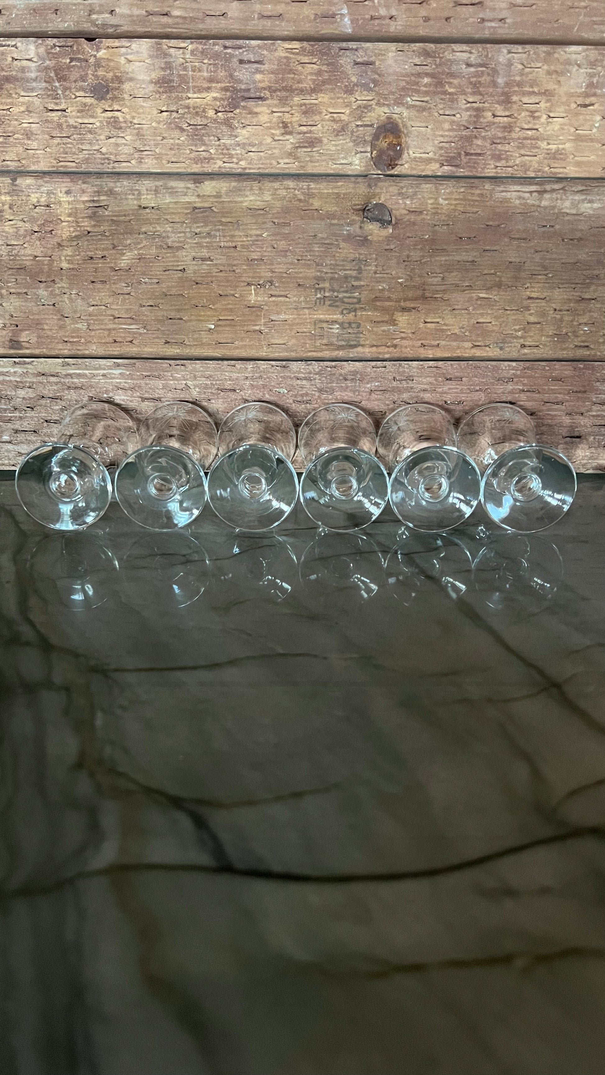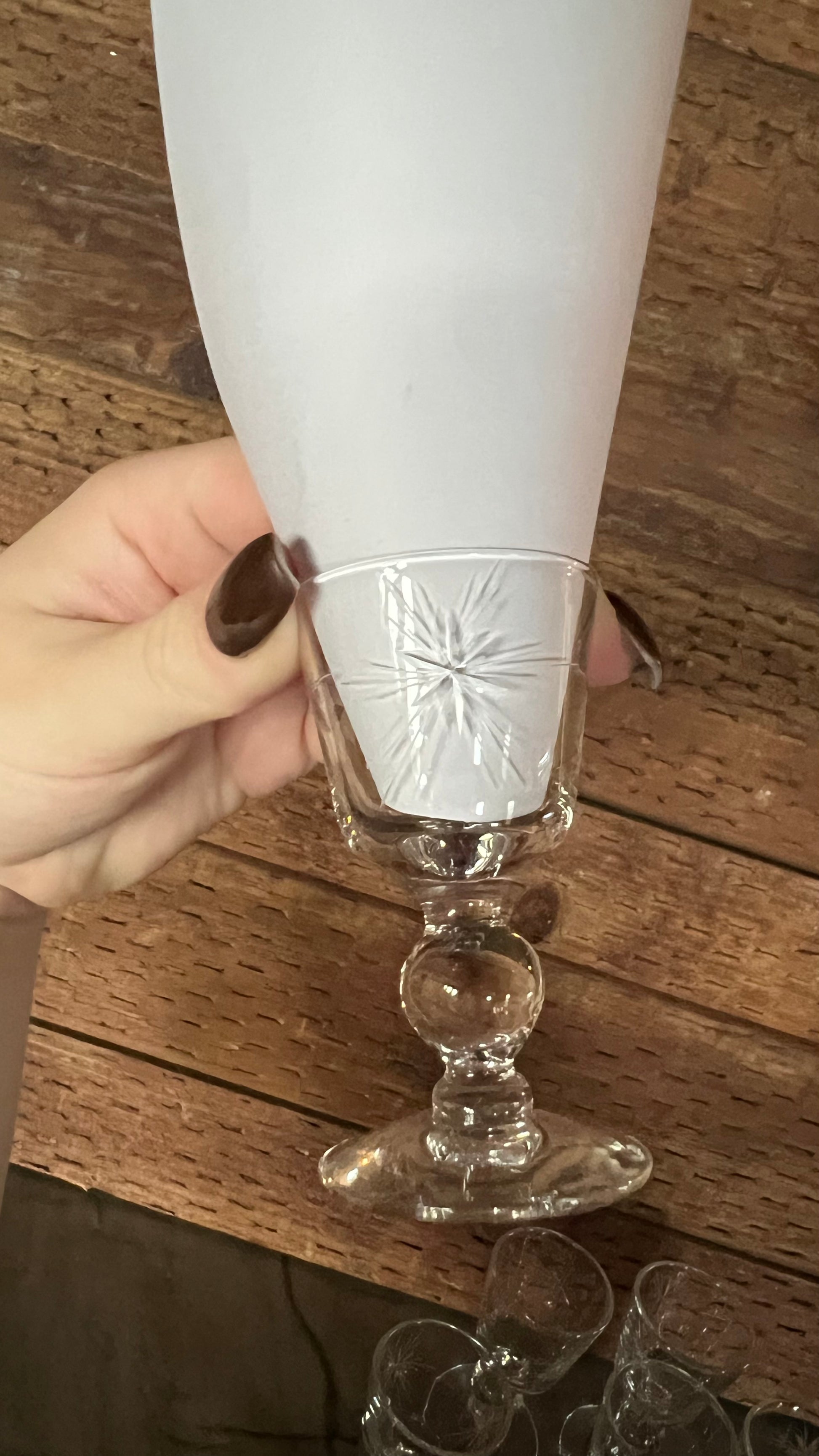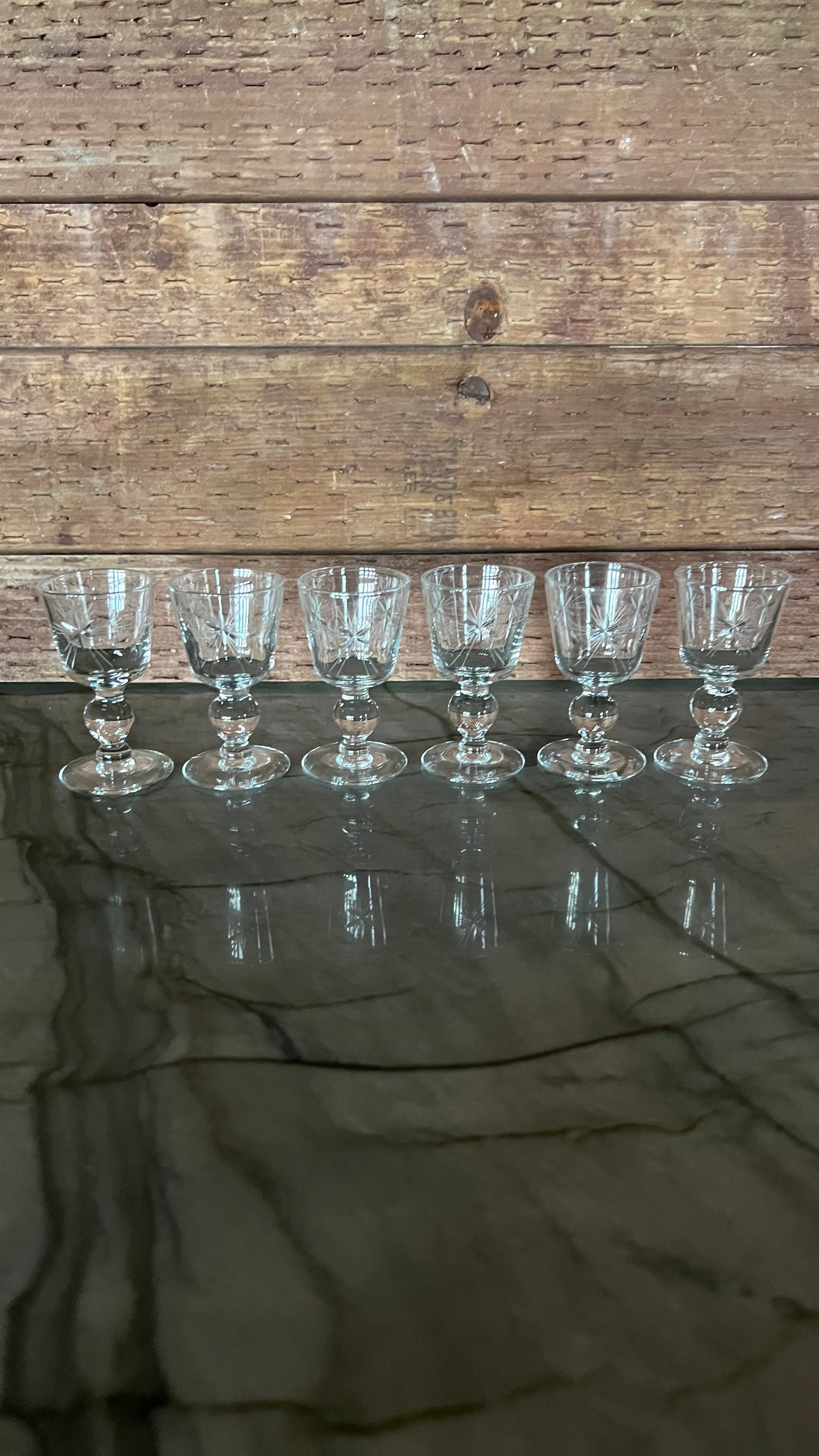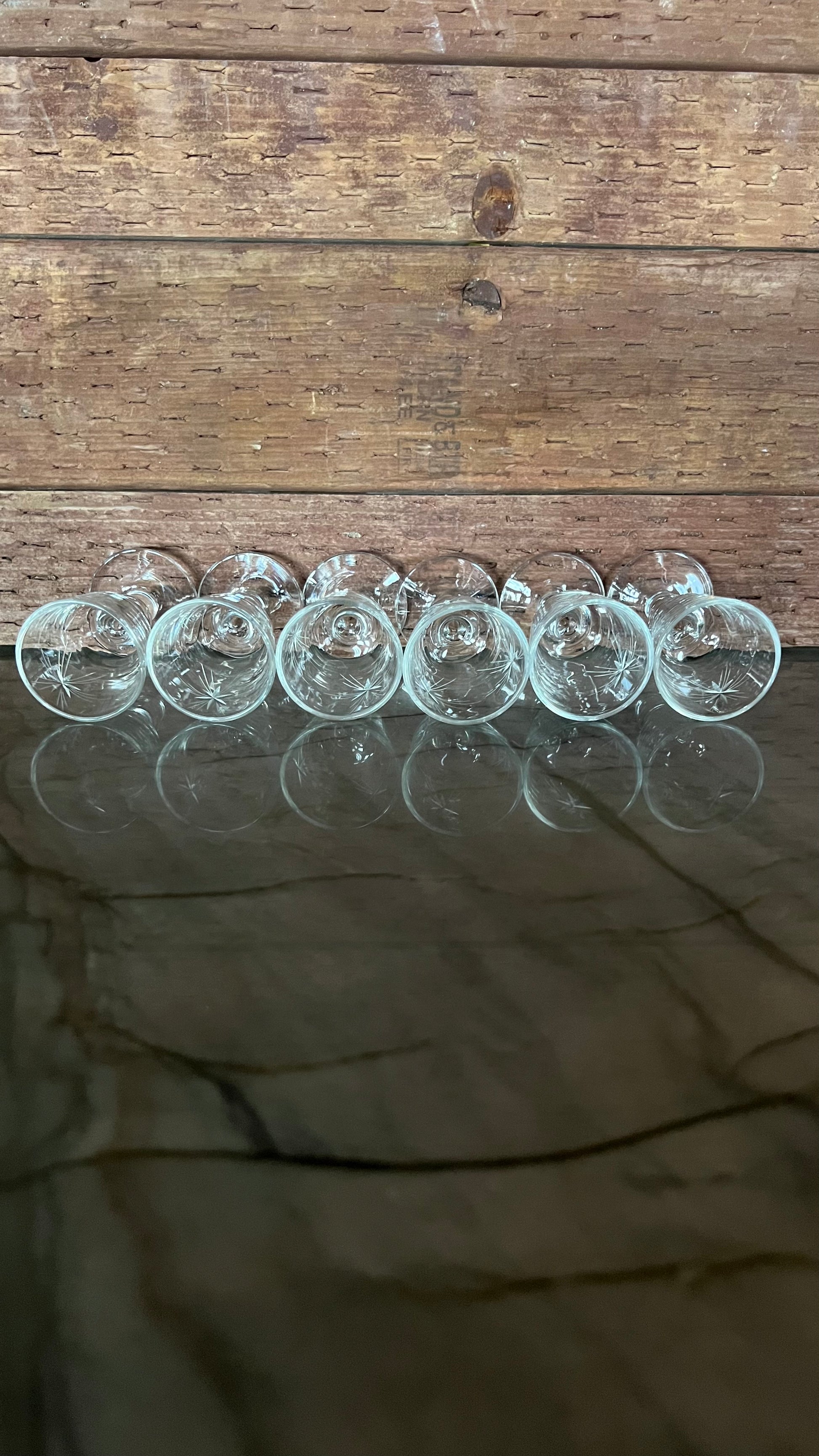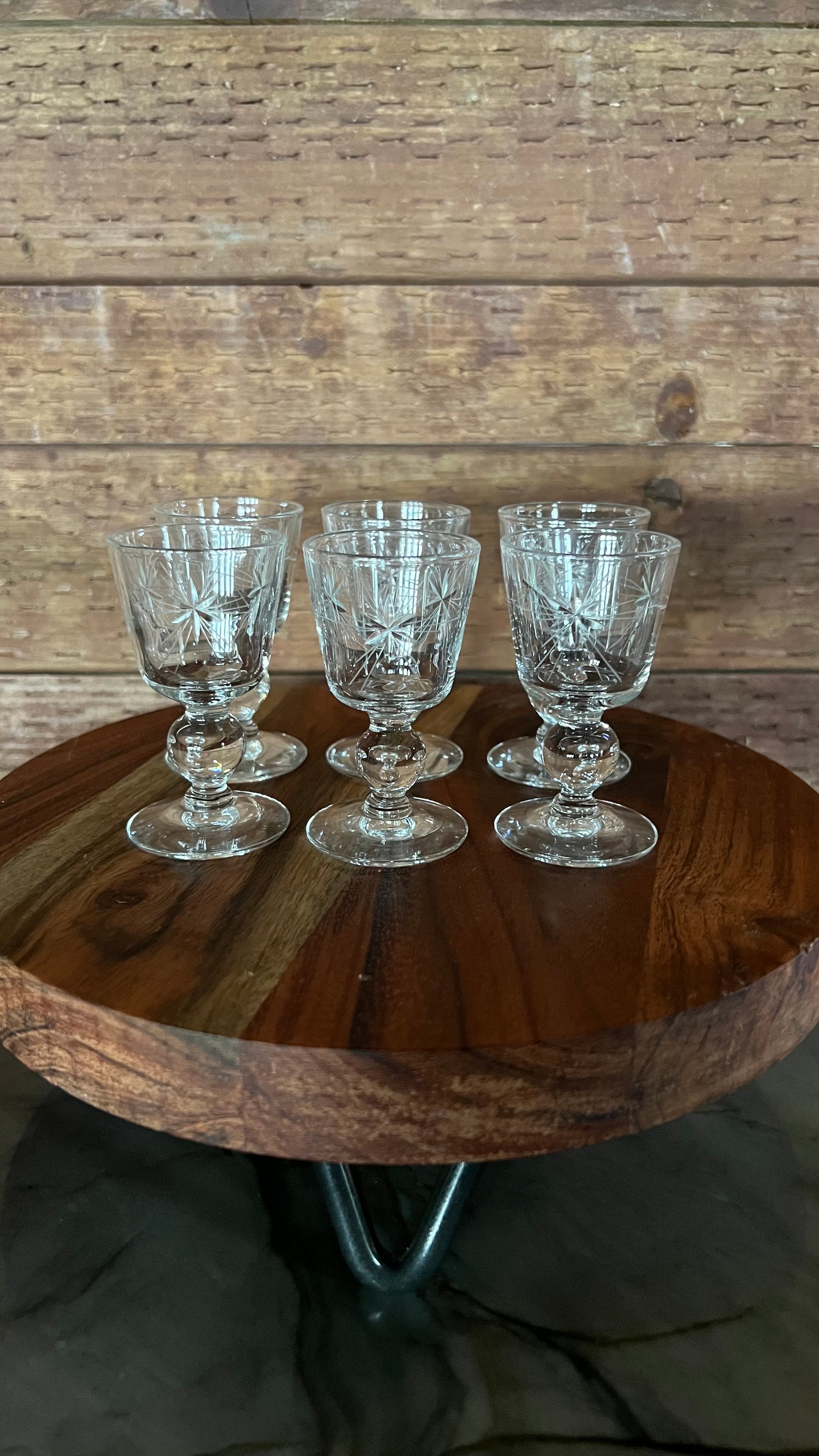 Antique Arcadia single cut starburst glasses. Blown cordial glasses, measuring 2.75” tall with a 1” diameter at the base. Excellent antique condition. Incredible set of 6!