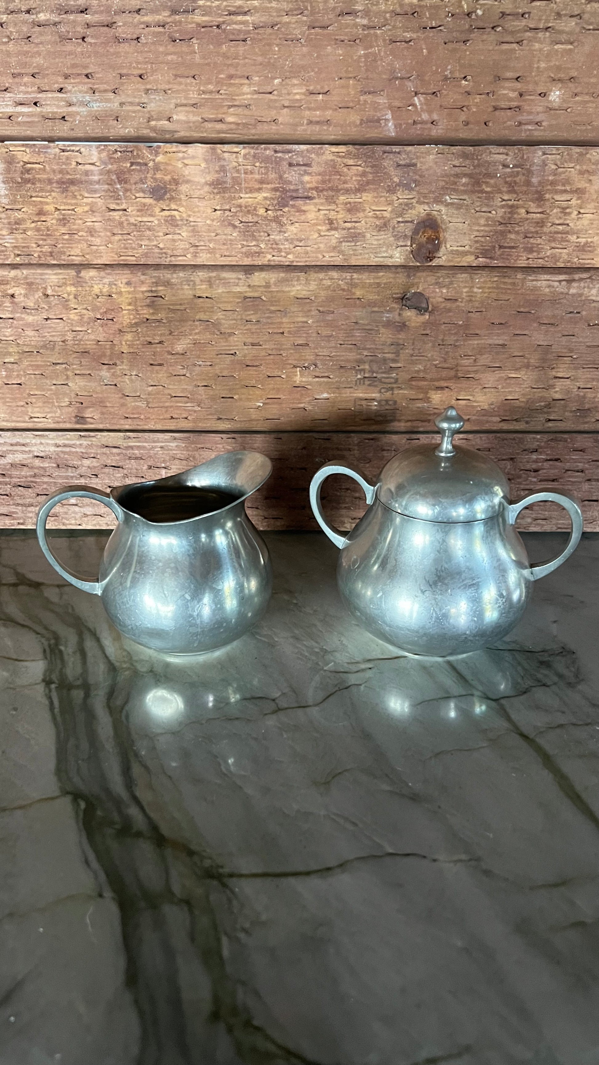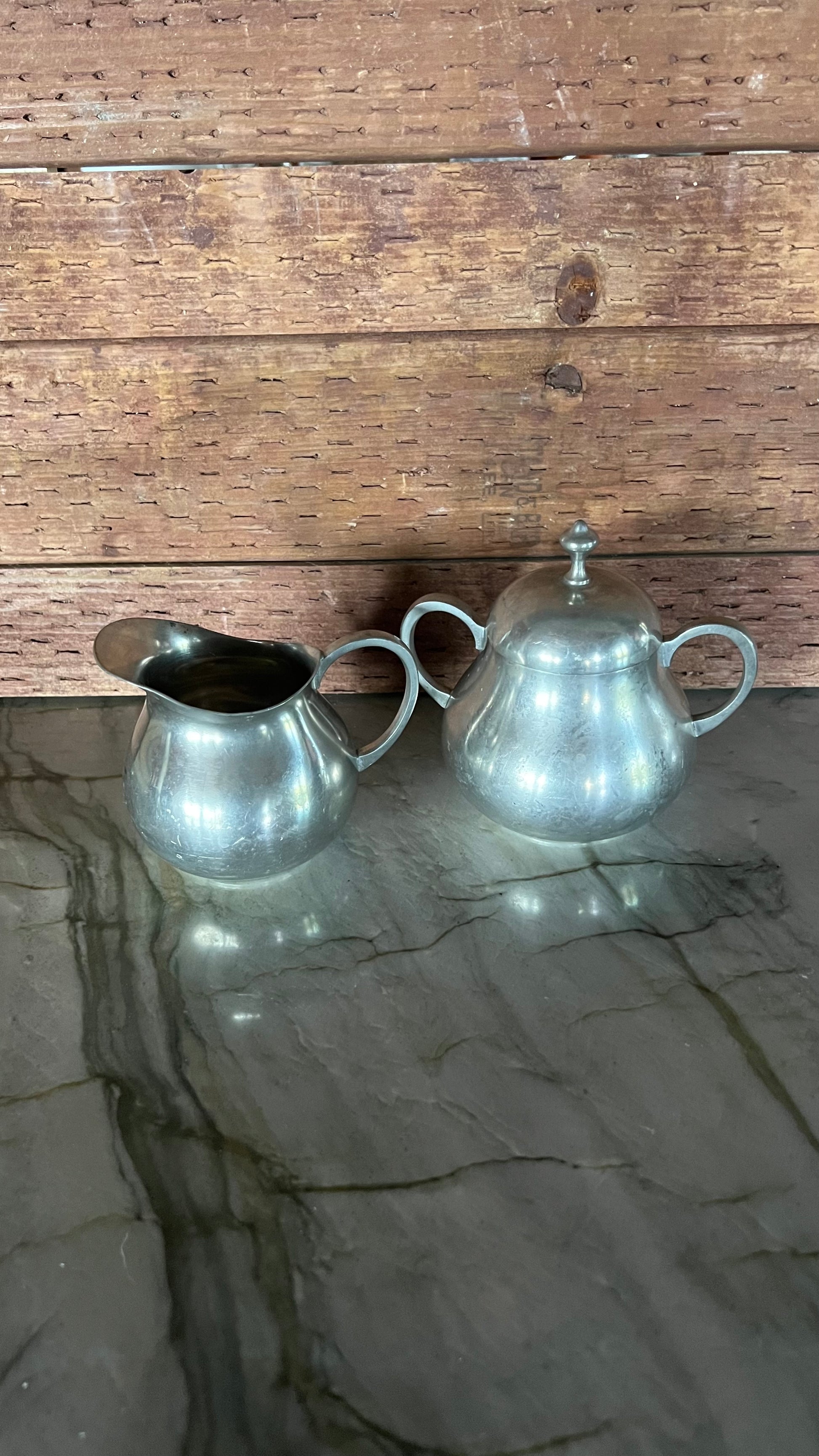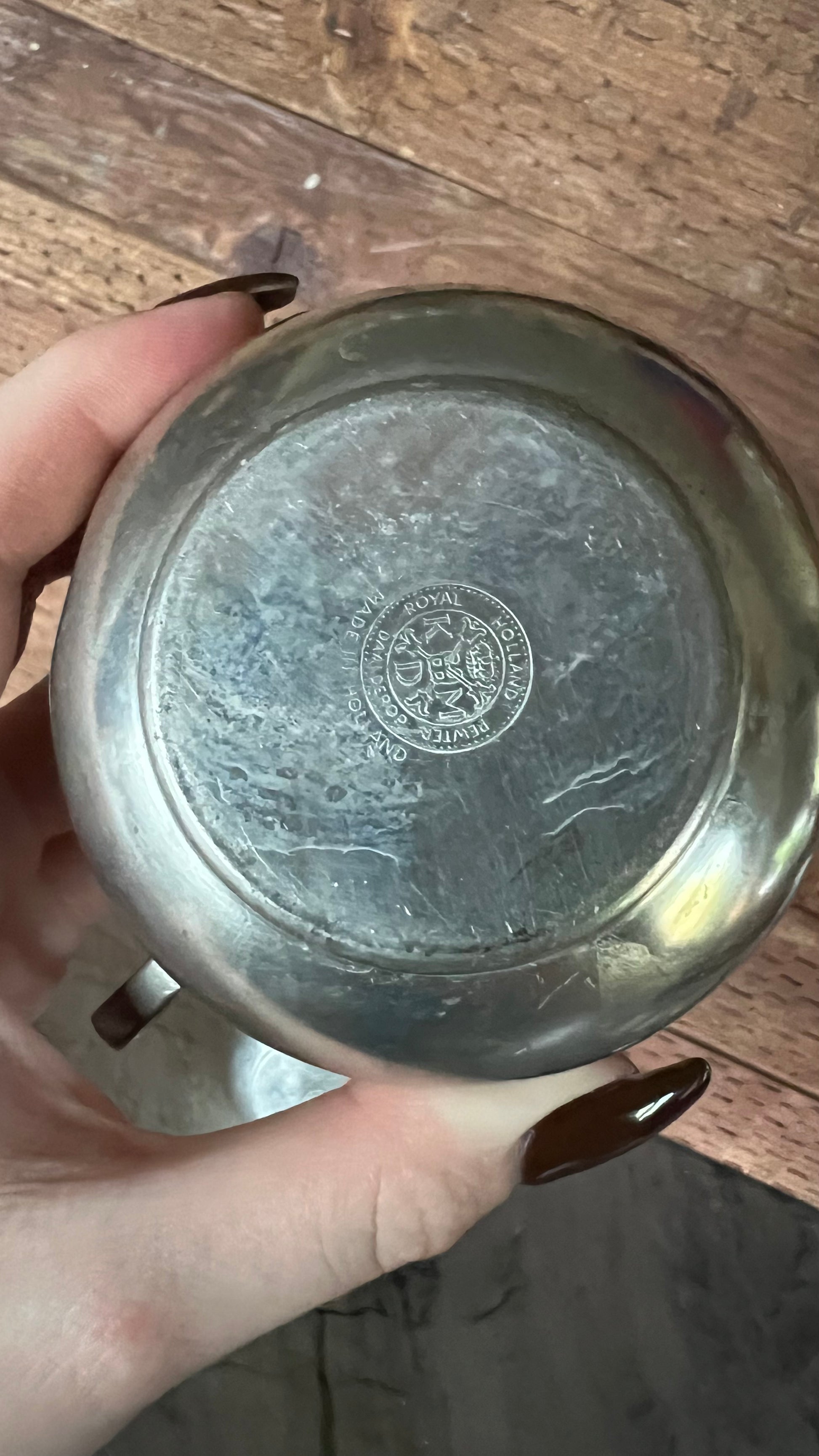 Antique Royal Holland pewter cream and sugar set. Made in Holland. Cream measures 3.25” tall with a 2” diameter at the base. Sugar measures 4.75” tall with a 2.25” diameter at the base. Very good vintage condition with minimal surface ware.