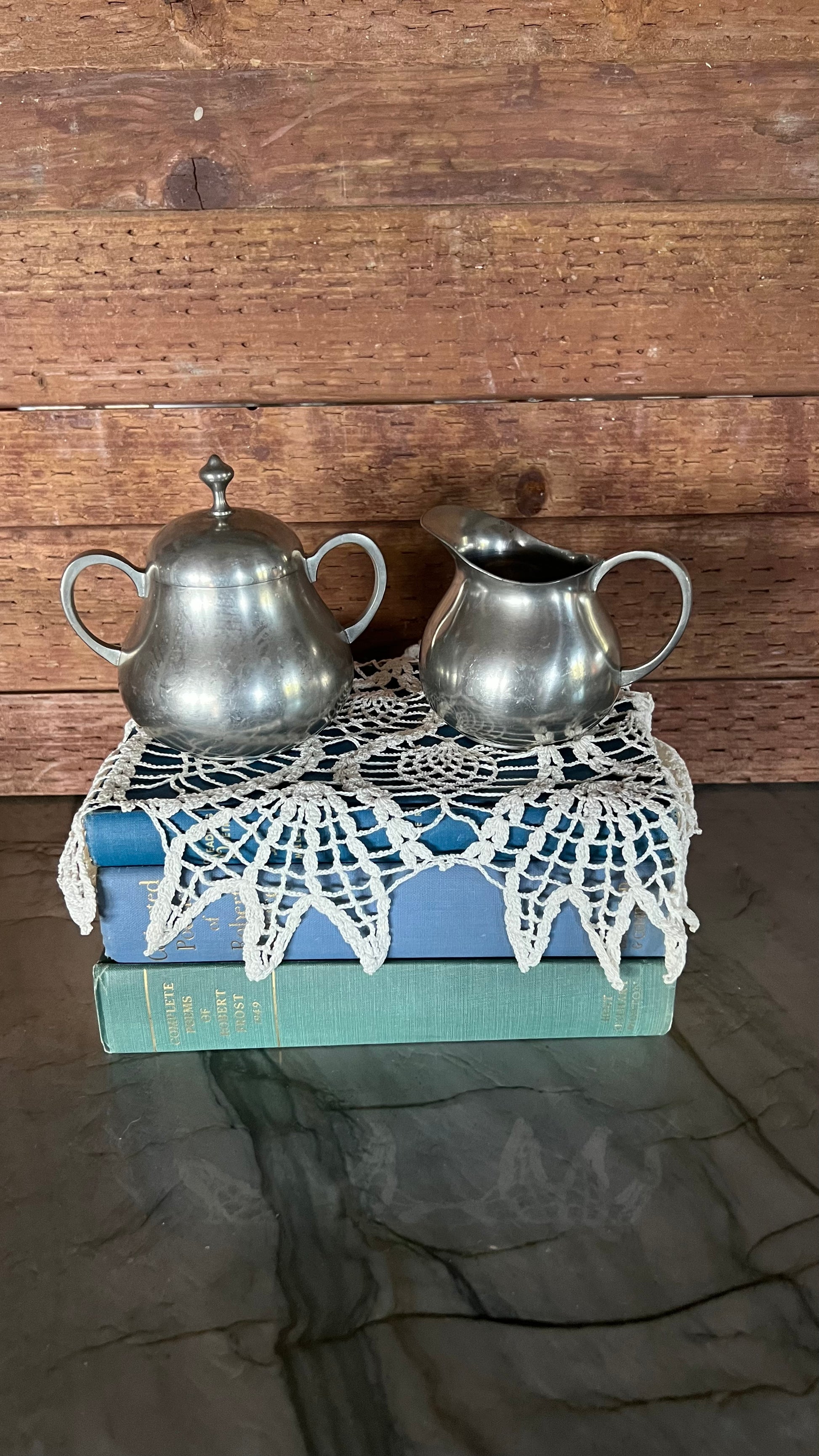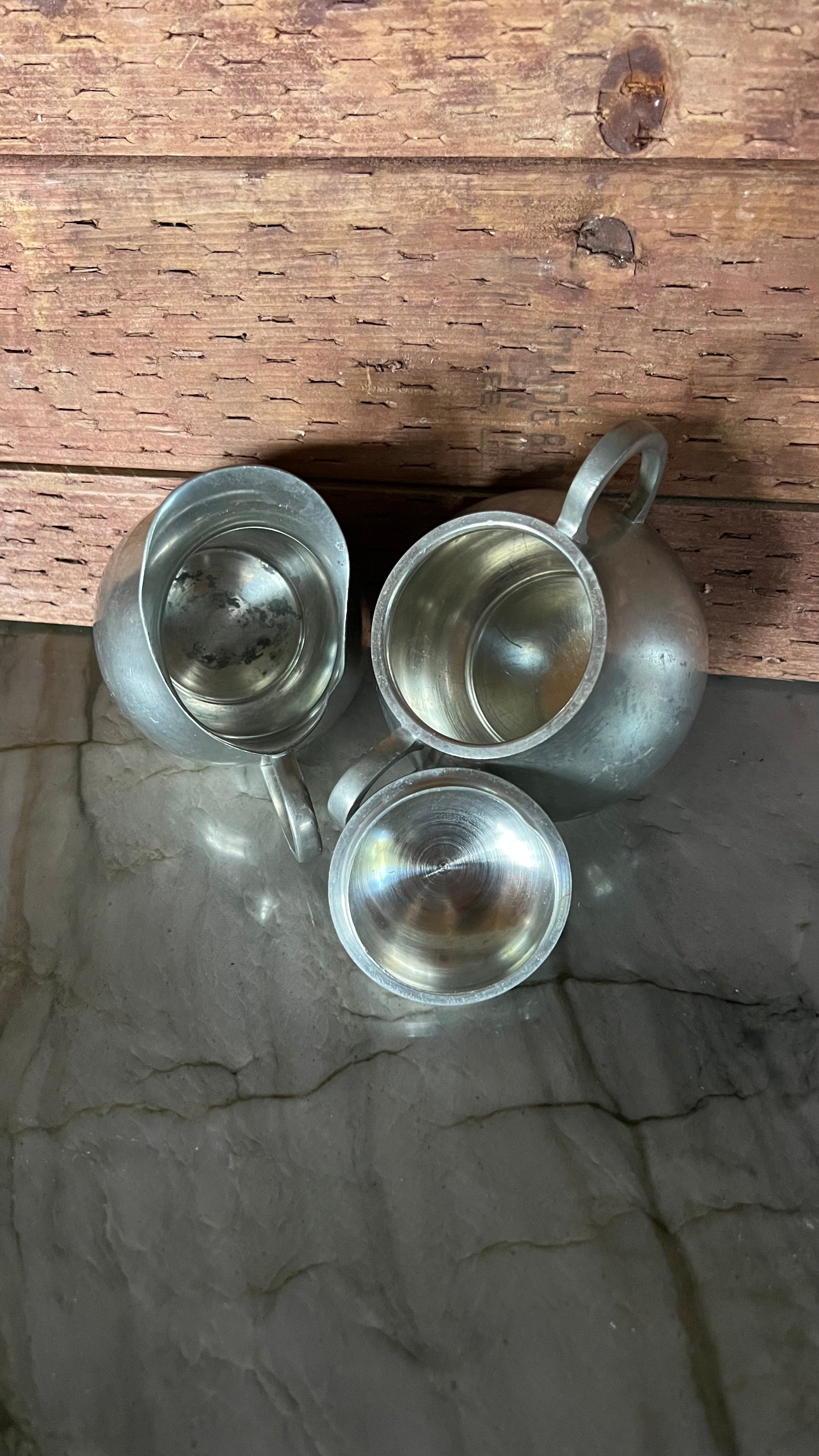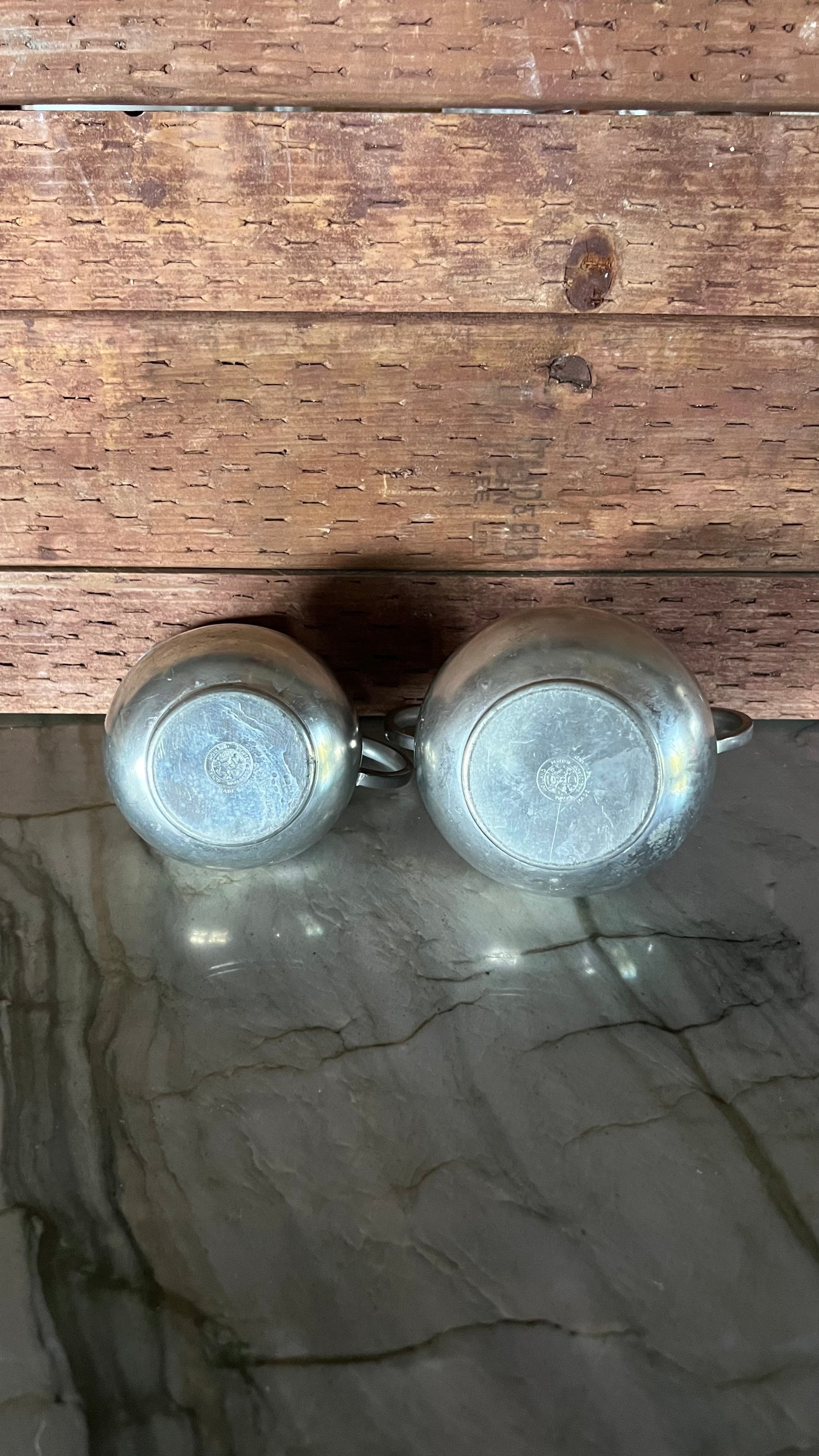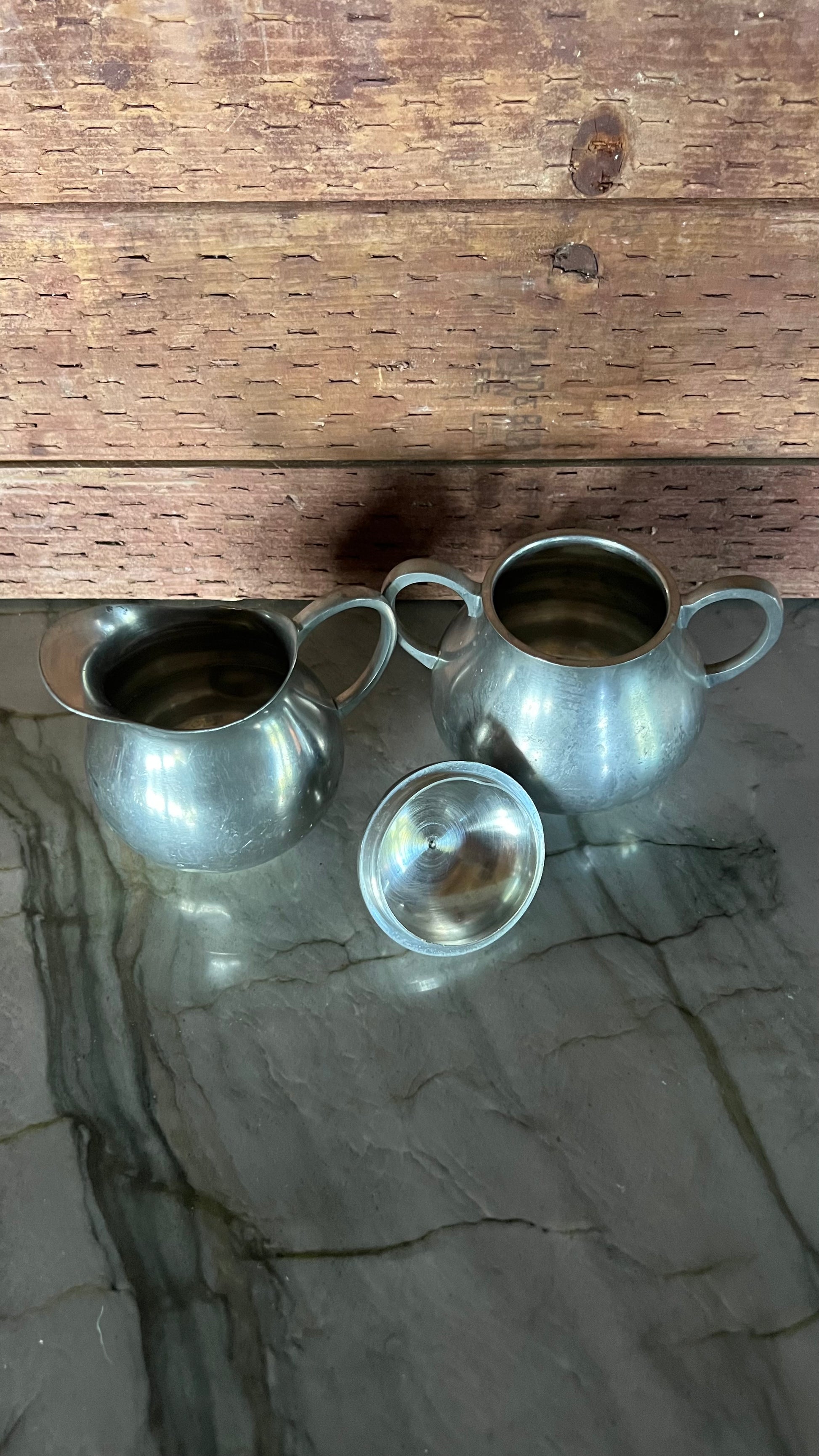 Antique Royal Holland pewter cream and sugar set. Made in Holland. Cream measures 3.25” tall with a 2” diameter at the base. Sugar measures 4.75” tall with a 2.25” diameter at the base. Very good vintage condition with minimal surface ware.