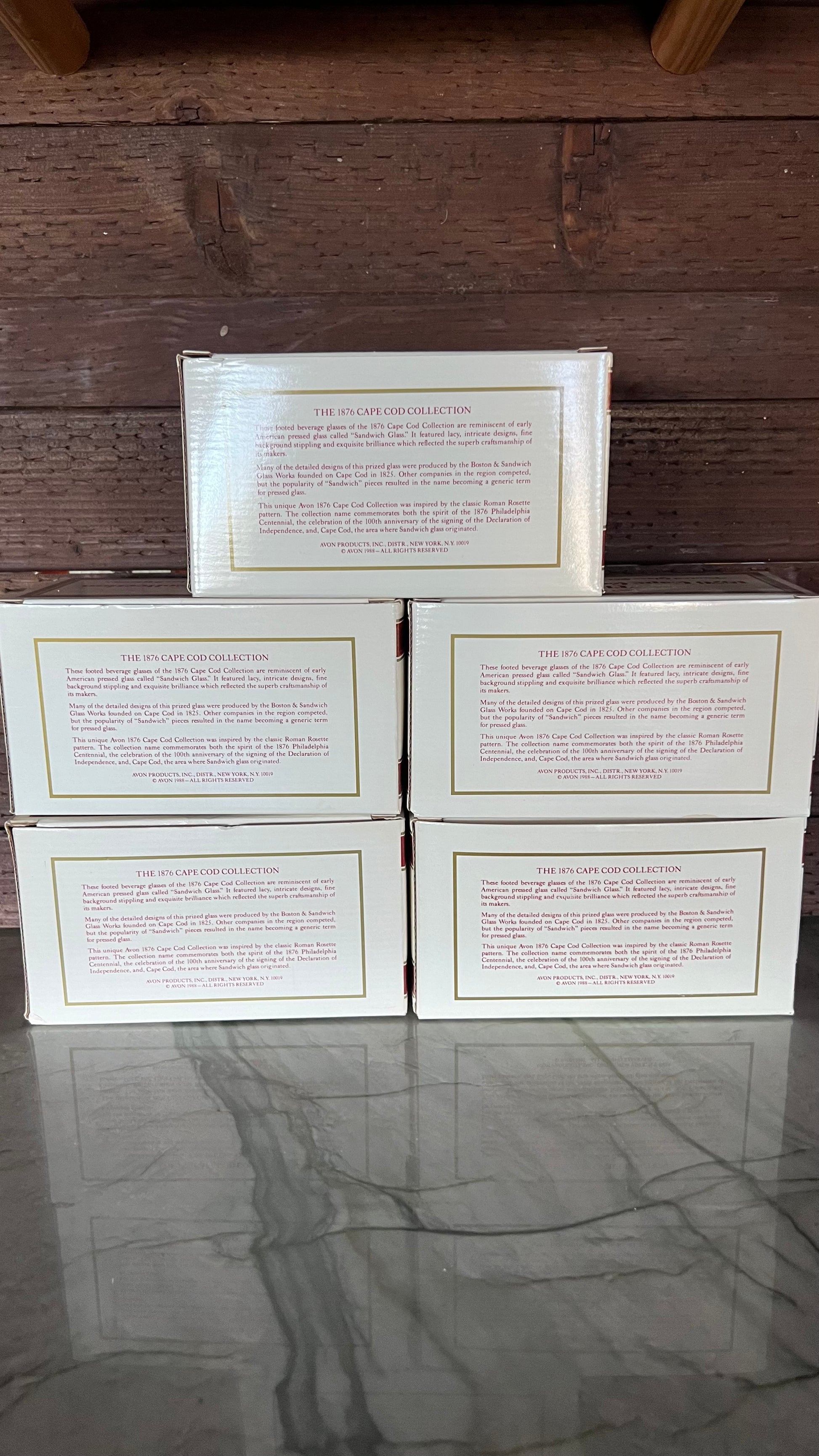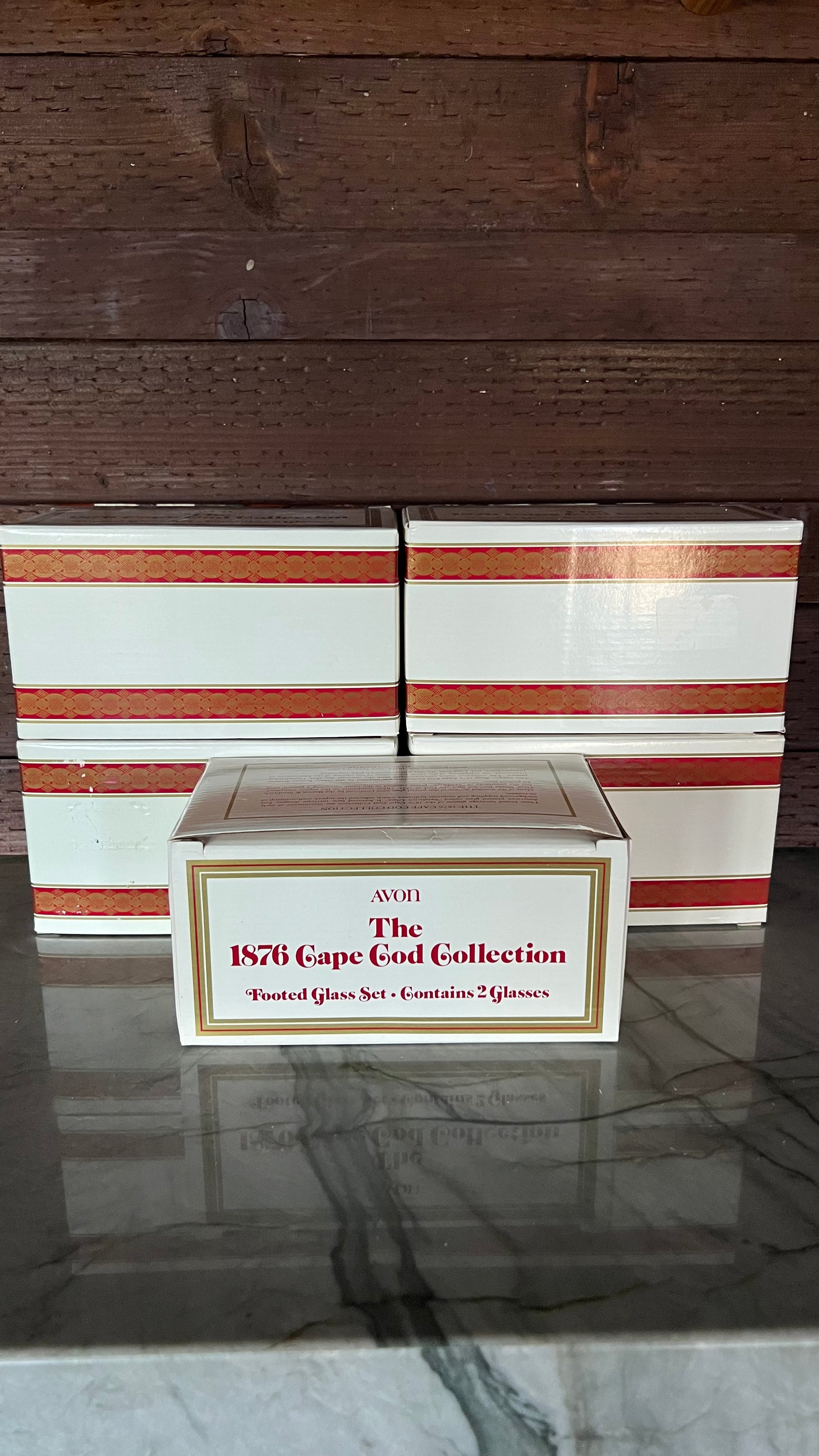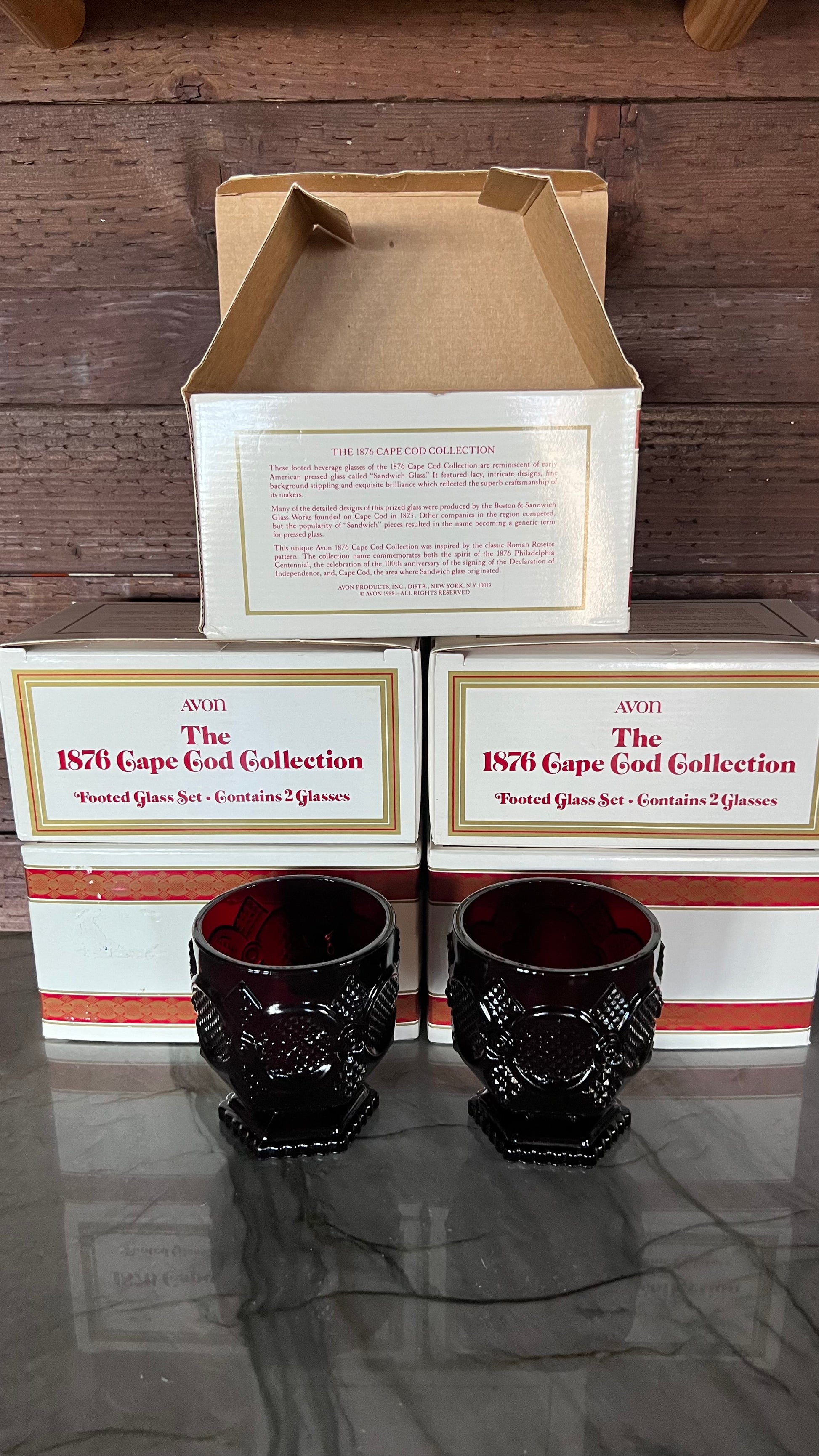 New old stock! 1876 Cape Cod Collection Footed Glass sets by Avon, in the original boxes. Each box comes with 2 glasses. The glasses are in excellent vintage condition with no signs of wear. Each measures 3.25” in foam at the top, and 3 5/8” tall. There are five box sets available, each box sold separately.