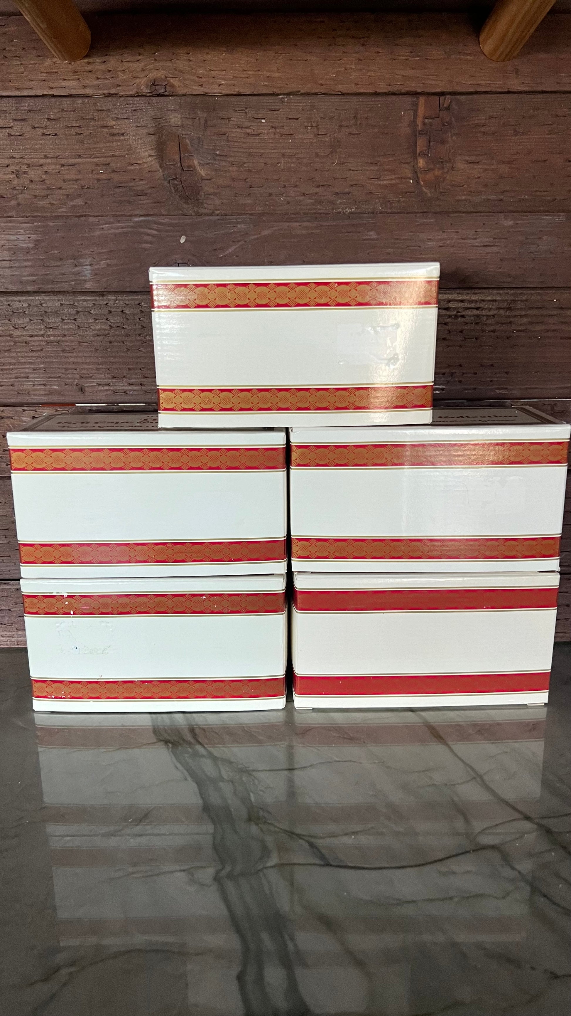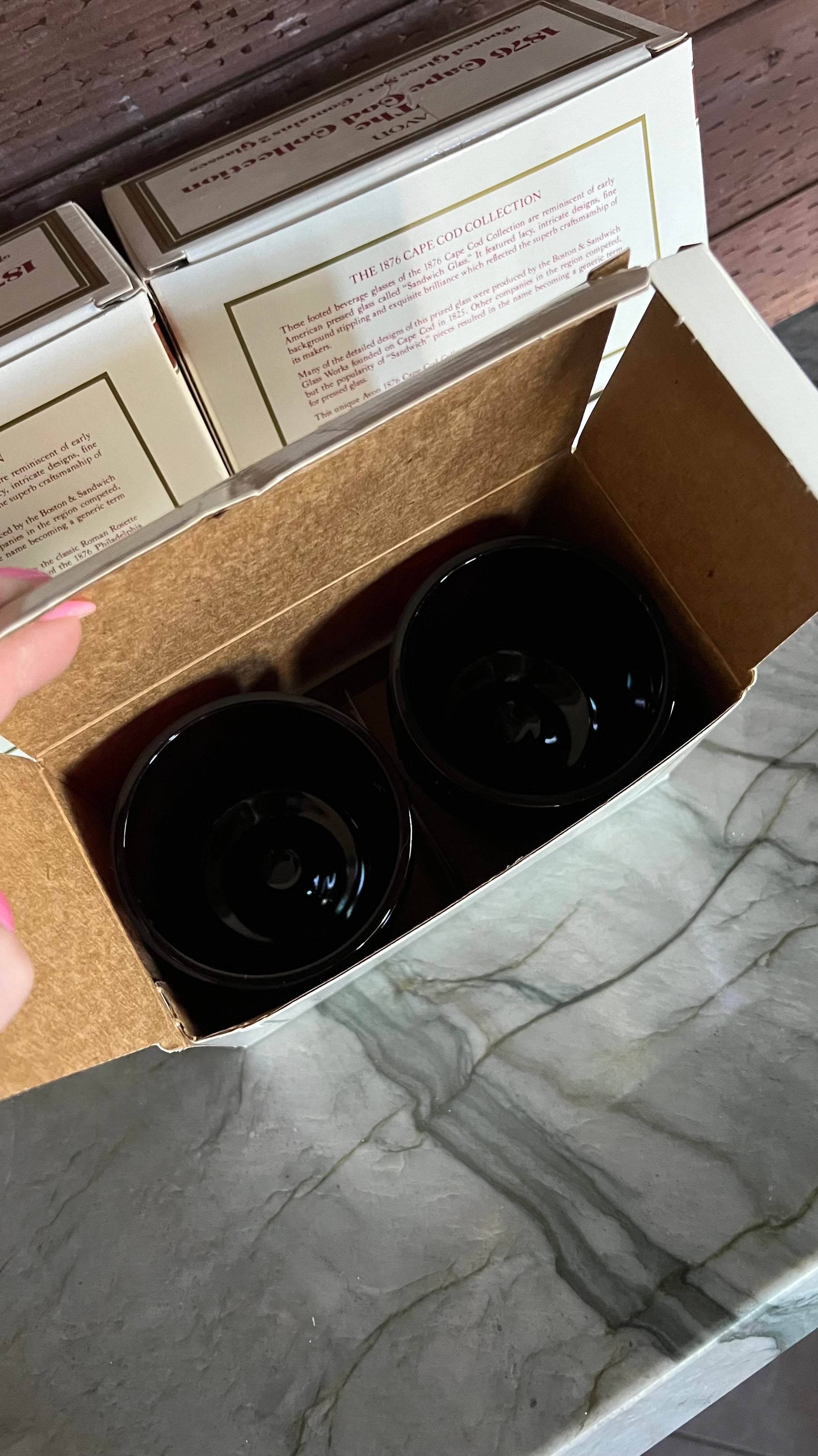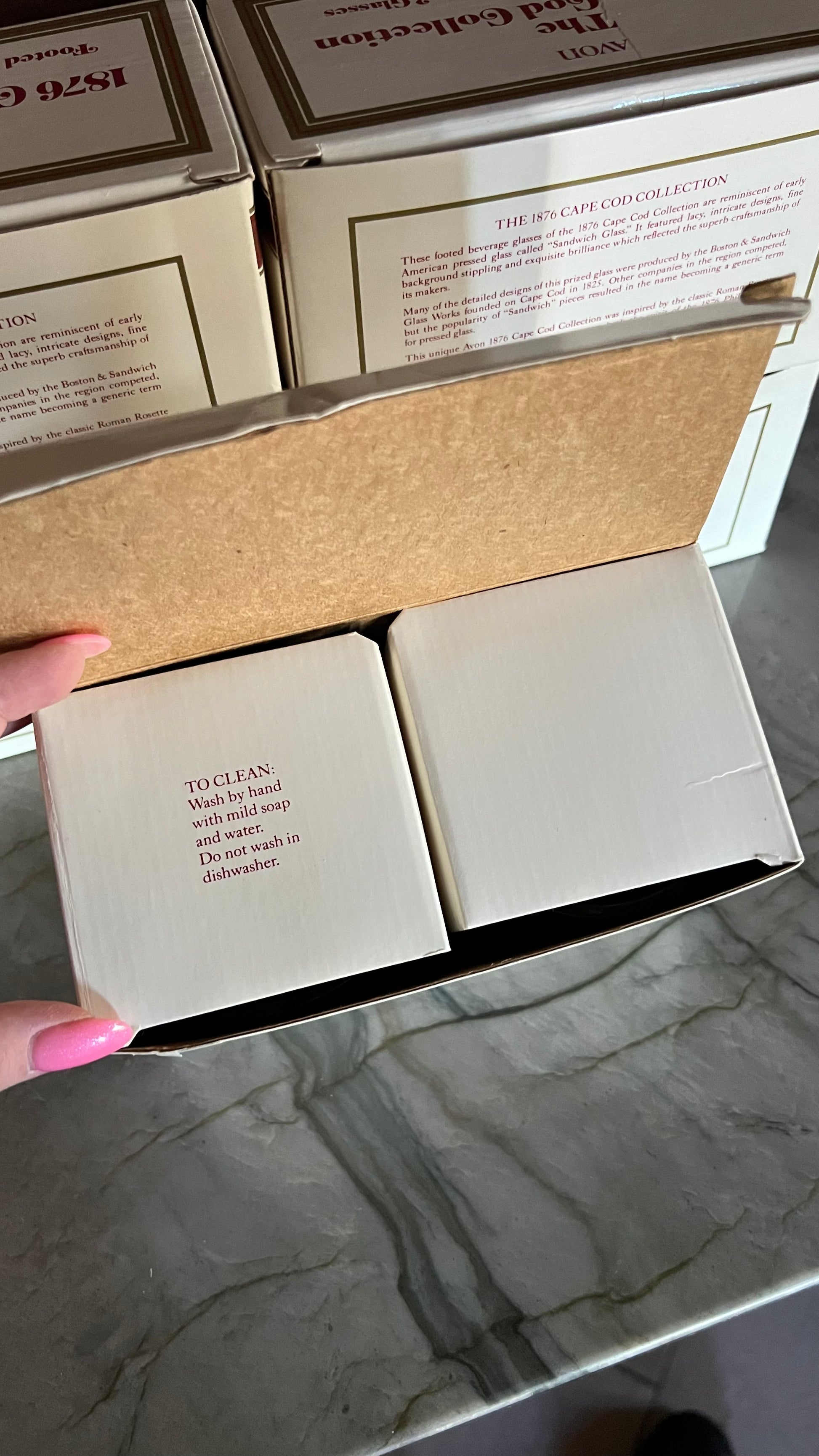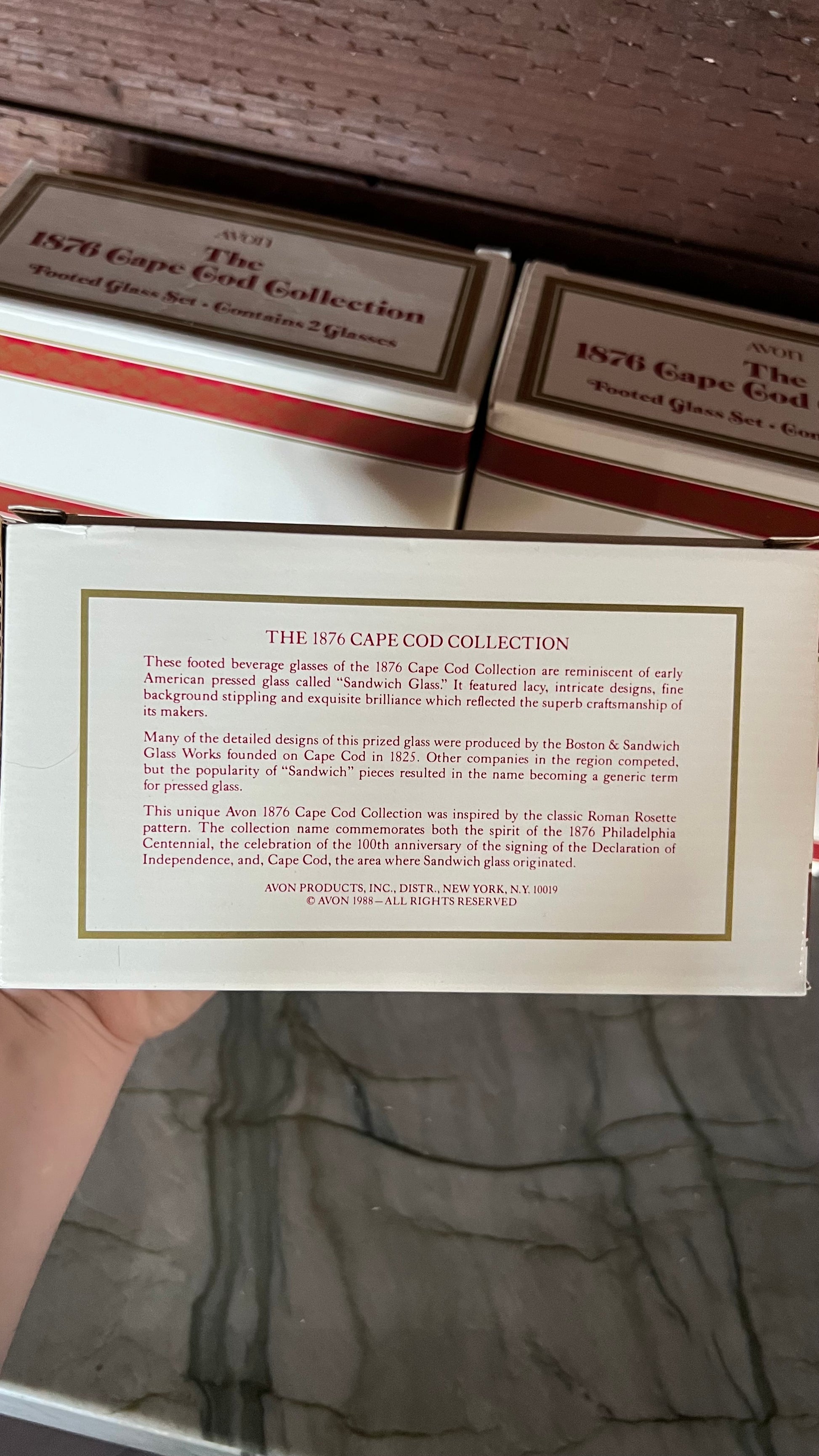 New old stock! 1876 Cape Cod Collection Footed Glass sets by Avon, in the original boxes. Each box comes with 2 glasses. The glasses are in excellent vintage condition with no signs of wear. Each measures 3.25” in foam at the top, and 3 5/8” tall. There are five box sets available, each box sold separately.