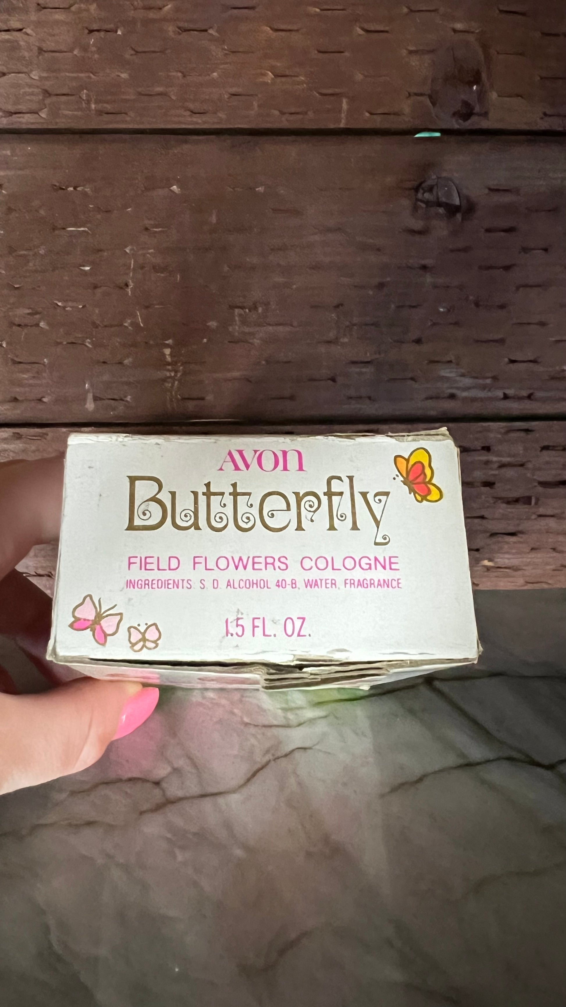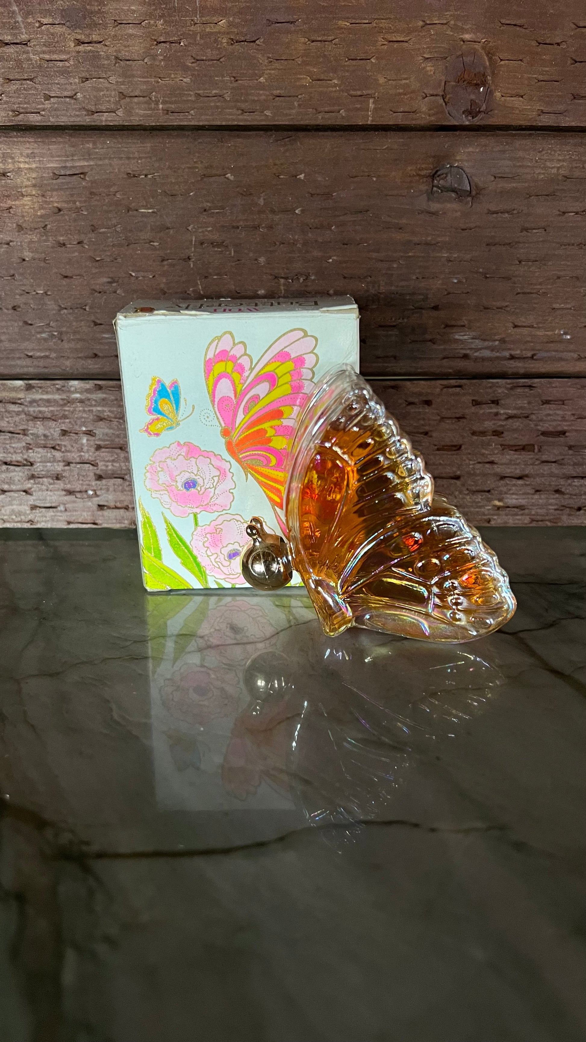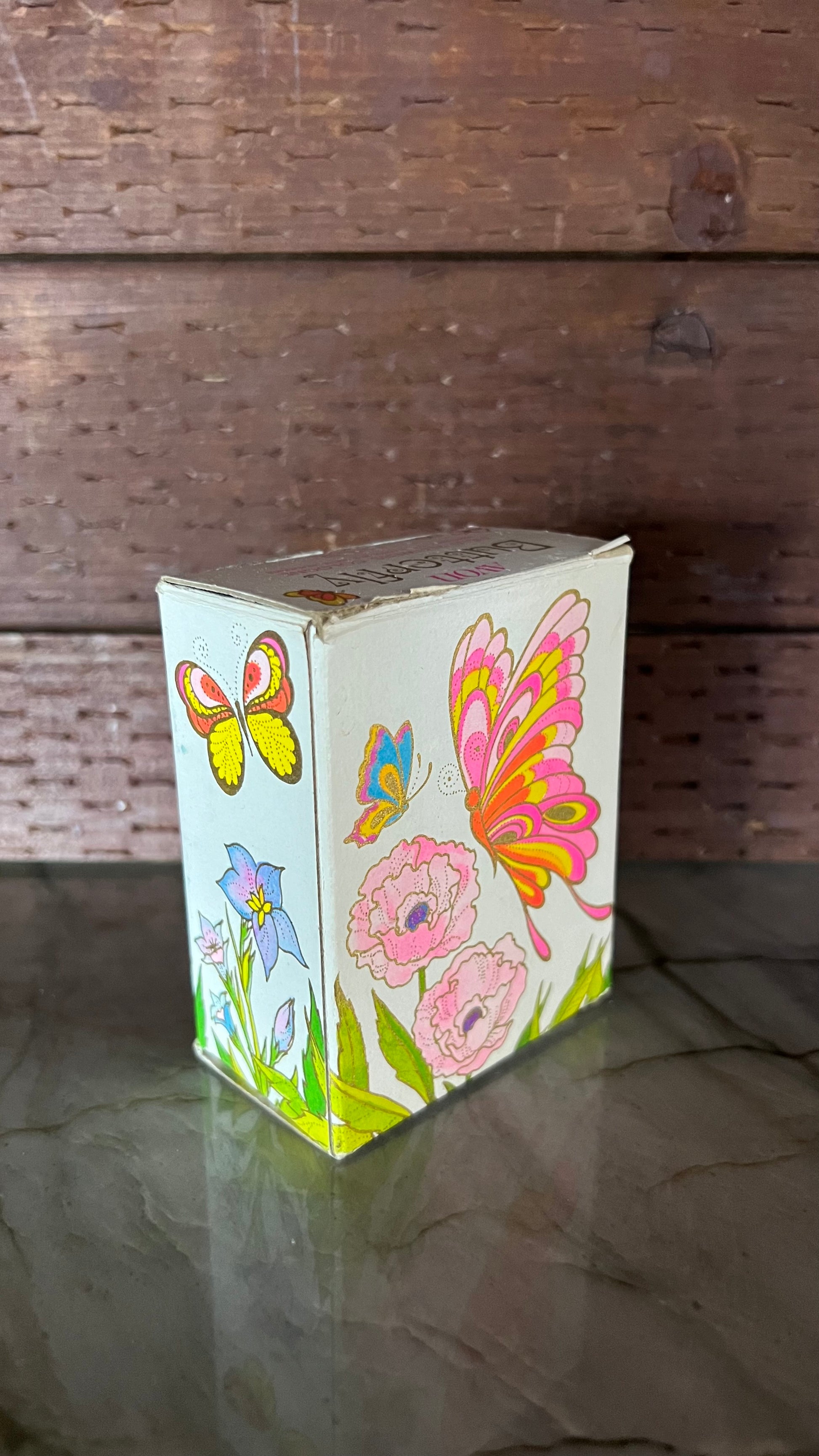 Avon Field Flowers Butterfly Canister with original box! The canister is full of perfume, and is in excellent vintage condition with no signs of wear. The sticker is completely intact on the bottom. It measures 3 3/8” tall and 2.5” at its widest point. Beautiful find!