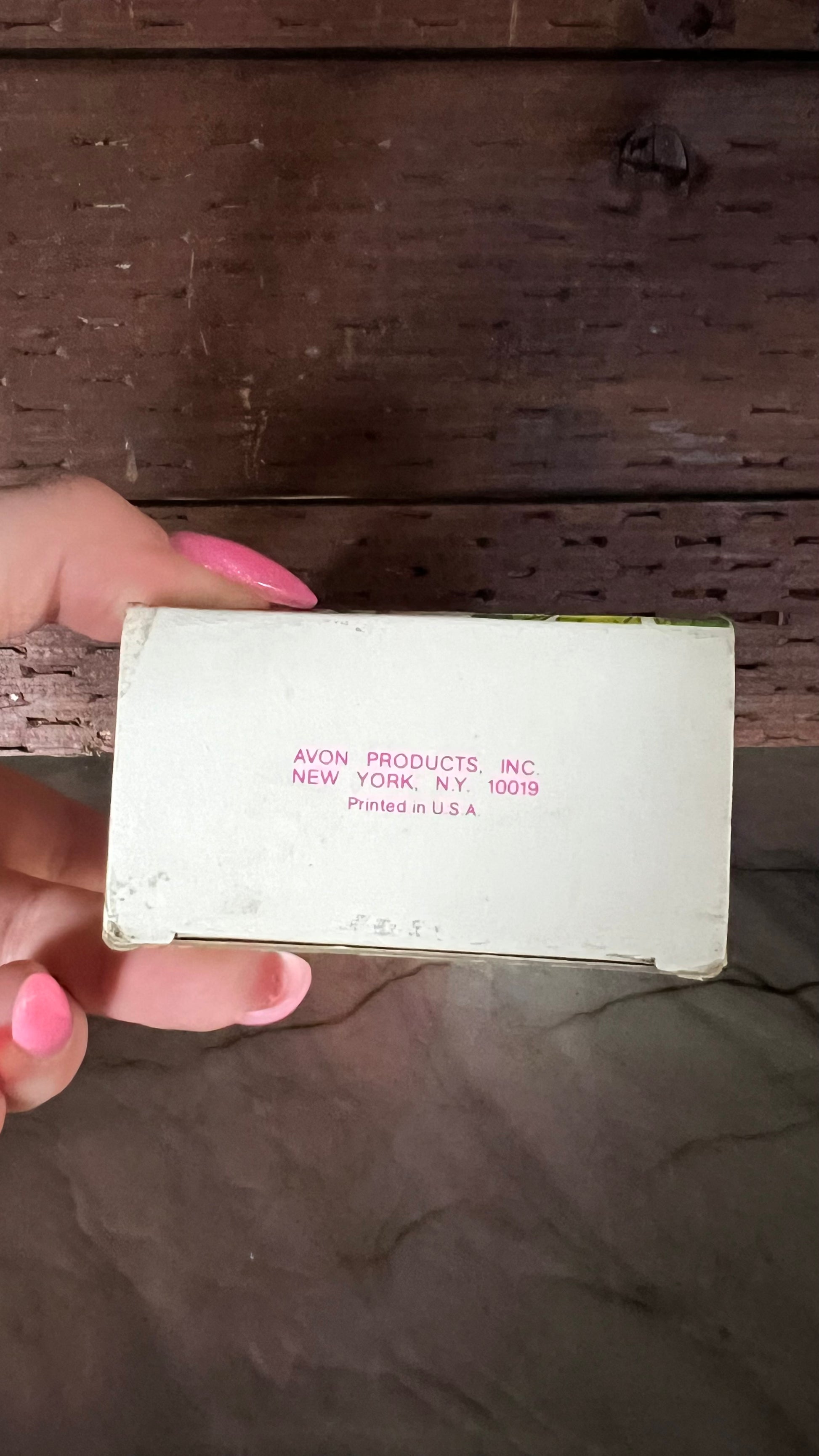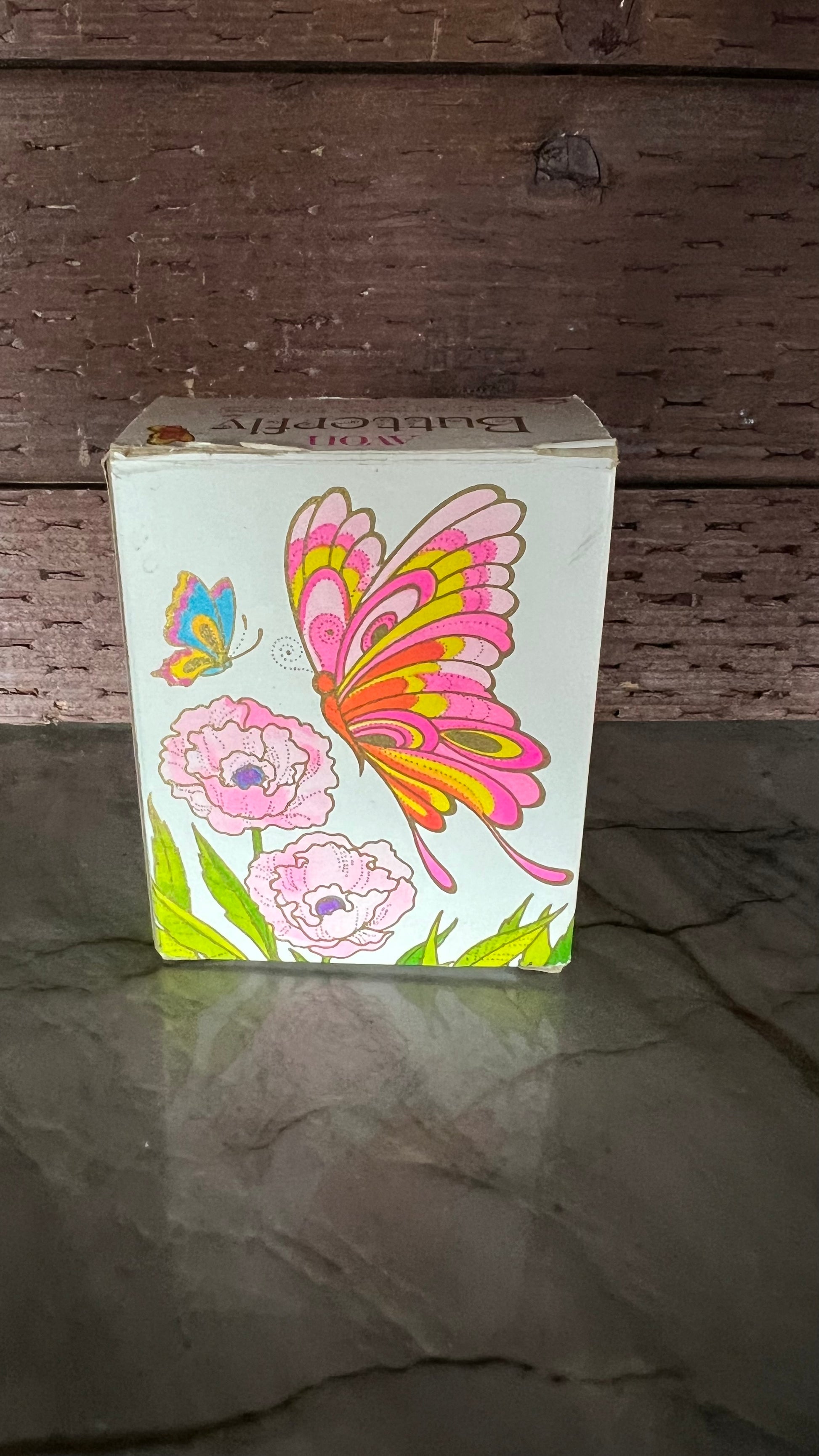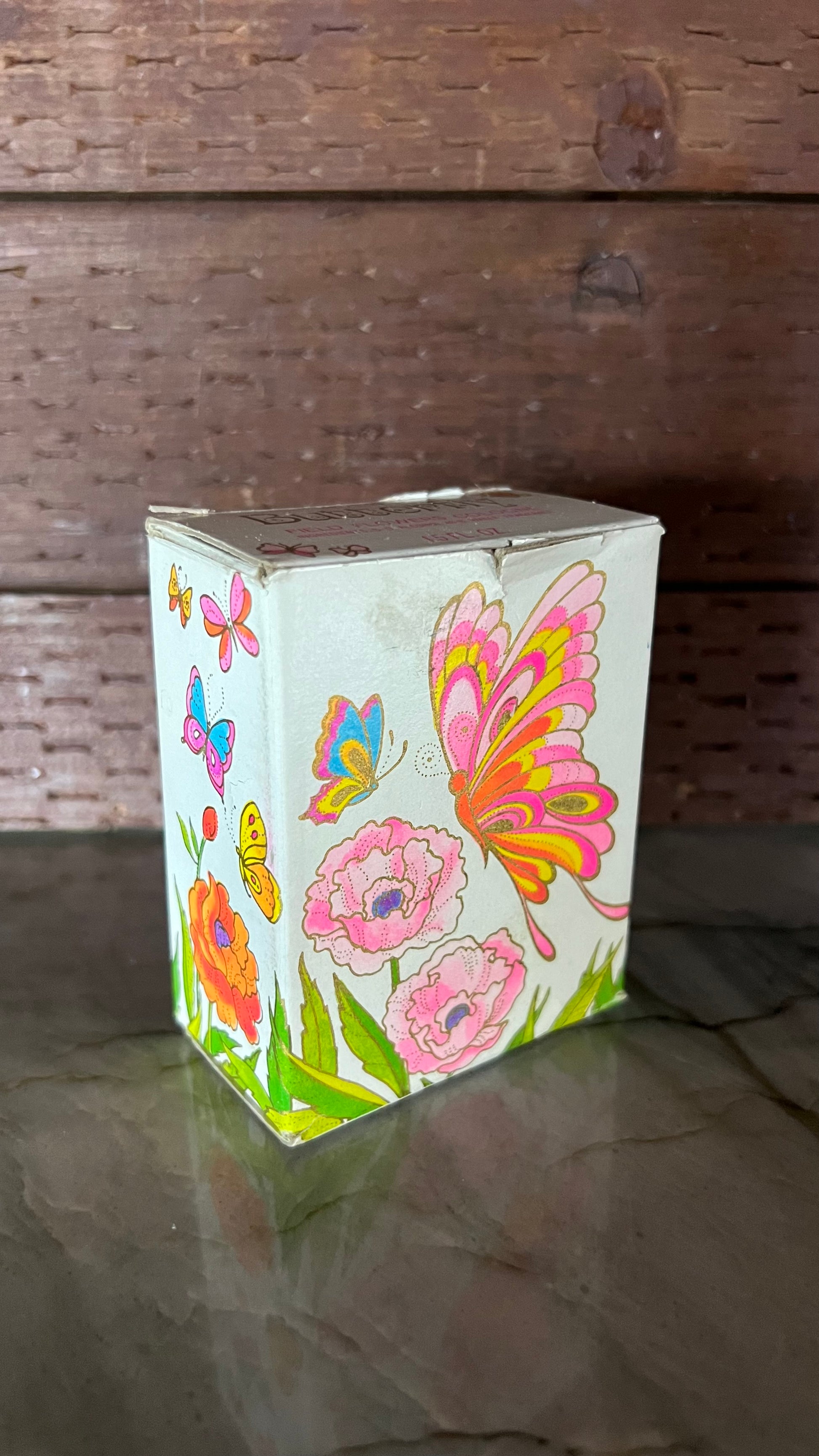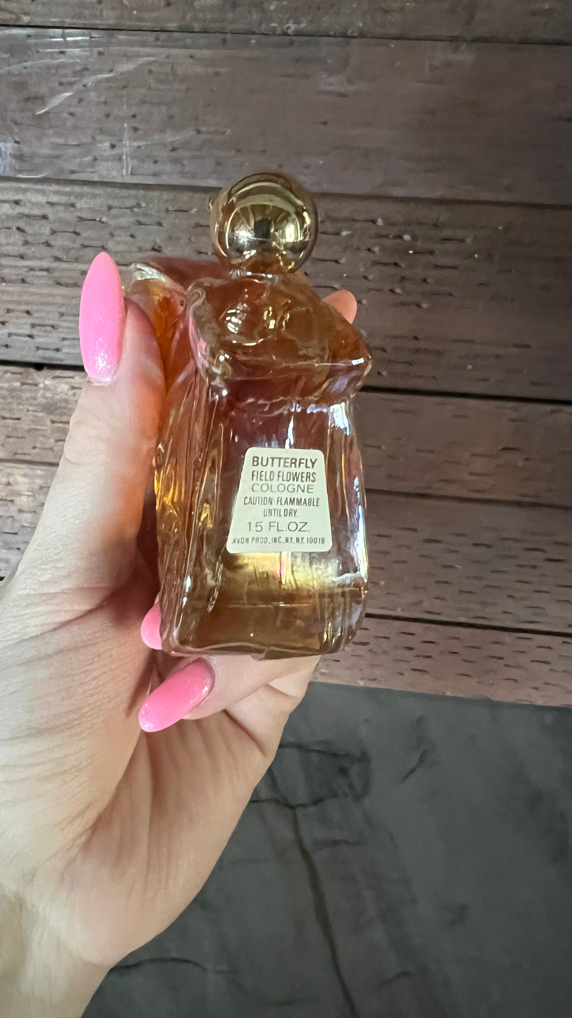 Avon Field Flowers Butterfly Canister with original box! The canister is full of perfume, and is in excellent vintage condition with no signs of wear. The sticker is completely intact on the bottom. It measures 3 3/8” tall and 2.5” at its widest point. Beautiful find!