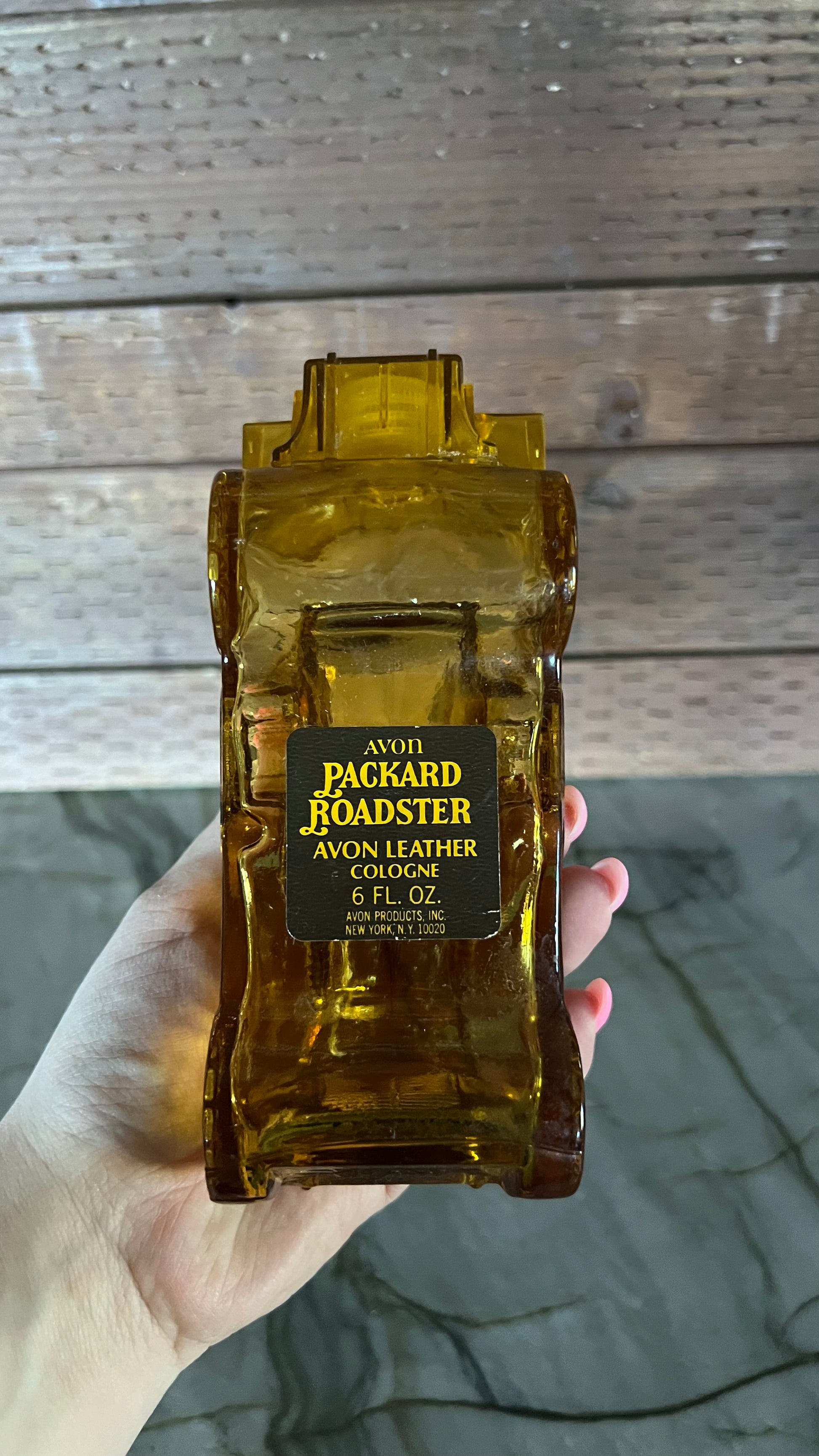 Avon Leather Cologne Packard Roadster canister. The canister is empty, no product is included. It measures 3.25” tall and 6” at its widest point. The canister is in great vintage condition, with minimal wear on the plastic cap. The sticker is completely in tact on the bottom.