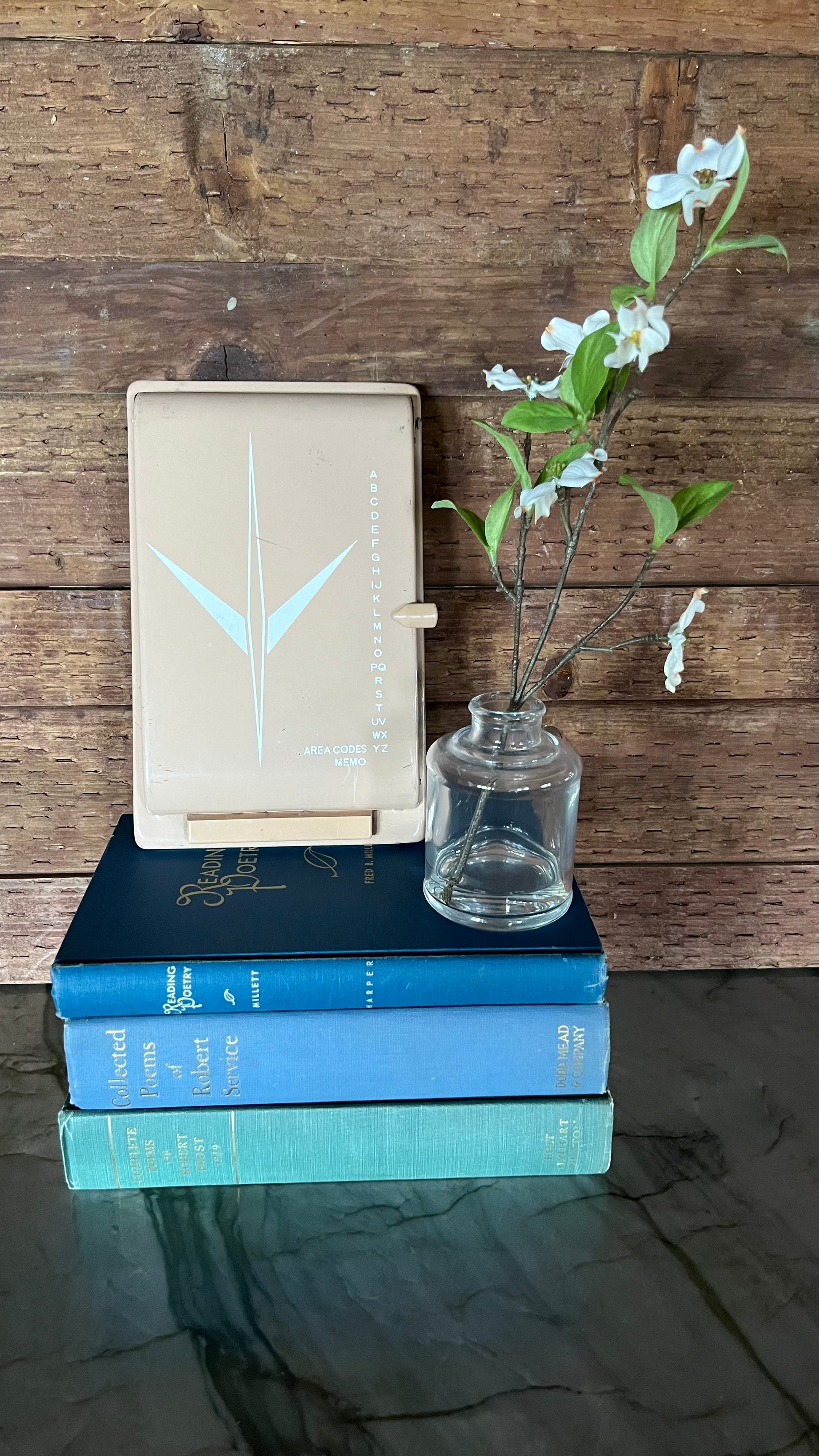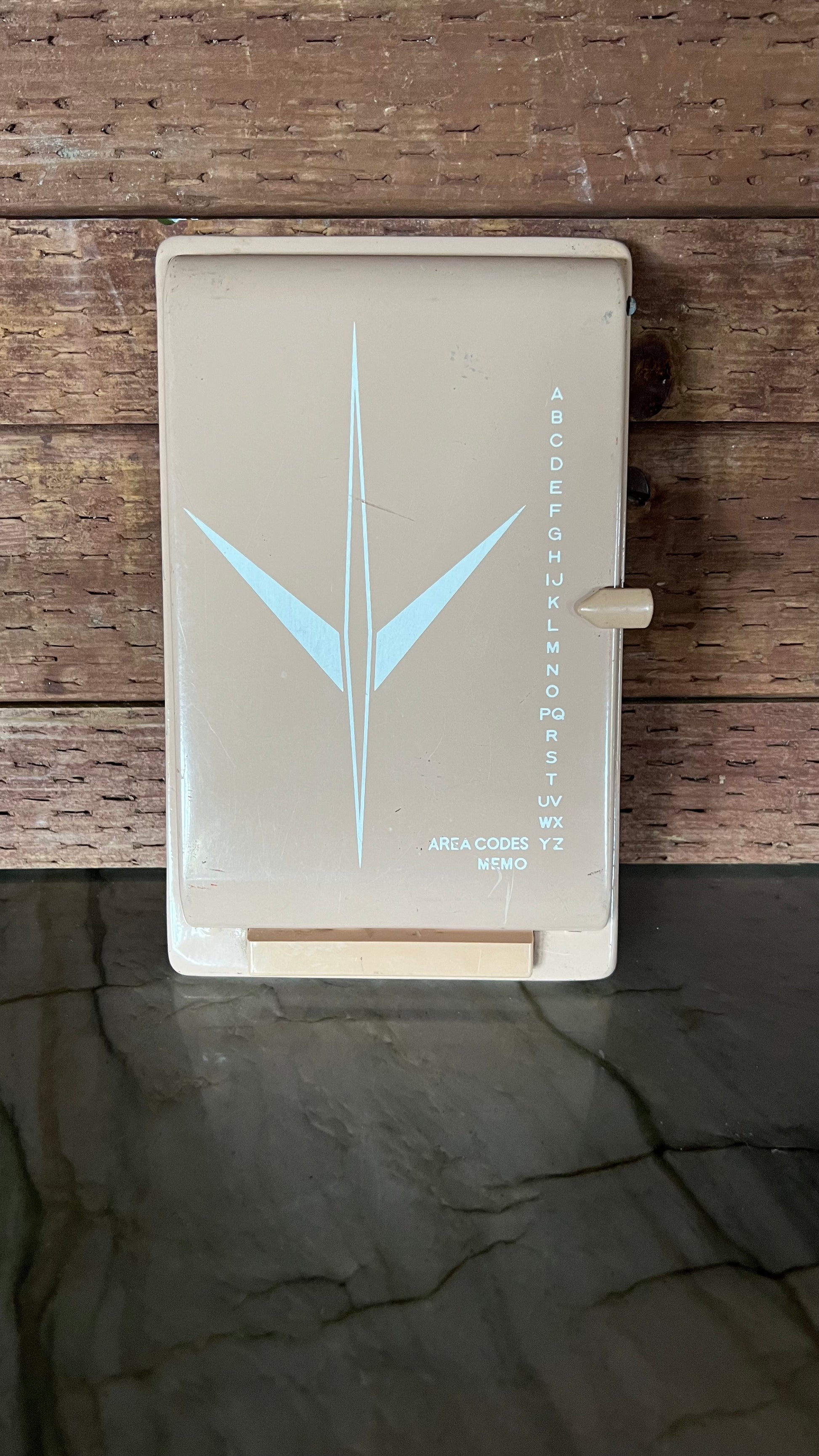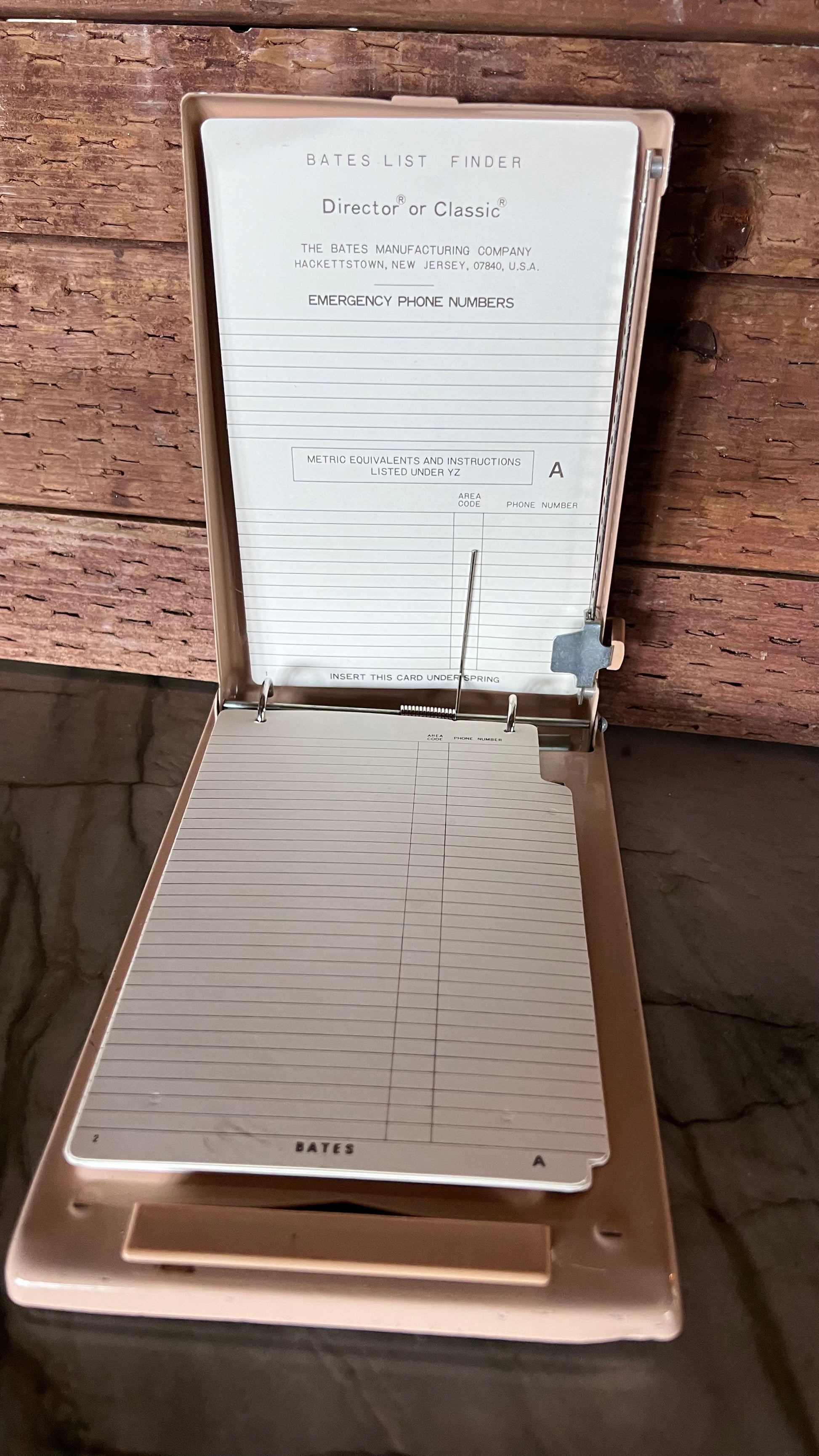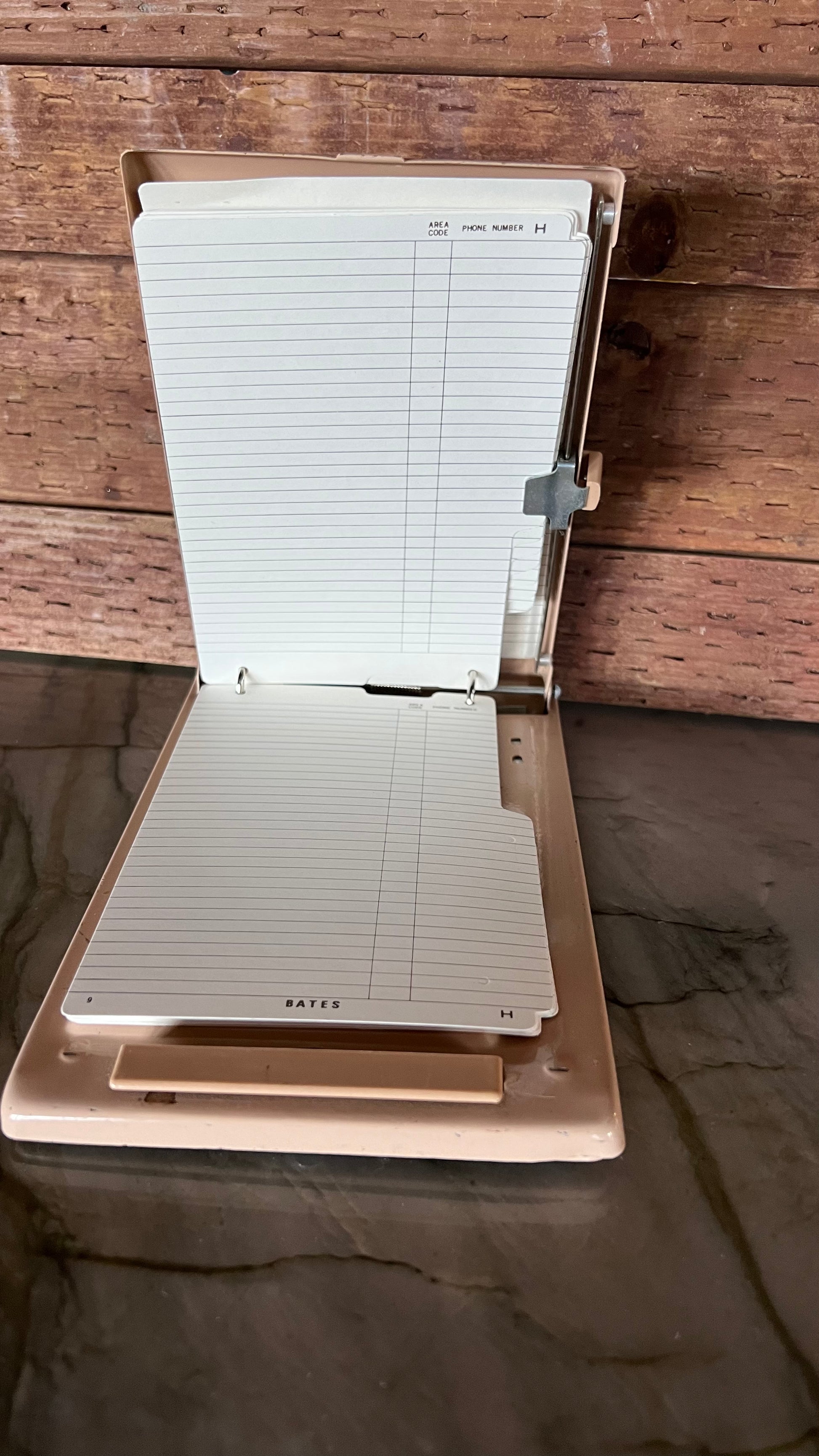 Vintage Bates list finder metal phone number organizer. Beautiful light pink color, mid century modern. Likely from the 1960s. Good vintage condition, with some surface ware and a dent on the bottom corner. No writing inside, all original pages are blank! Measures 8.5” by 5.25” by 1.25”.