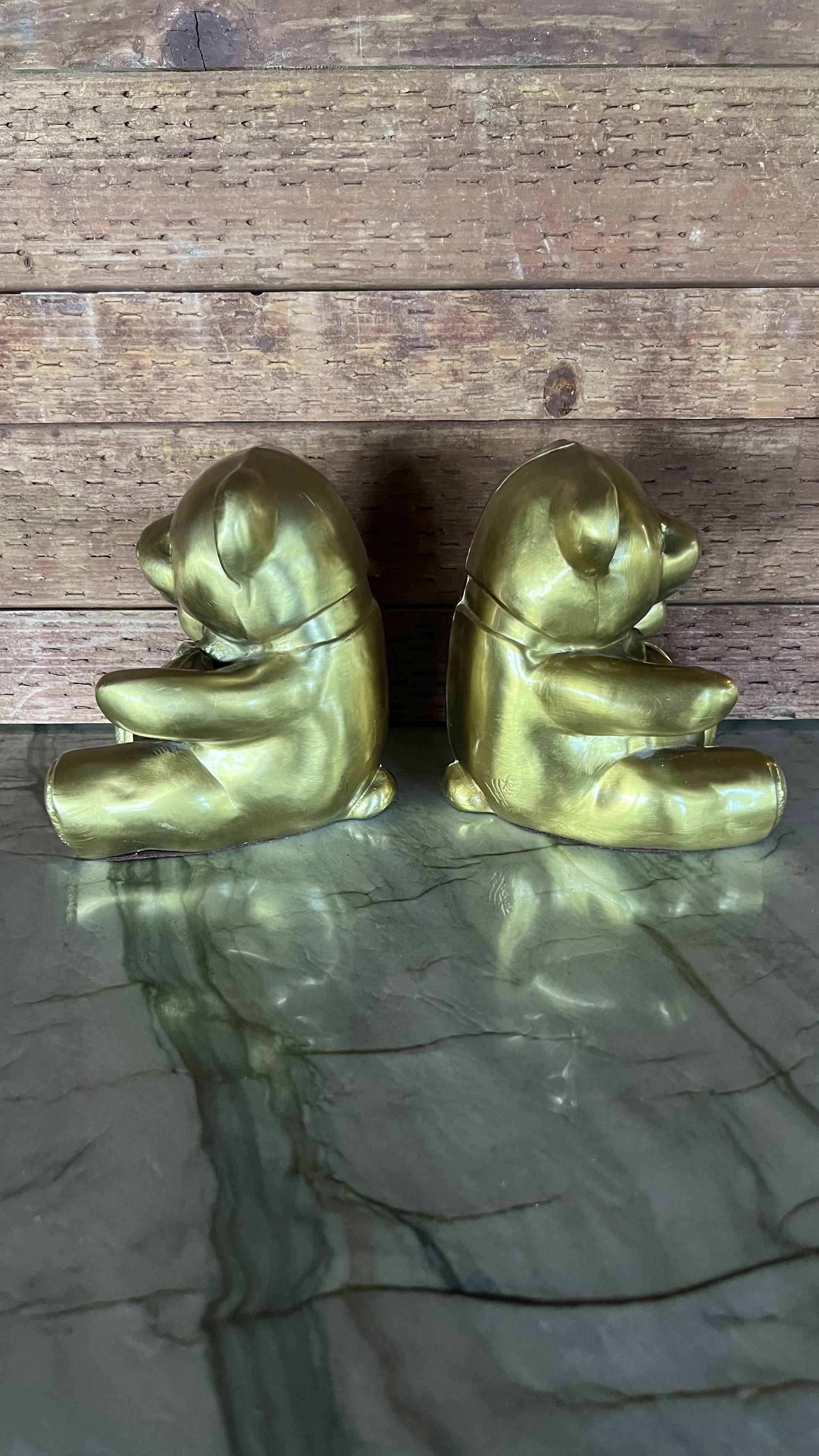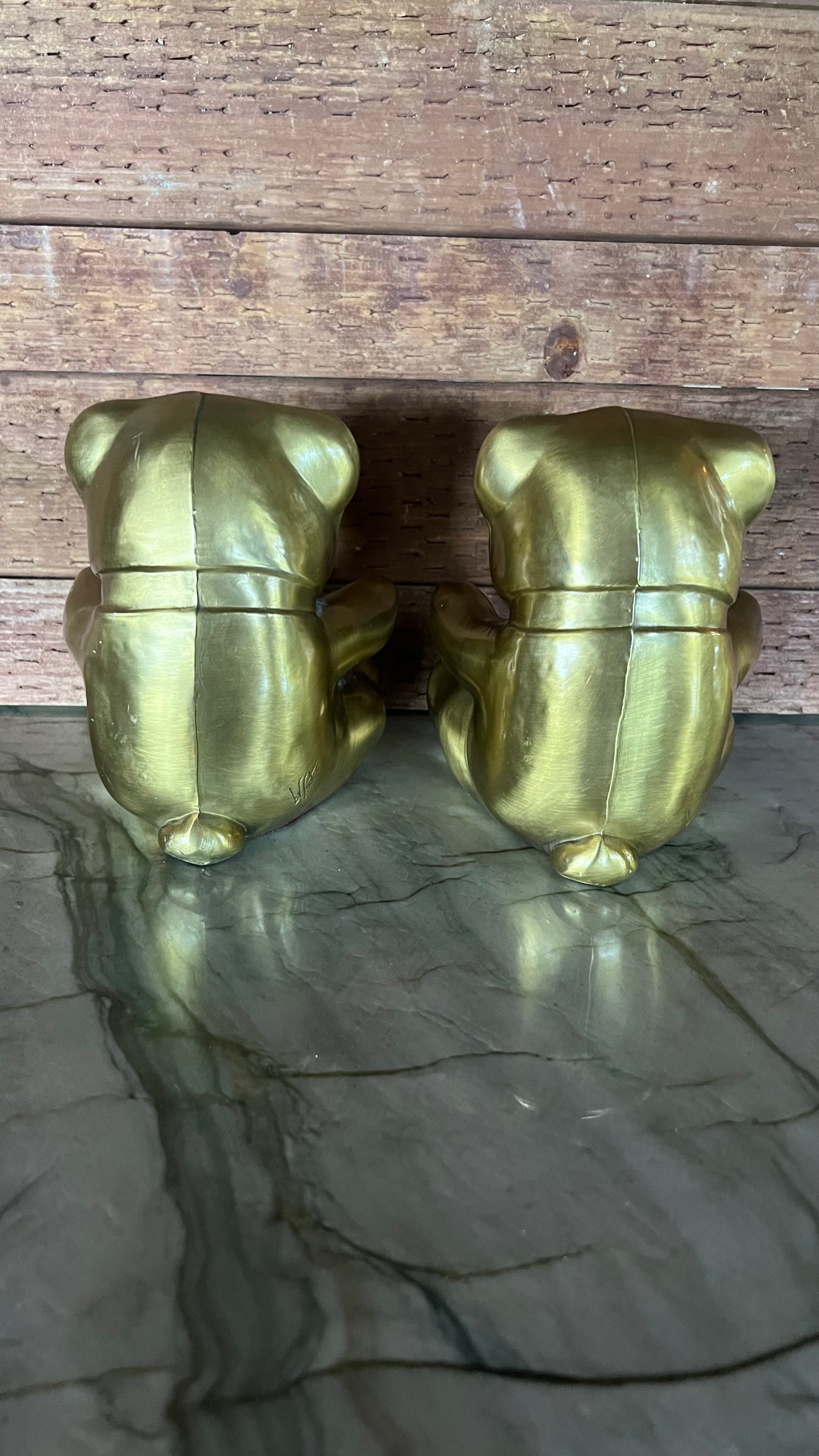 Vintage set of two beautiful (heavy!) brass teddy bear bookends, made by Victor Teddy. The bears read “Wuv Me” on the bellies, and are signed on the back. Both are in very good vintage condition, showing light signs of wear, photographed. Measures approximately 6” tall by 4.5” at the widest point.