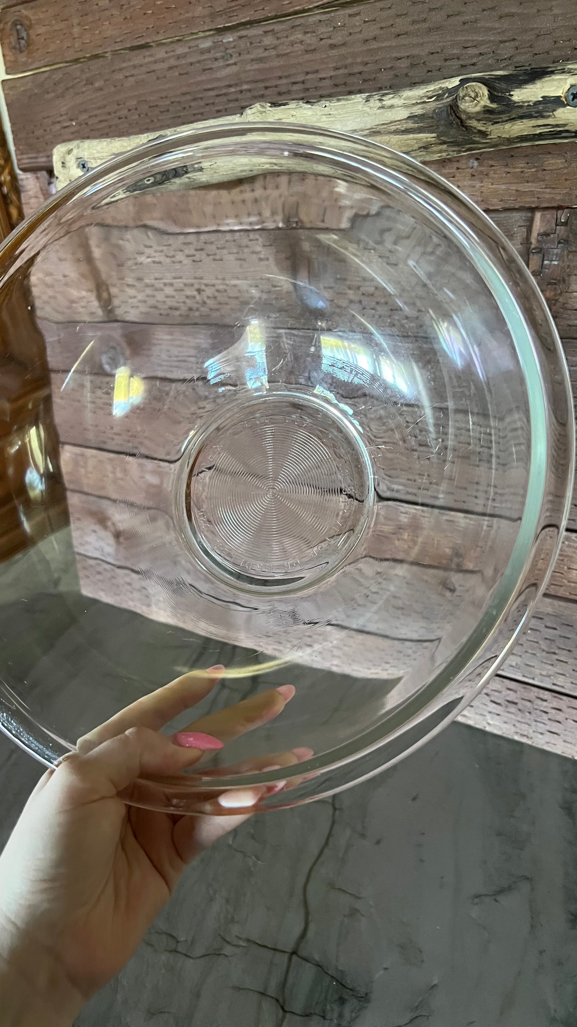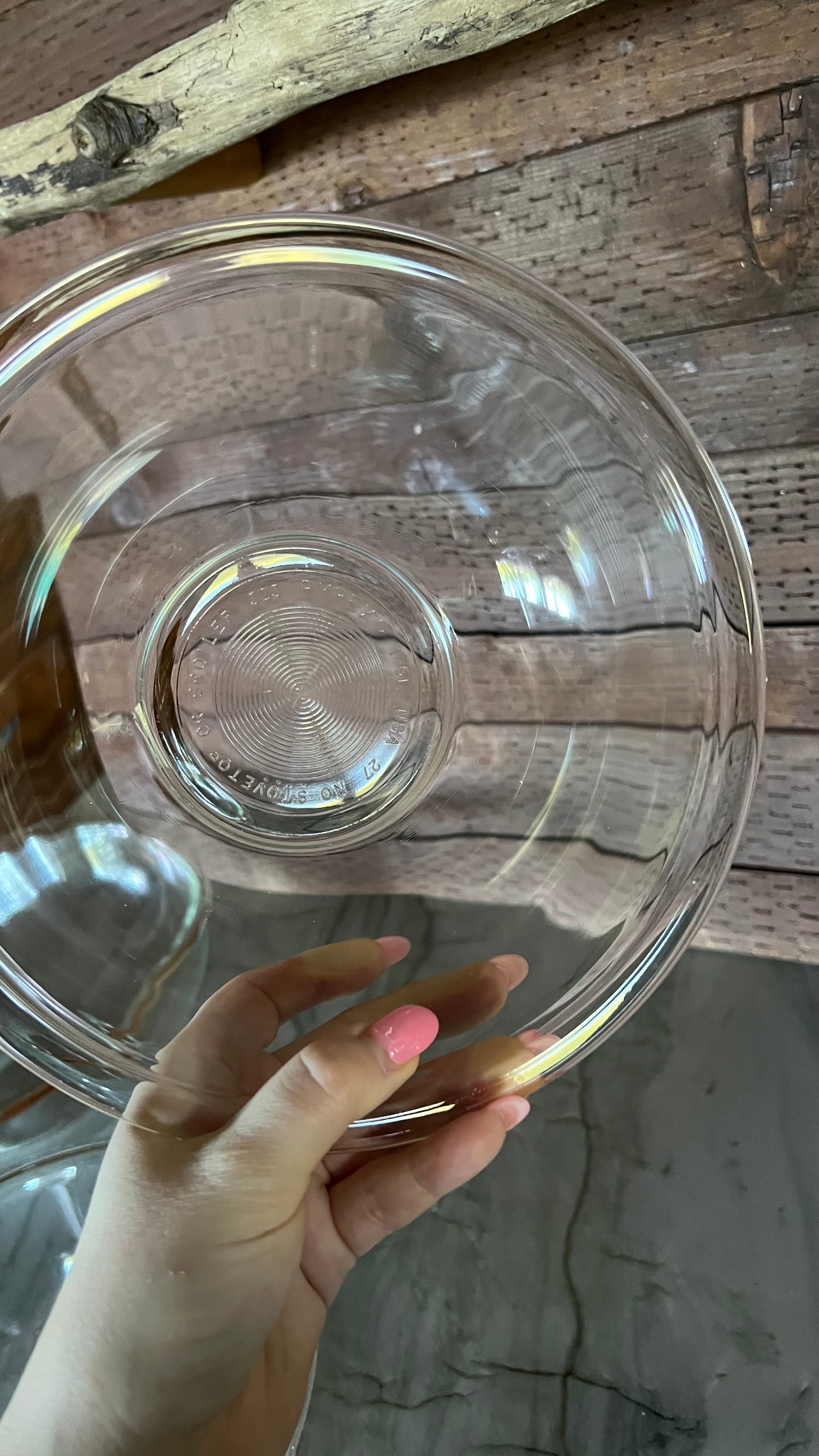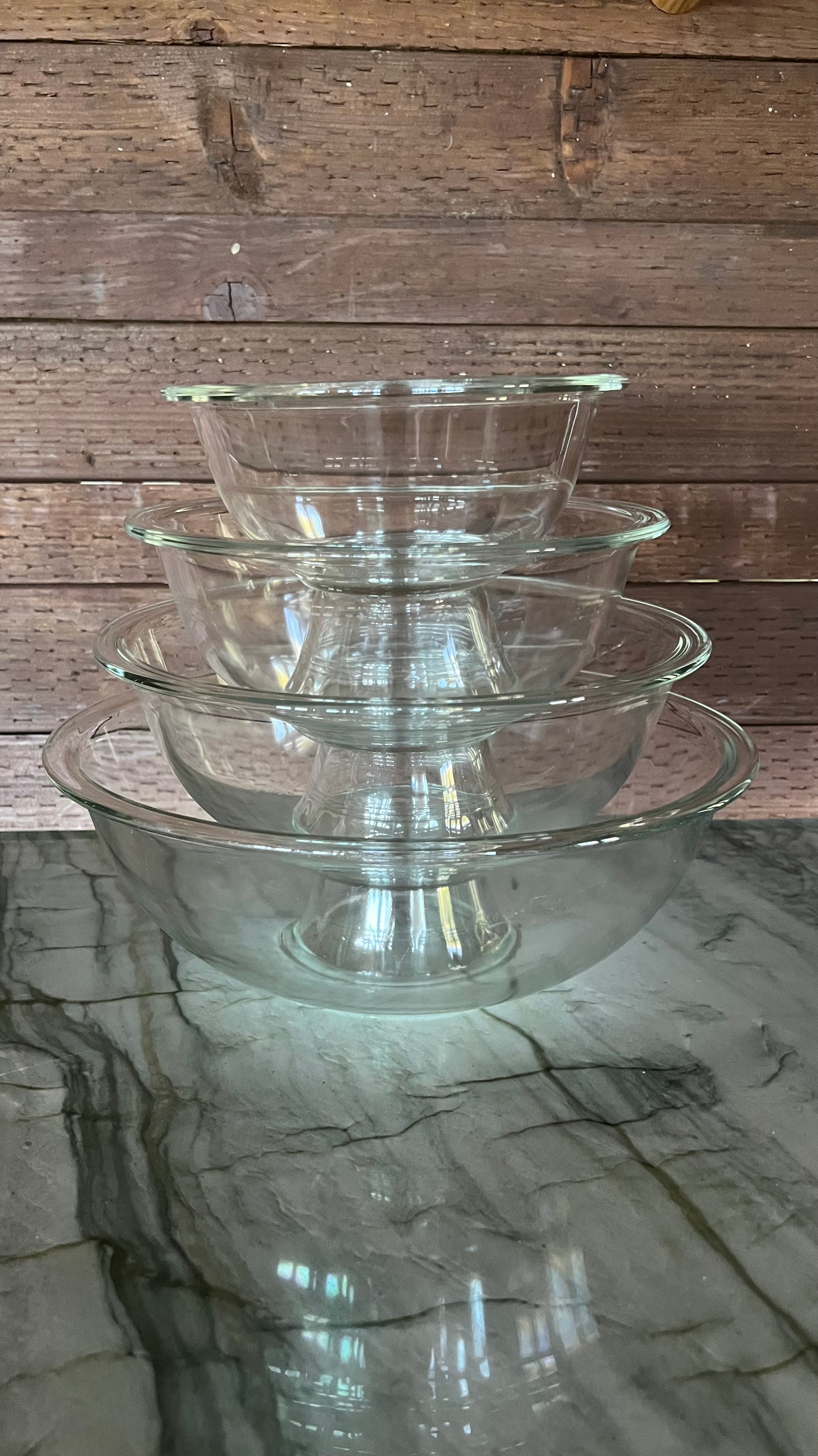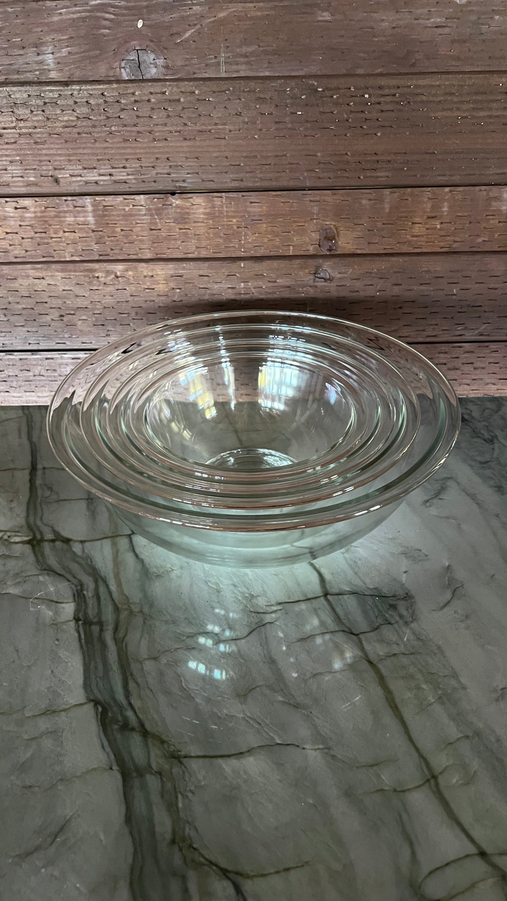 Vintage clear set of Pyrex mixing bowls. All four bowls are included and in great vintage condition. The largest bowl has a 11.75” diameter, and is 4.25” tall. There are utensil marks on the inside of the two largest bowls, while the smaller two bowls have no signs of wear.