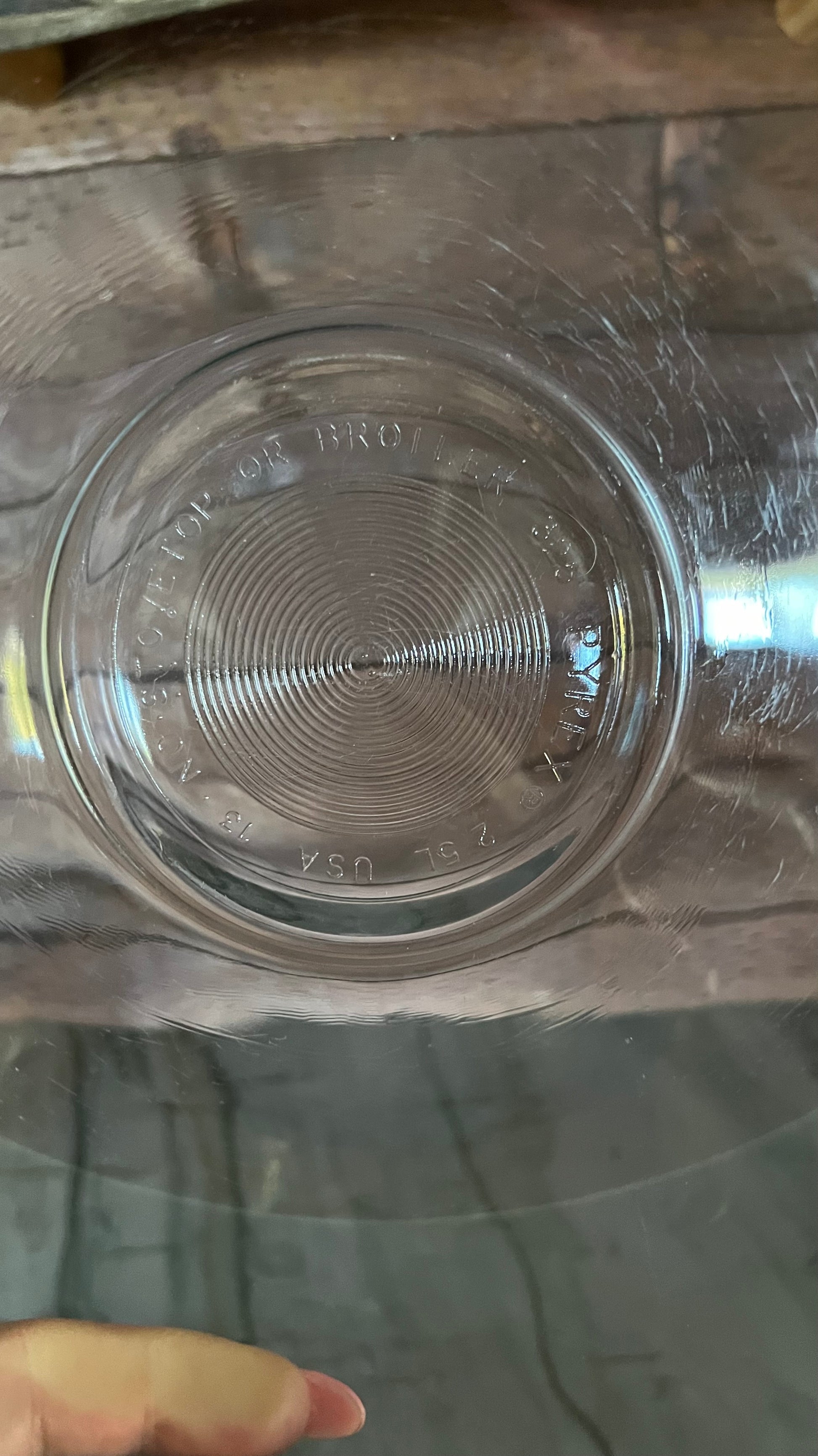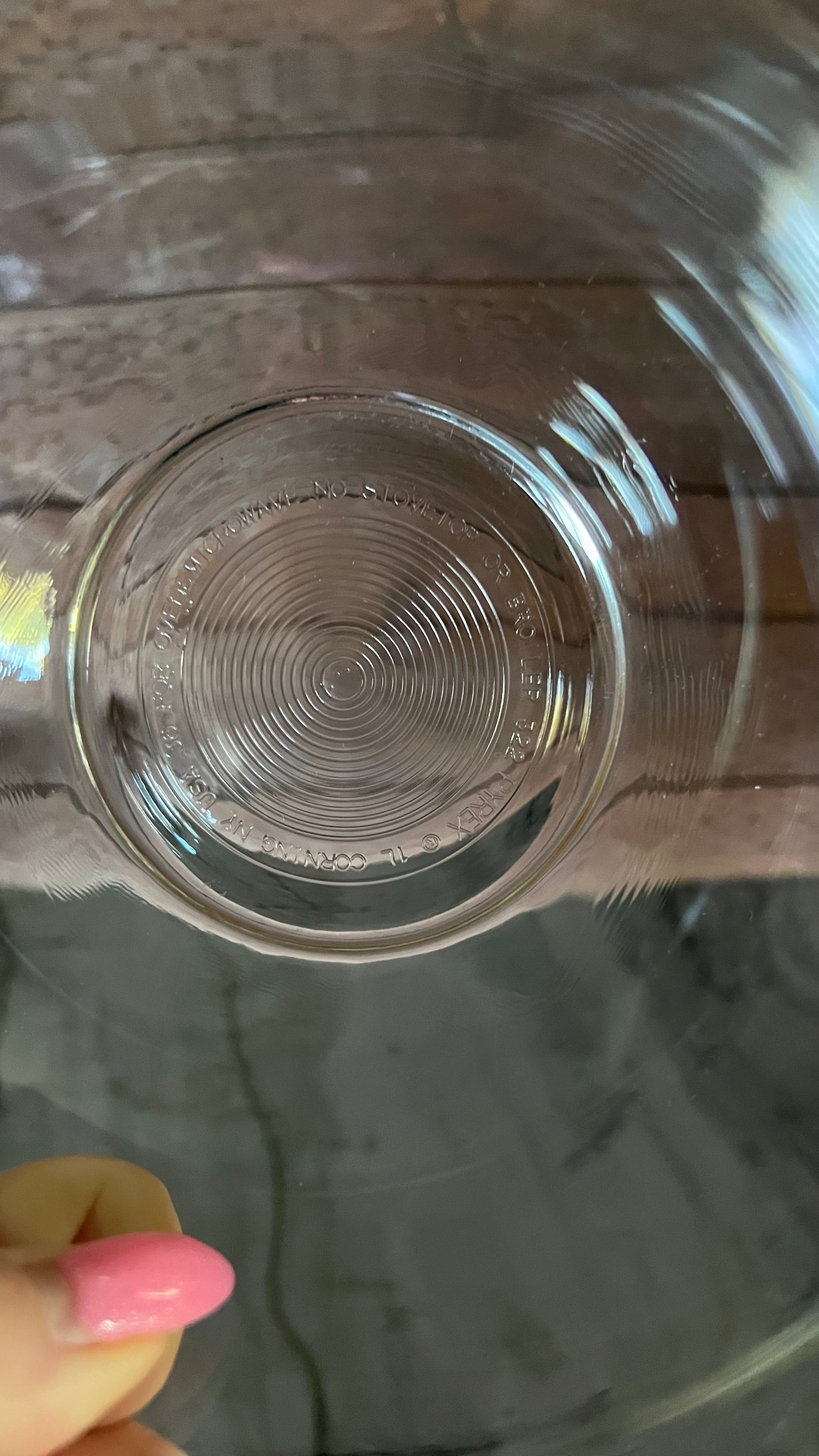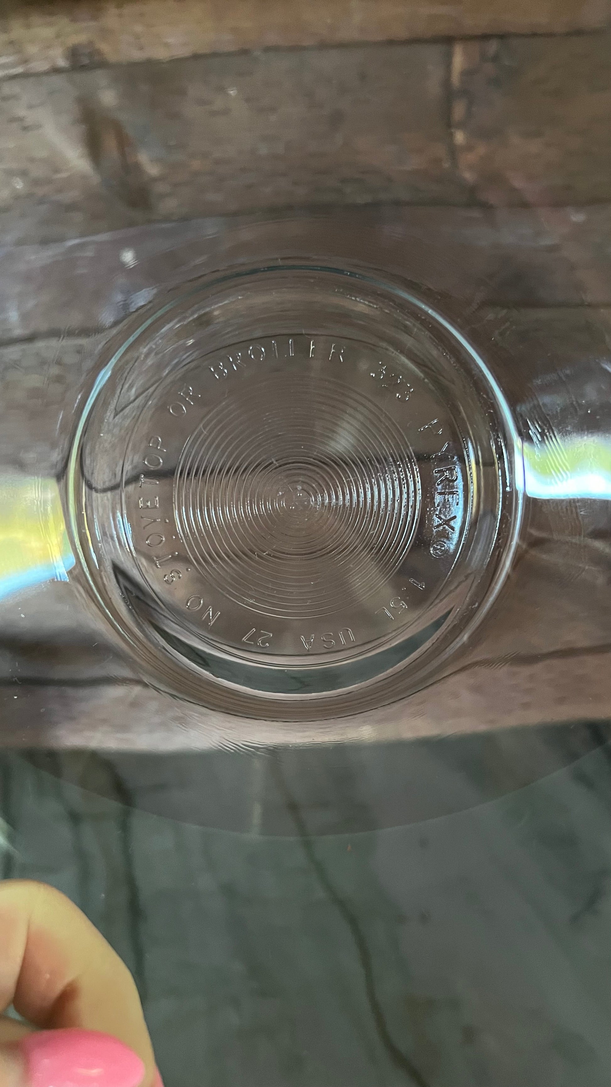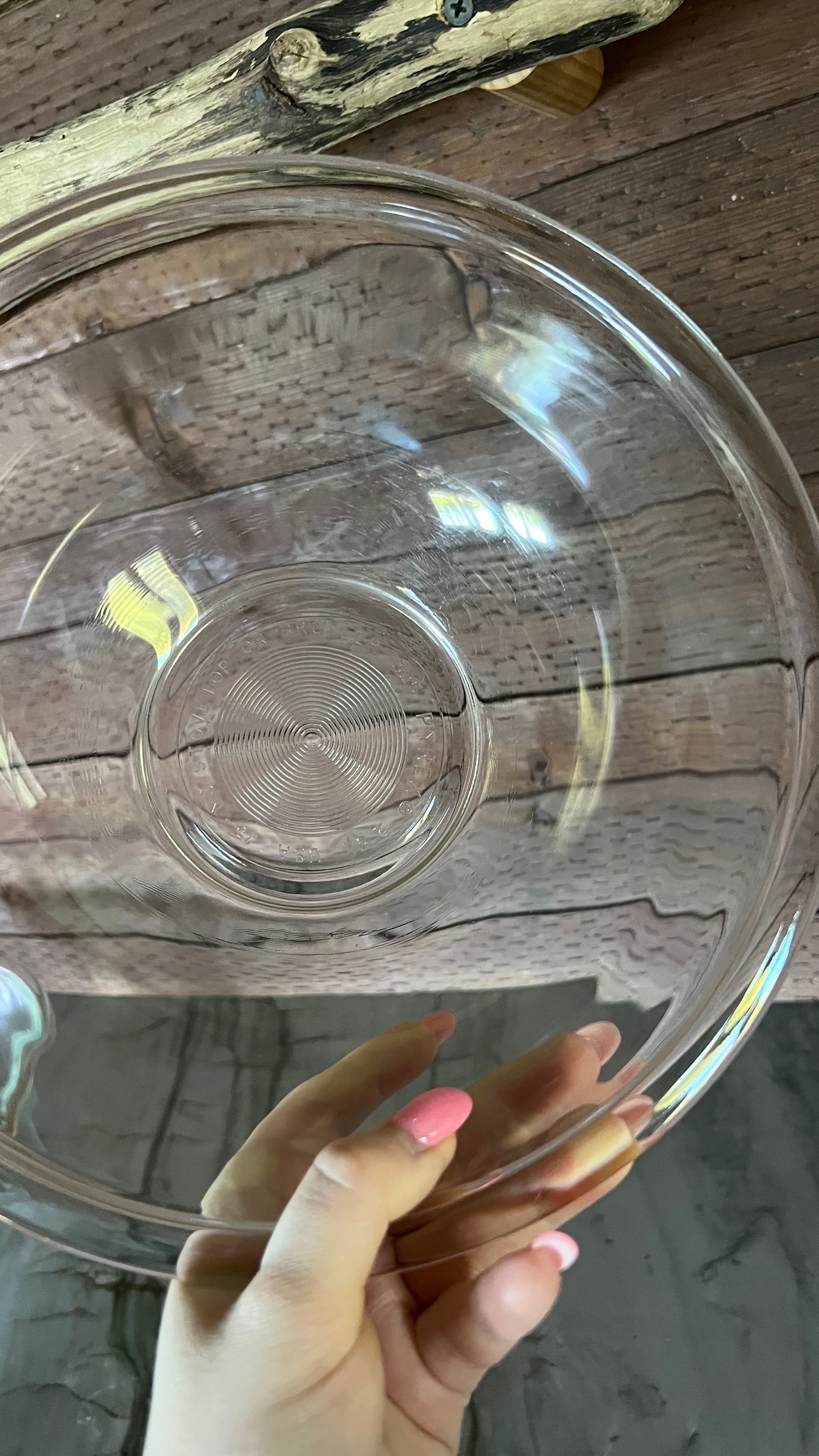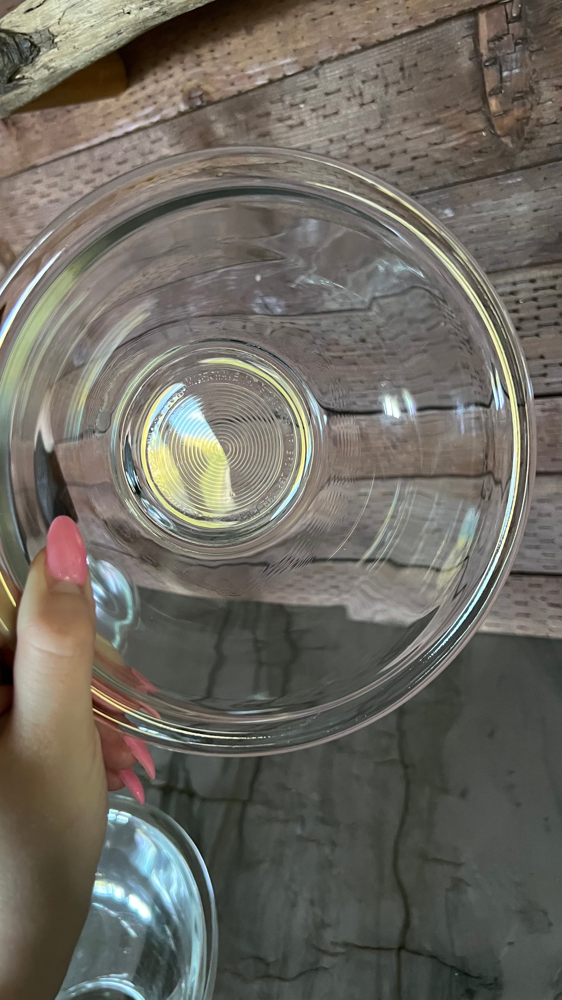 Vintage clear set of Pyrex mixing bowls. All four bowls are included and in great vintage condition. The largest bowl has a 11.75” diameter, and is 4.25” tall. There are utensil marks on the inside of the two largest bowls, while the smaller two bowls have no signs of wear.