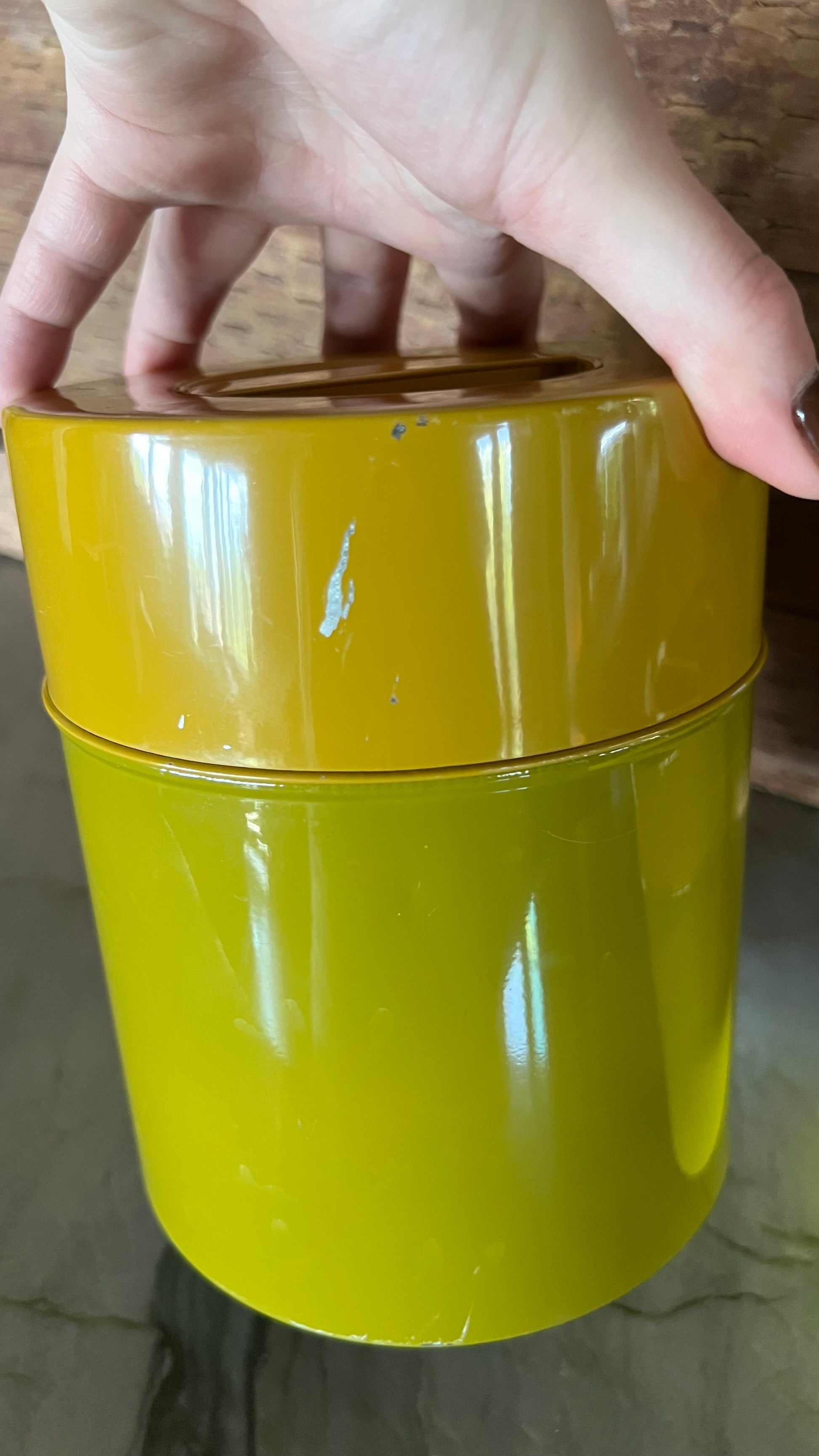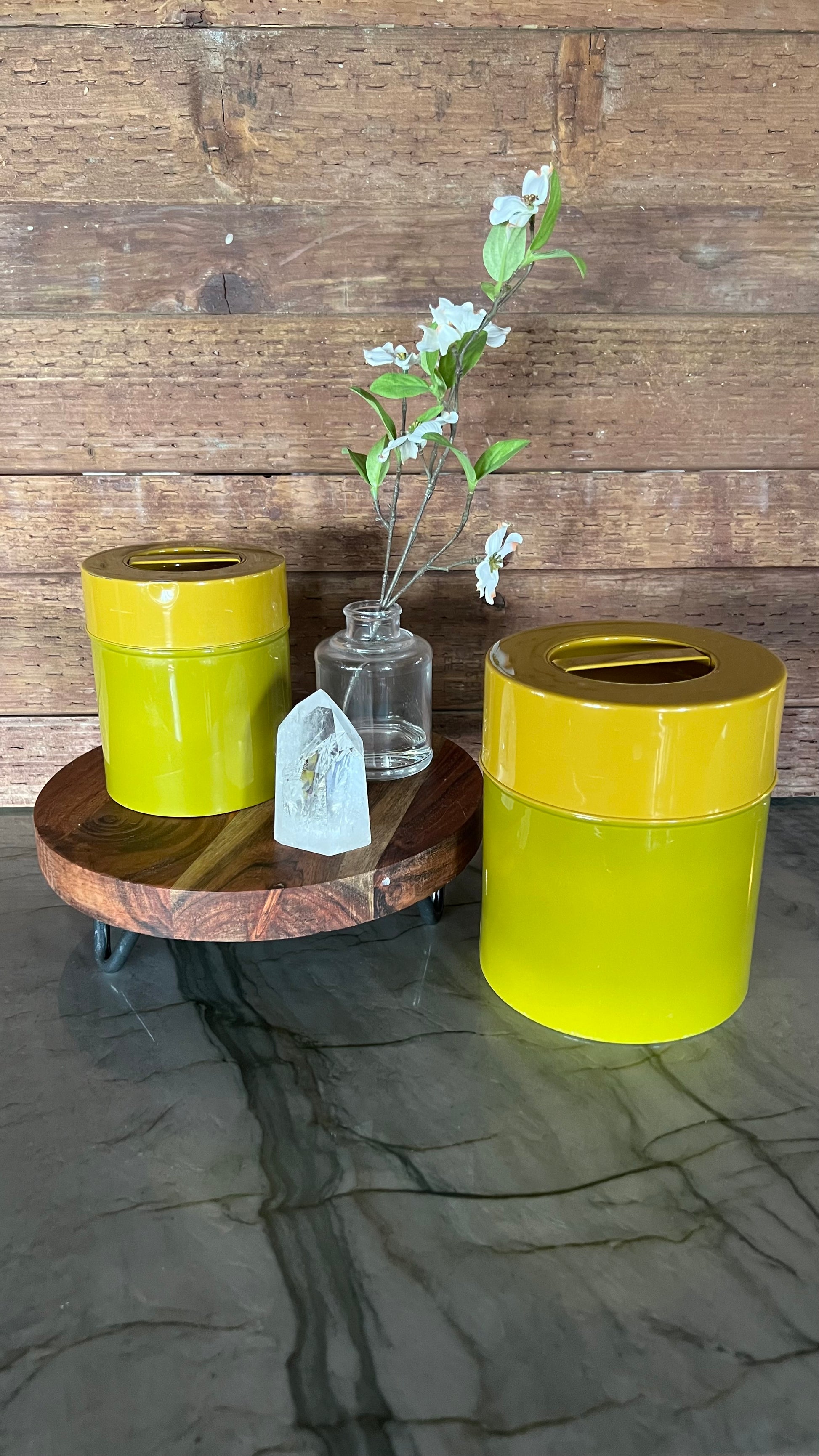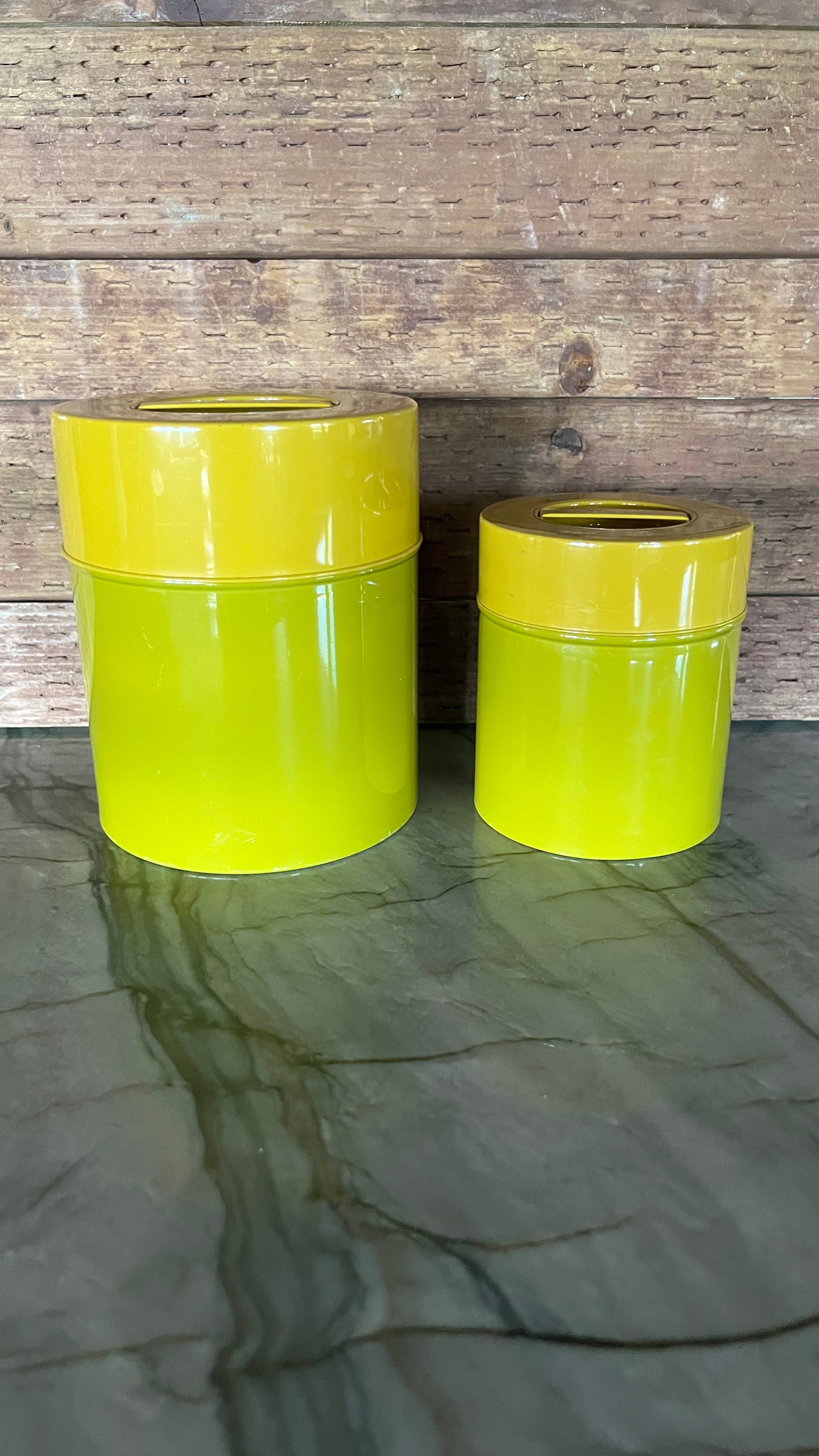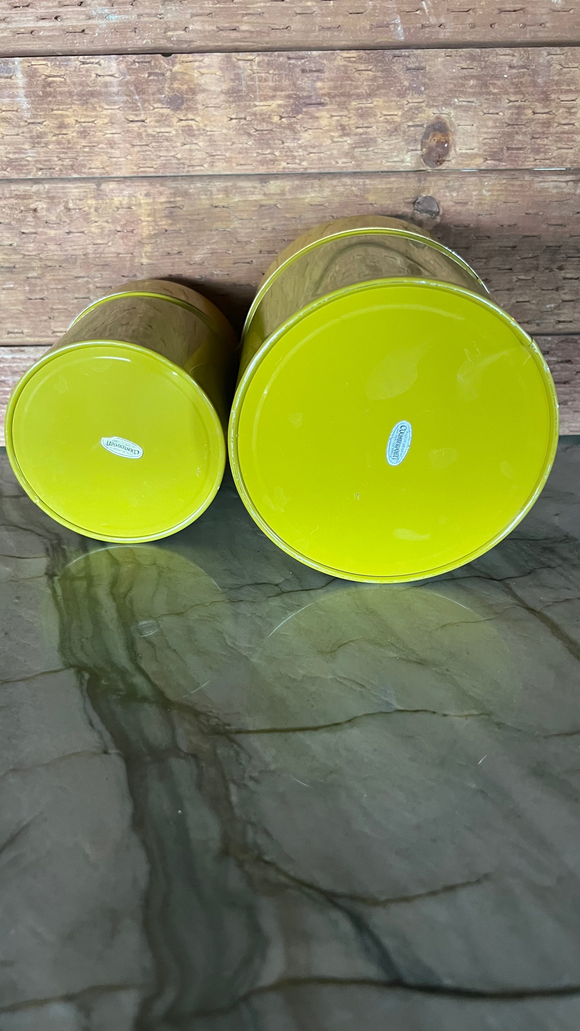 Set of two vintage Counterpoint metal canisters. Deep gold and green in color. Made in Japan, likely from the 1970s. Large canister measures 6” tall with a 5” diameter at the base. Smaller canister measures 4.5” tall with a 3.75” diameter at the base. Good vintage condition with some surface wear and very mild dents.
