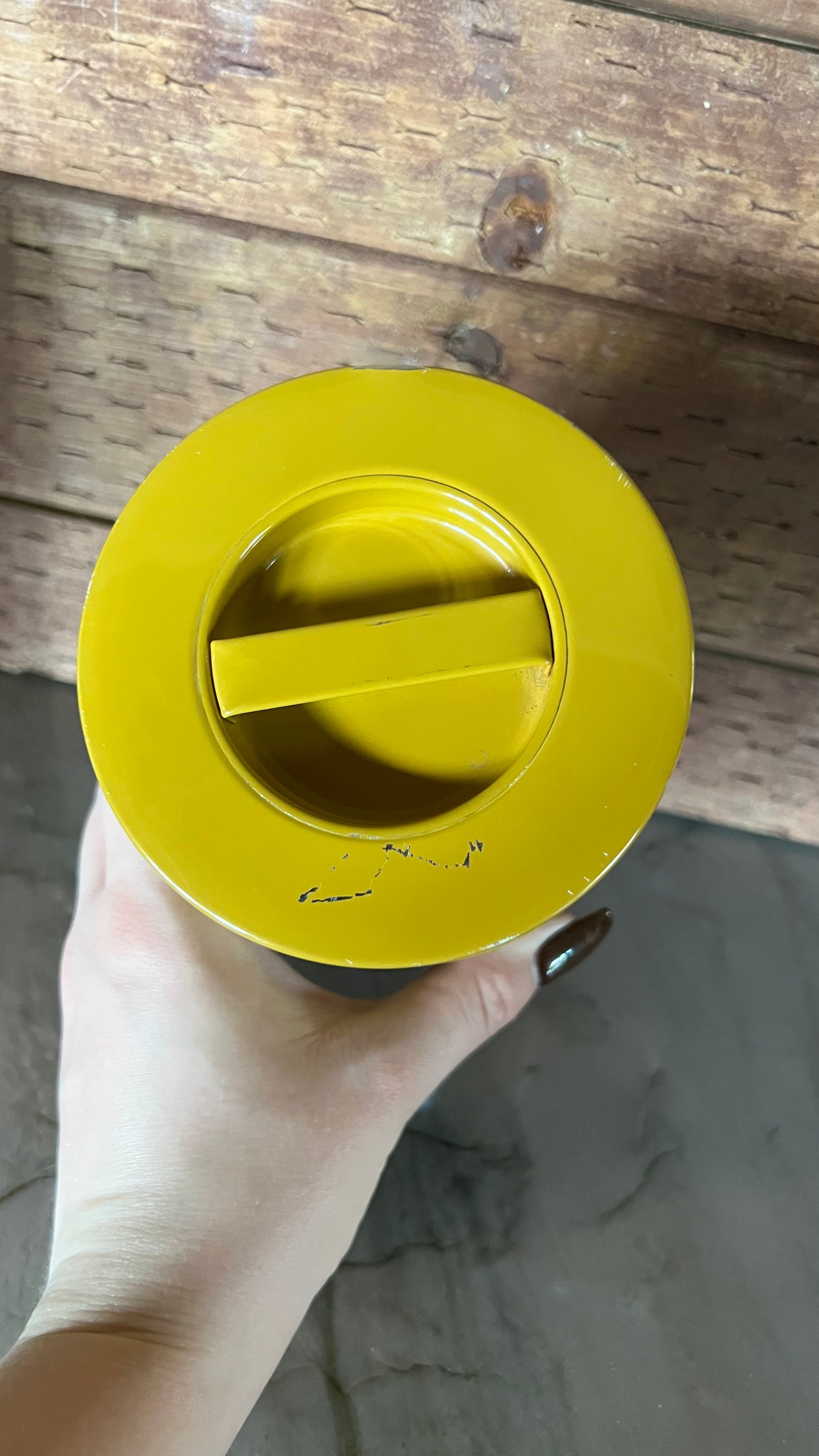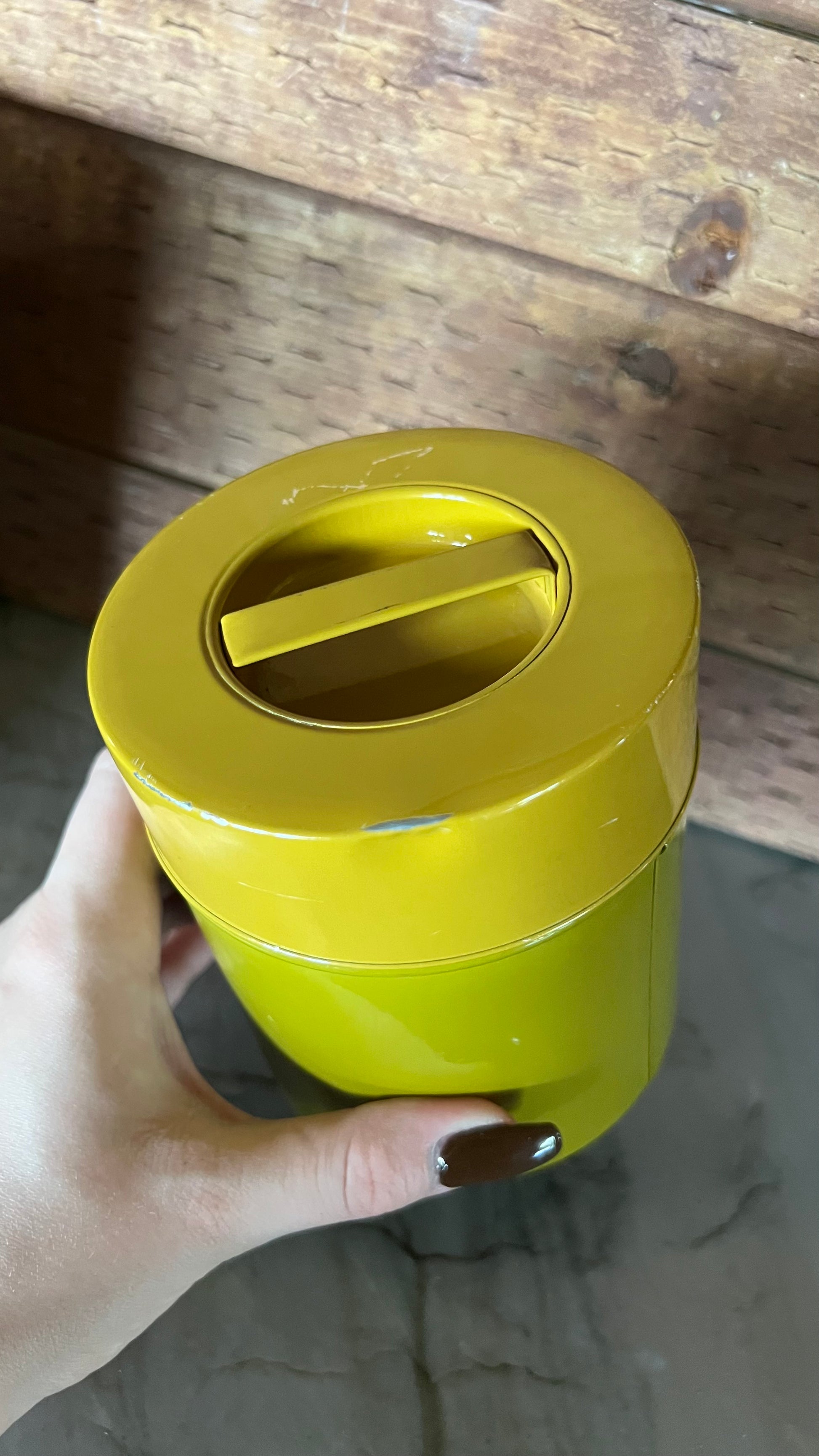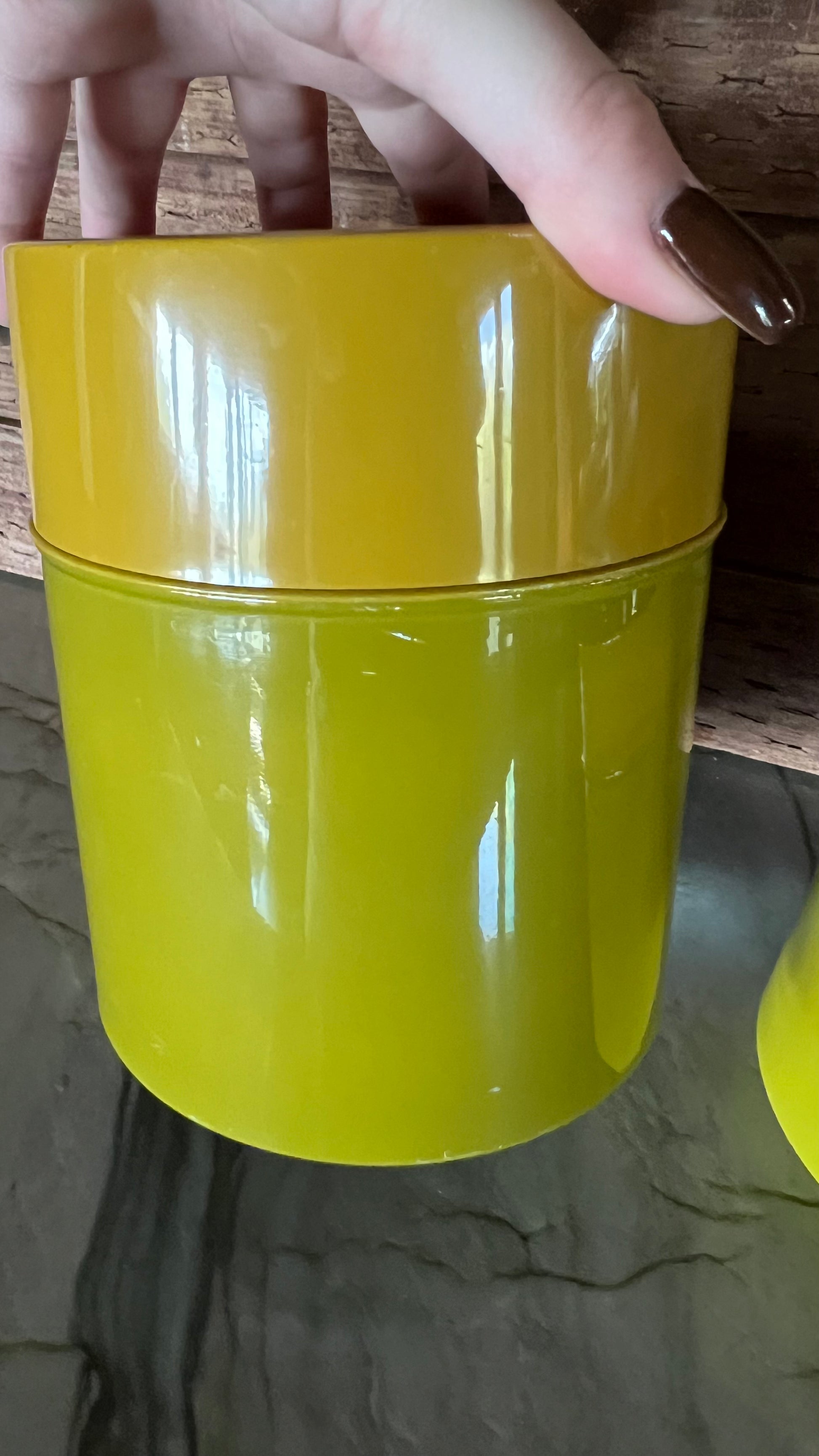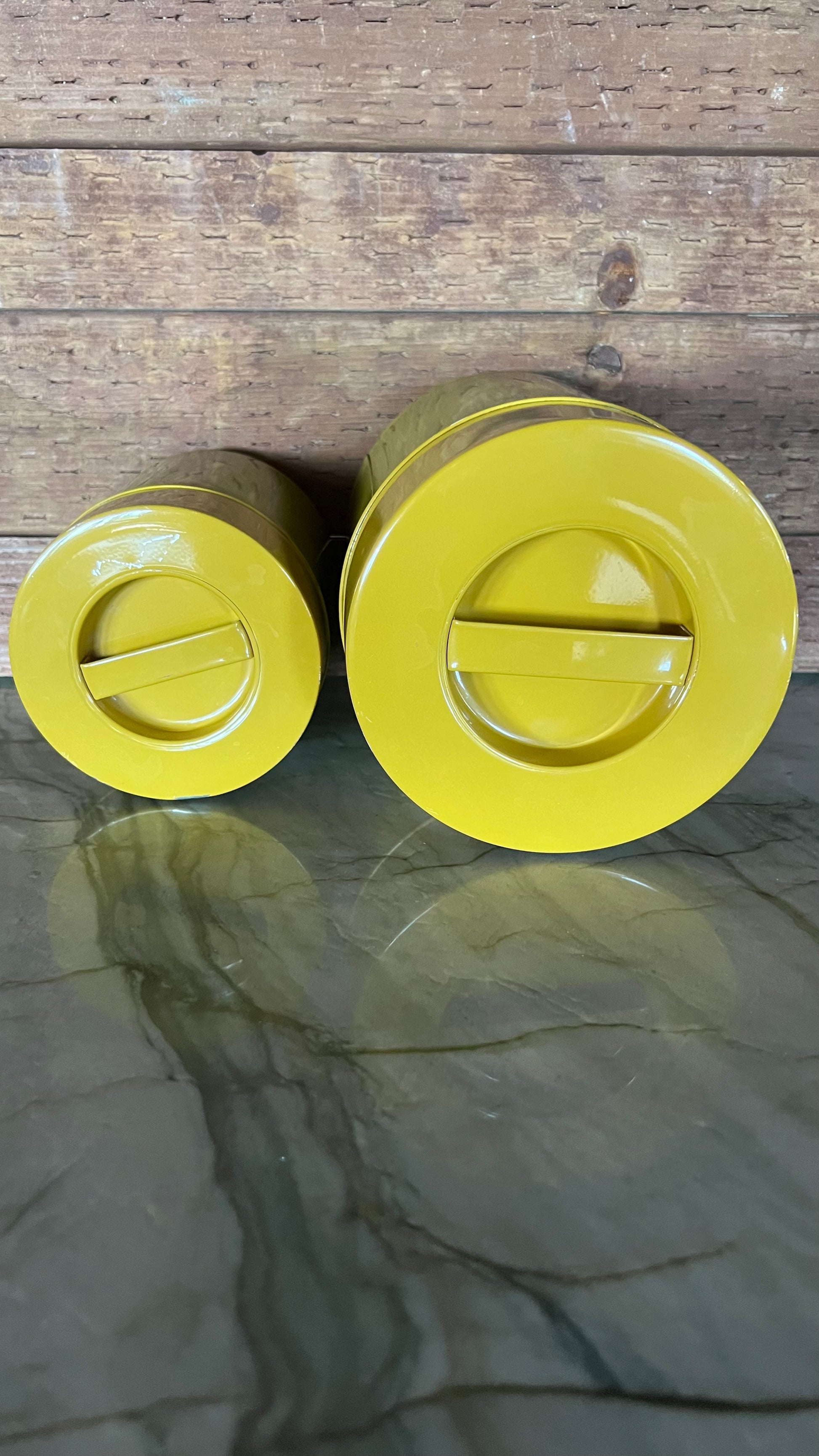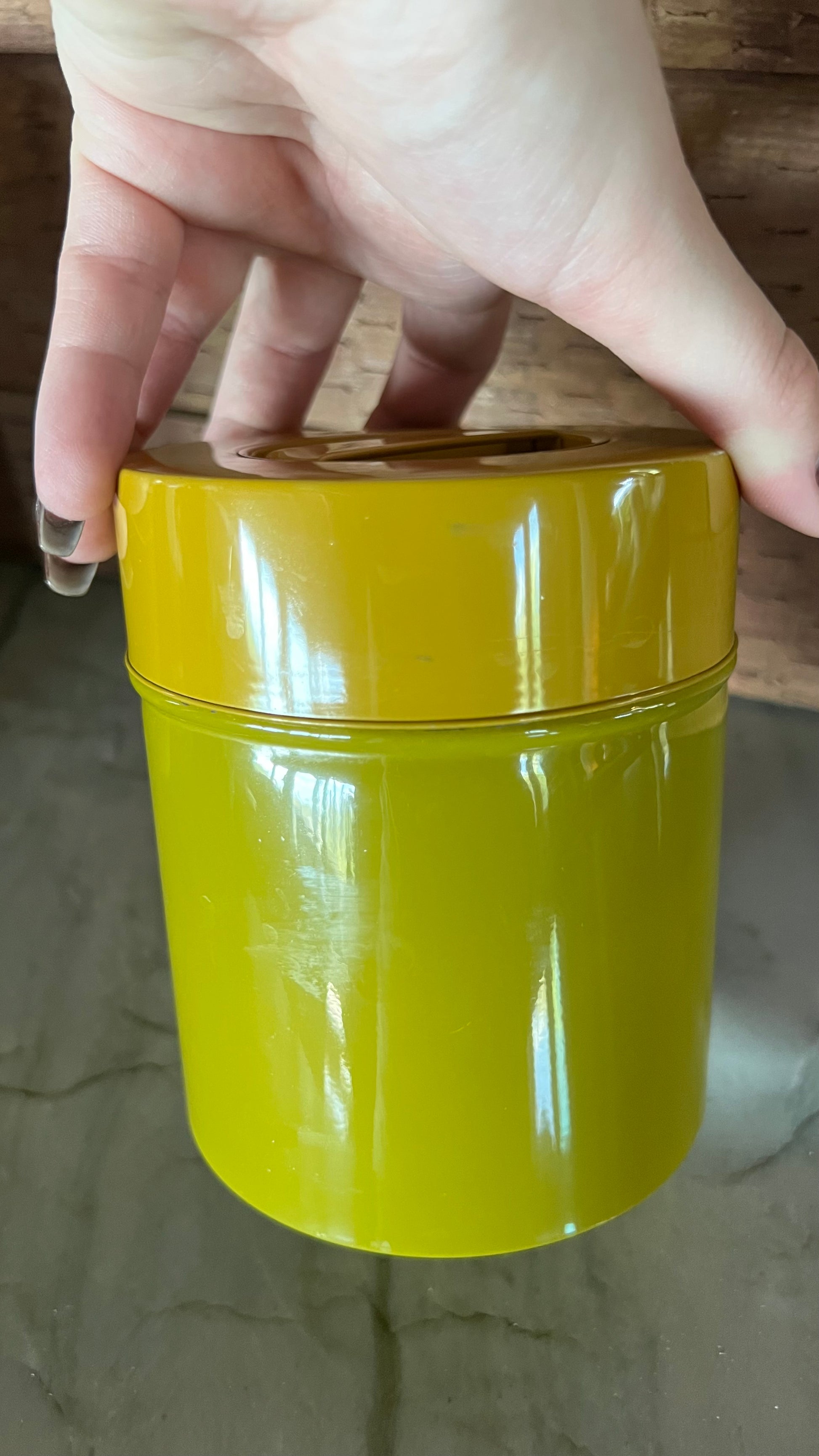 Set of two vintage Counterpoint metal canisters. Deep gold and green in color. Made in Japan, likely from the 1970s. Large canister measures 6” tall with a 5” diameter at the base. Smaller canister measures 4.5” tall with a 3.75” diameter at the base. Good vintage condition with some surface wear and very mild dents.