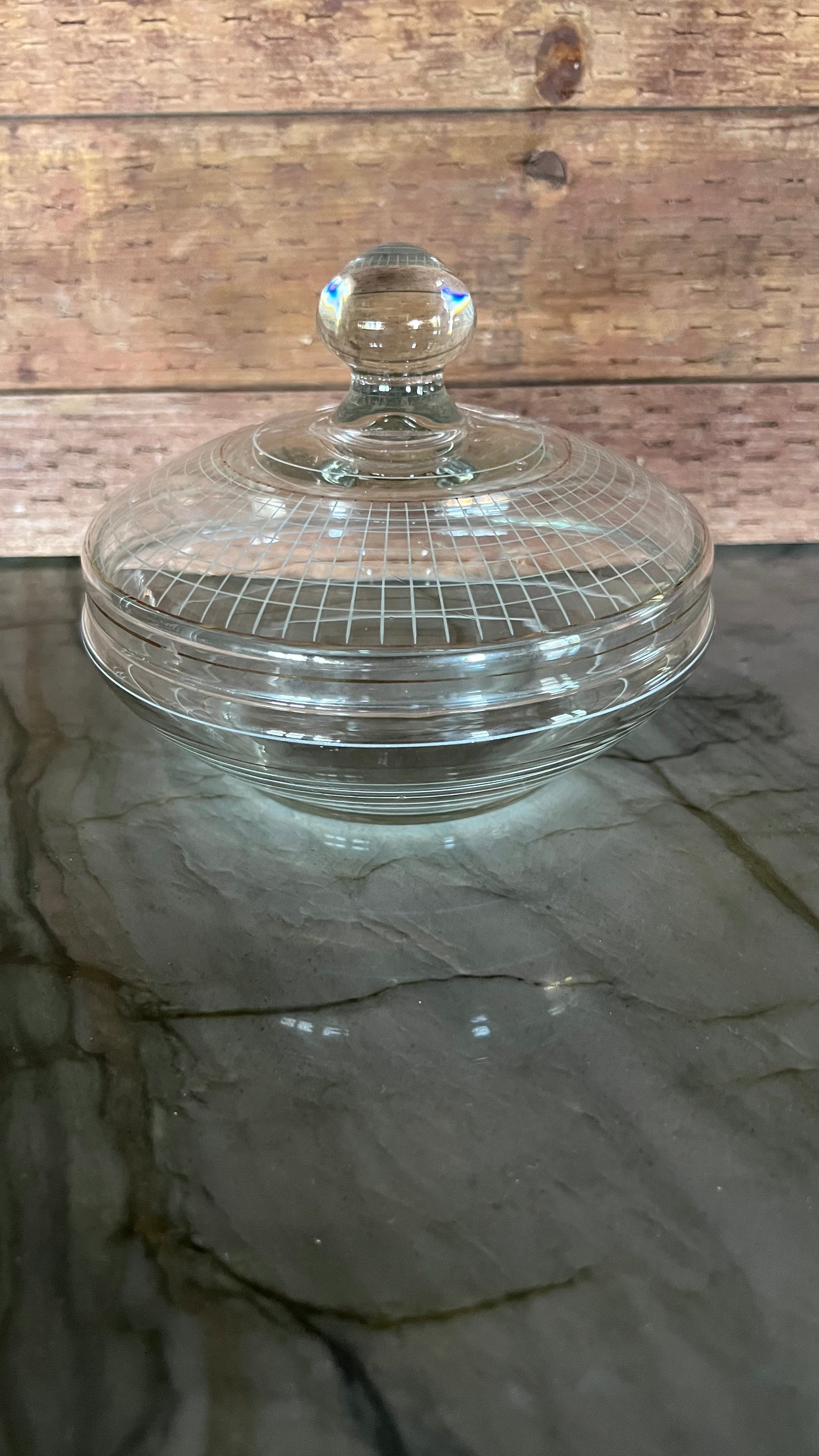 Vintage covered glass candy dish, with a large glass knob handle. Measures 5” tall with a 3.75” diameter at the base. Beautiful grid pattern on the lid, and stripes on the base, both in white and gold. Very good vintage condition, with a couple of light scratches, pictured. Beautiful piece!