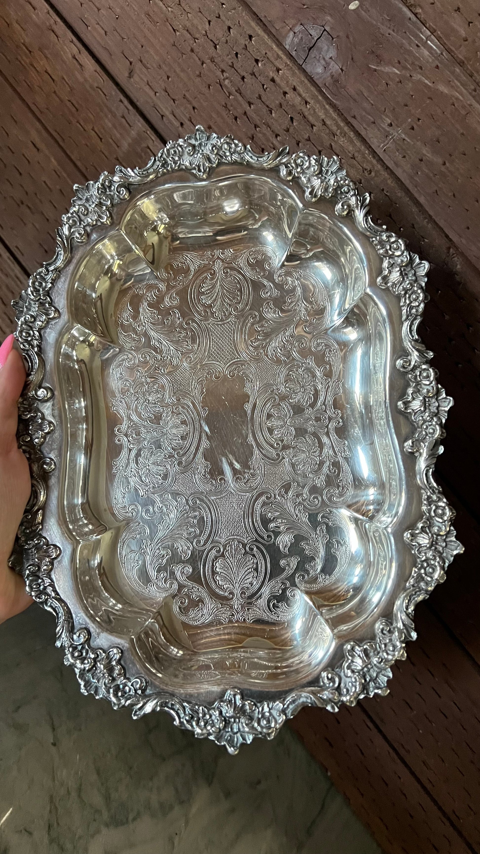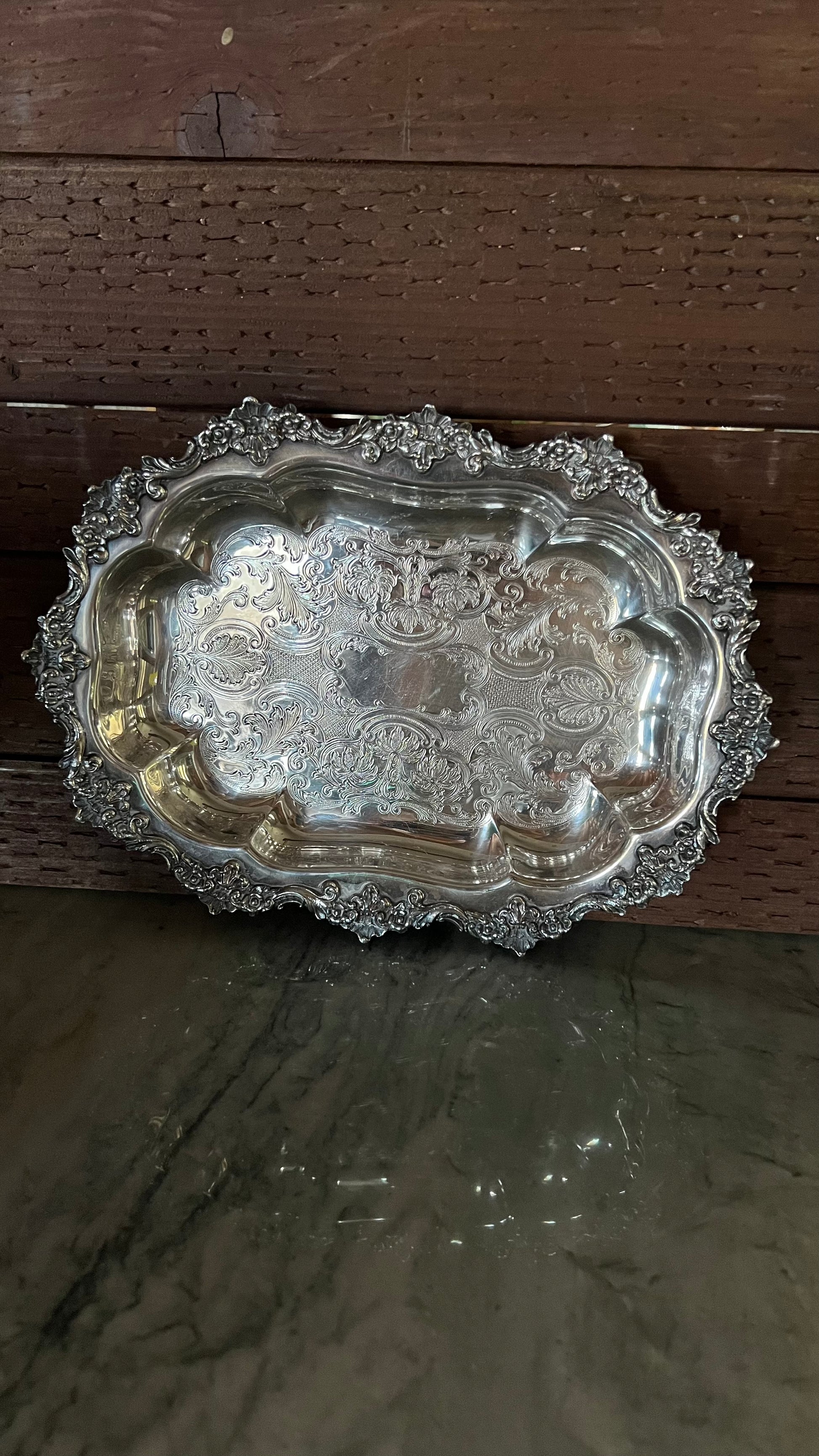 Vintage Crown & Shield Silver tray. Beautiful details in the etched design. It measures 11.25” long and 8.5” wide. In great vintage condition, showing light signs of use.