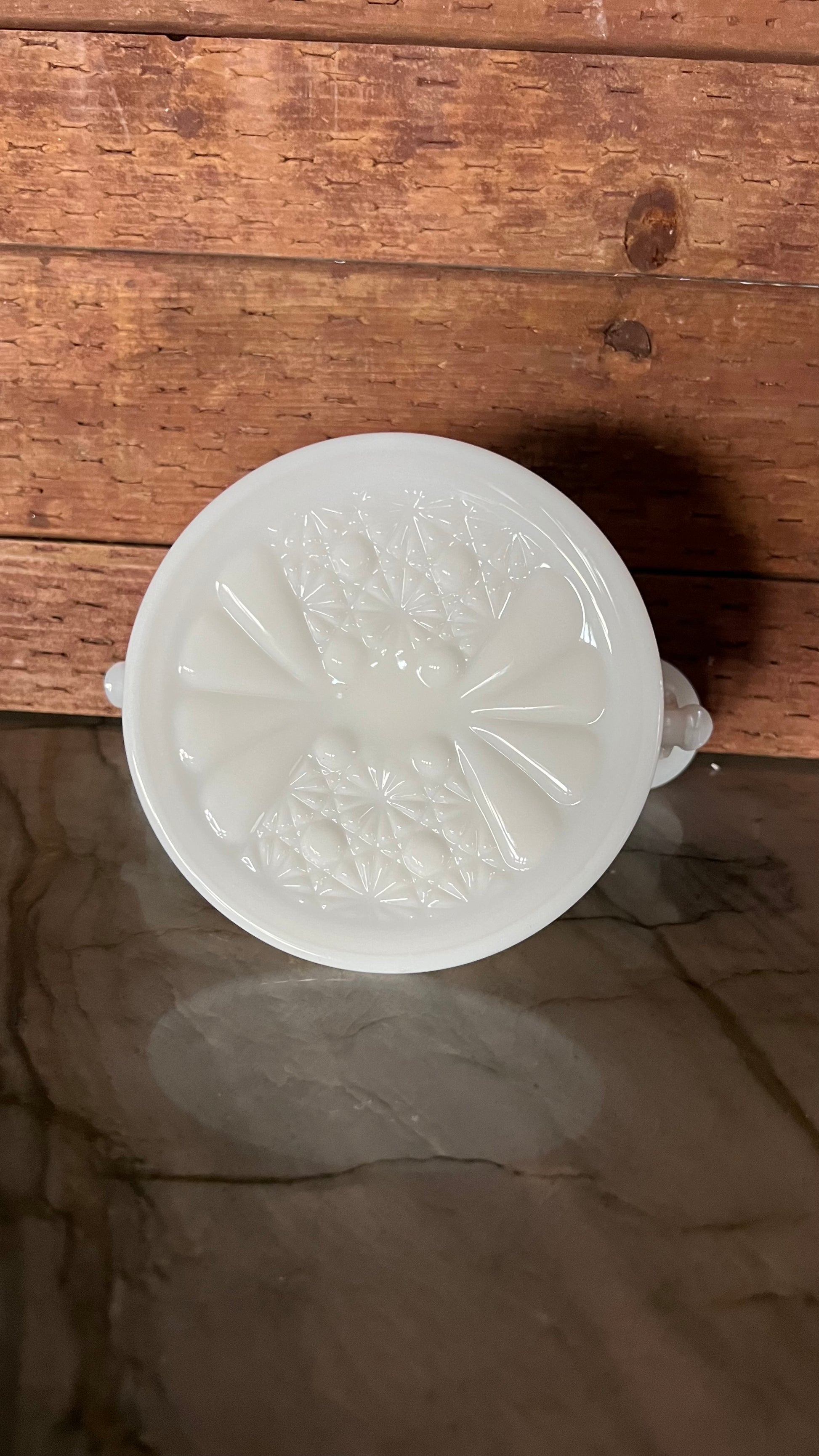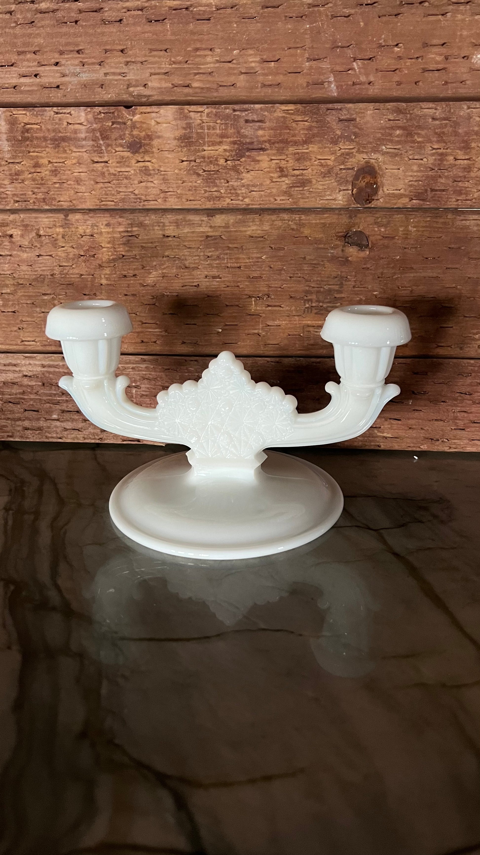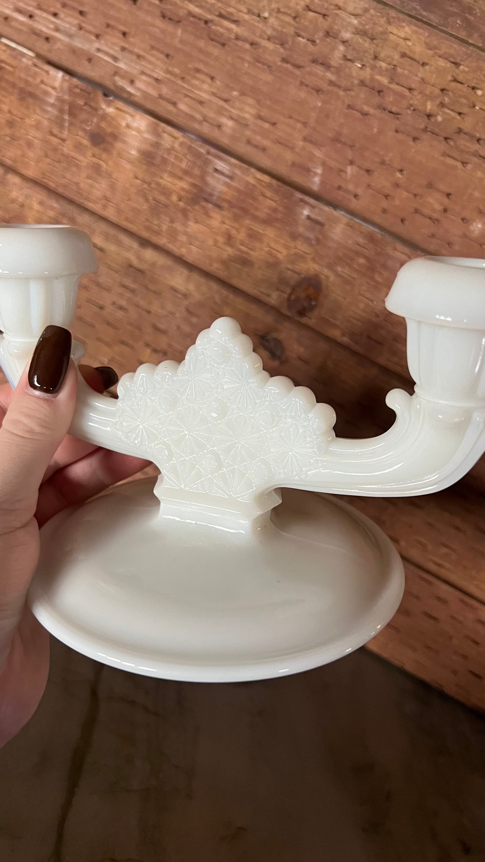 Beautiful Fenton milk glass double candle stick holder. Measures 7” across at the top, and has a 5” diameter at the base. There is an intricate pattern on the center piece, and on the bottom. There are three available, each sold separately. All are in excellent vintage condition!