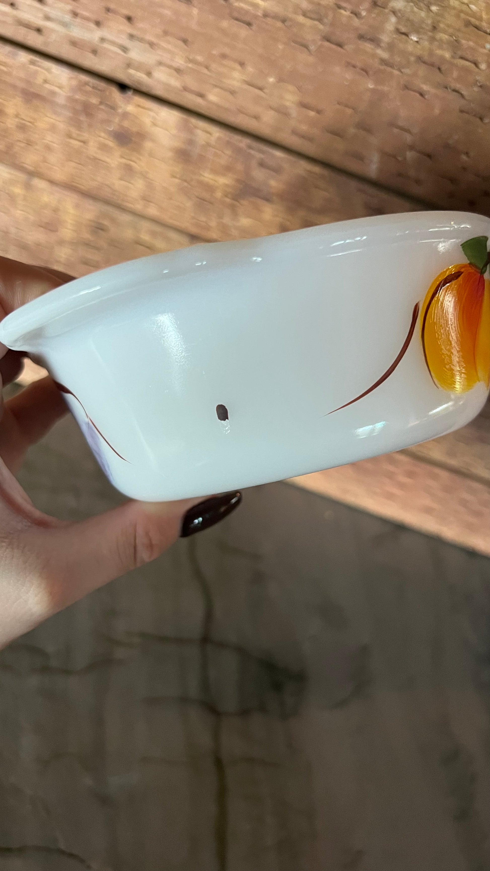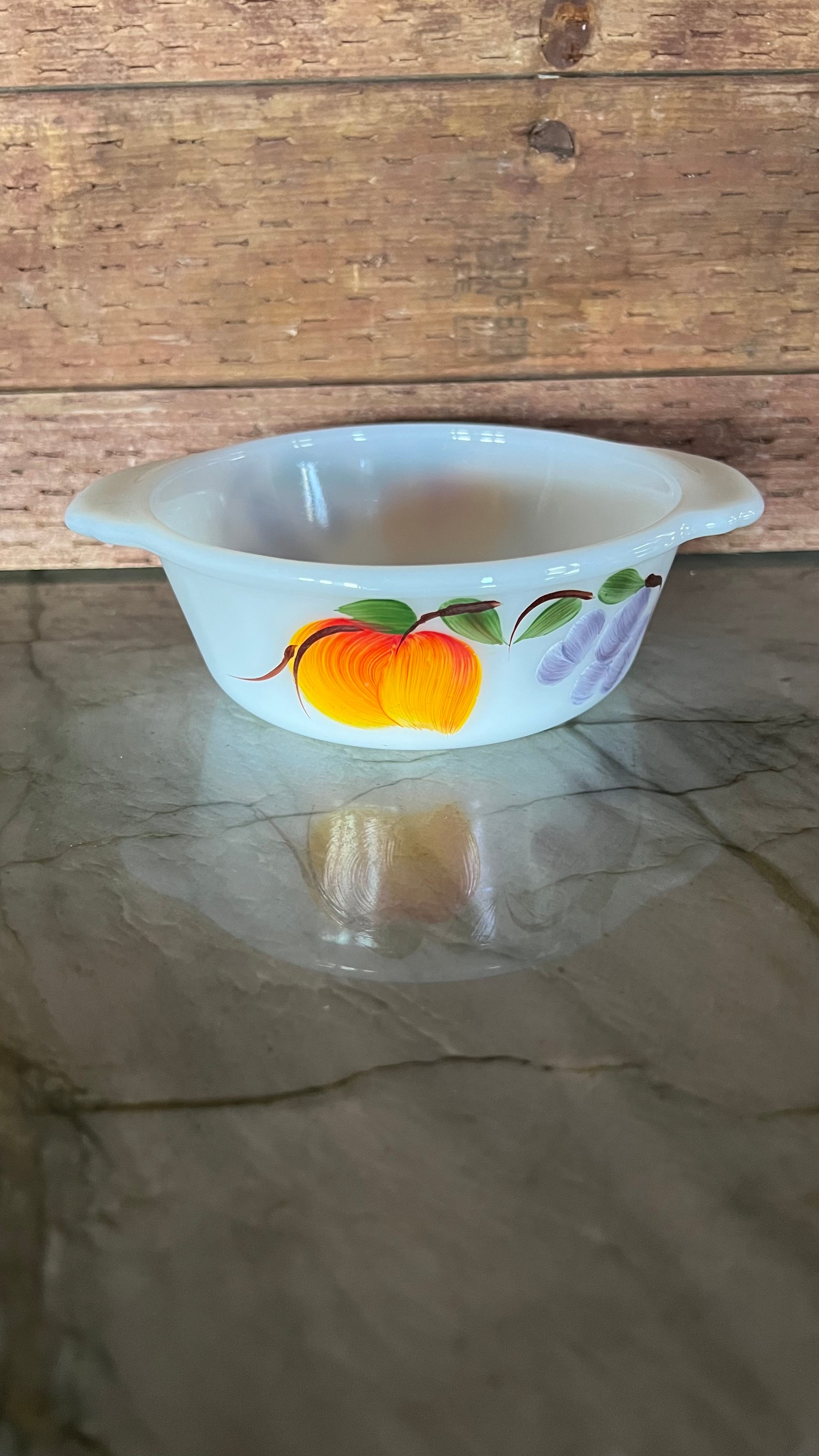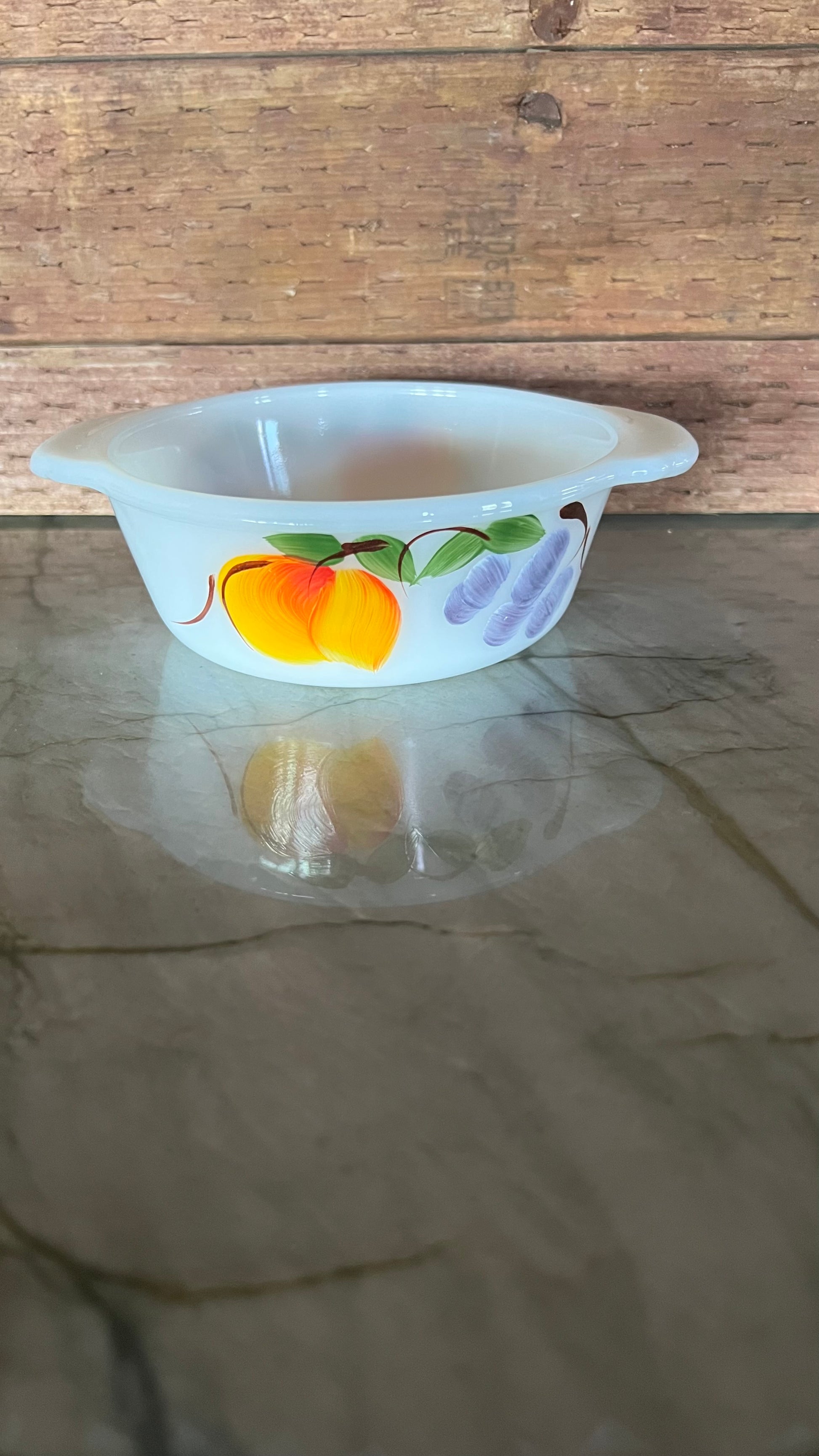 Vintage Fire King fruit print casserole one pint dish. This is the Gay Fad pattern. In great vintage condition, there’s one spot where there appears to be extra paint from manufacturing, and chip below it where it looks like someone tried to get the extra paint off.