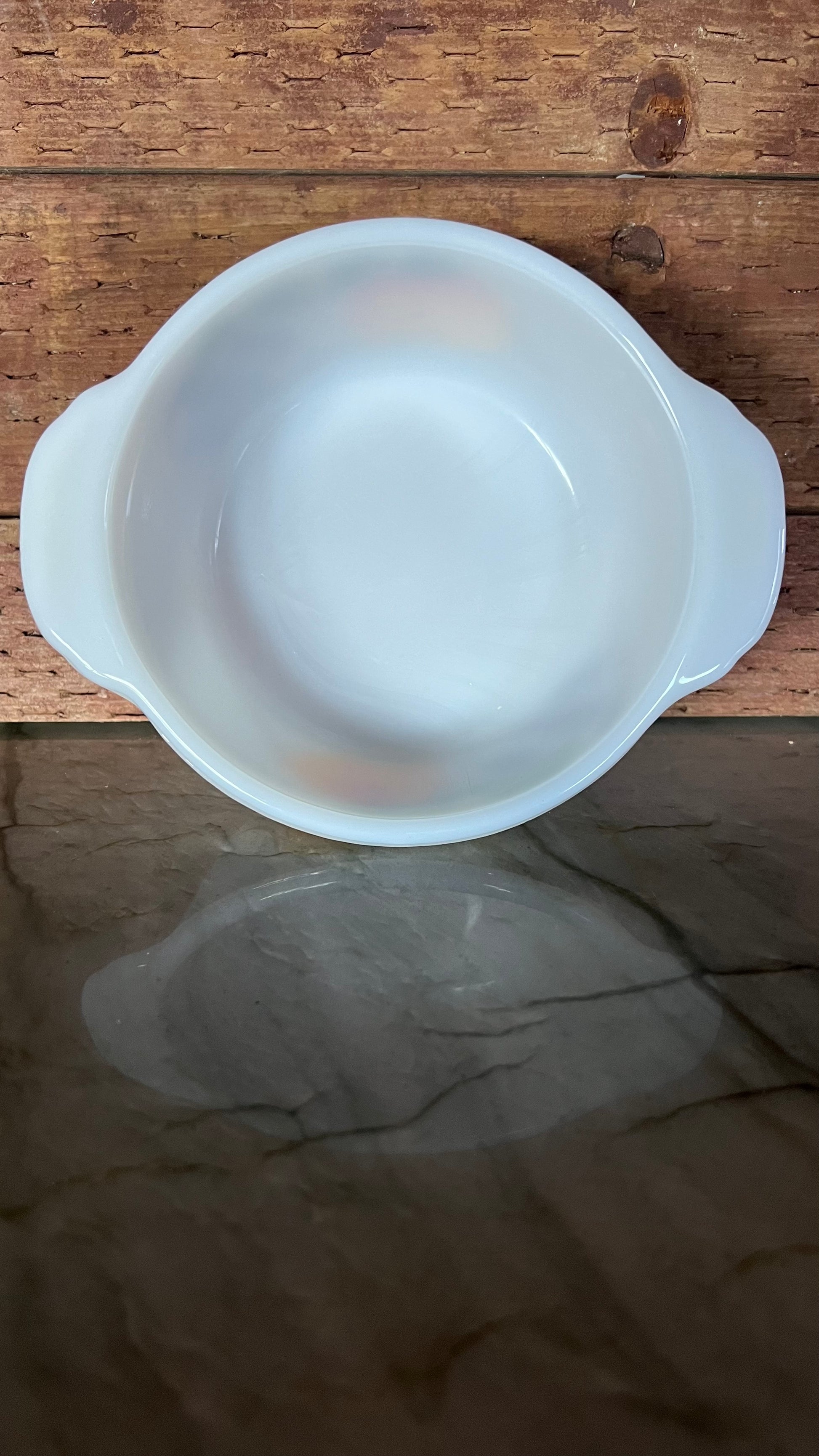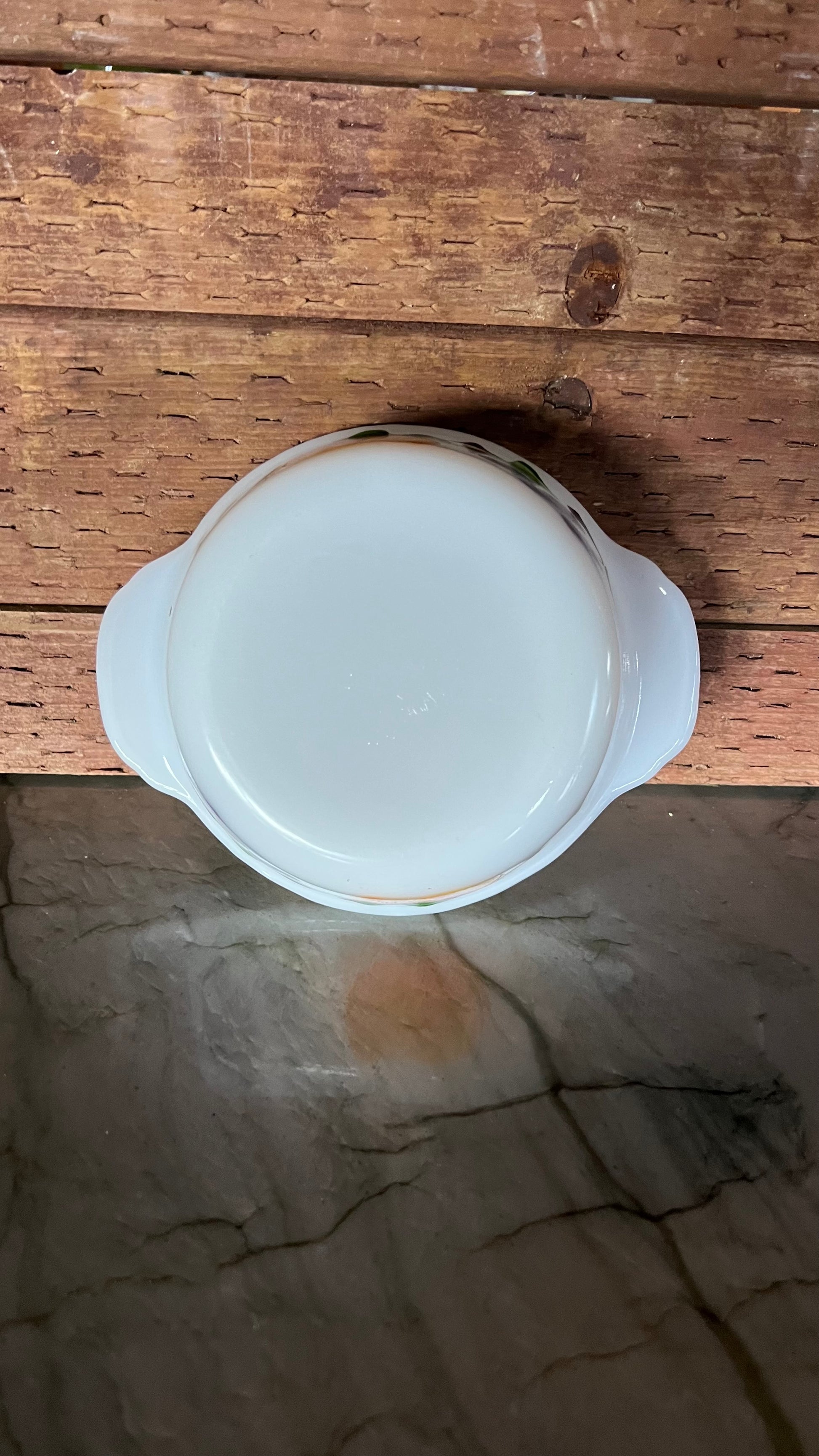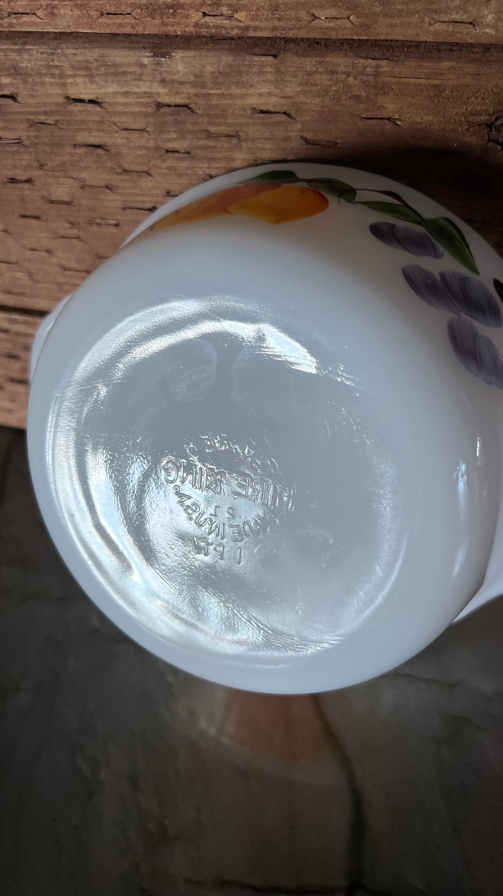 Vintage Fire King fruit print casserole one pint dish. This is the Gay Fad pattern. In great vintage condition, there’s one spot where there appears to be extra paint from manufacturing, and chip below it where it looks like someone tried to get the extra paint off.