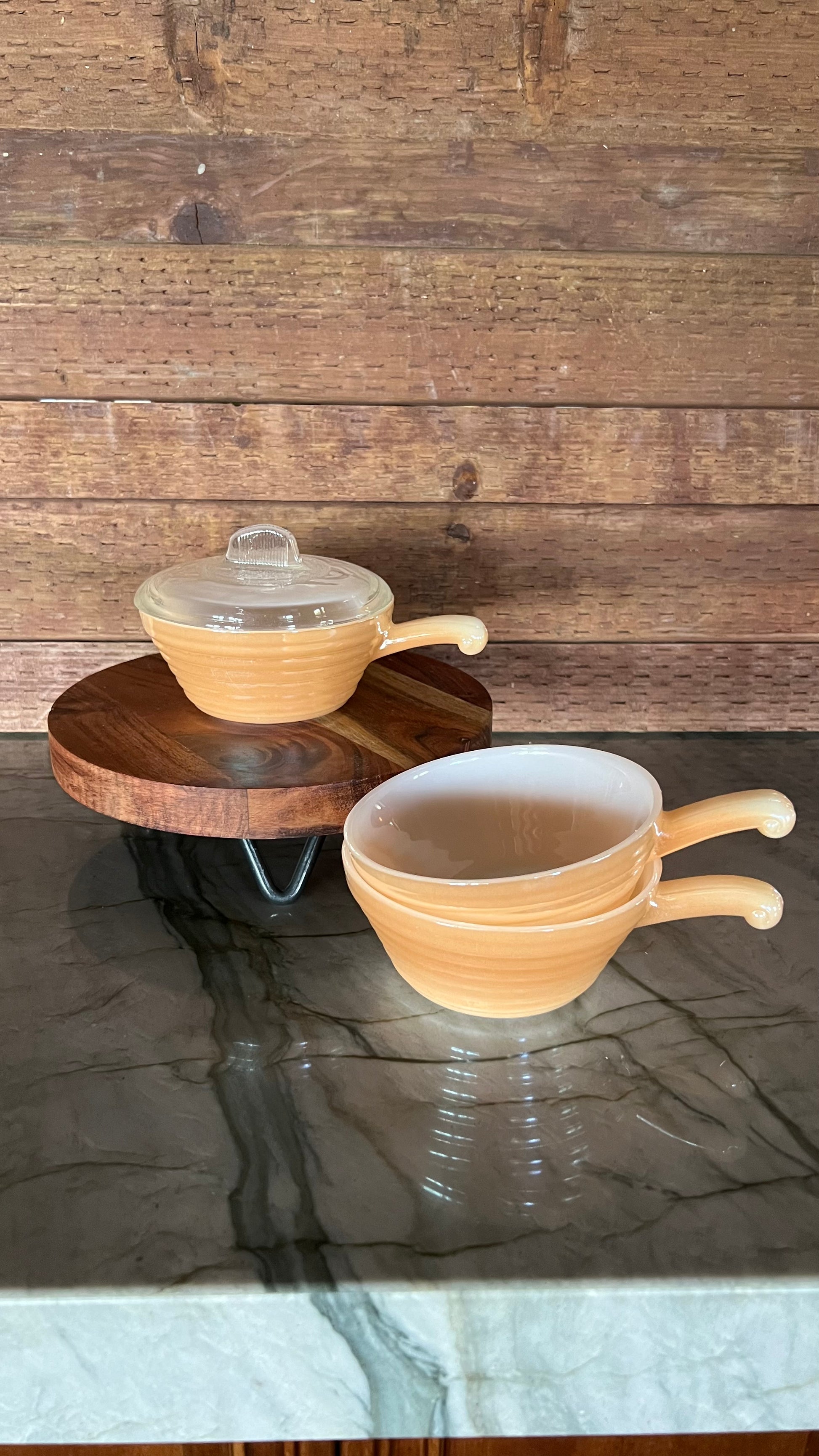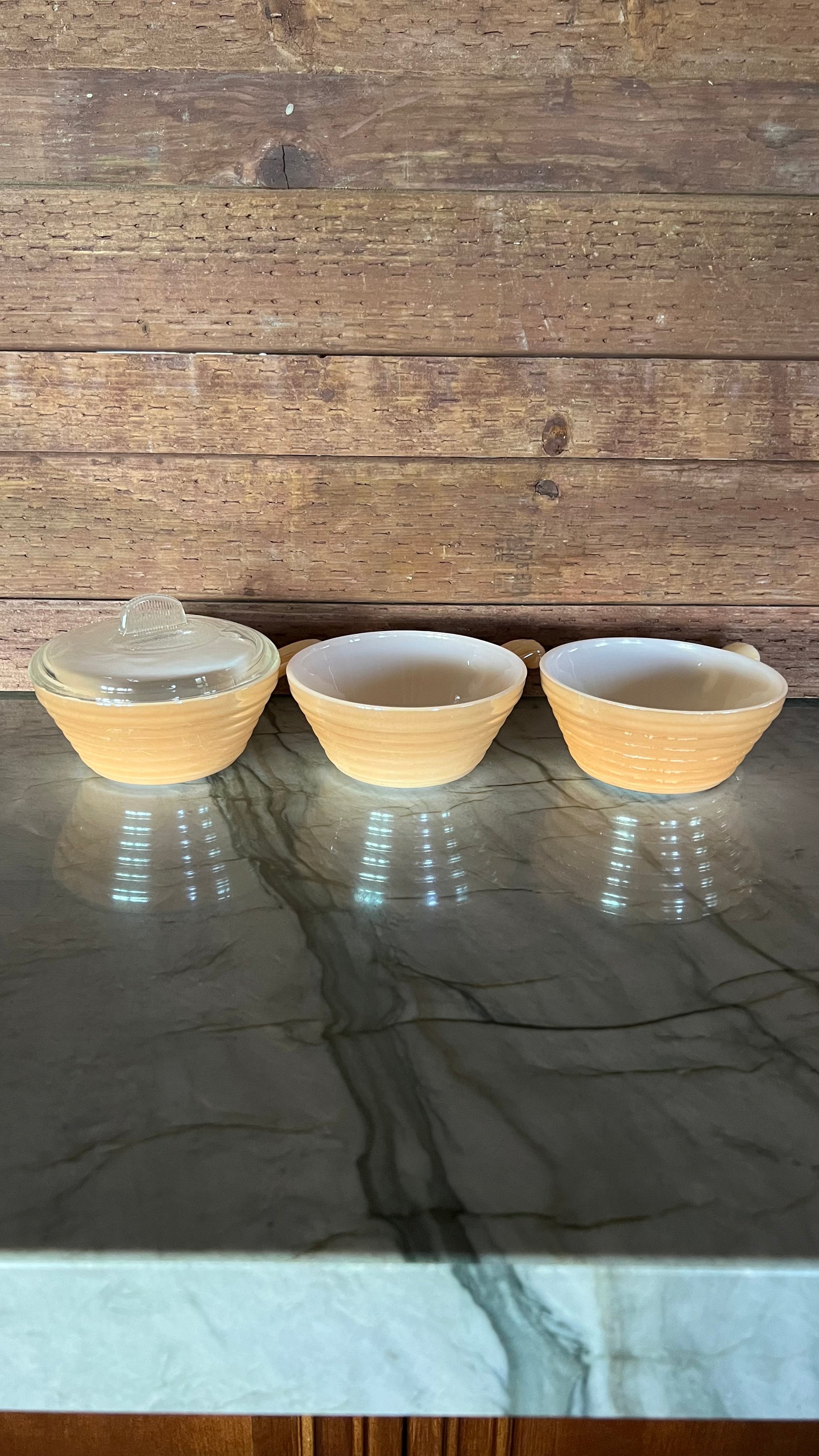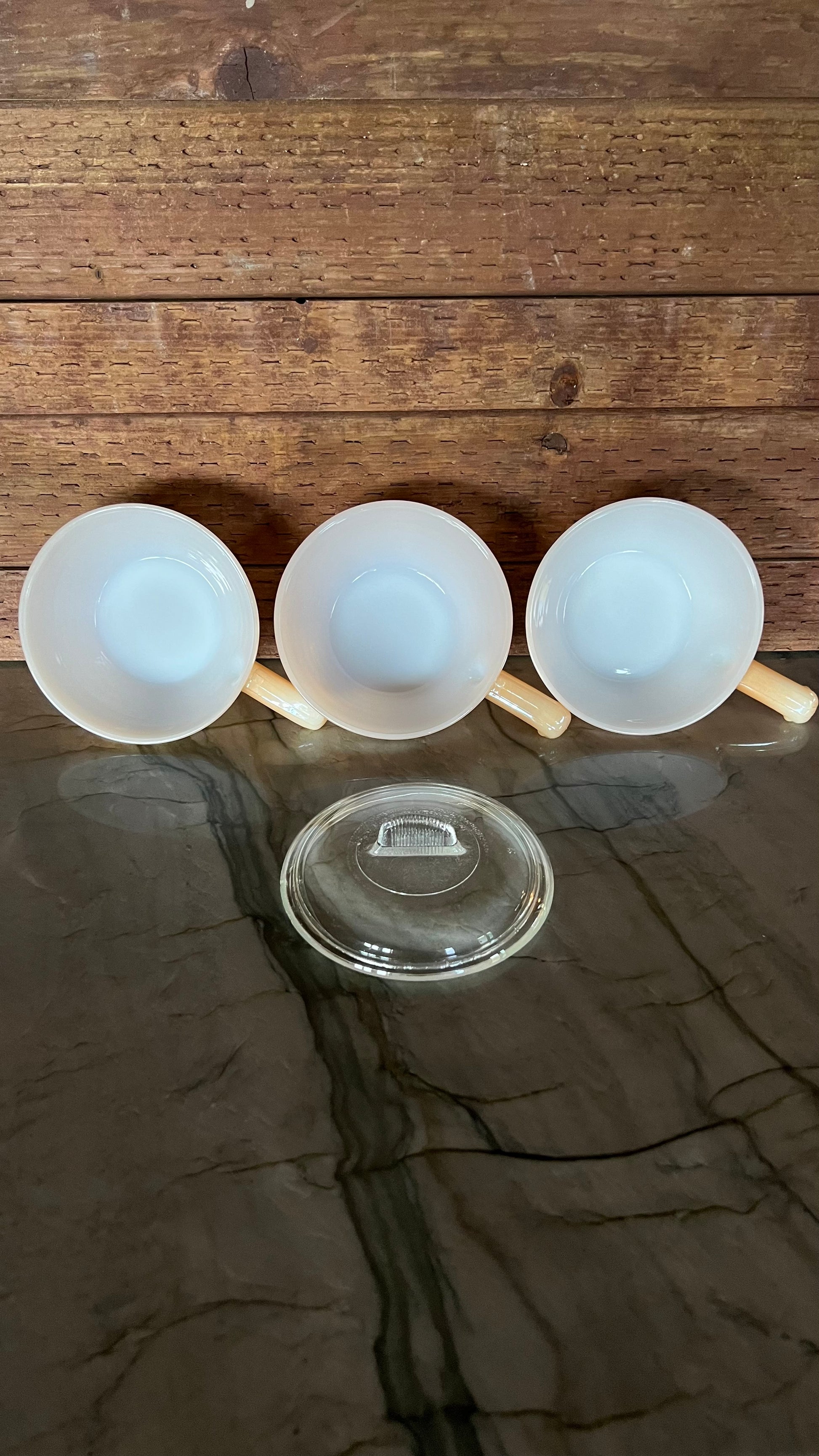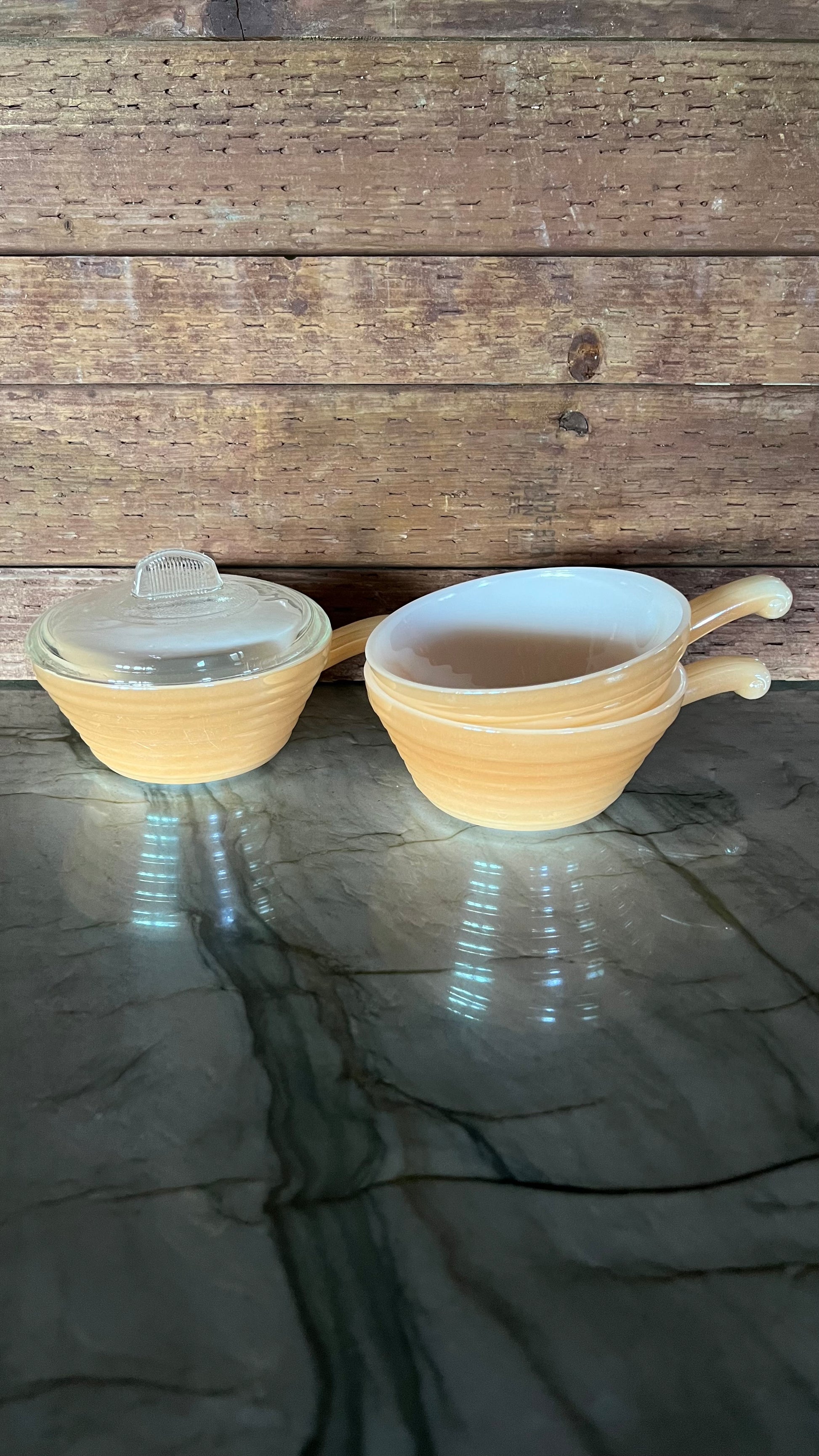 Set of three vintage Anchor Hocking Fire King soup bowls. Measure approximately 7” including the handle, by 3.25” at the base. Marked Oven Ware Fire King Made in USA on the bottom of each. One bowl has a lid, while the other two do not. Very good vintage condition, with mild surface wear. The lid has a couple of small chips on the inside.