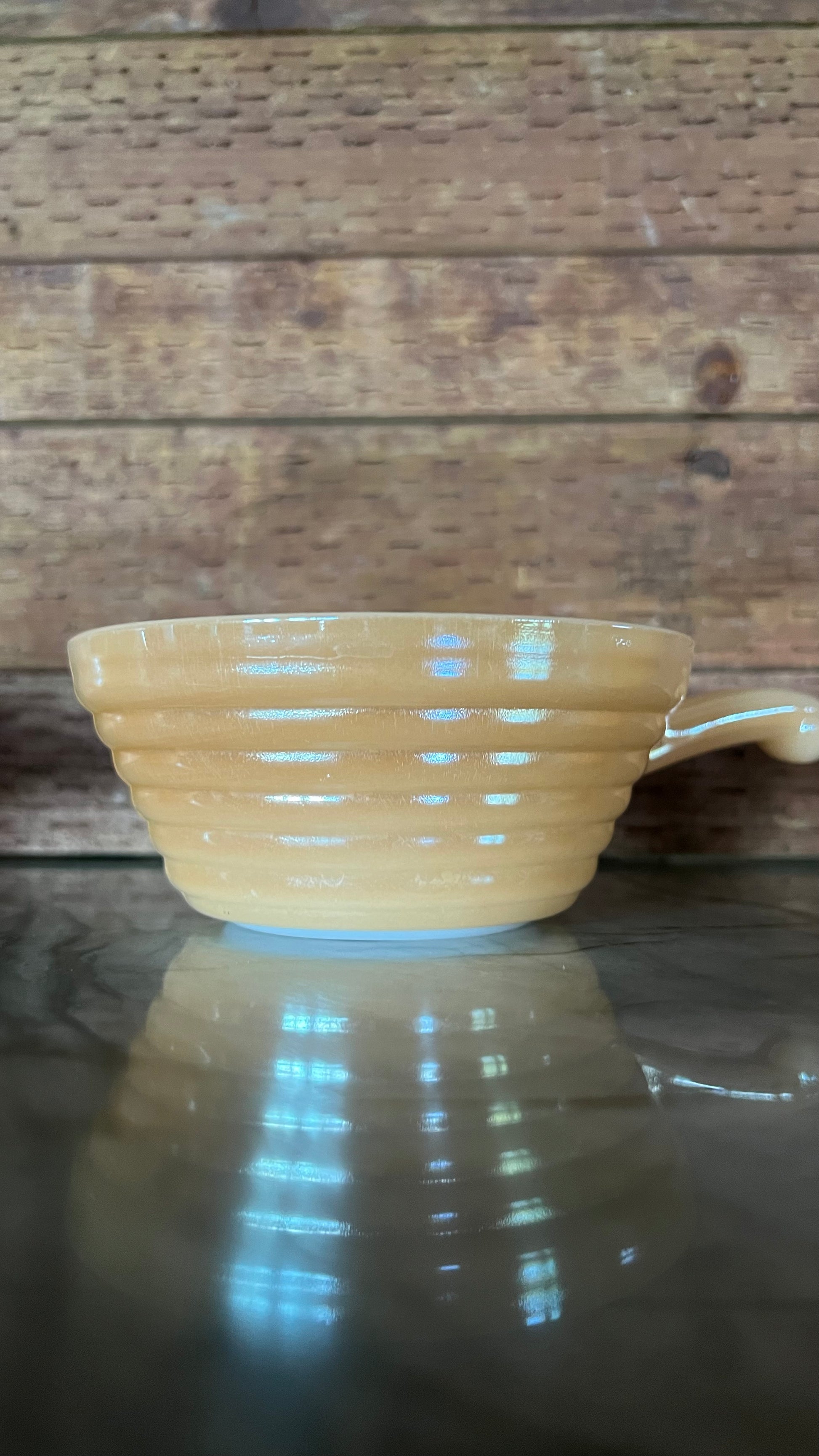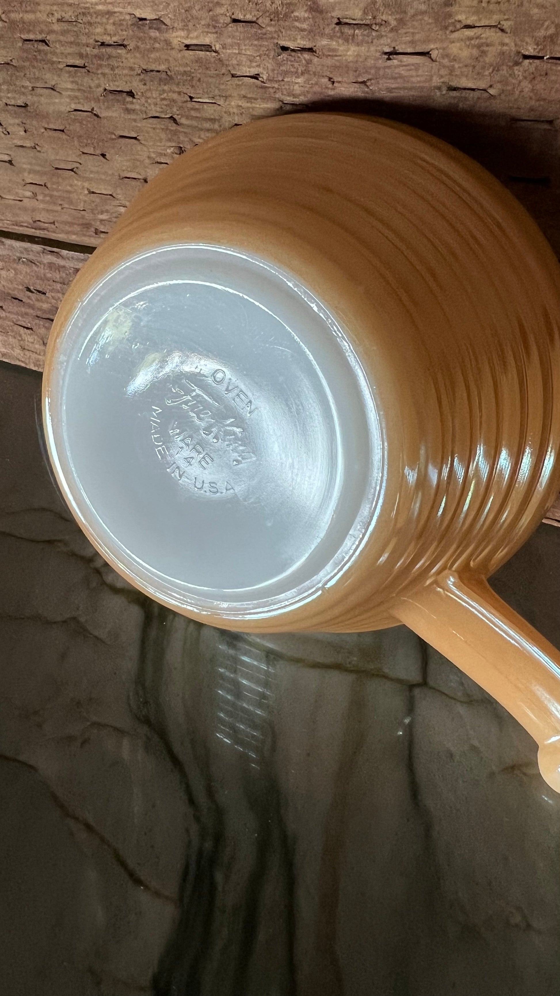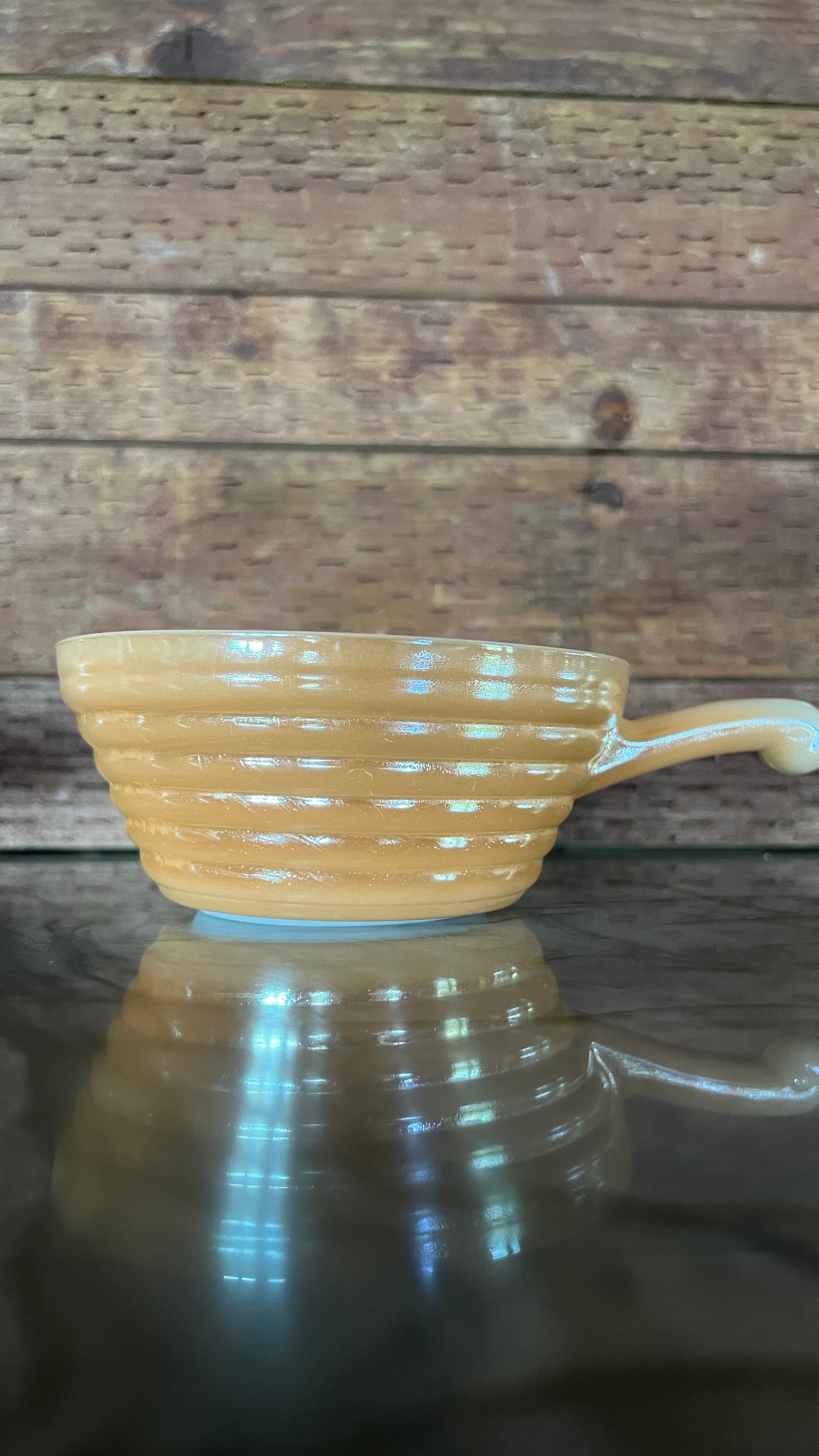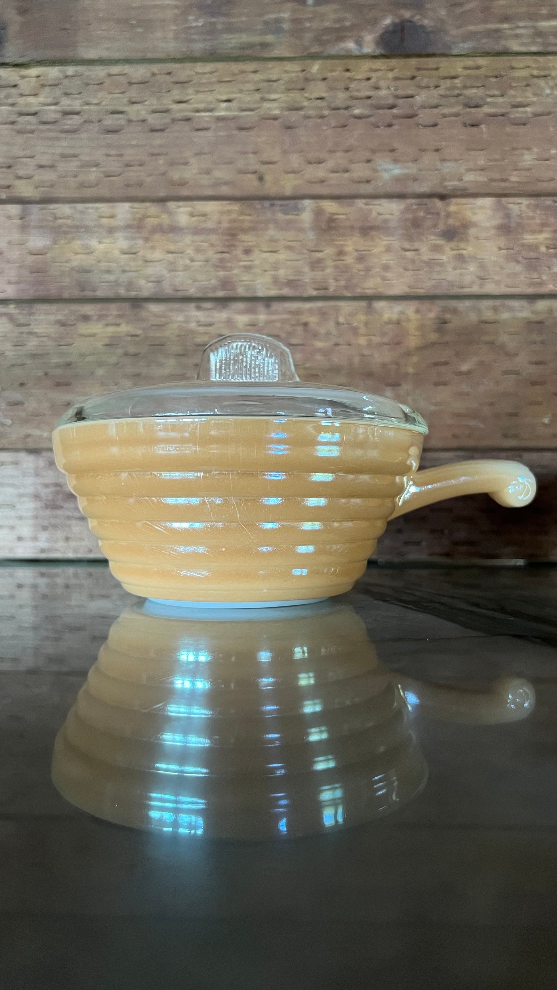 Set of three vintage Anchor Hocking Fire King soup bowls. Measure approximately 7” including the handle, by 3.25” at the base. Marked Oven Ware Fire King Made in USA on the bottom of each. One bowl has a lid, while the other two do not. Very good vintage condition, with mild surface wear. The lid has a couple of small chips on the inside.