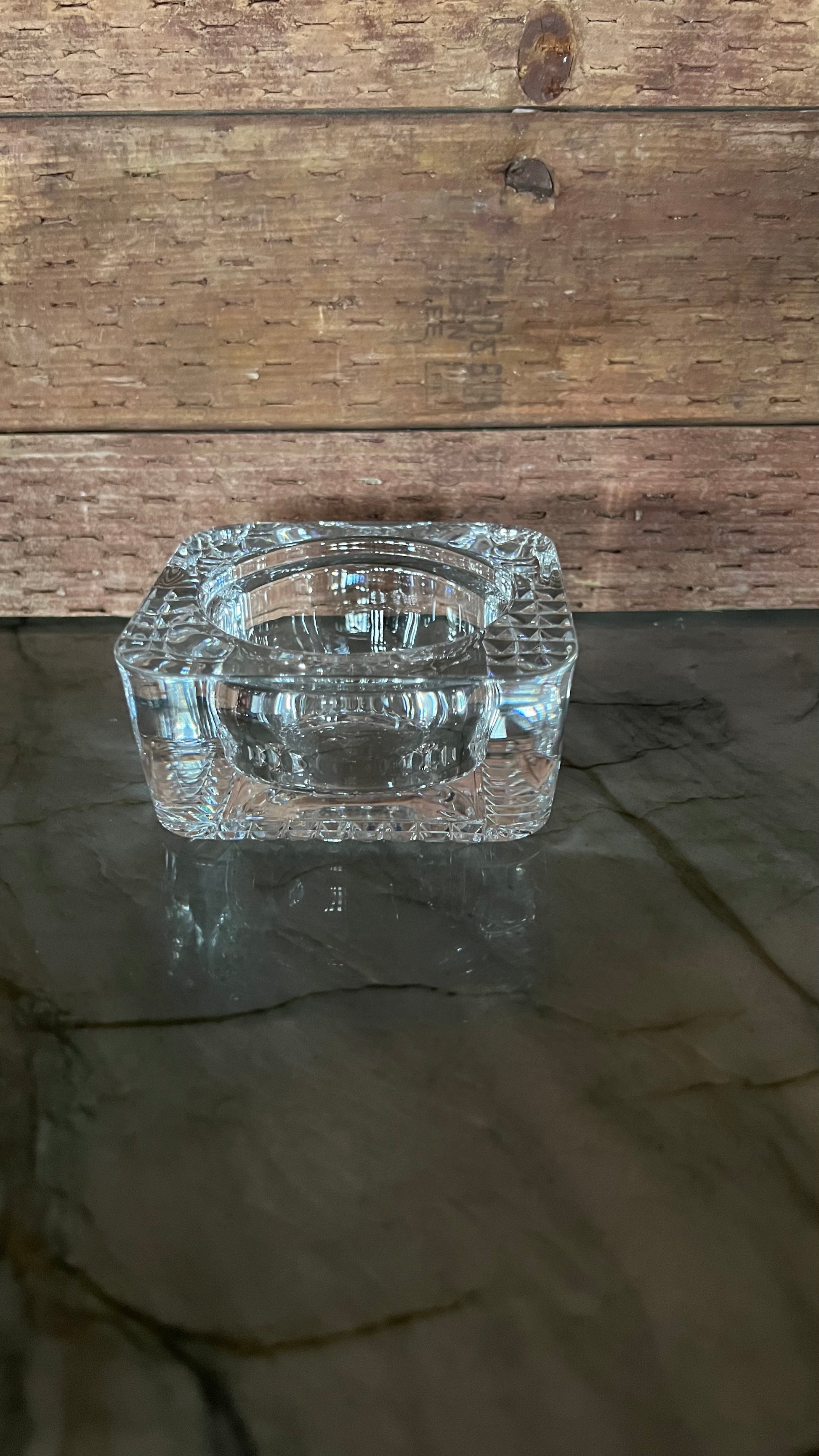 Vintage HEAVY (seriously) clear glass candle holder. Made by Cristal D’arques in France. Can be used as a trinket dish or ashtray. Measures 4” by 4”.