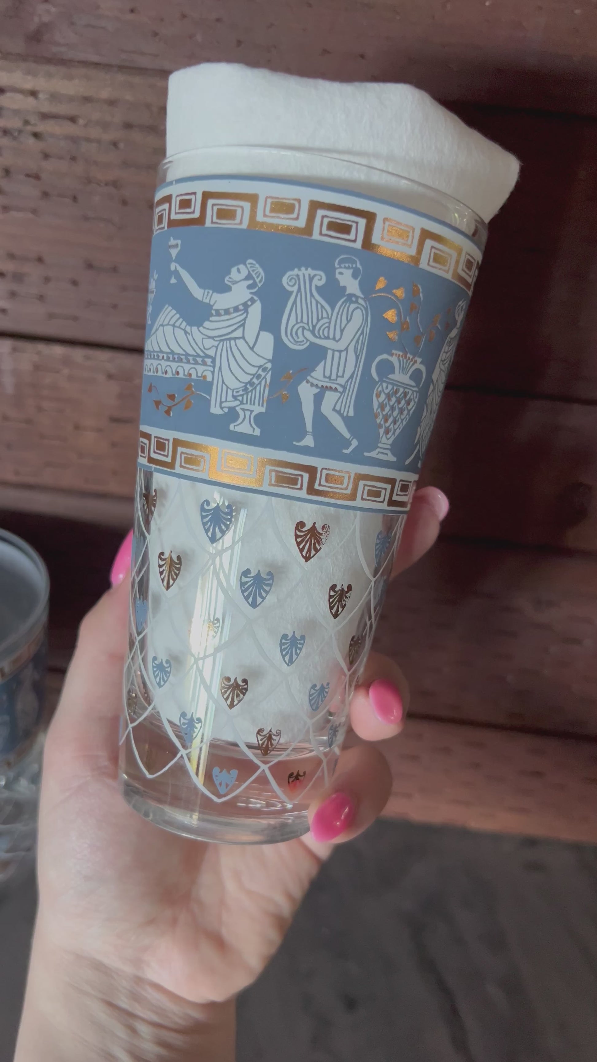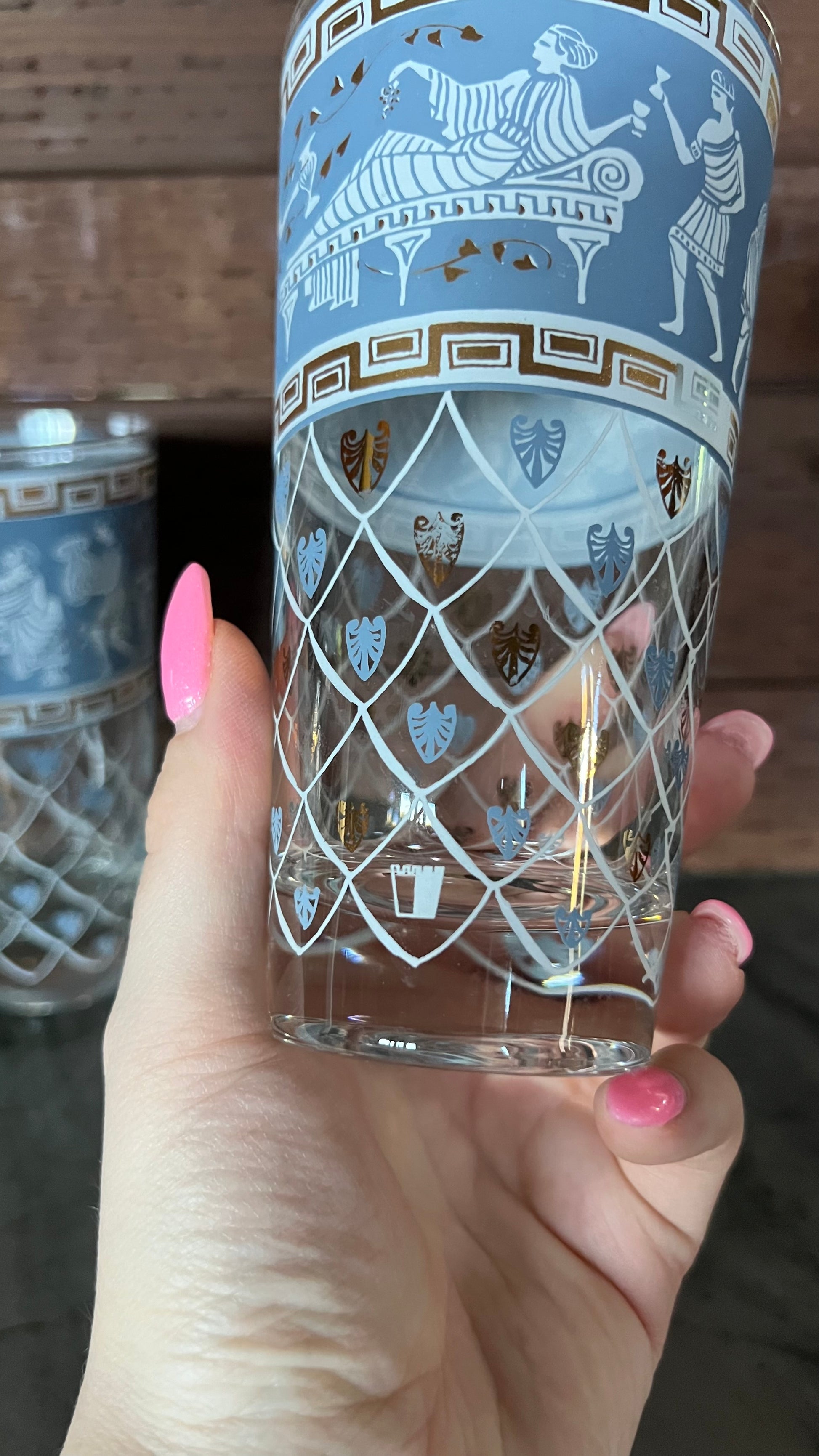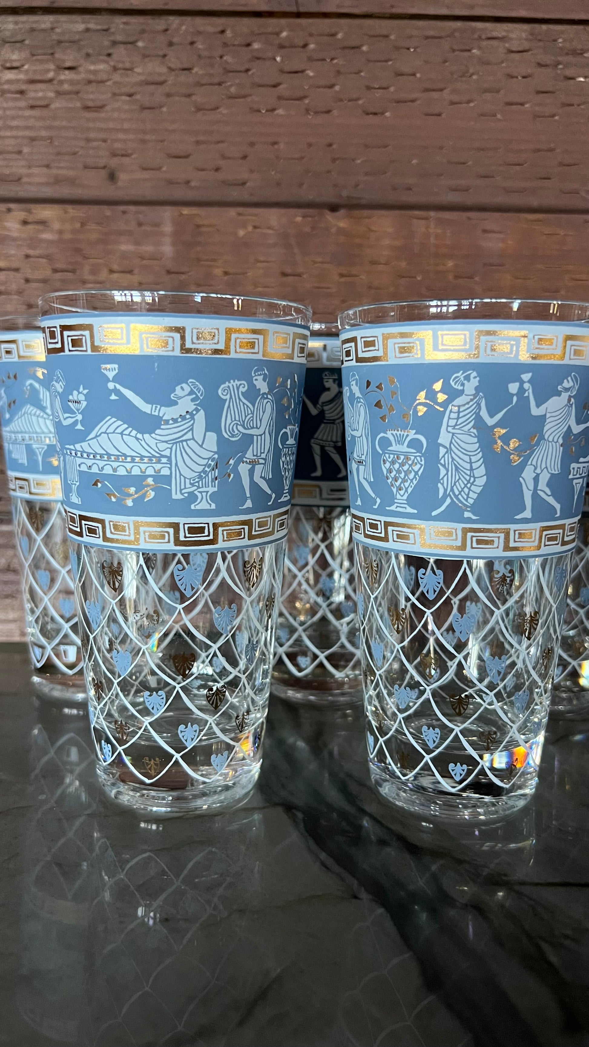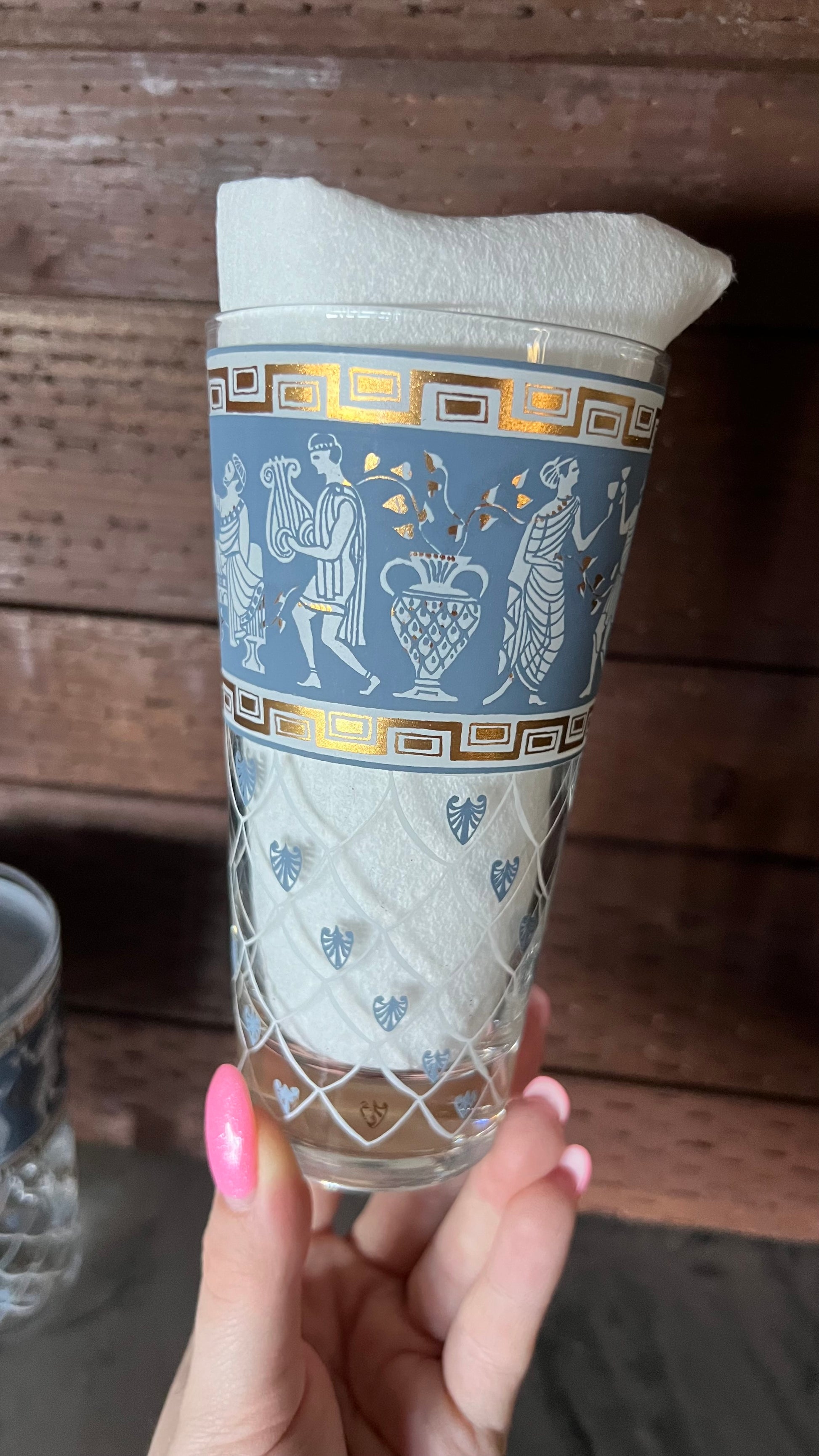 CERA Greek glass set of 8. Beautifully designed! Measures 5.75” tall with a 3” diameter at the top. Overall, glasses are in great vintage condition. Some show more signs of wear than others, an example of the best and the most worn are photographed. Incredible set!