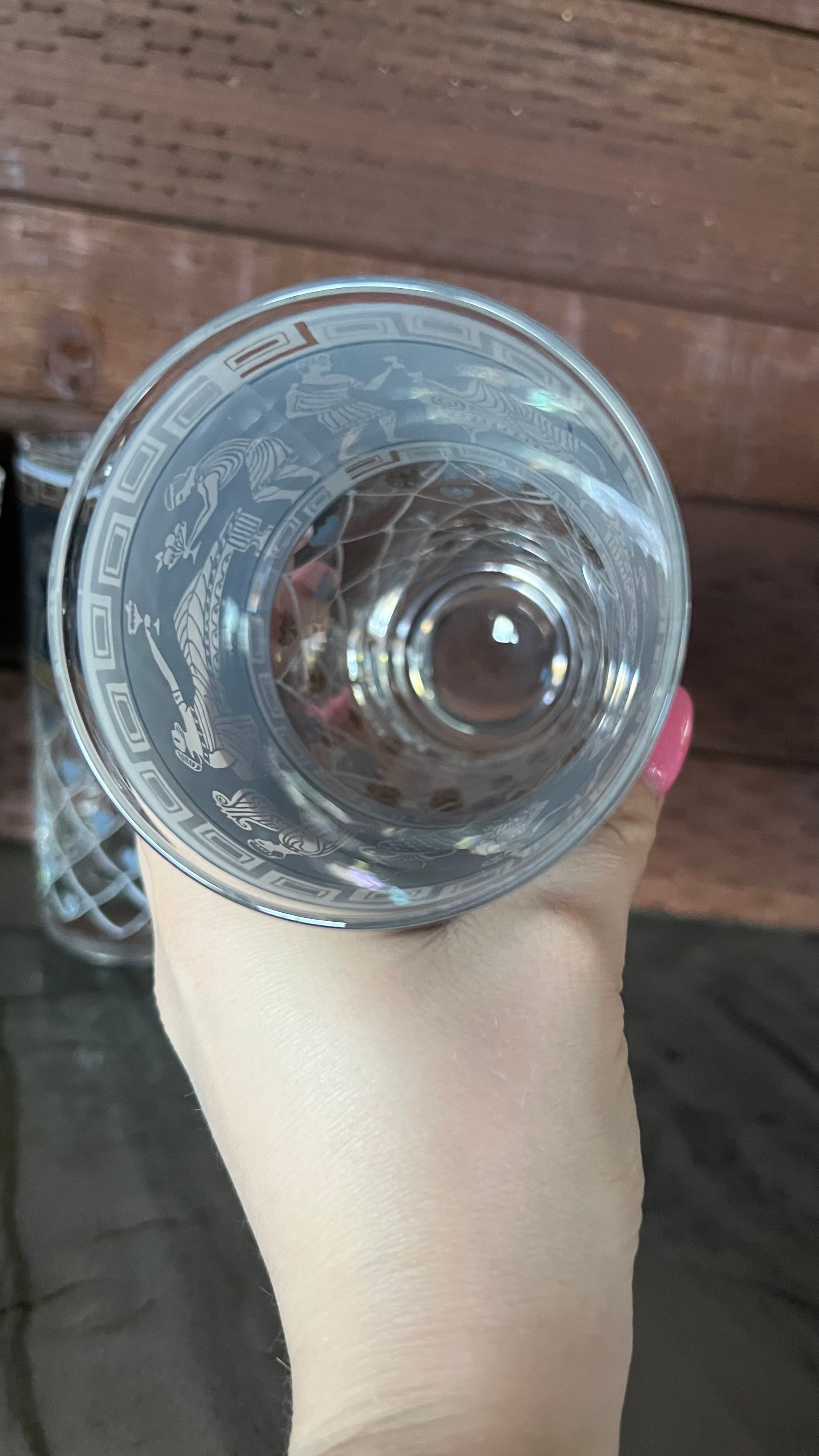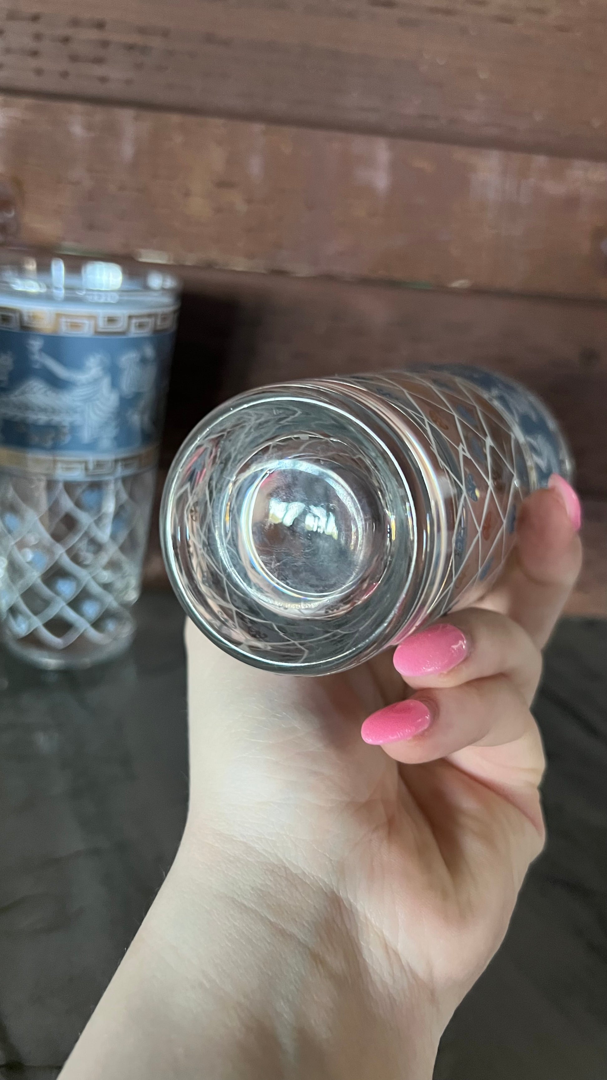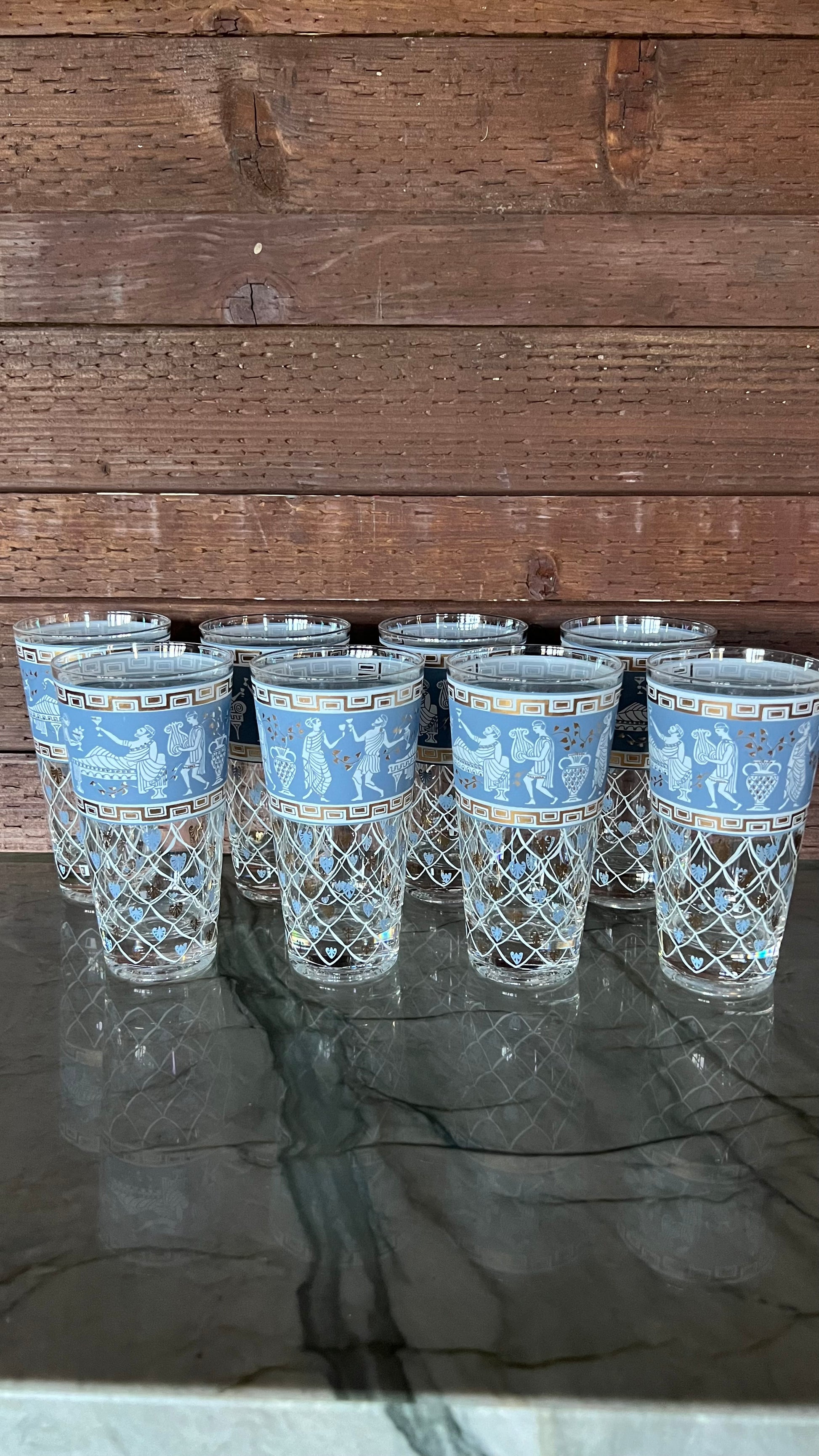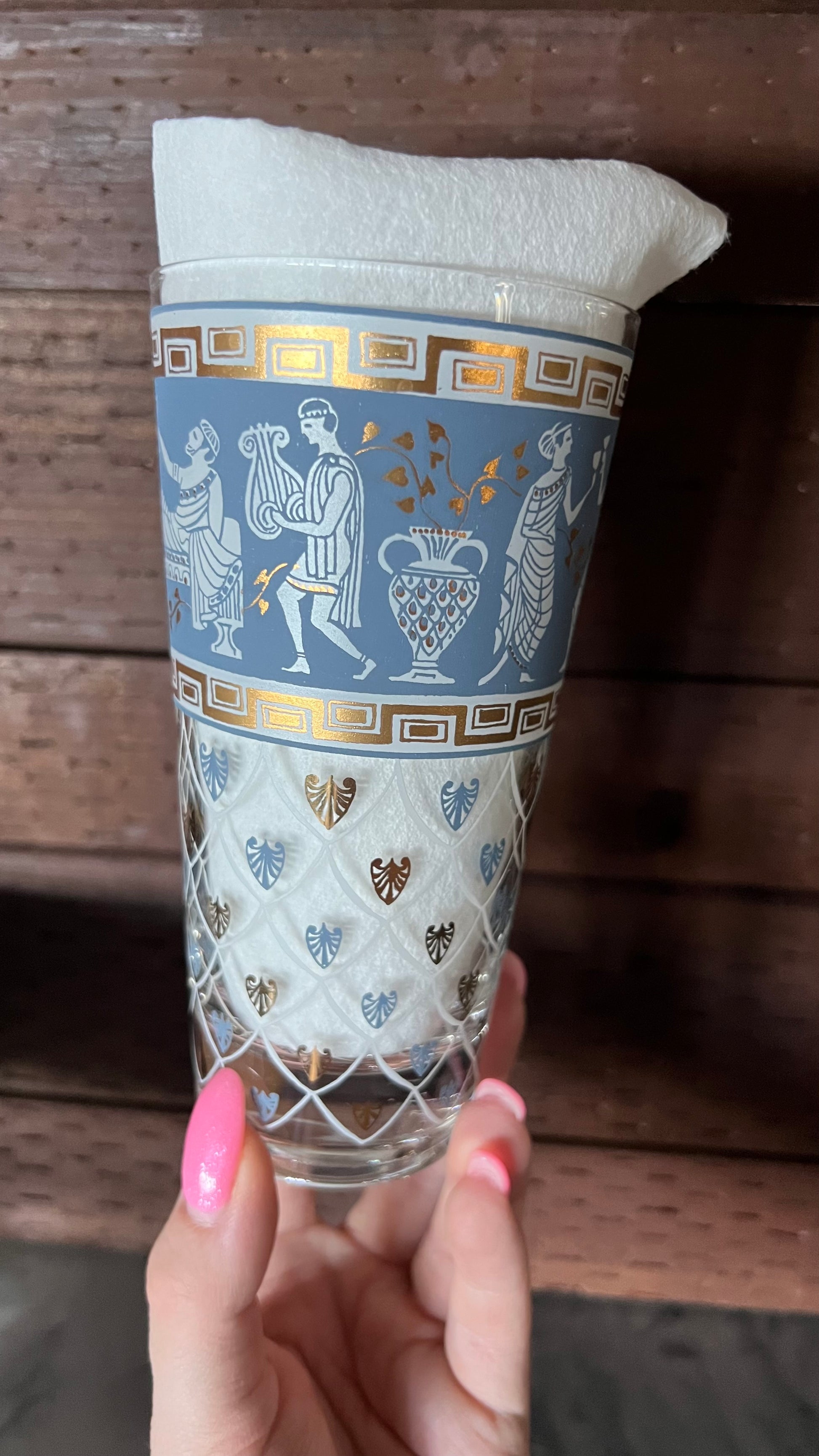 CERA Greek glass set of 8. Beautifully designed! Measures 5.75” tall with a 3” diameter at the top. Overall, glasses are in great vintage condition. Some show more signs of wear than others, an example of the best and the most worn are photographed. Incredible set!