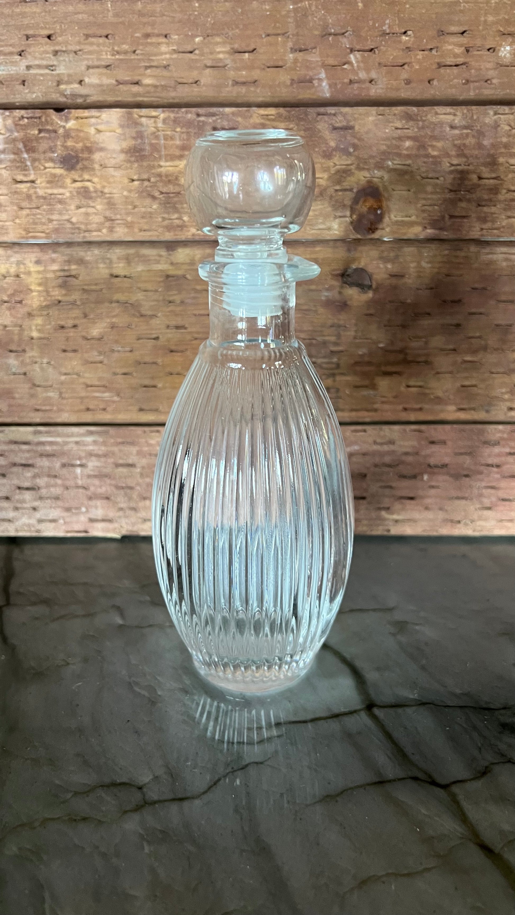 Vintage Hazel Atlas ribbed glass bottle with stopper. Bottle has a pour spout, can be used for oil, salad dressing, etc. Stamped 0251 on the bottom. Measures approximately 7.5” tall with a 1 7/8” diameter at the base. Excellent vintage condition and the stopper still fits very tightly.