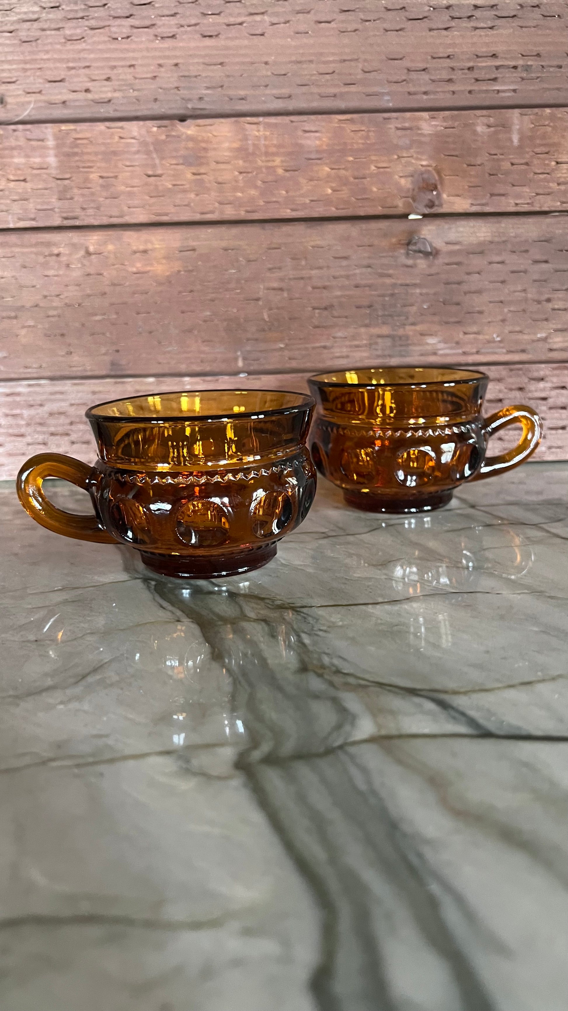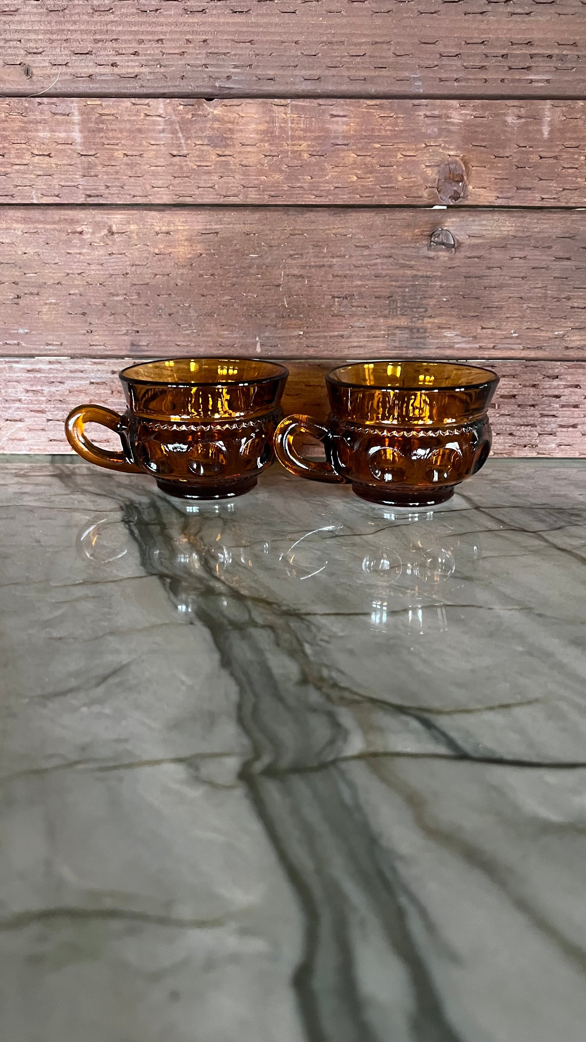 Set of two vintage Indiana Glass Amber colored mugs/tea cups. Both are in excellent vintage condition, no chips or cracks. They measure about 3.5” in diameter at the top. Beautiful set!