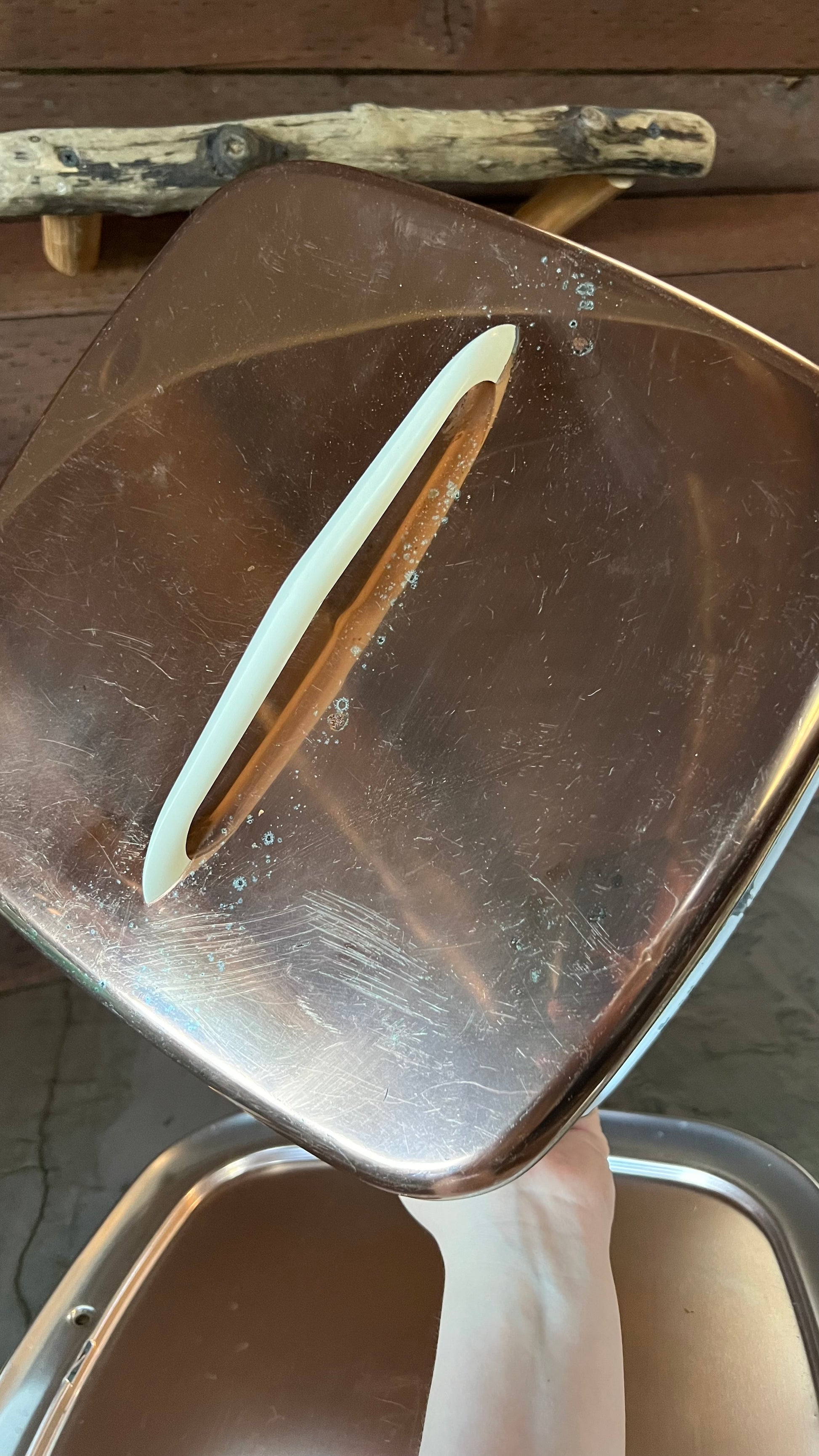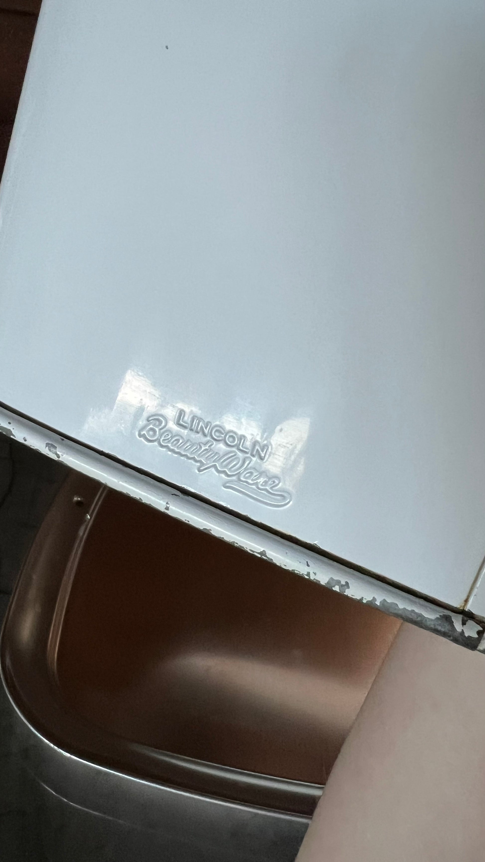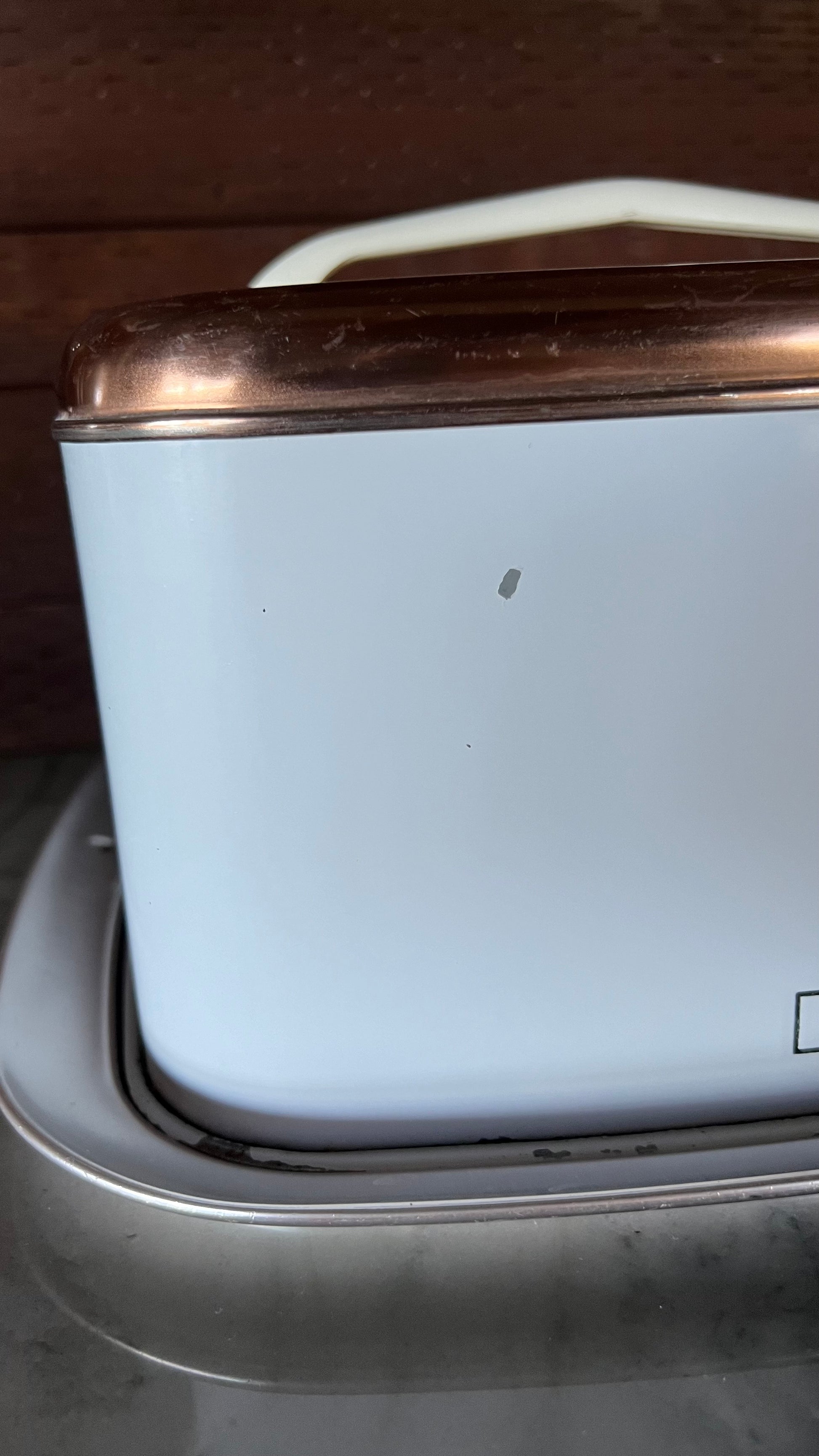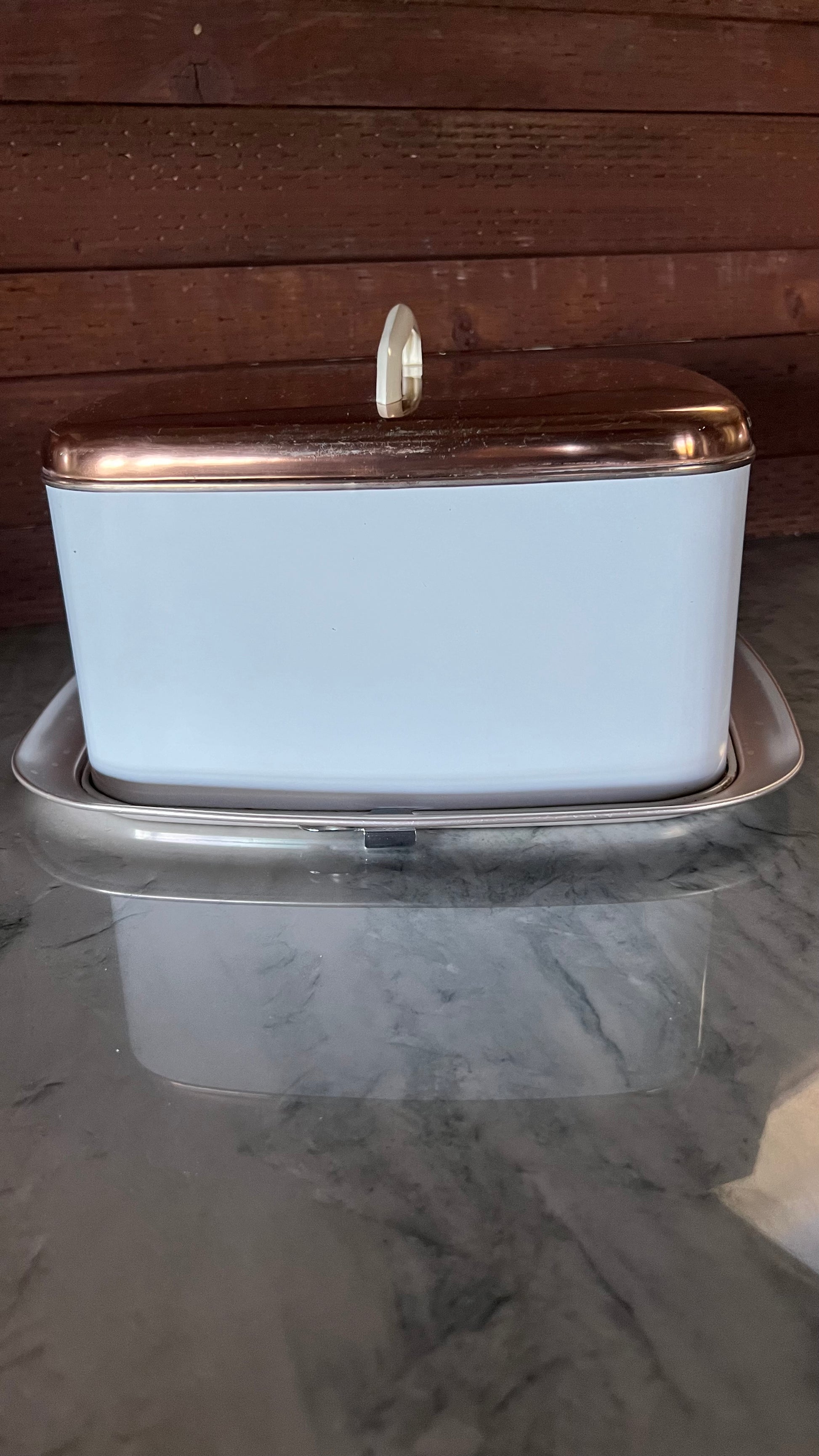 Vintage Lincoln Beautyware cake holder in copper and white. Measures 11” across and 6” tall. In good vintage condition, showing signs of wear: some paint missing, light scratches, marks on the copper top, all photographed. Still a beautiful, functional kitchen staple!