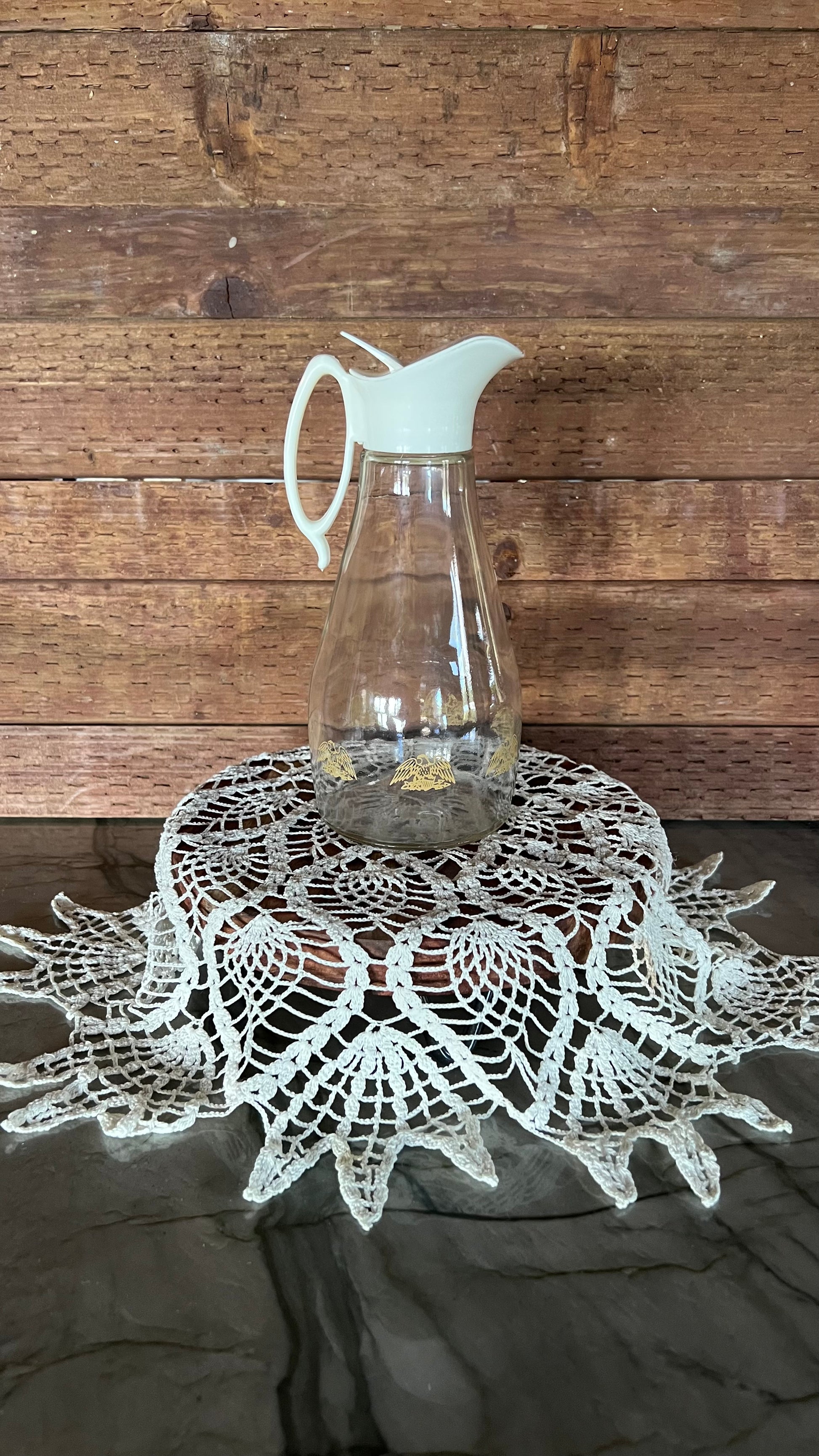 Vintage Log Cabin glass syrup dispenser. Clear glass base with an off white lid, and gold eagles printed on the bottom. Measures 8.5” with a 3.5” diameter at the base. Stamped with the Log Cabin logo on the lid. Excellent vintage condition.