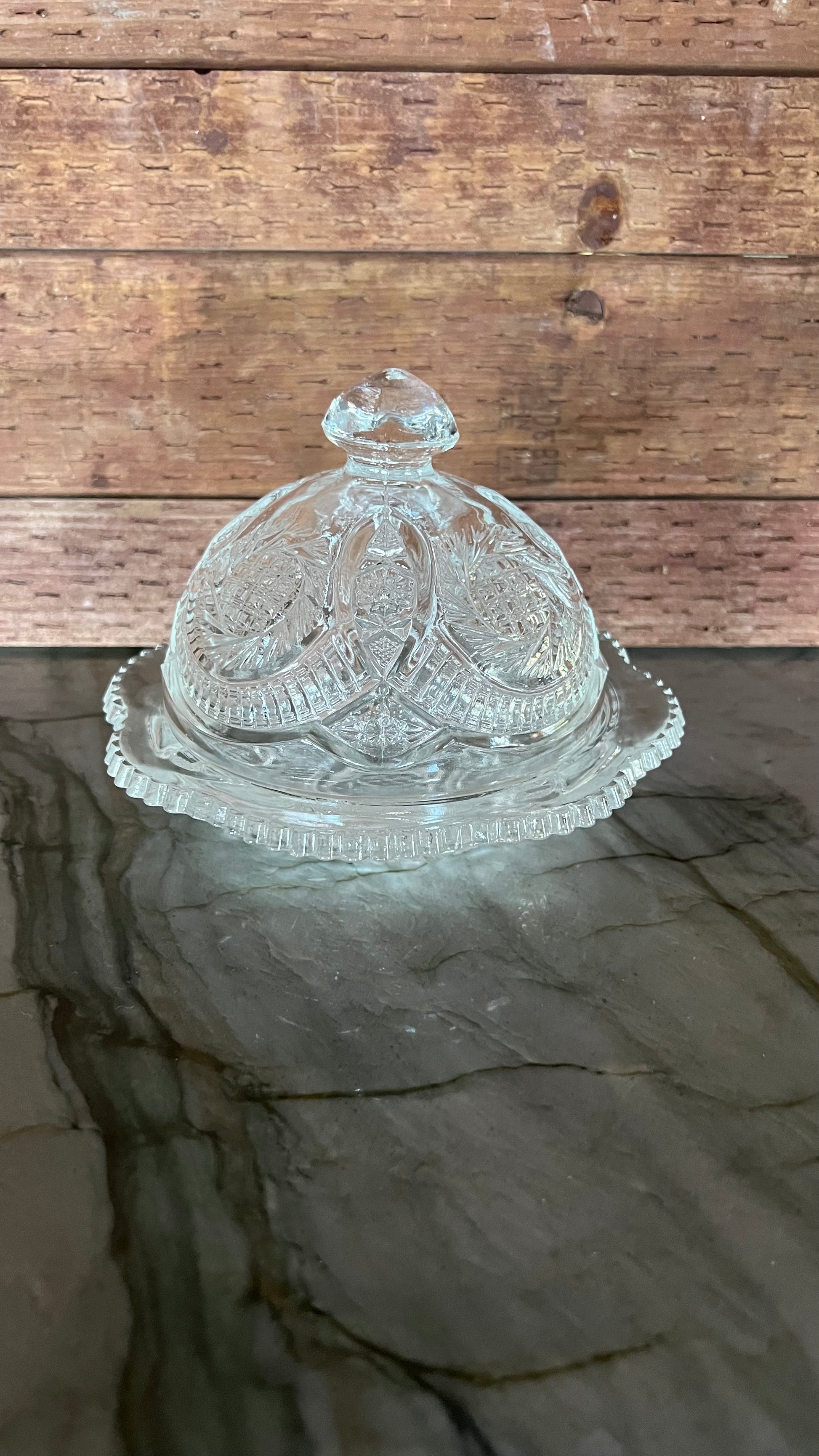 Beautiful clear glass domed McKee Aztec Sunburst butter dish, can also be used for for cheese (we don’t judge). In good vintage condition, with a couple of small chips on the inner rim. See pictures for more details. Measures 5” tall and 7” wide at the largest point.