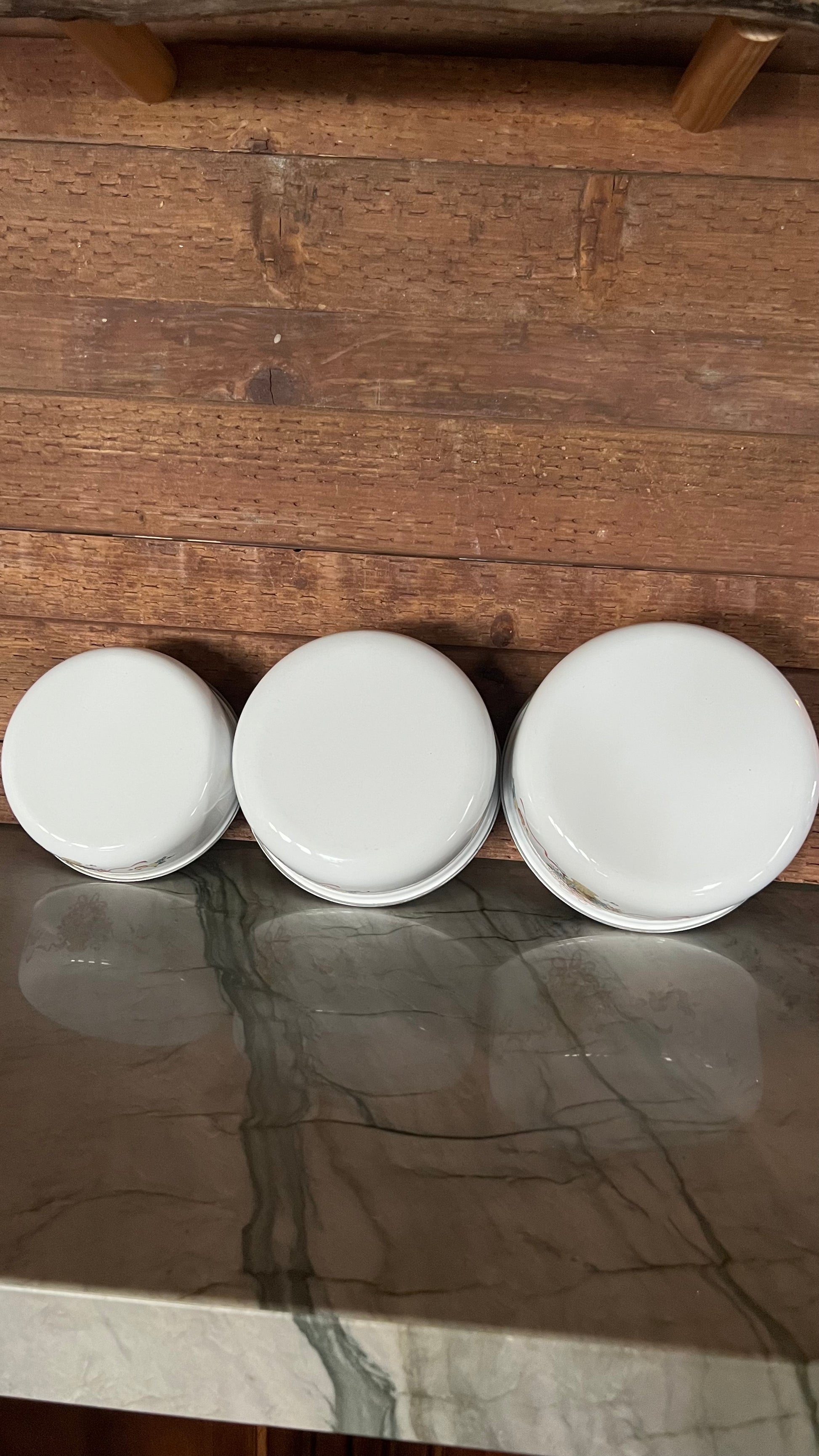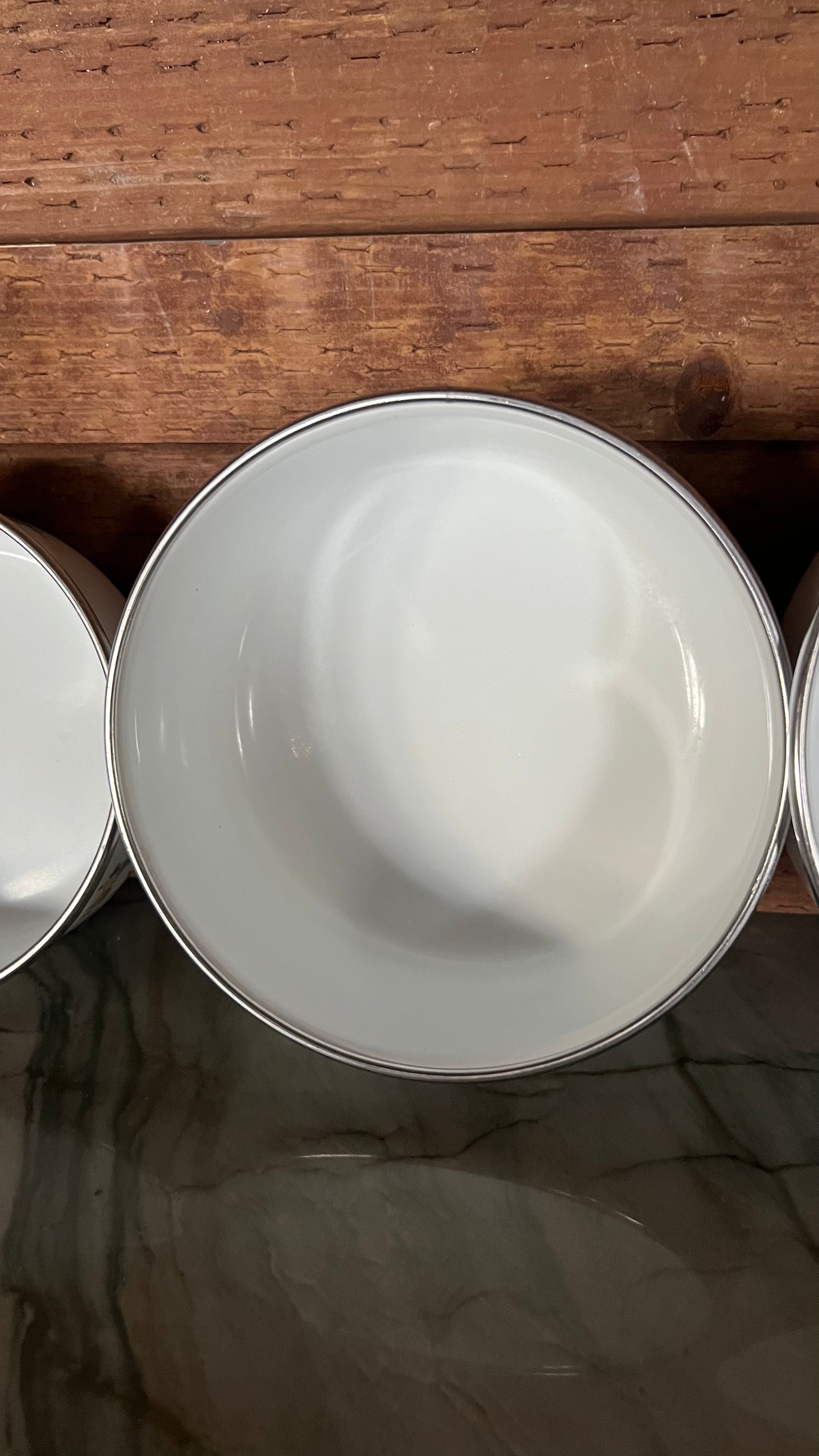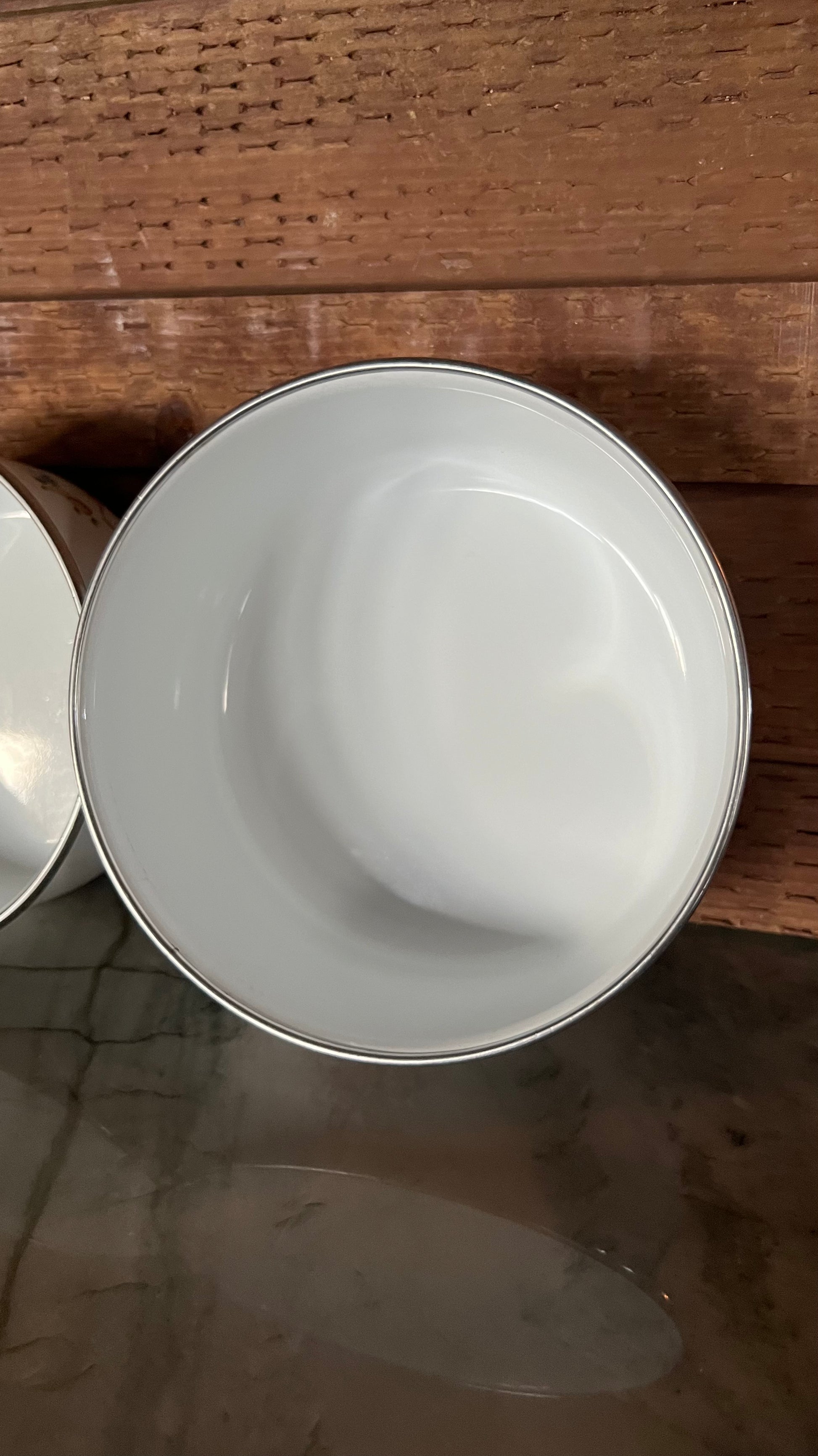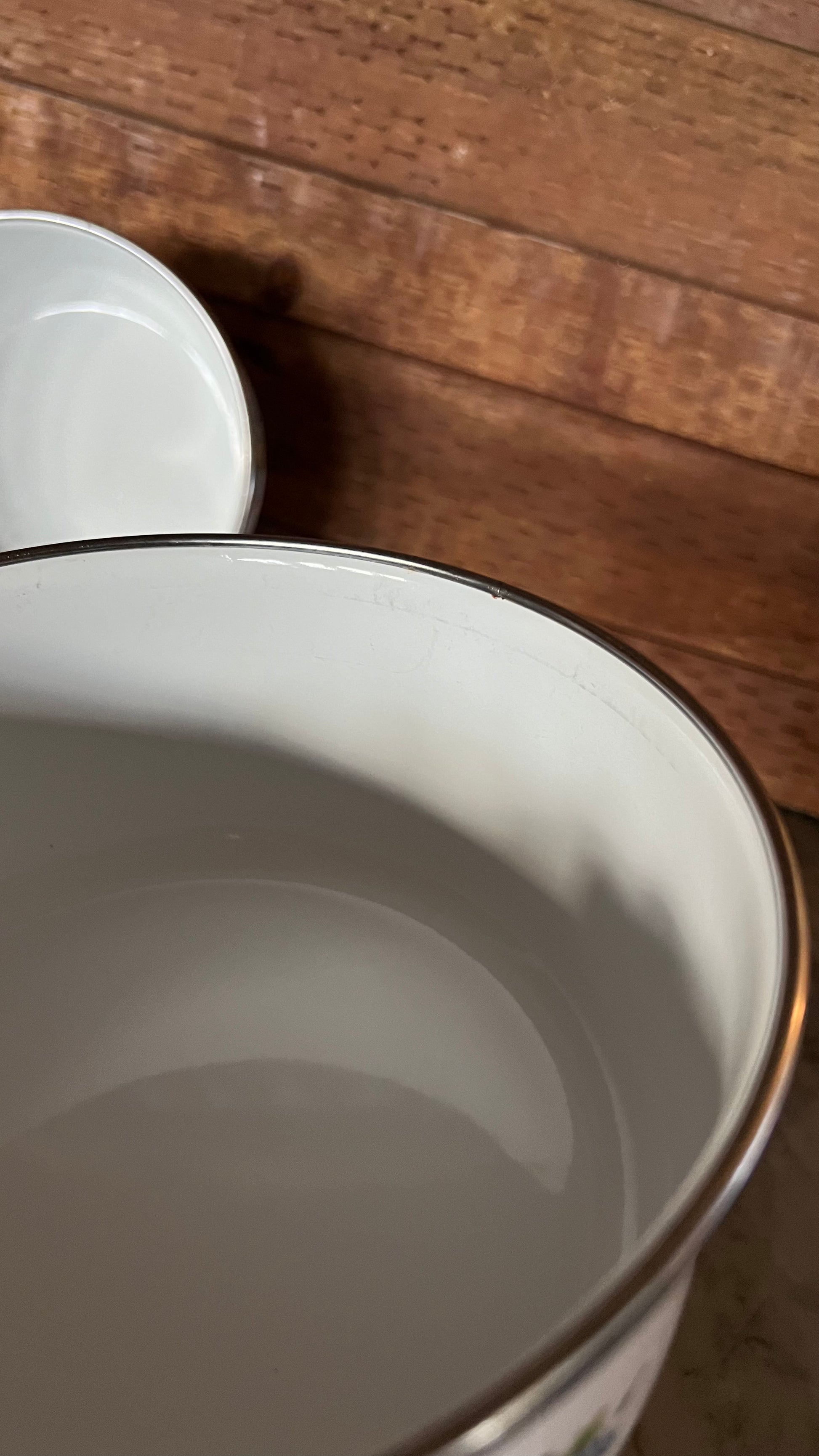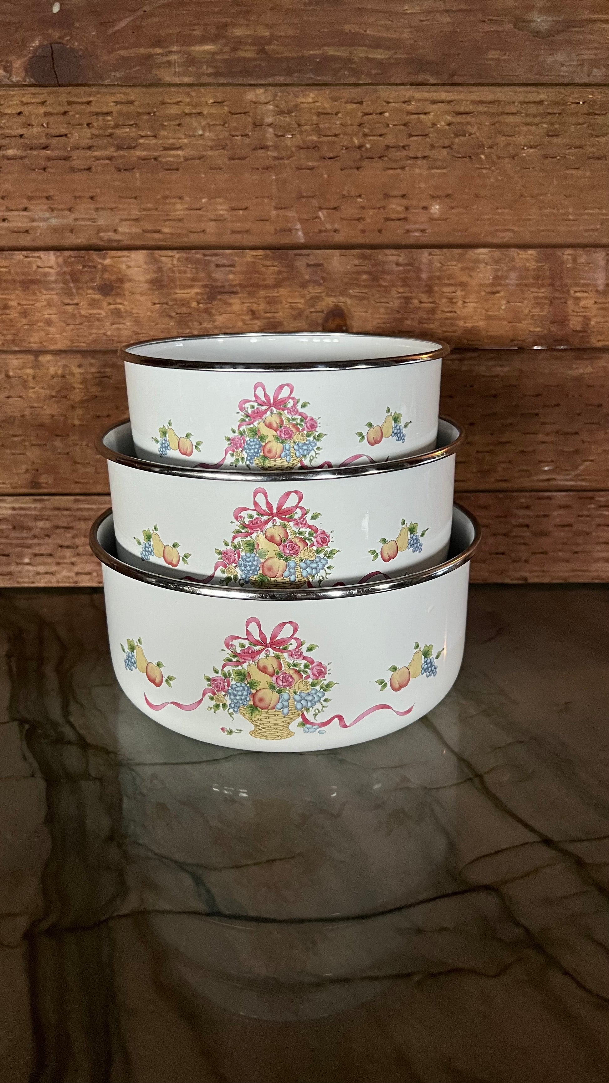 Vintage set of 3 tin/enamel nesting bowls. Adorable fruit basket pattern. In very good vintage condition, only showing minimal wear on the bottoms. See pictures for more details.