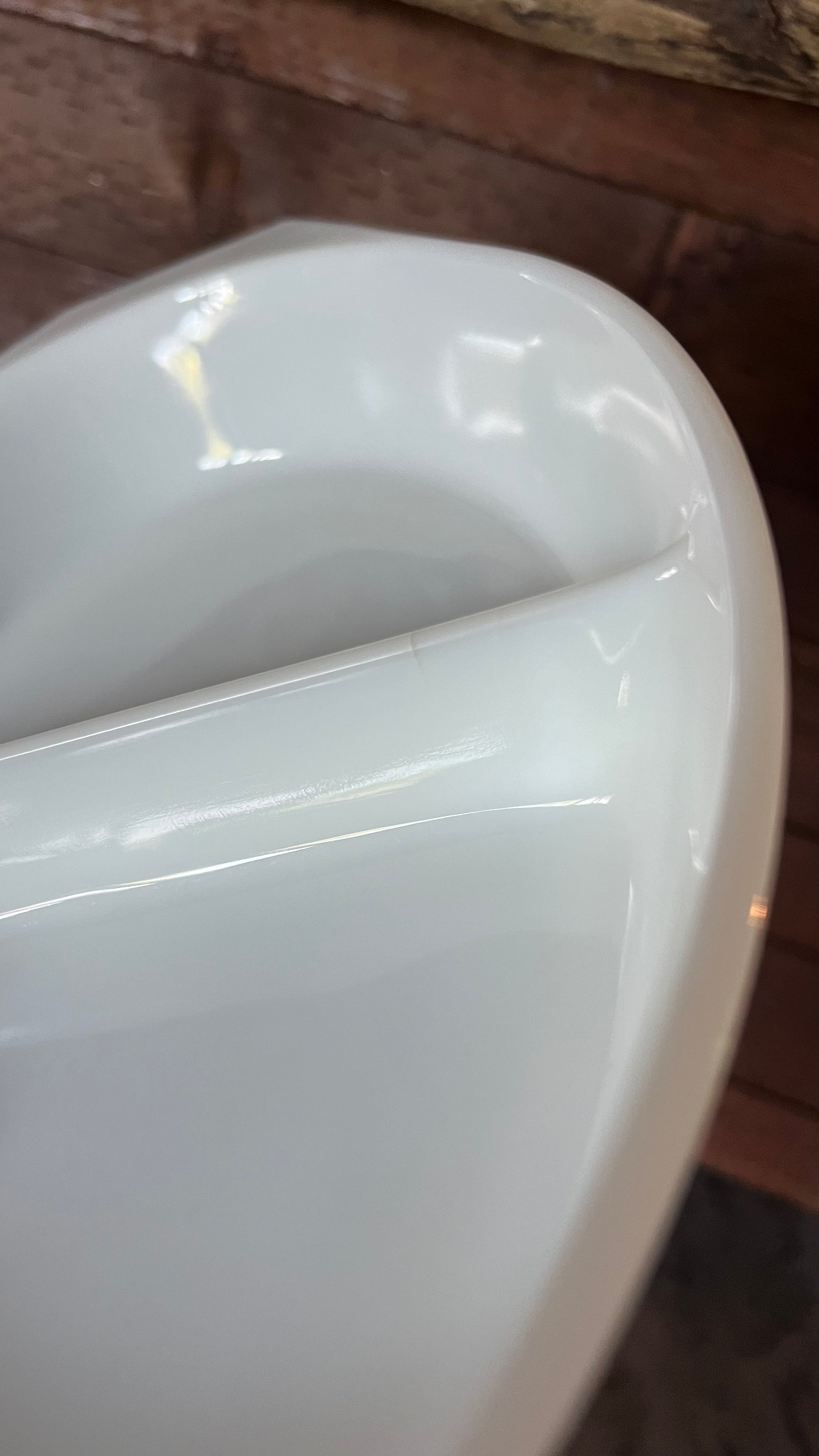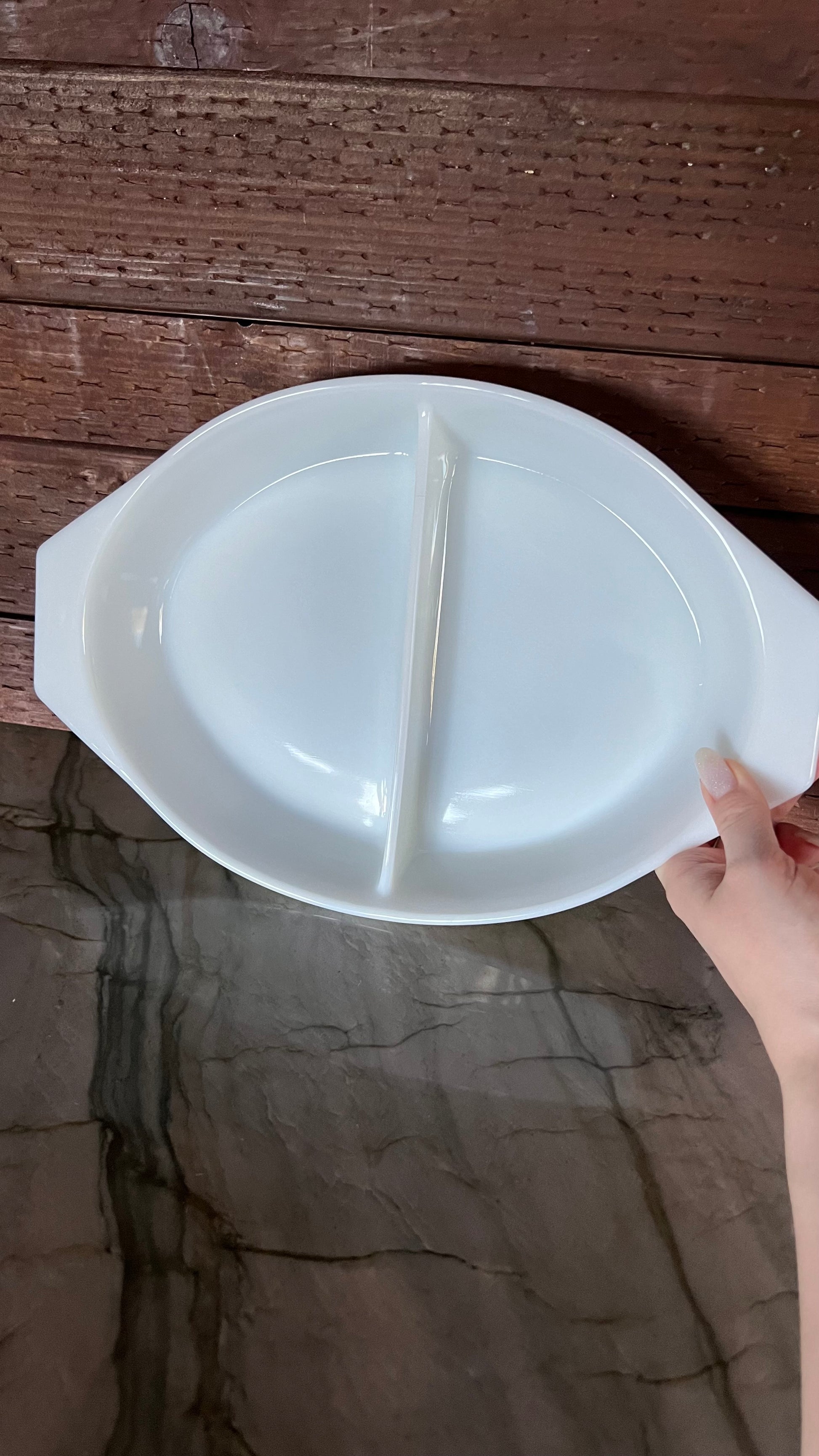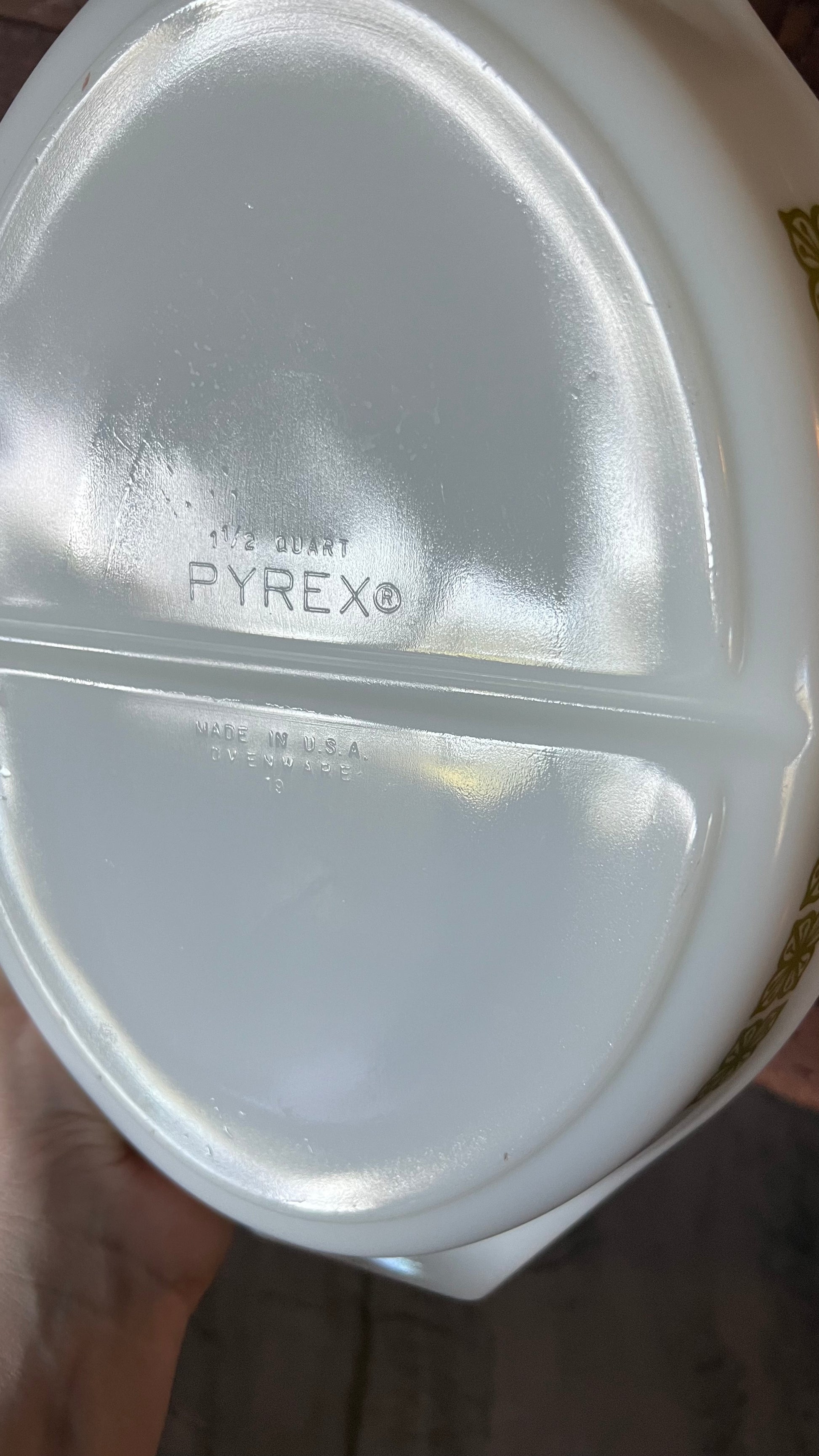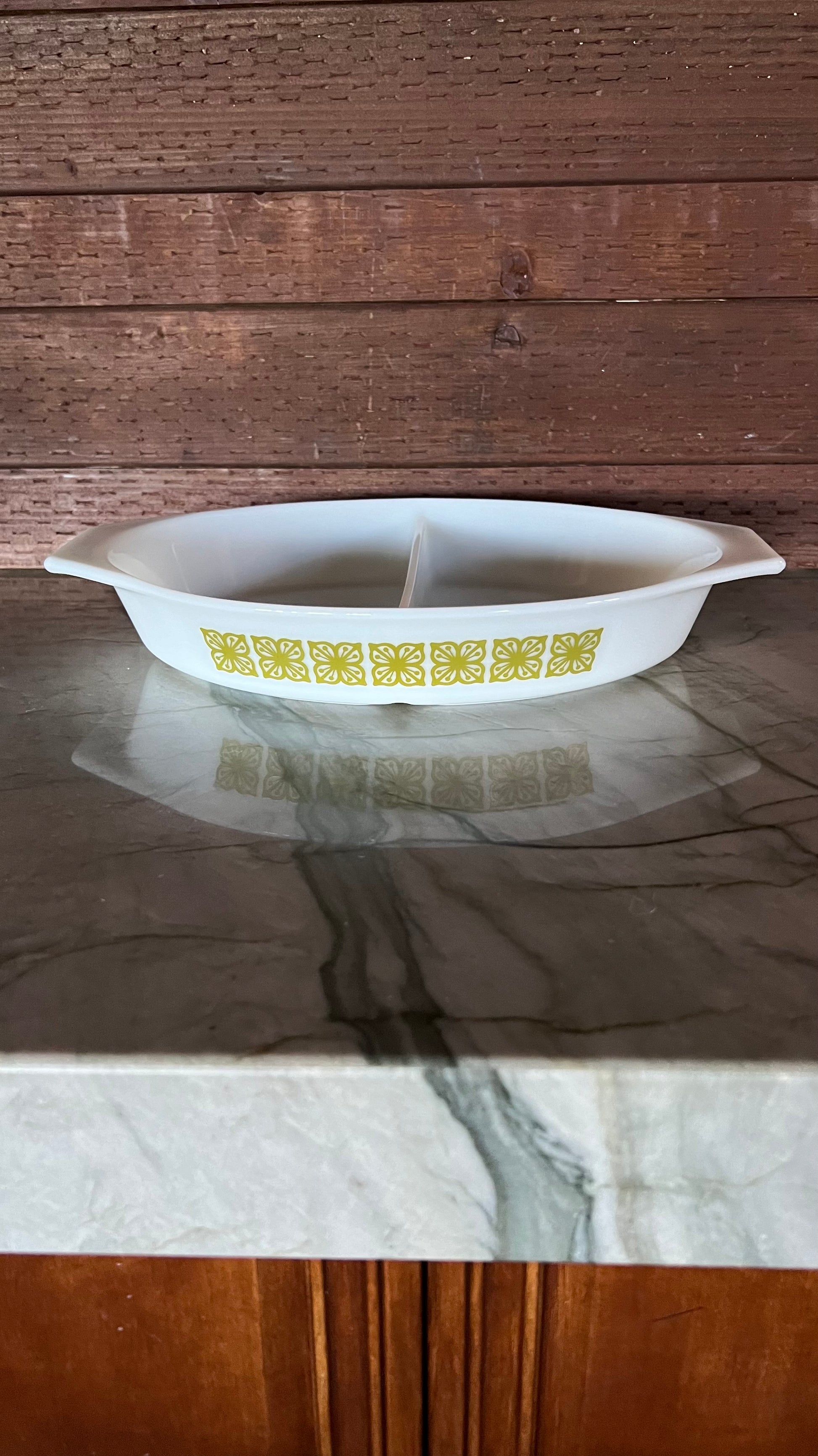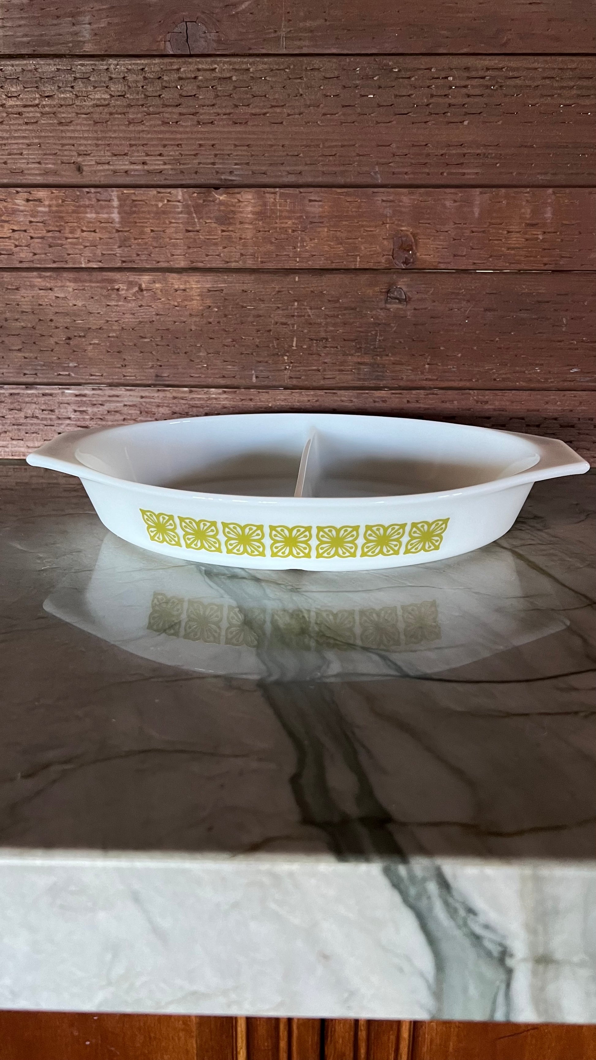 Verde Square Flower Pyrex divided casserole dish, no lid. The dish is in great vintage condition, no chips, no dishwasher damage. There is one small hairline crack on the divider, photographed. The pattern is vibrant and completely intact. One of my favorite patterns!