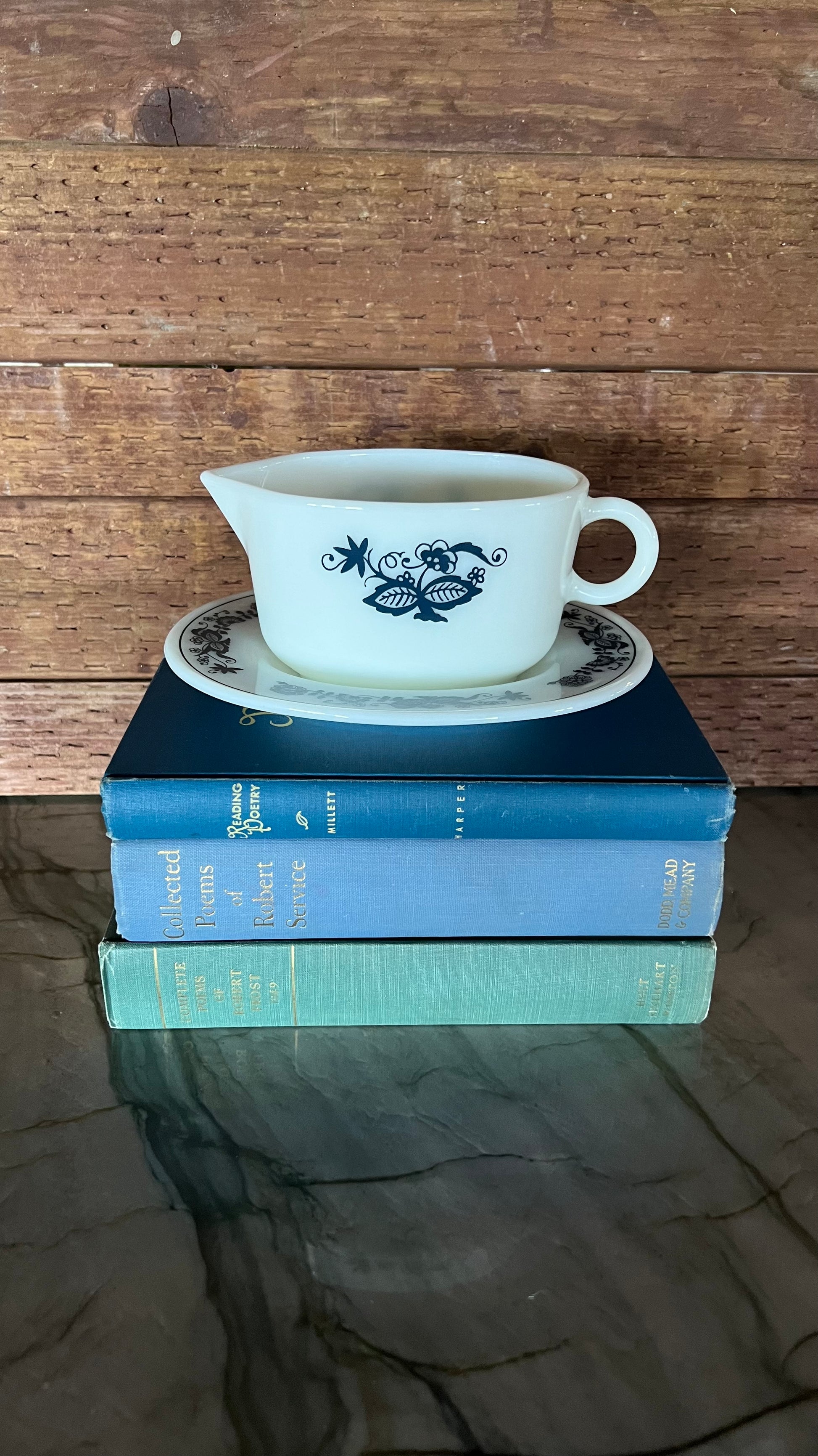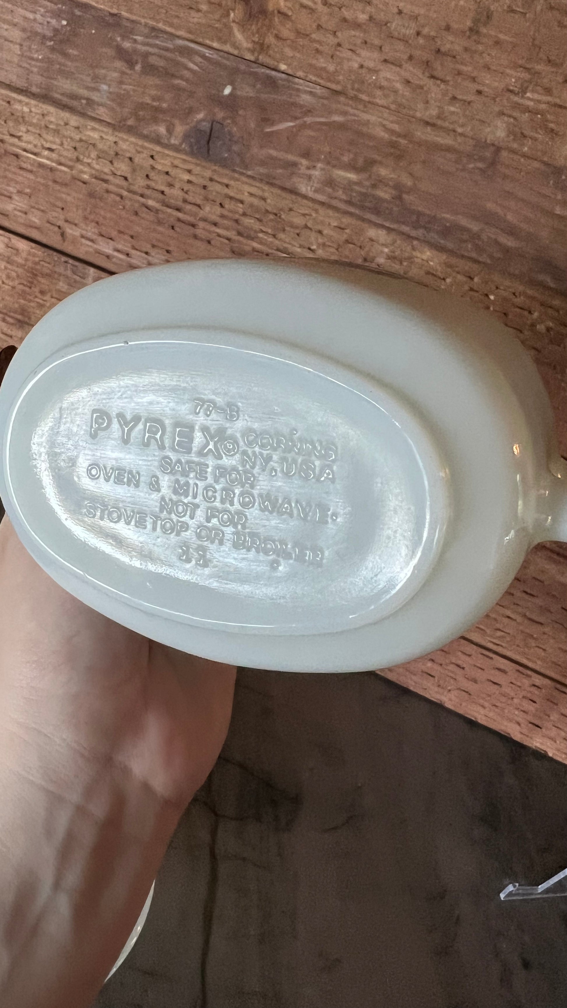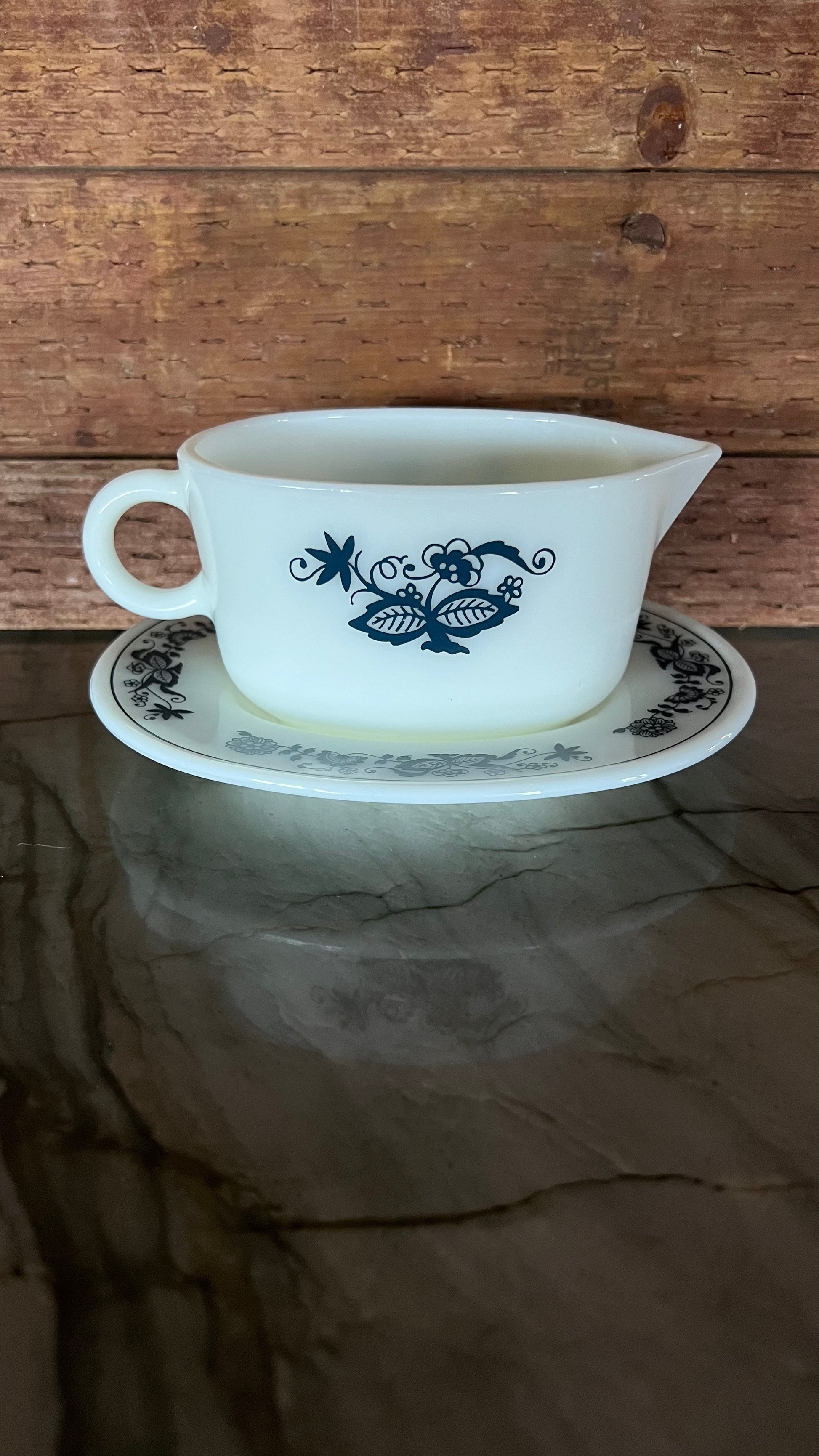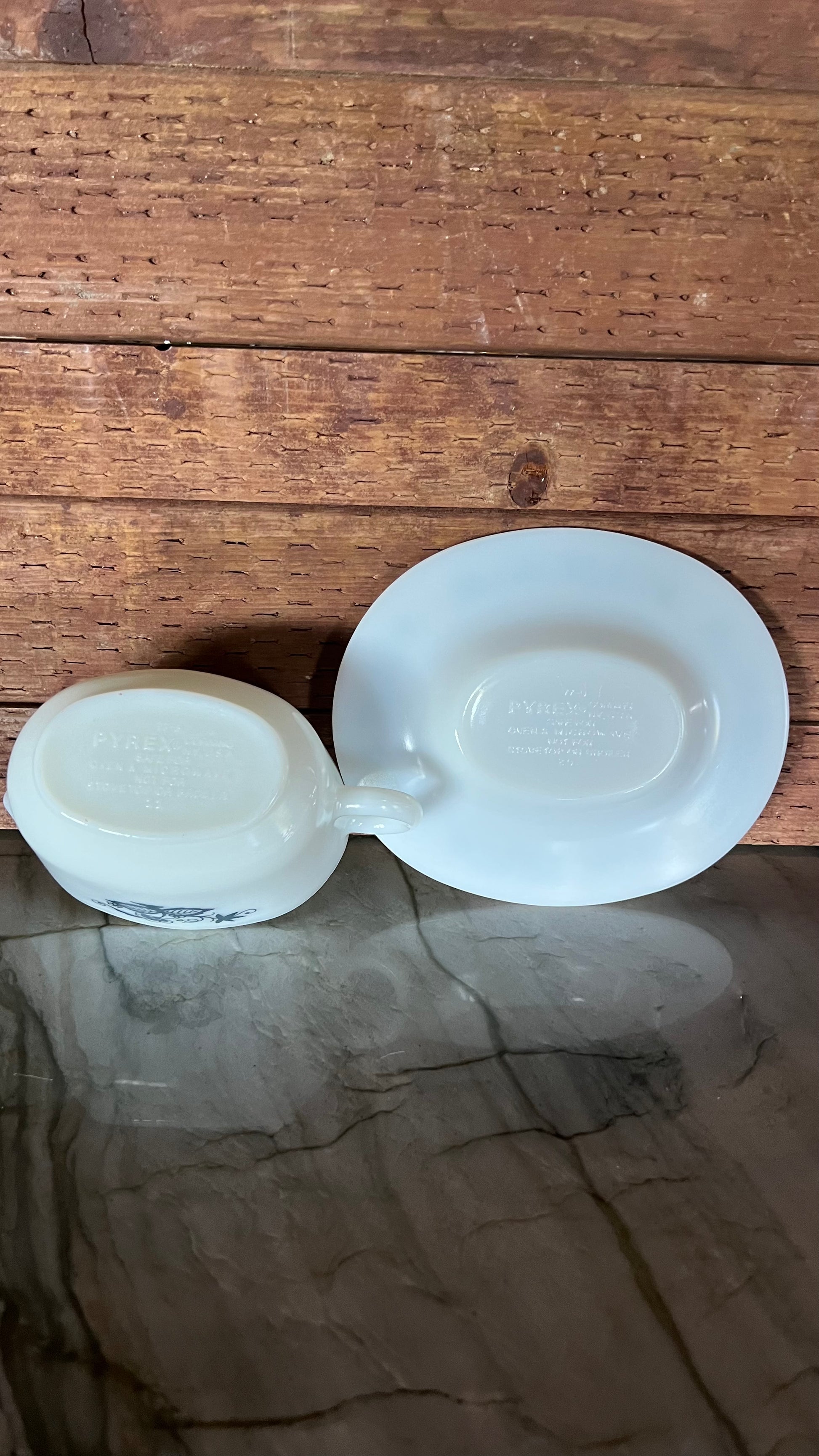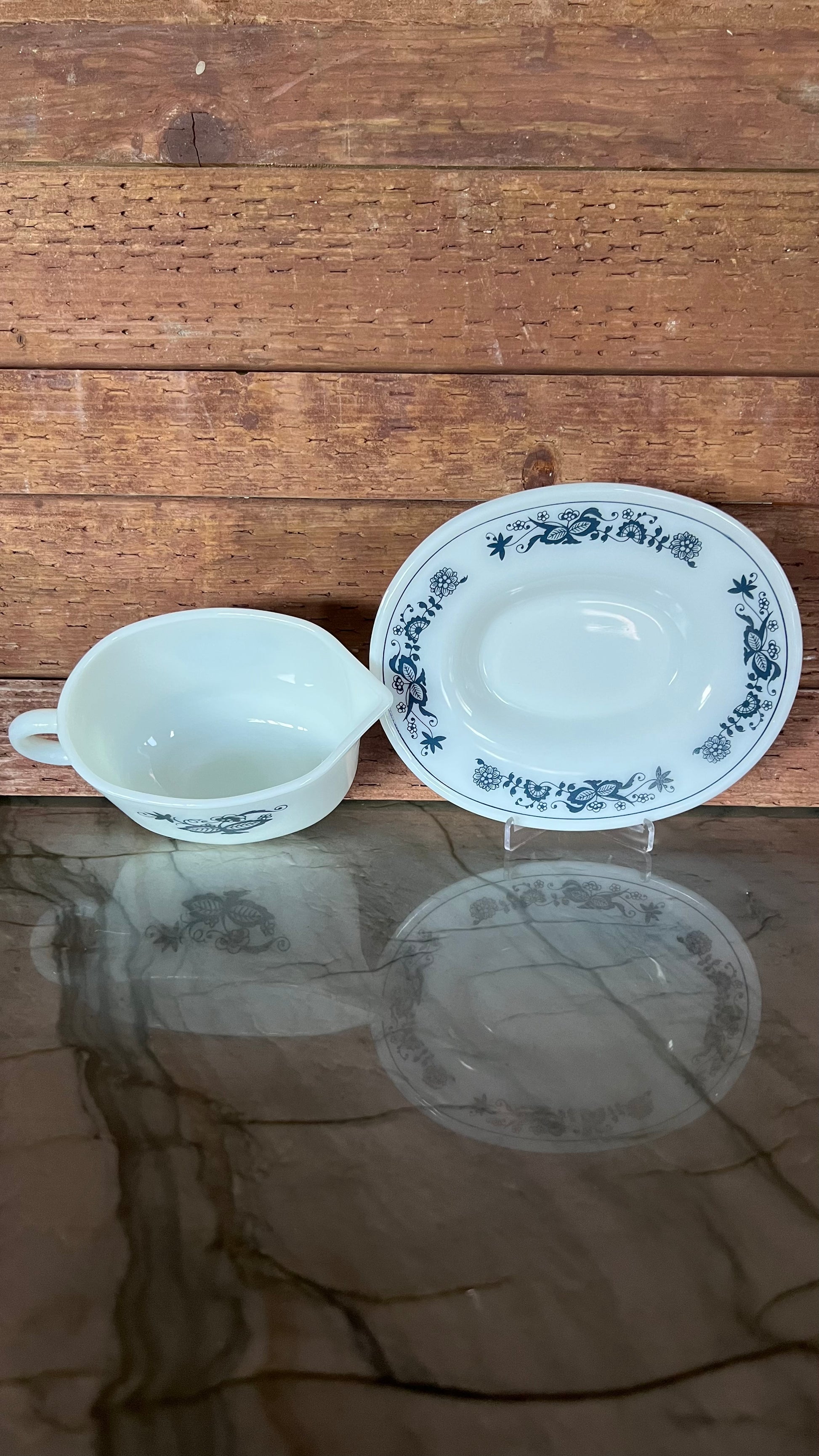 Vintage Pyrex gravy boat and dish in Old Town Blue pattern. Gravy boat measures 6.75” (including handle) by 3.75” and is stamped 77-B on the bottom, and the dish measures 7.5” by 6.25” and is stamped 77-U on the bottom. Excellent vintage condition!