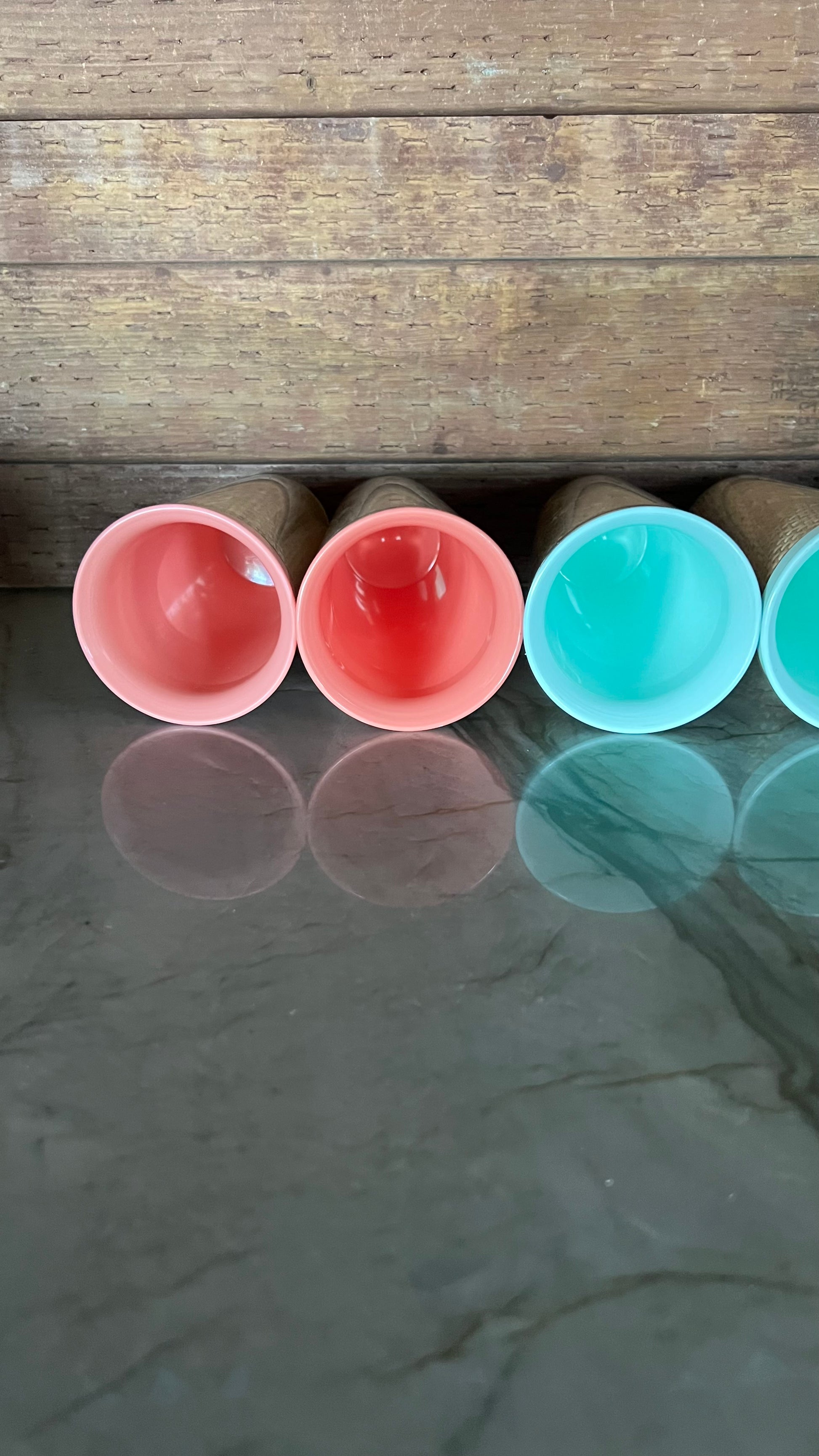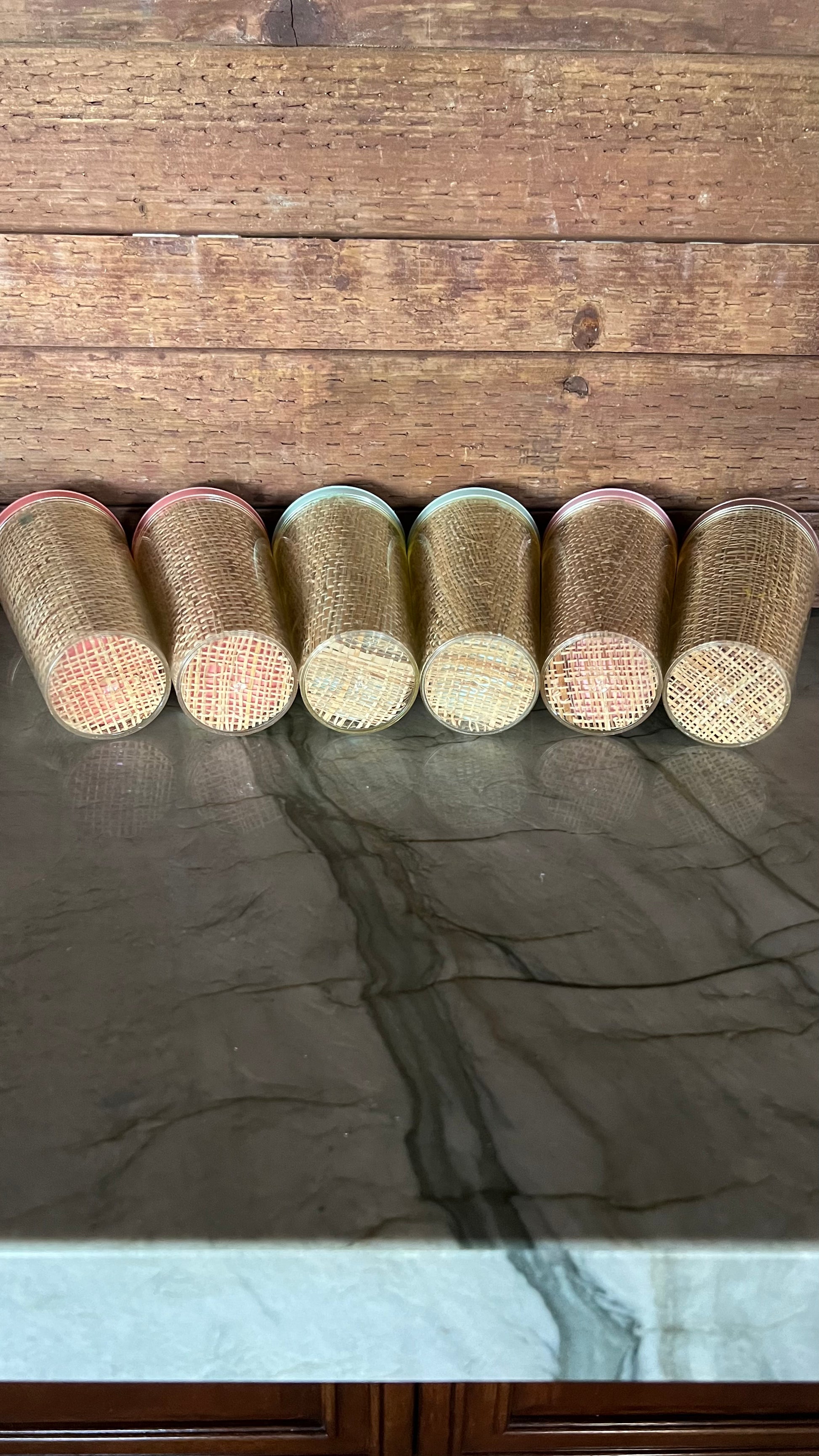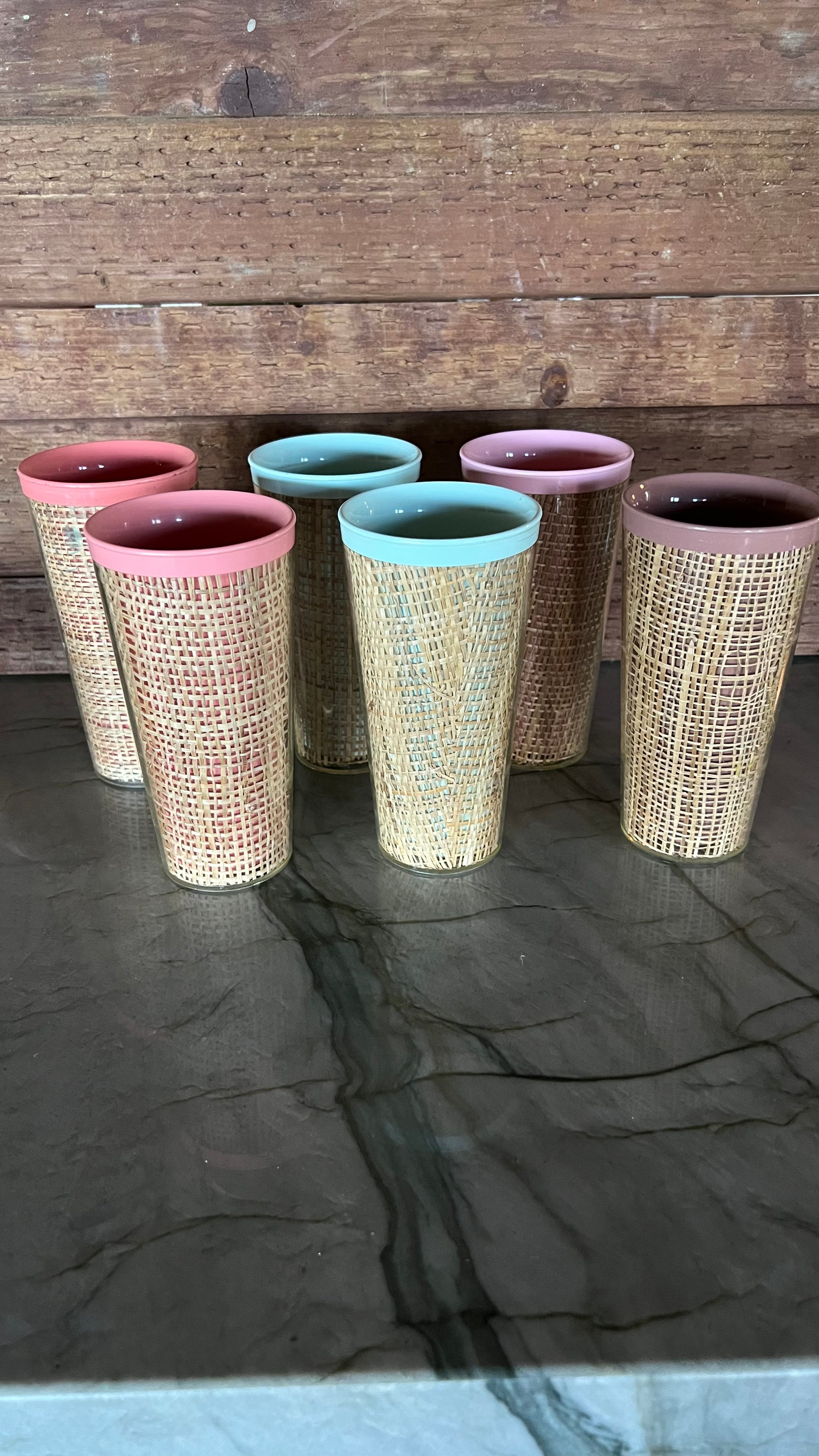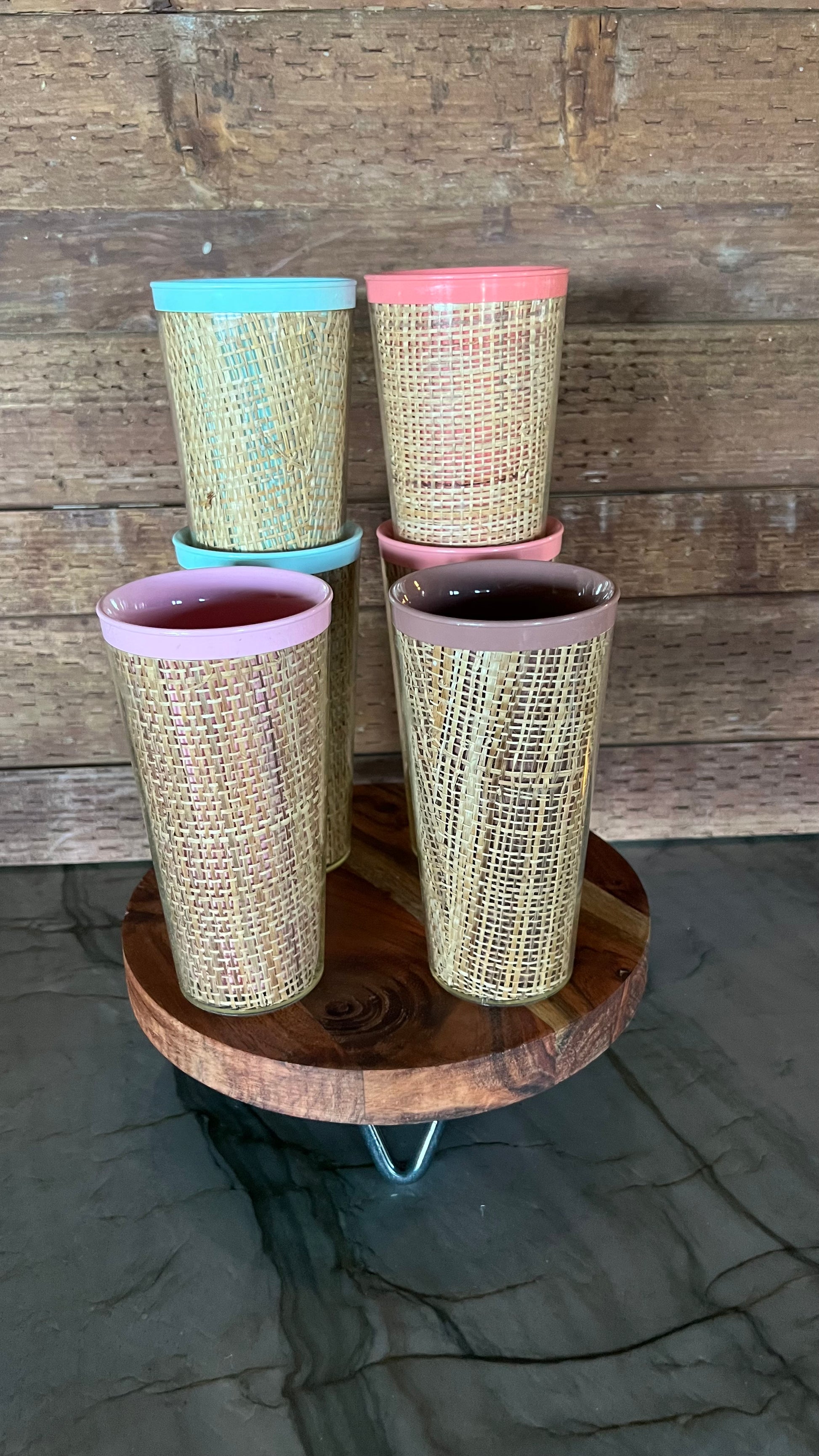 Vintage mid century modern Raffiaware burlap tumblers. Set of 6 cups, in very good vintage condition. Each cup measures 6” tall and holds 10oz. From the 1950/60s. Beautiful and hard to find!