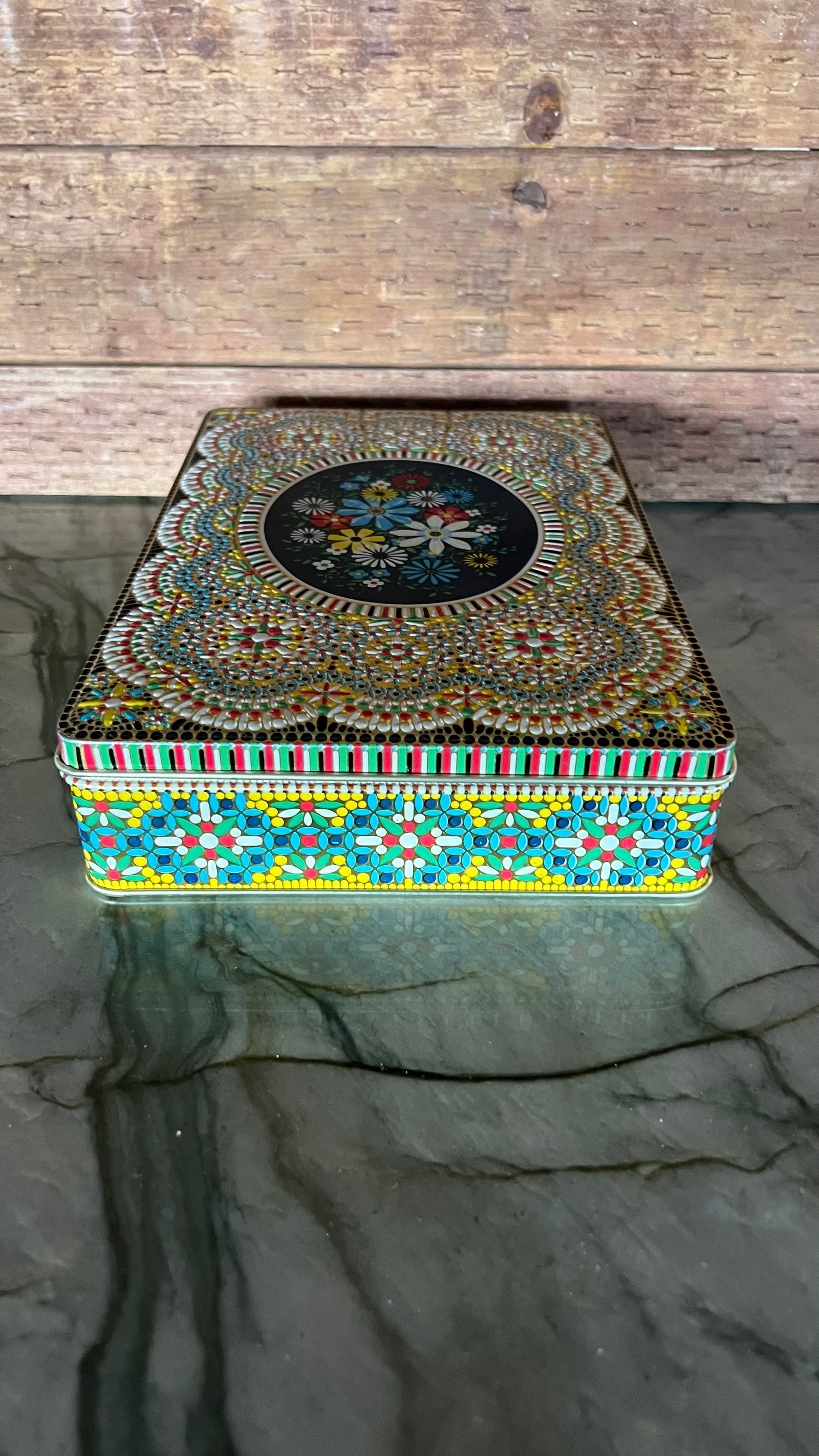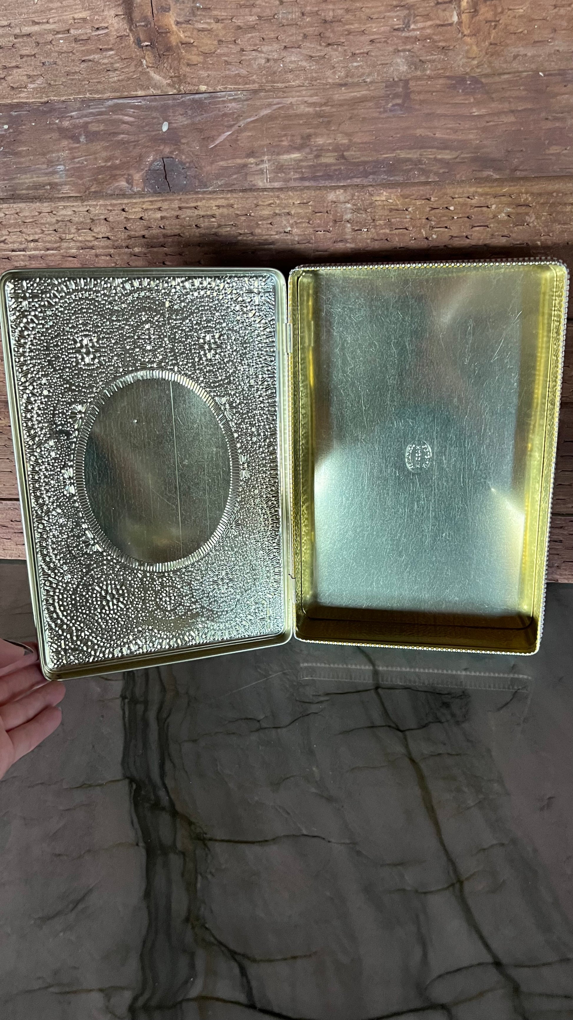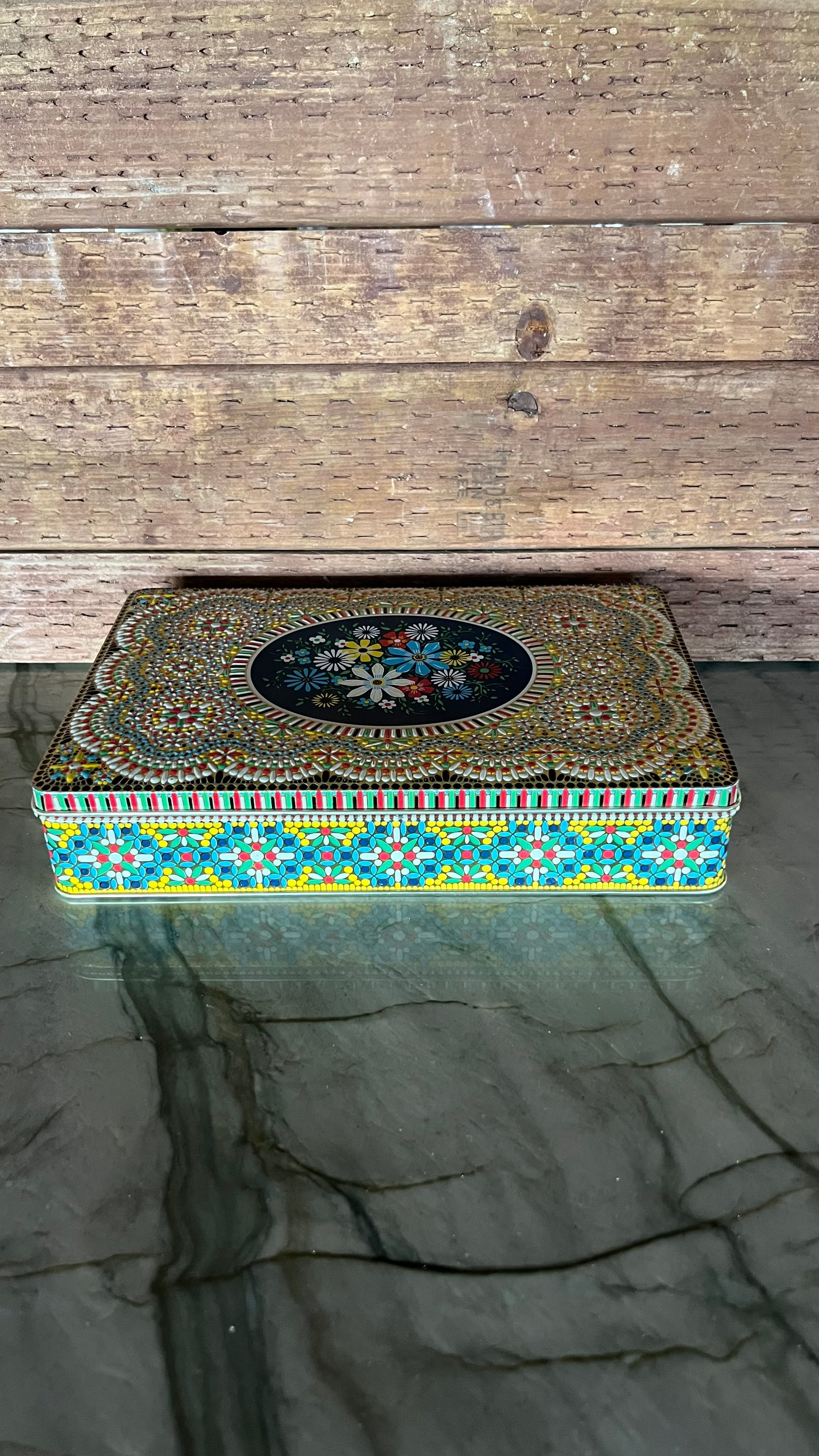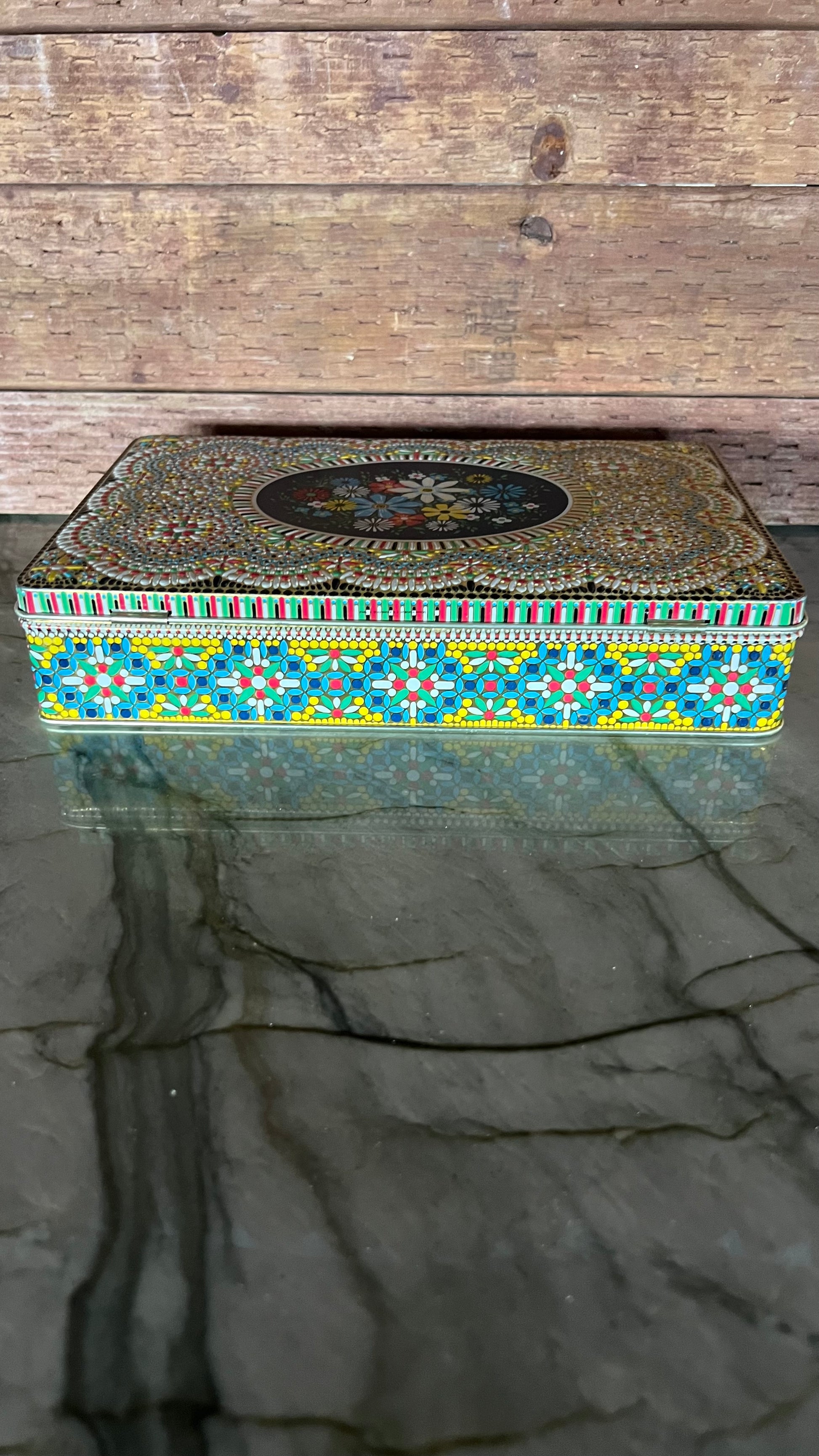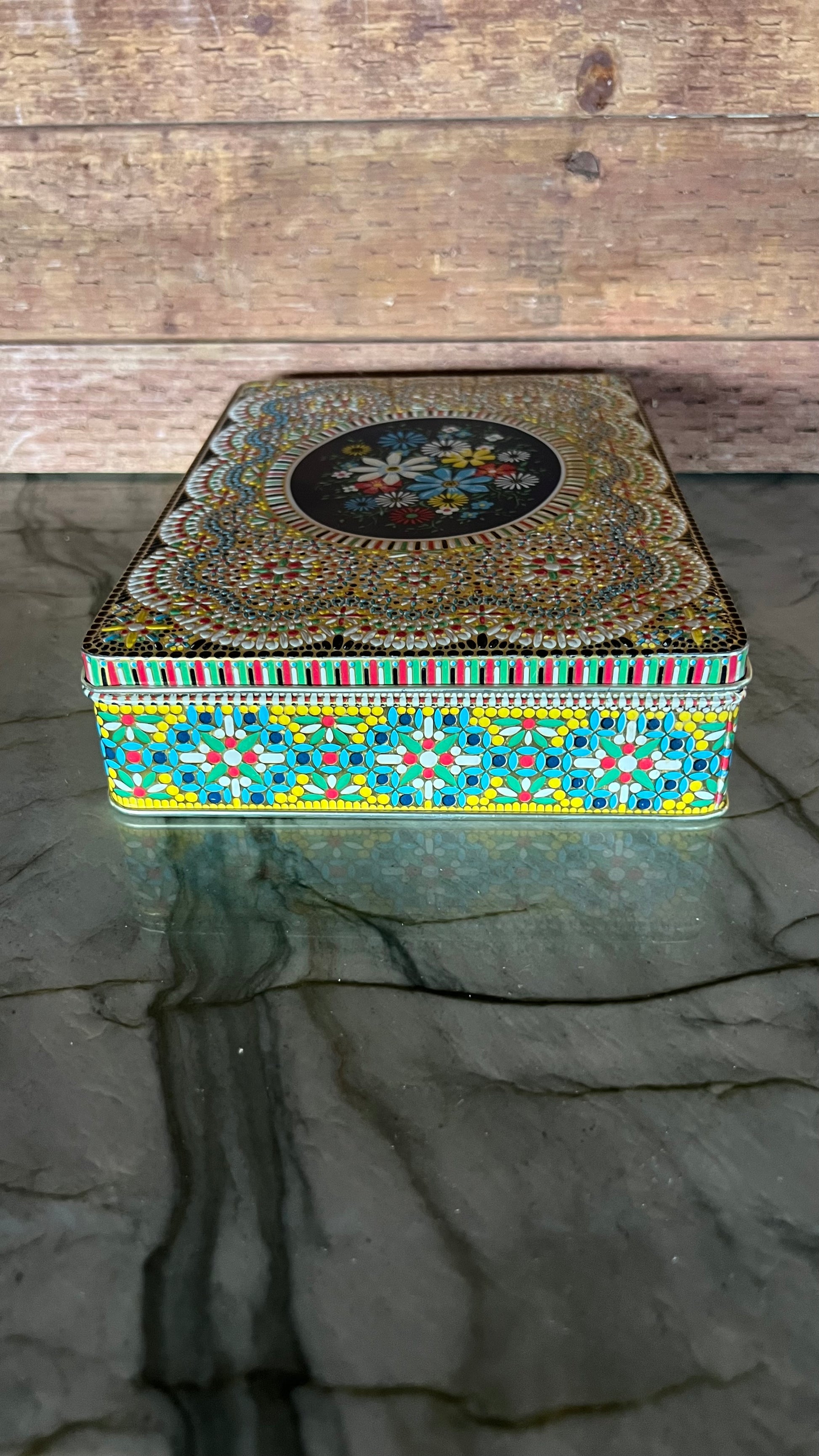 Super cute rectangular decorative tin. In very good vintage condition, colors are still very vibrant! Measures 10” by 6.75” by 2”. Made in Belgium.