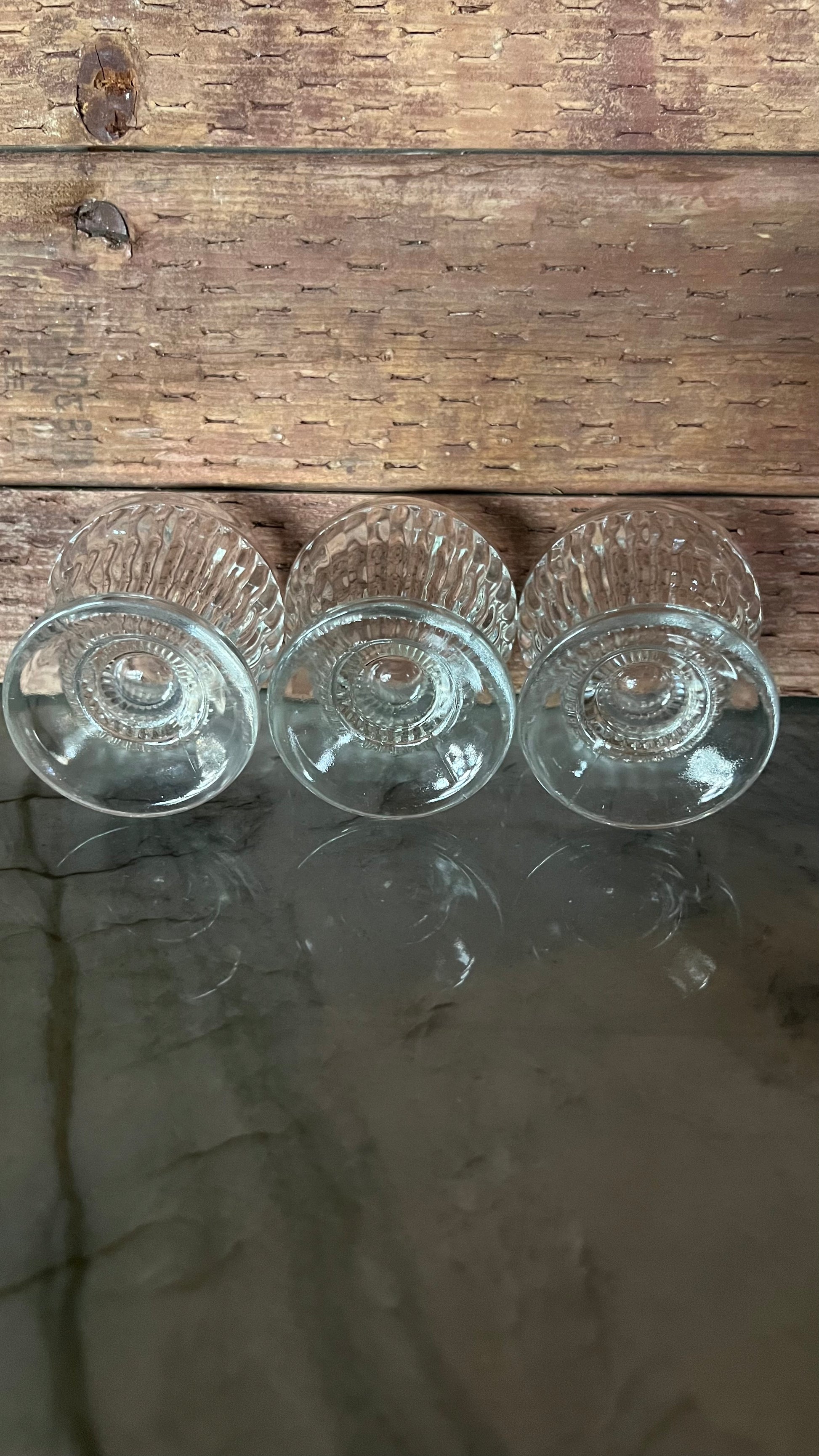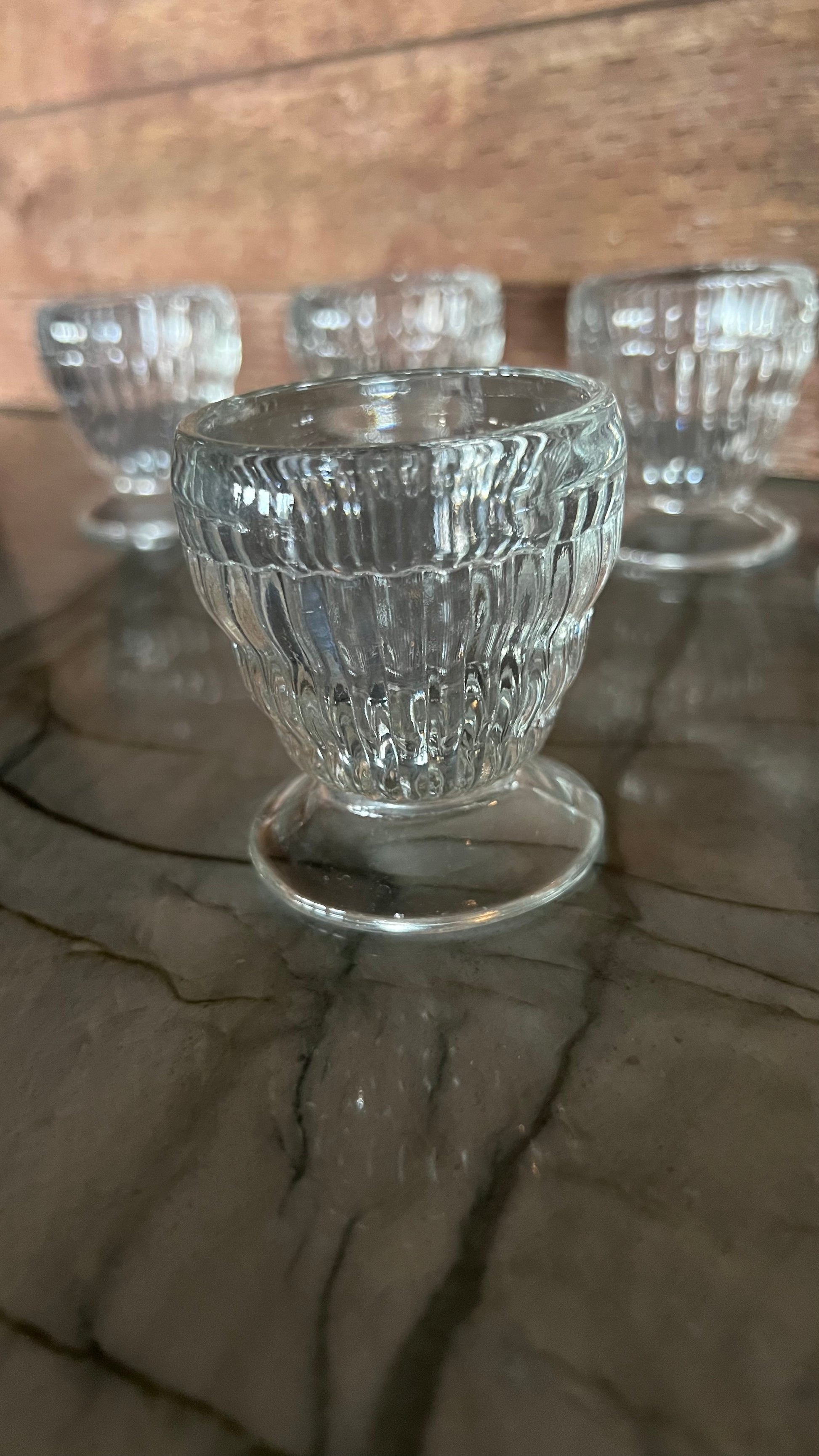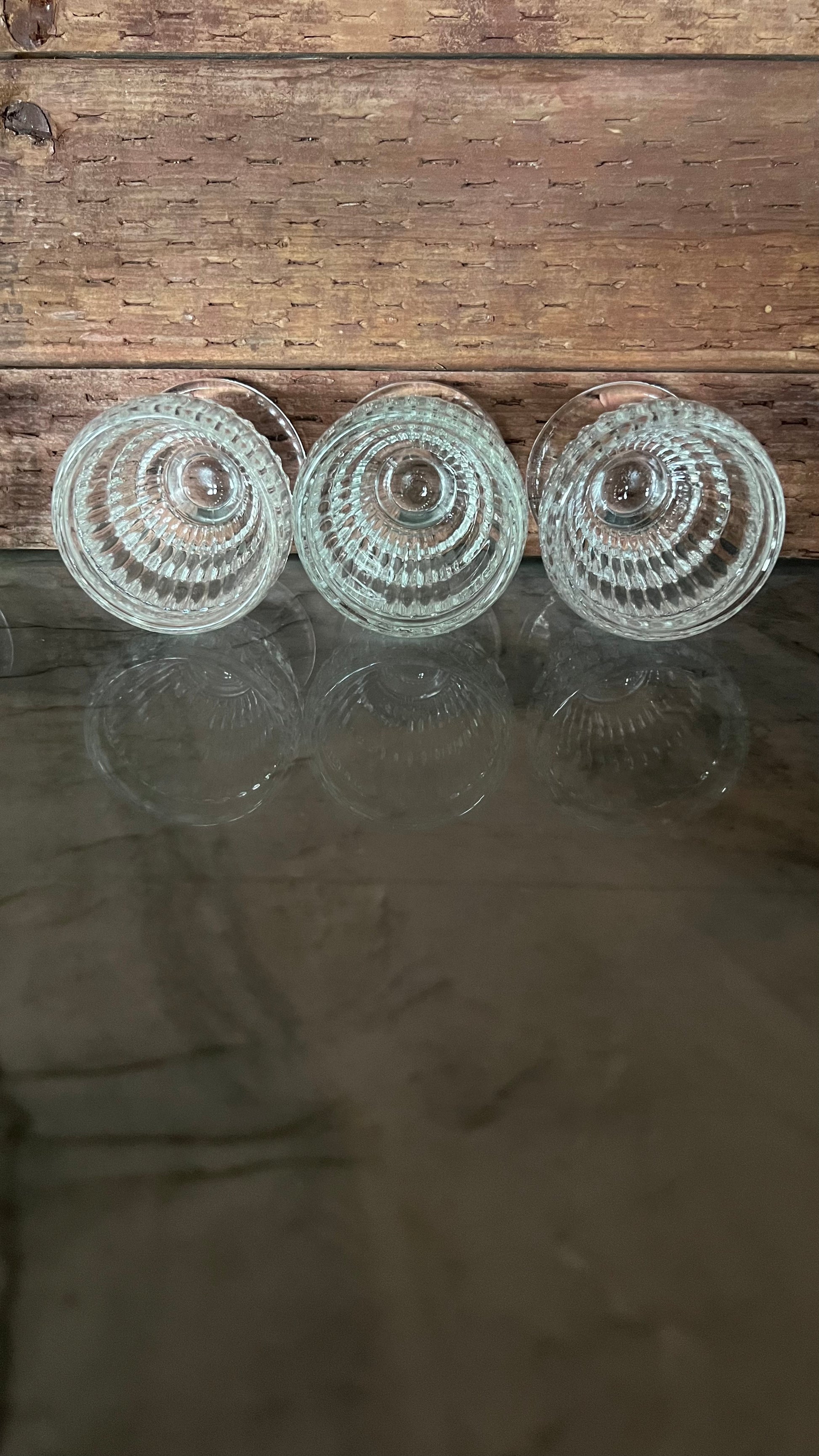 Antique 1950s short, pudgy pedestal dessert glasses. Set of 7. Each measures 2.75” tall with a 2.25” diameter at the base. Stamped with a J on the bottom. Excellent vintage condition, one glass has a small nip on the top edge.