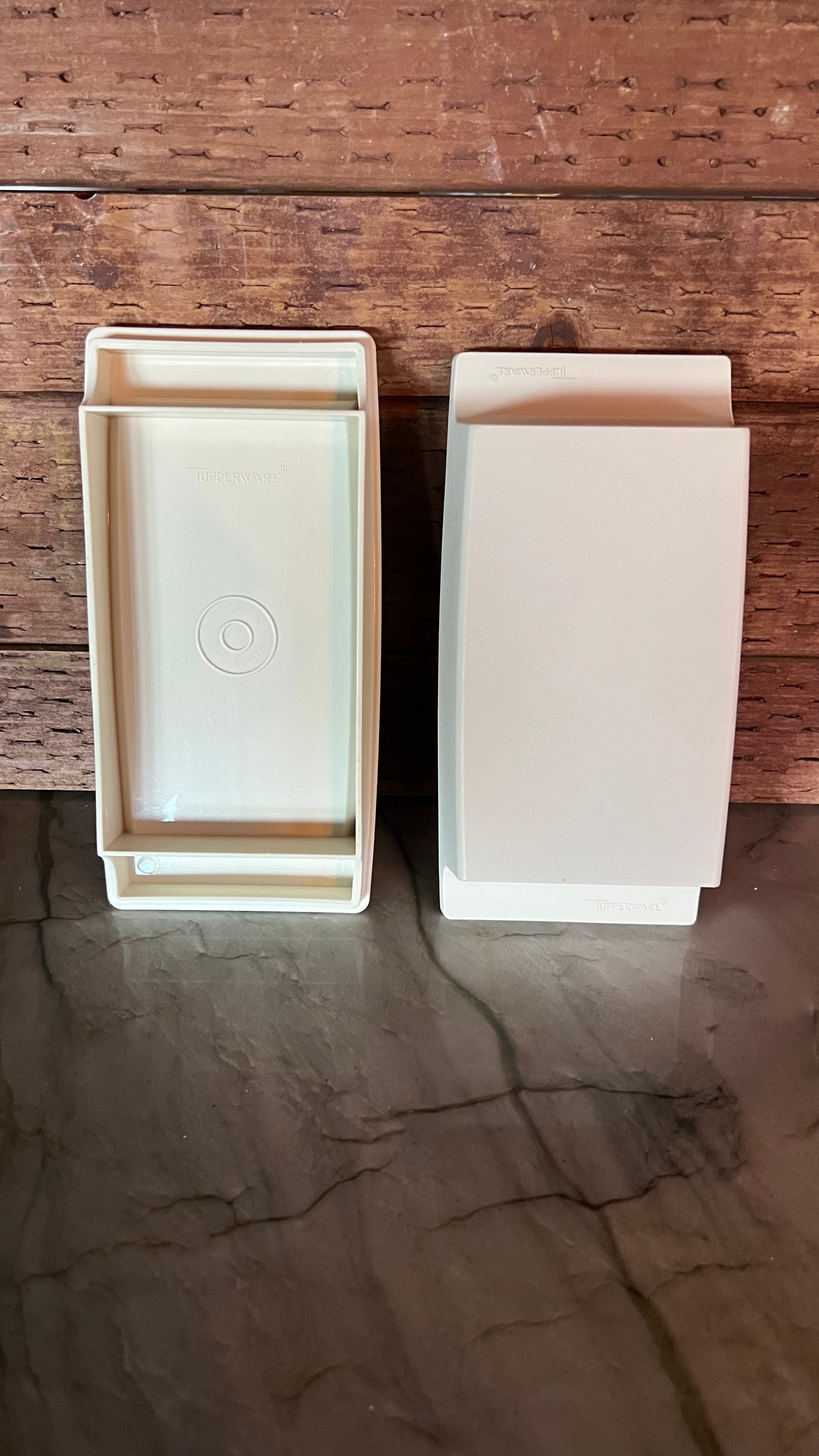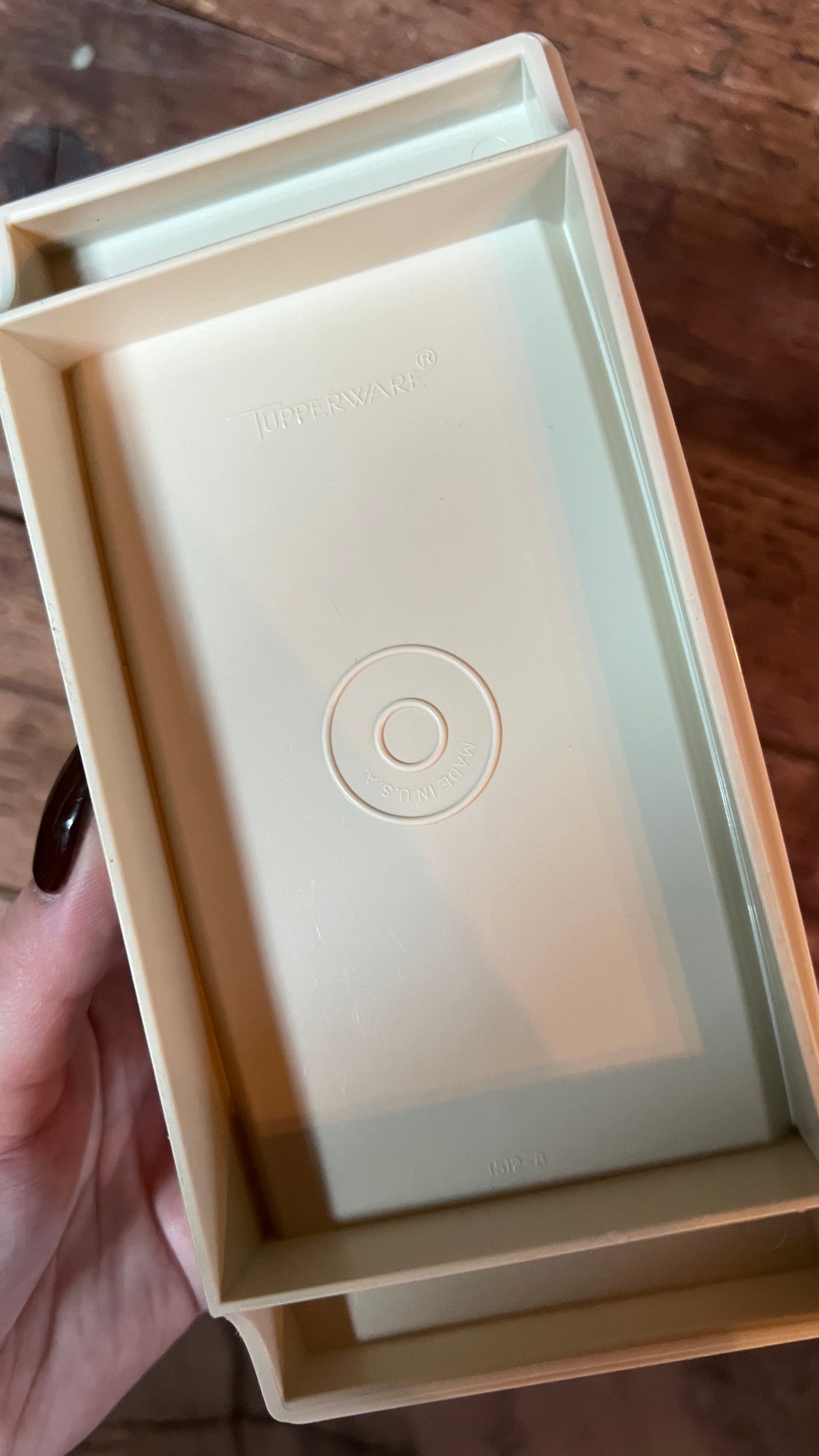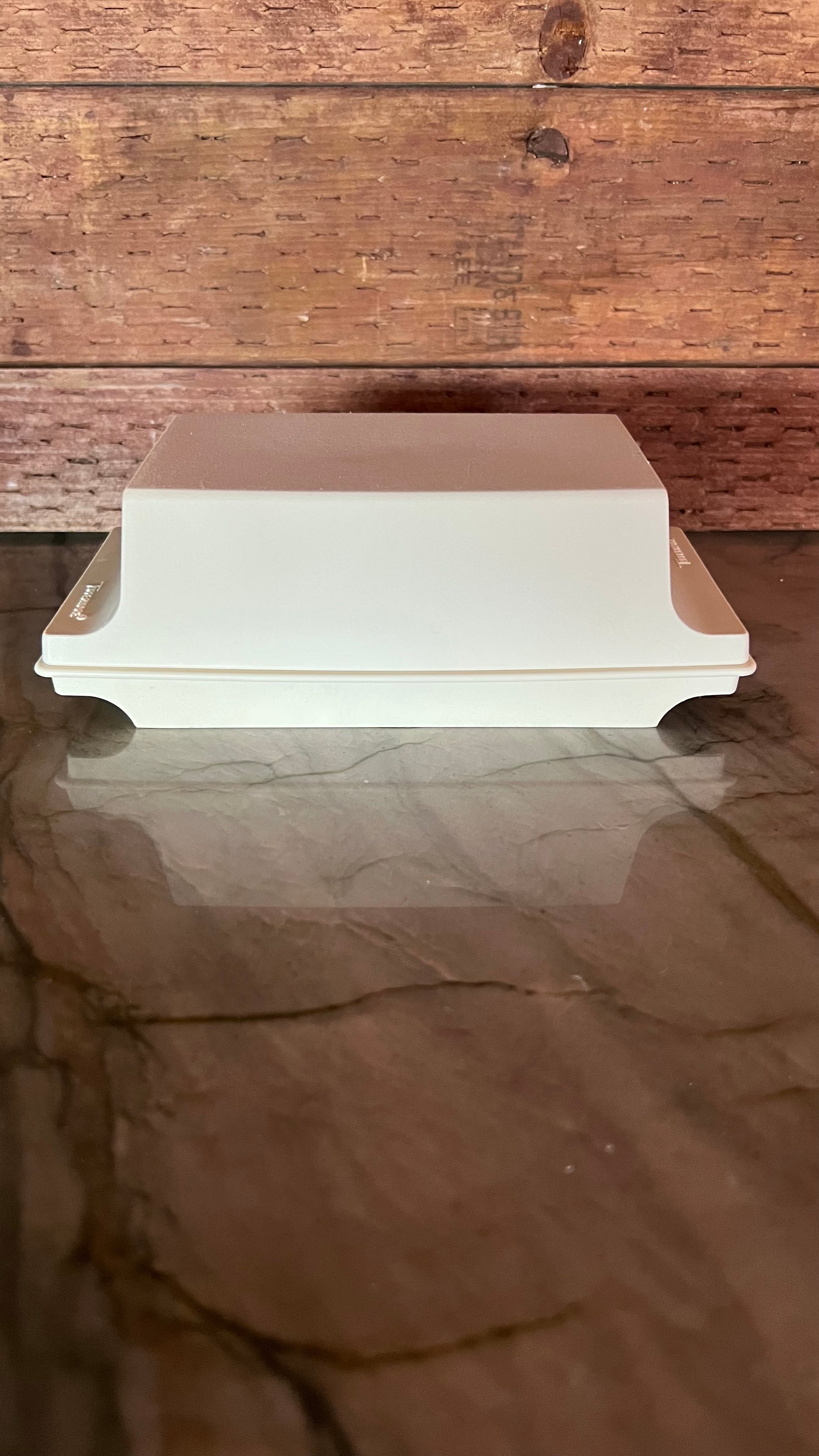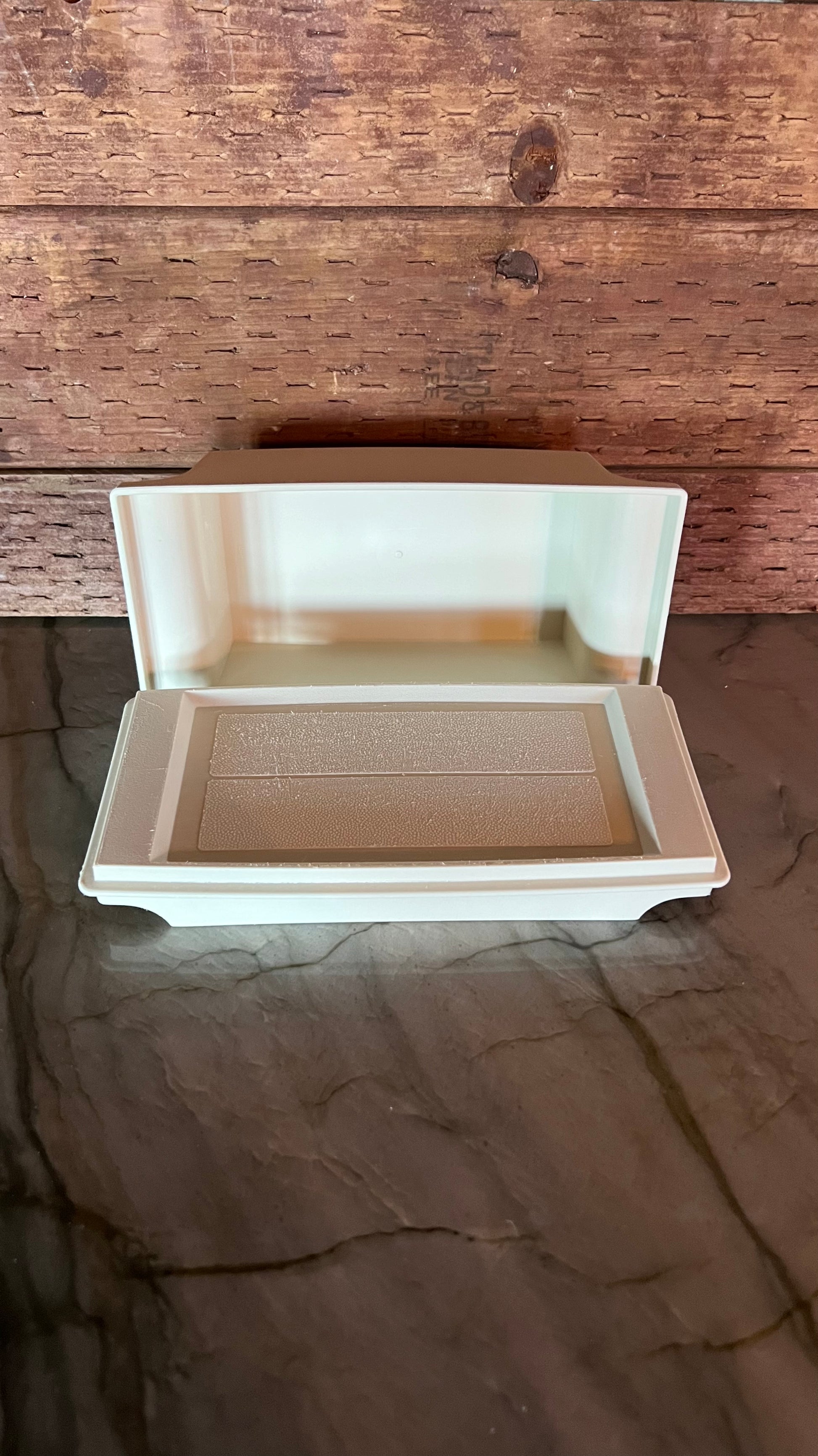 Vintage Tupperware butter dish in an almond color. There is room for two sticks of butter inside. Stamped 1512-8 on the bottom. Measures 7.25” at the widest point by 3.25” at the base. Excellent vintage condition!