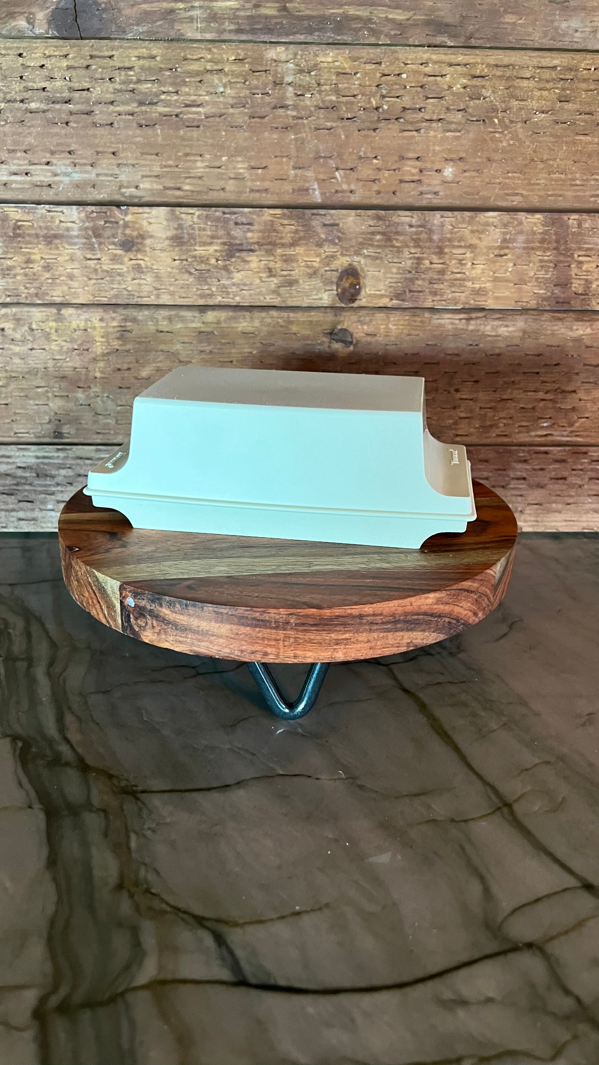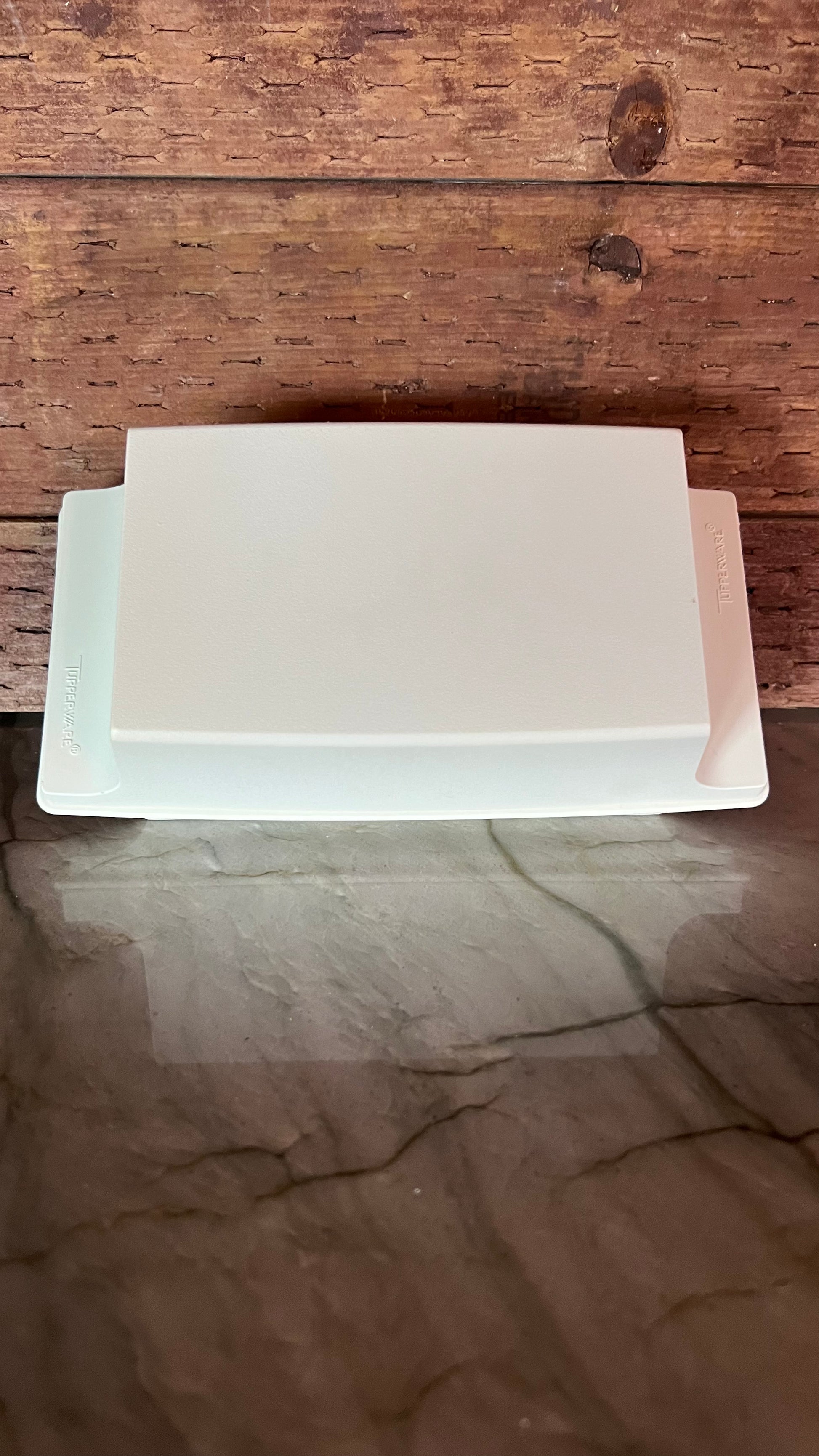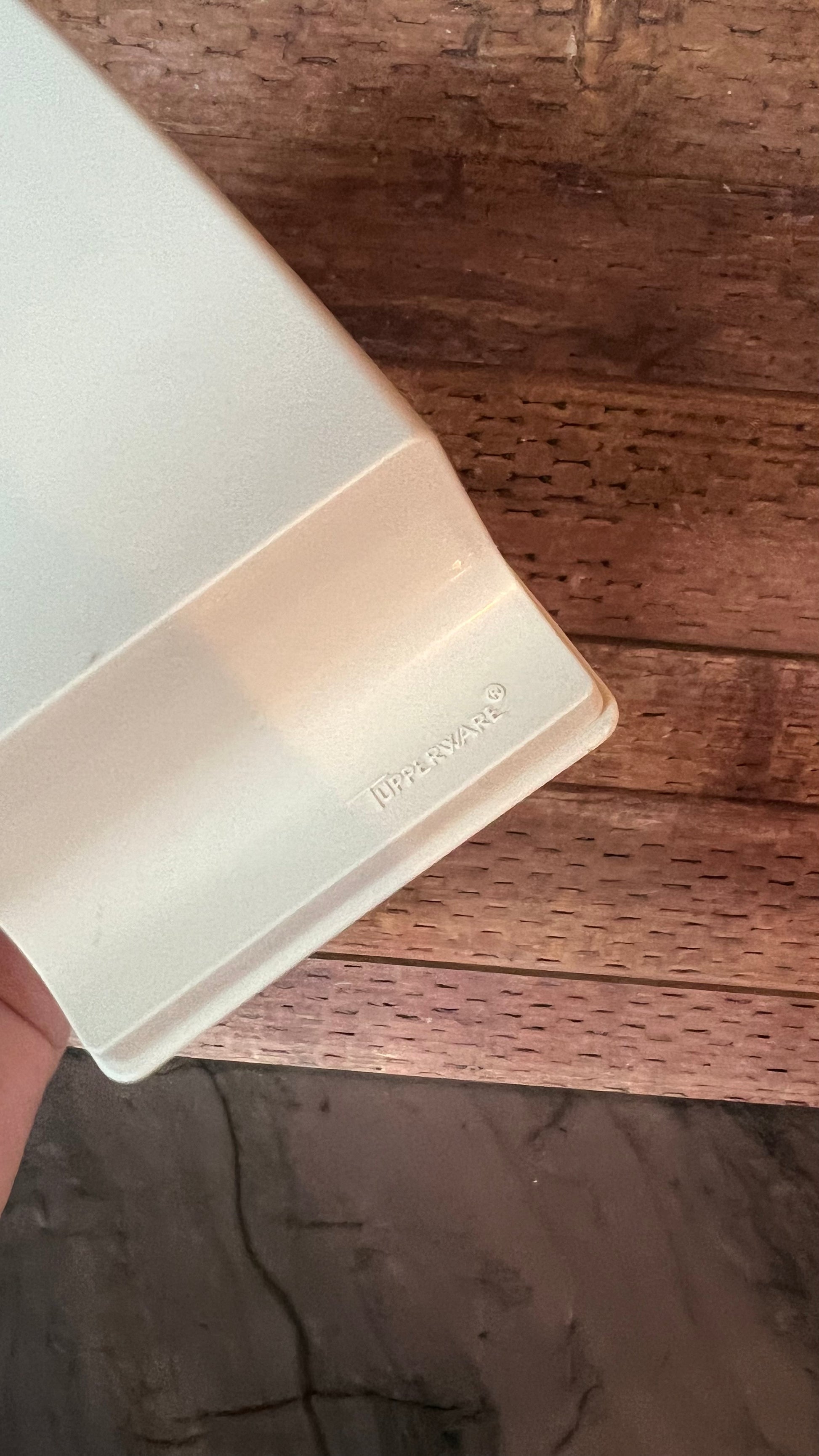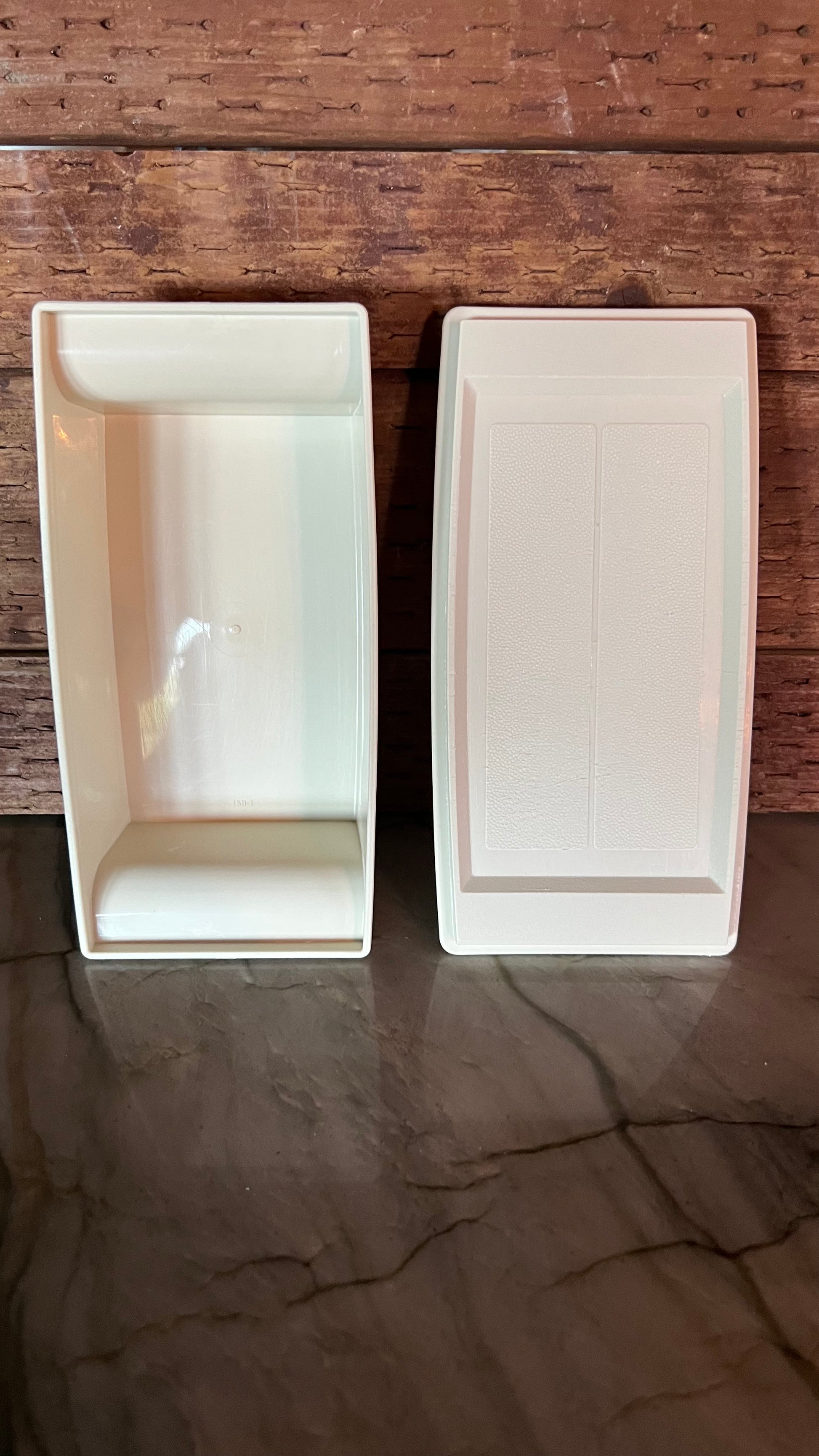 Vintage Tupperware butter dish in an almond color. There is room for two sticks of butter inside. Stamped 1512-8 on the bottom. Measures 7.25” at the widest point by 3.25” at the base. Excellent vintage condition!