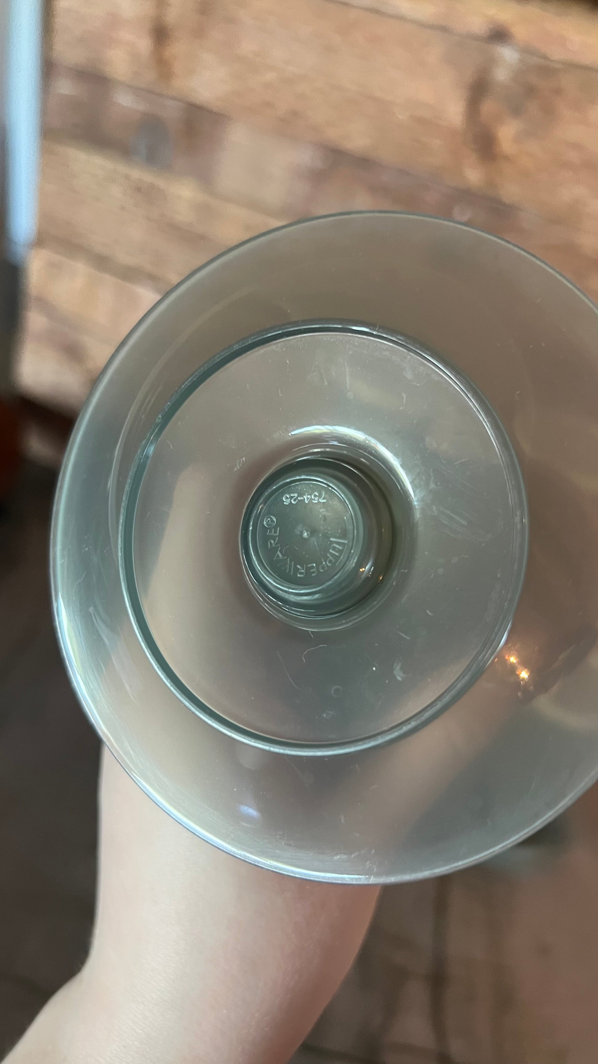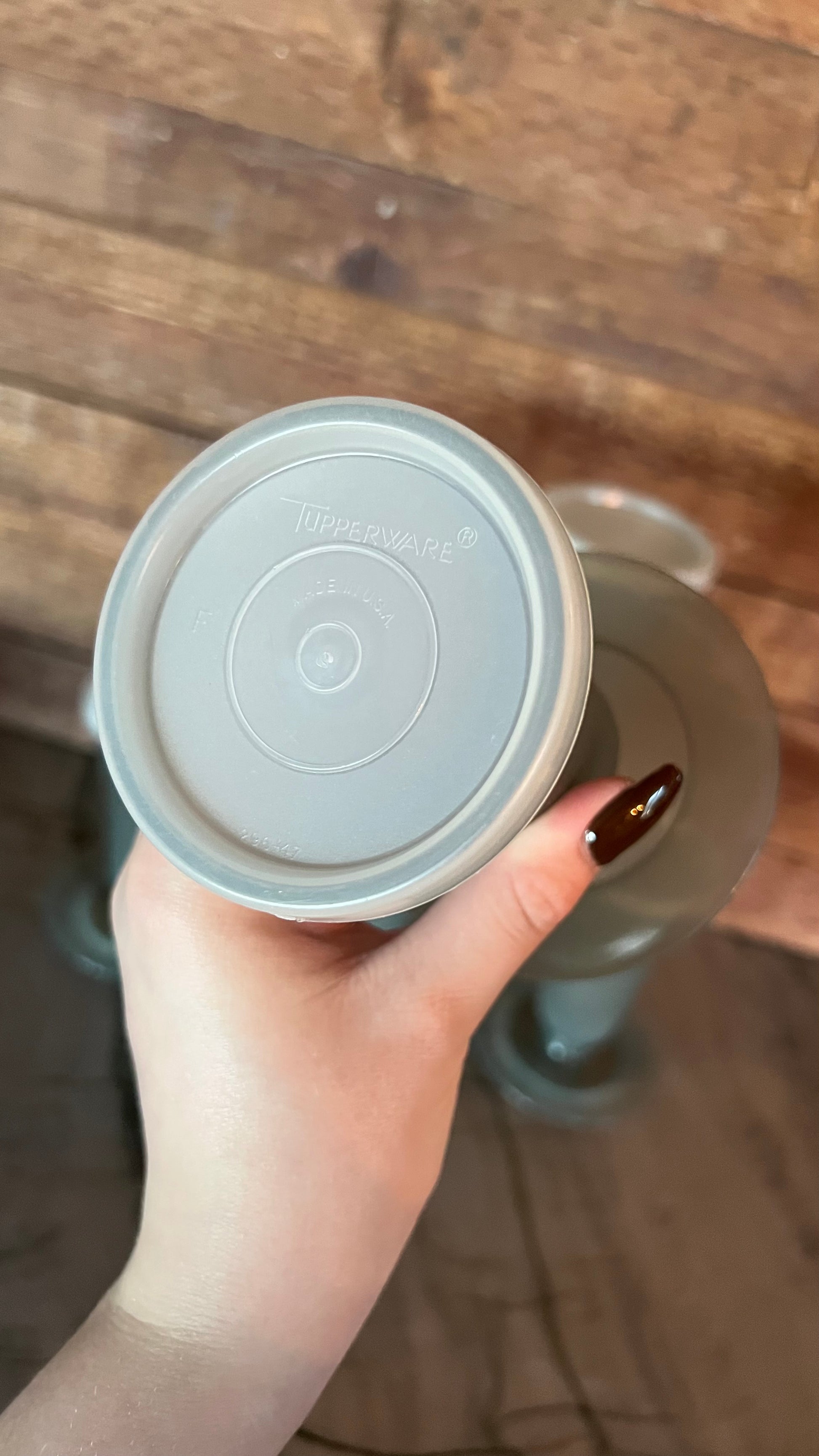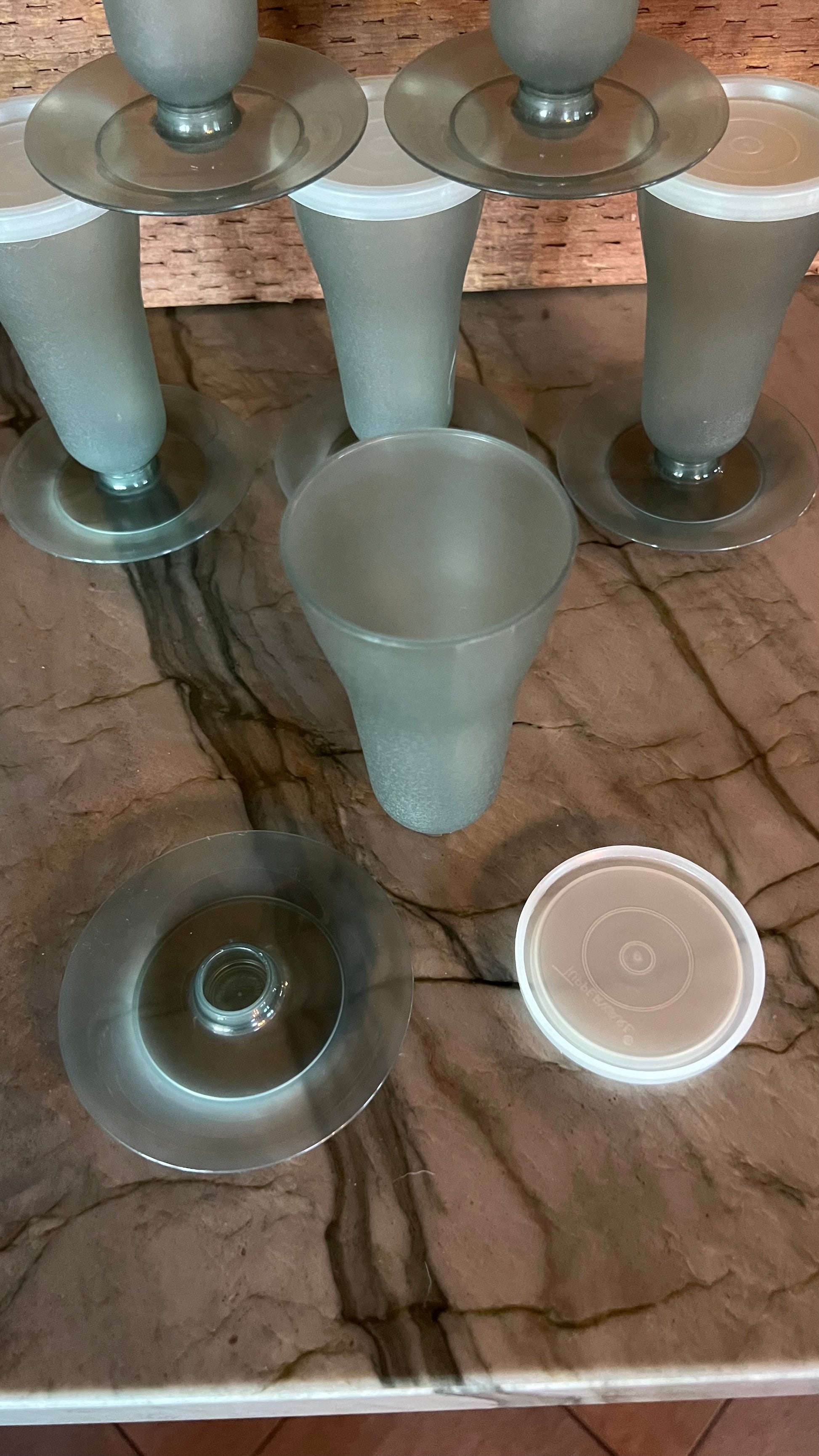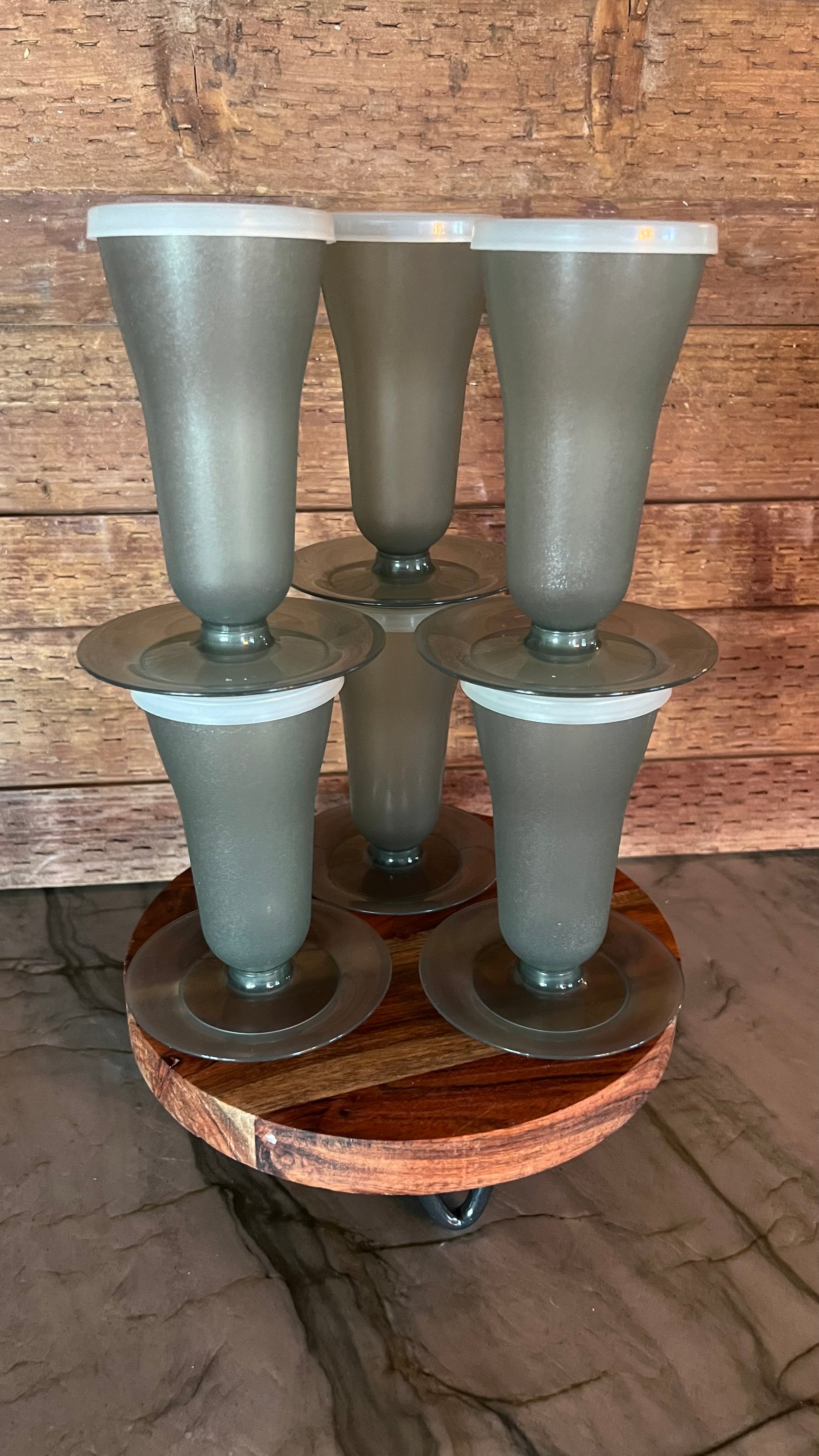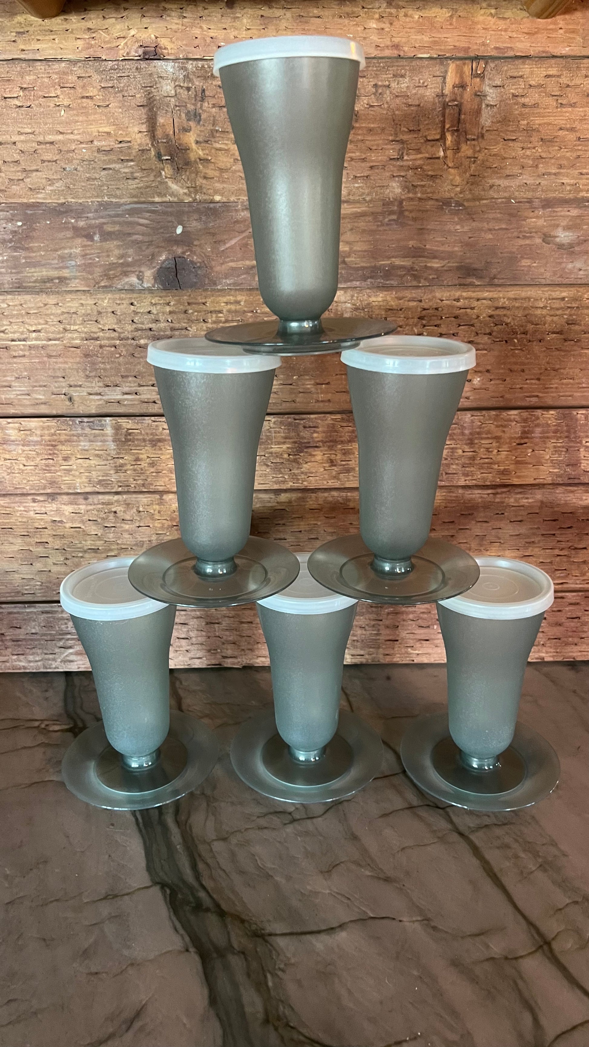 Vintage Tupperware parfait/sundae cups with lids and bases. Set of 6, in excellent vintage condition. Color is a smokey gray with a clear lid. They measure 5.5” tall with a 4.25” diameter at the base. Base is stamped #754-28, lid is stamped #296-43, cup is stamped #F-39.