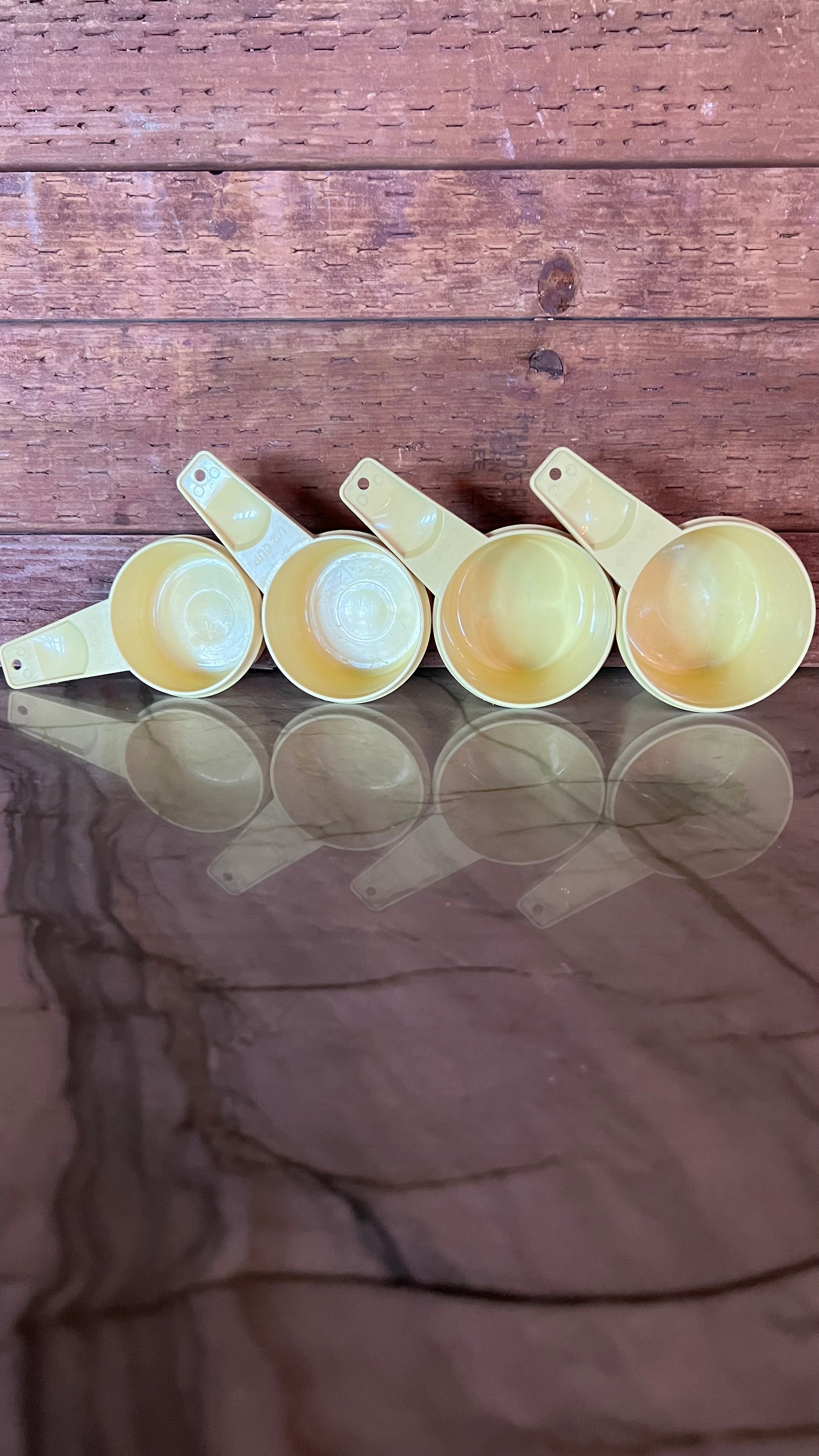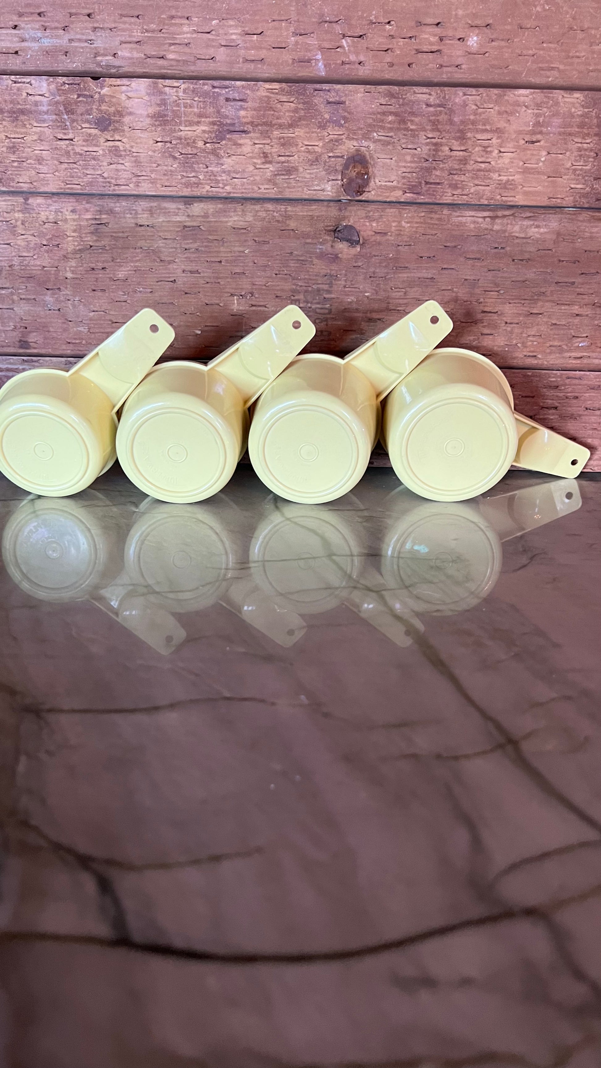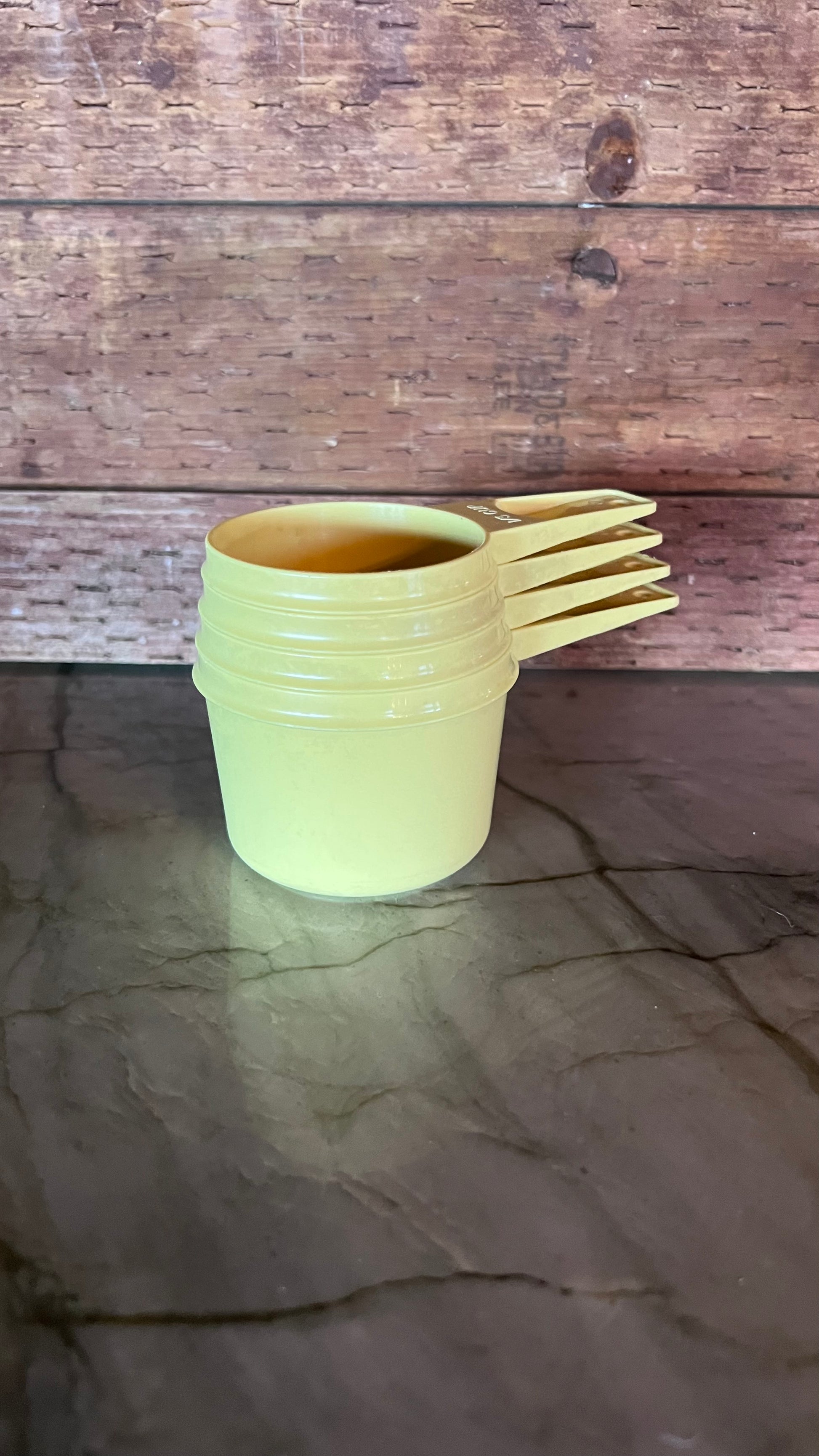 Set of 4 vintage Tupperware measuring cups in harvest gold. Set comes with 1/3c, 1/2c, 2/3c, and 3/4c. Very good vintage condition.