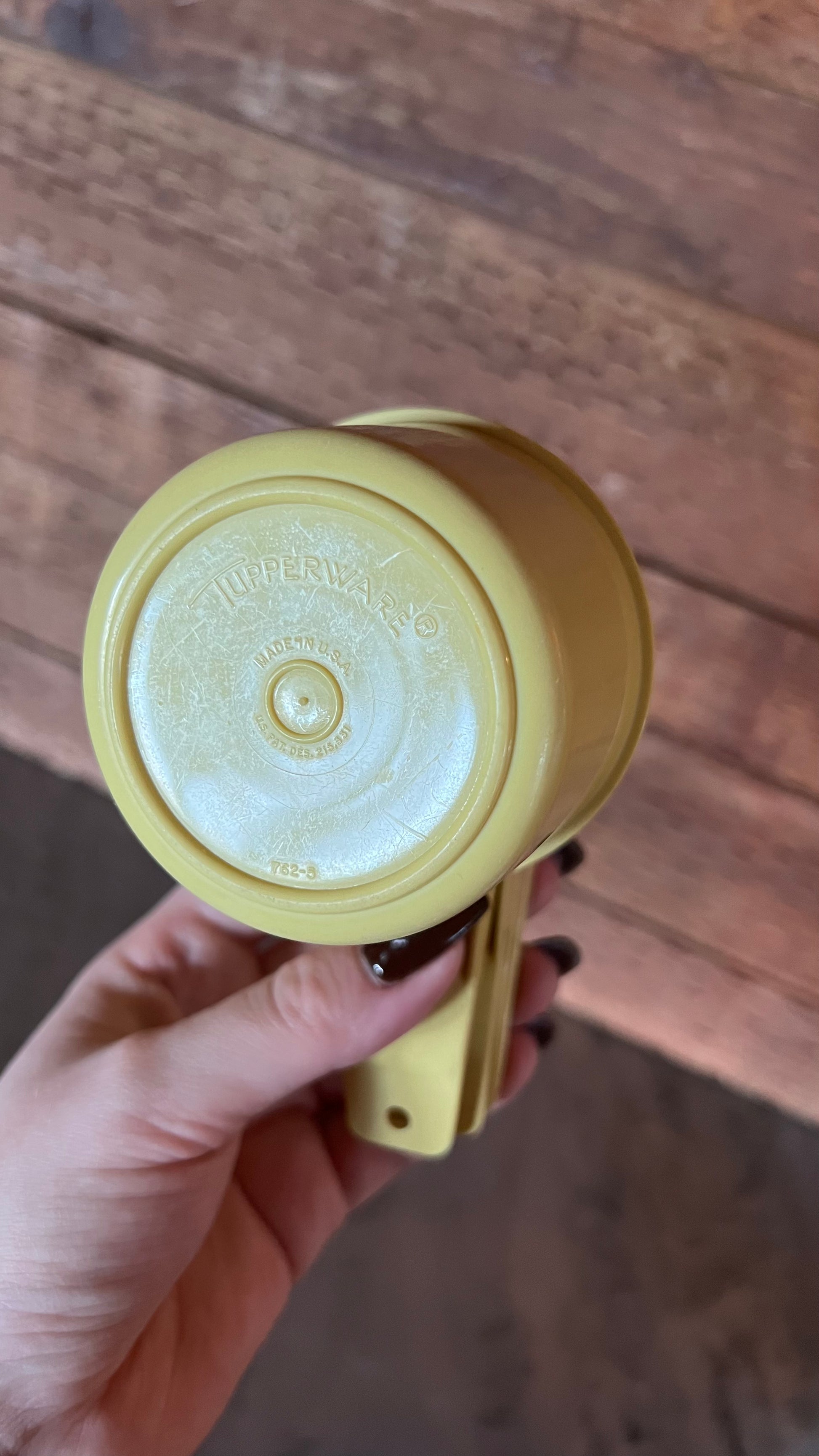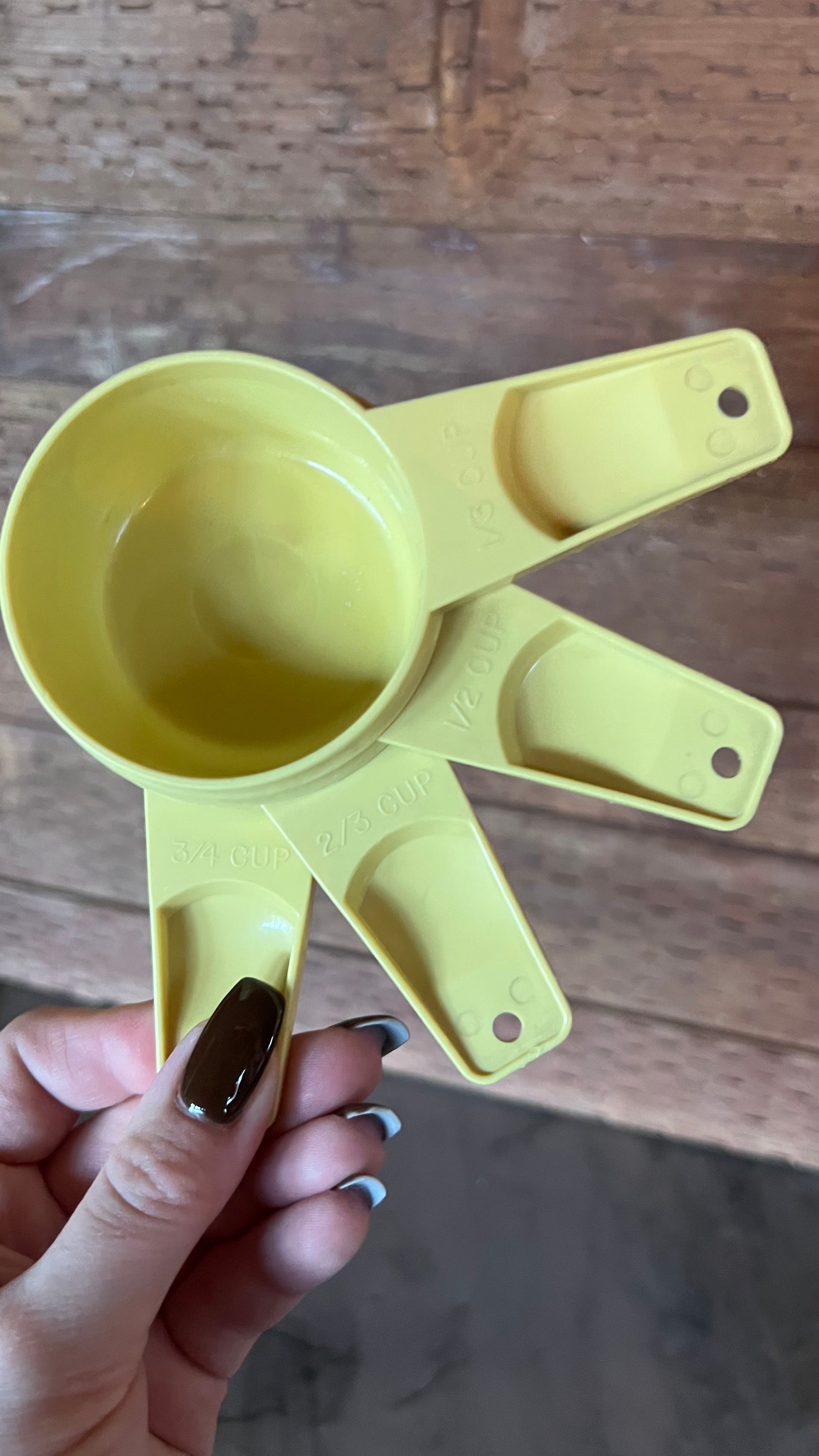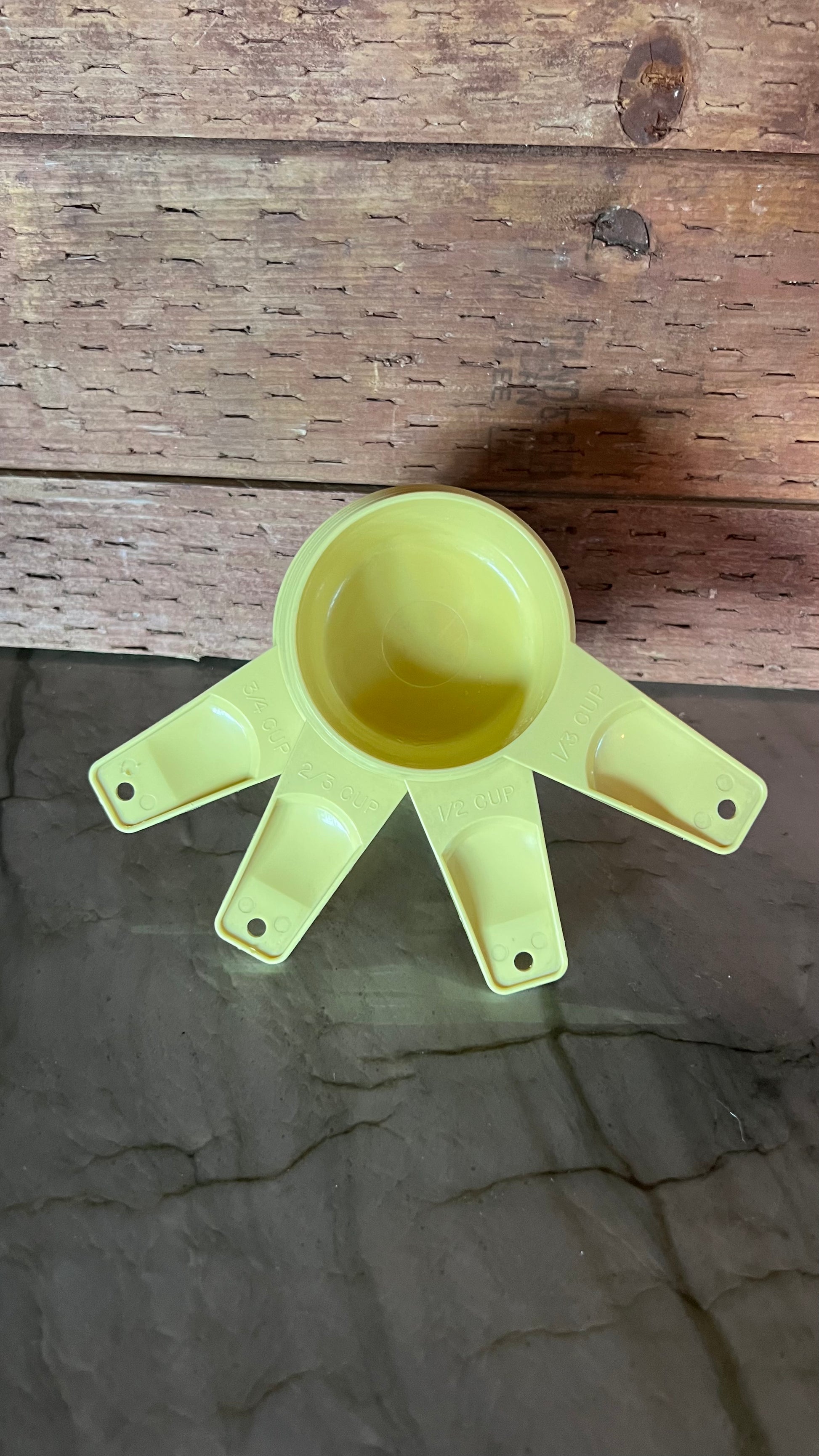 Set of 4 vintage Tupperware measuring cups in harvest gold. Set comes with 1/3c, 1/2c, 2/3c, and 3/4c. Very good vintage condition.