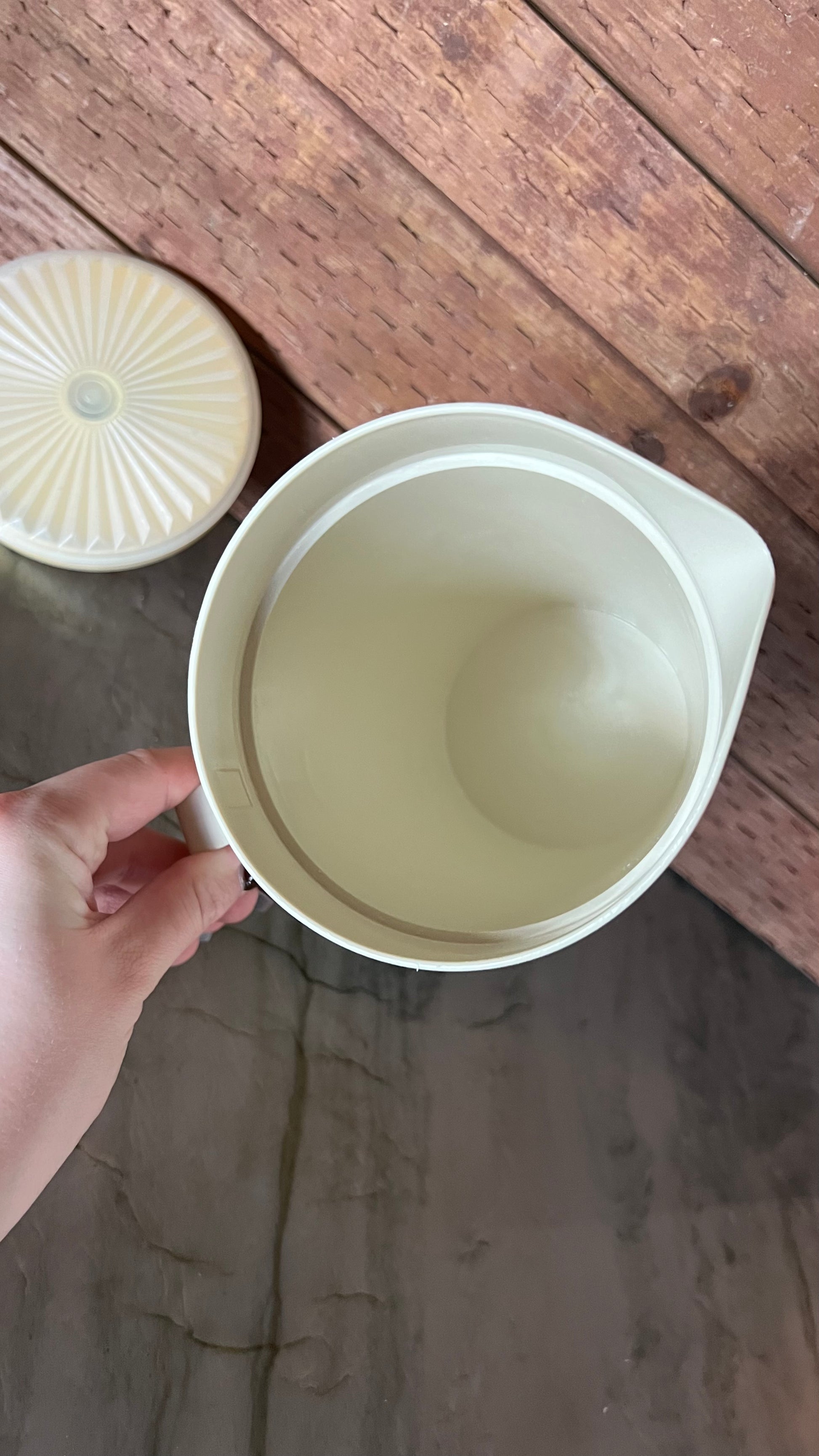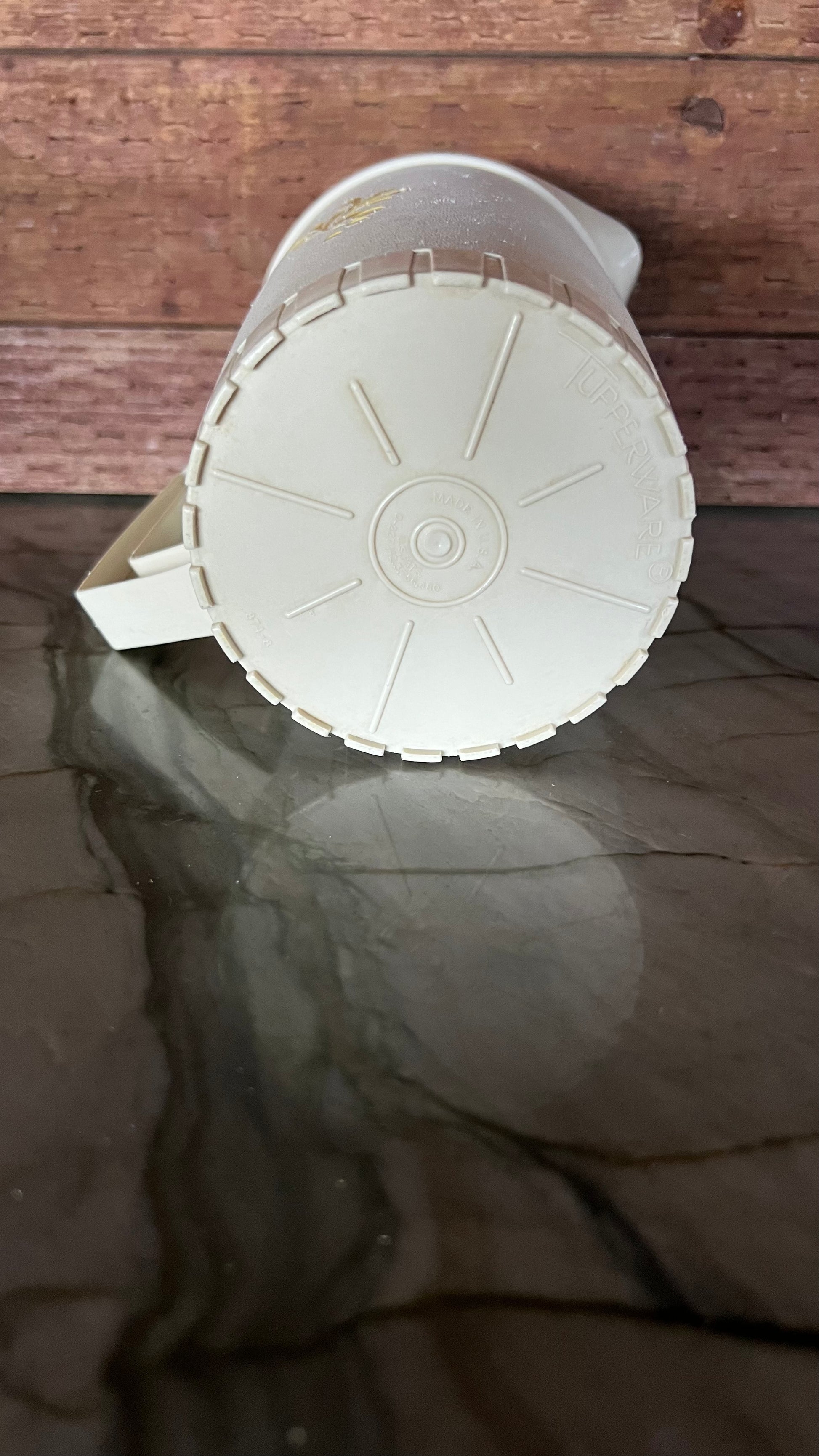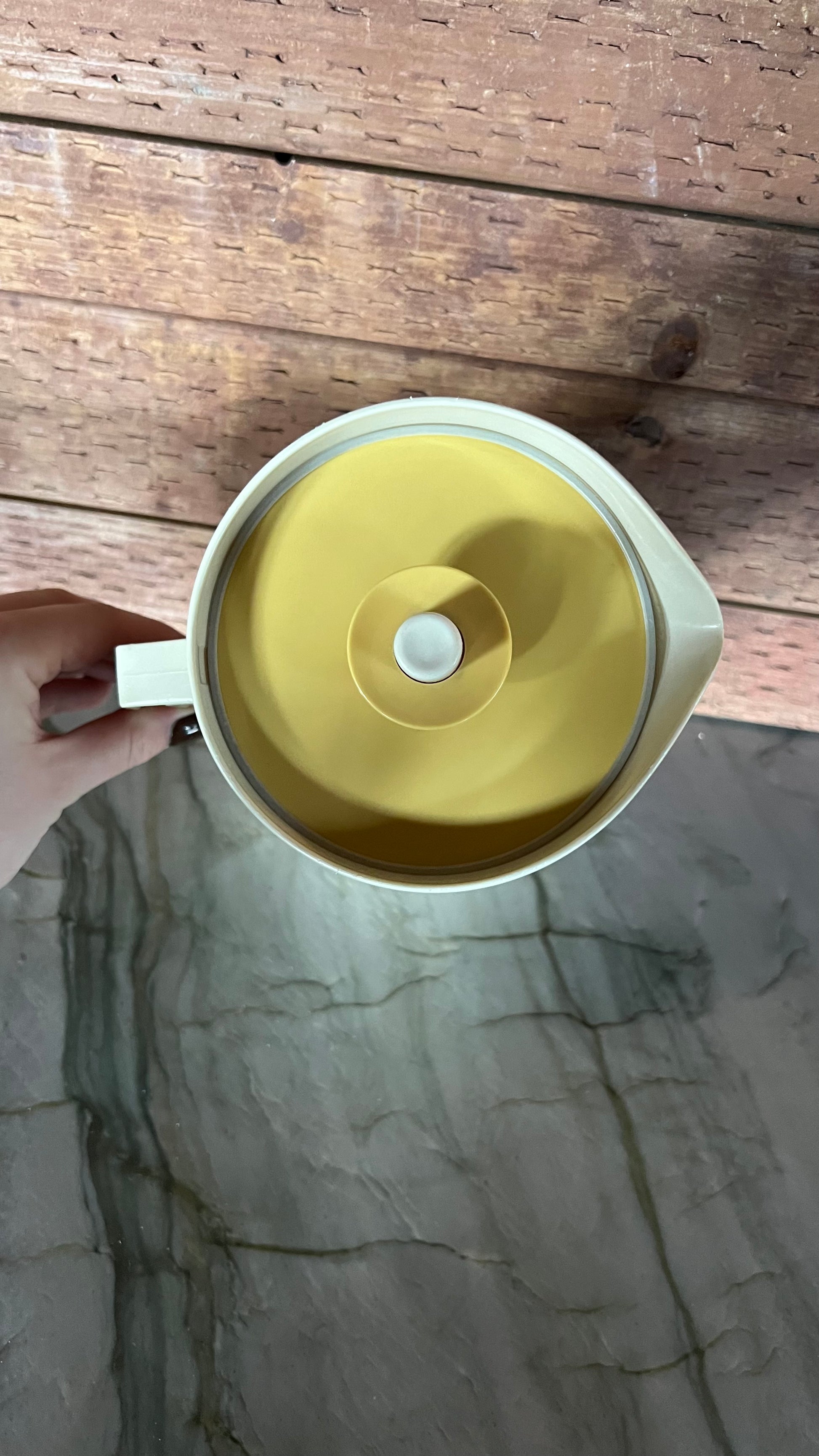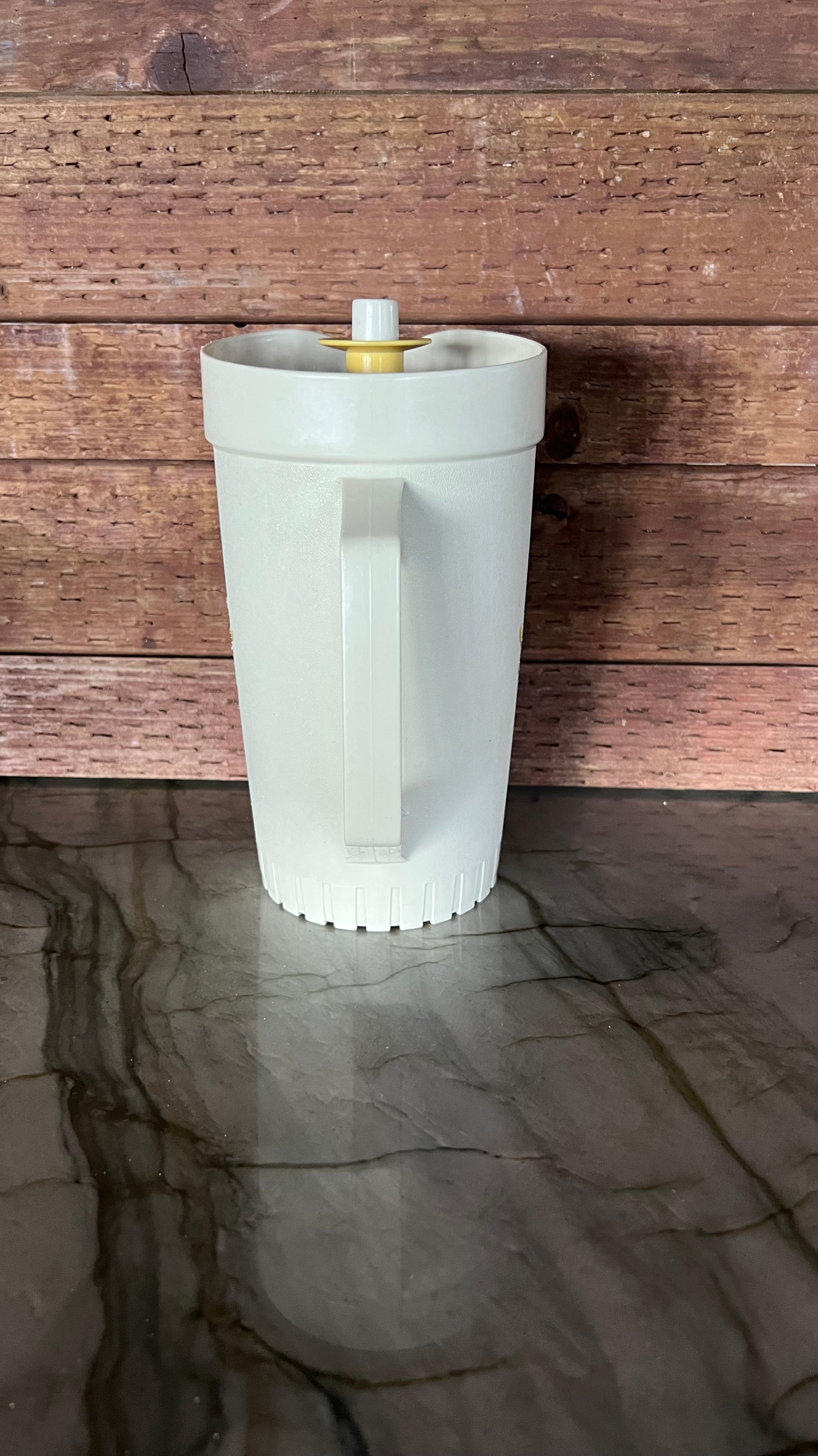 Vintage Tupperware with lid! Almond and harvest gold coloring. Stamped 874-8 on the bottom. In good vintage condition, showing light signs of wear, see pictures for more details. Measures 8.5” tall with a 3.75” diameter at the bottom. 1 quart capacity. Likely form the 1970s!