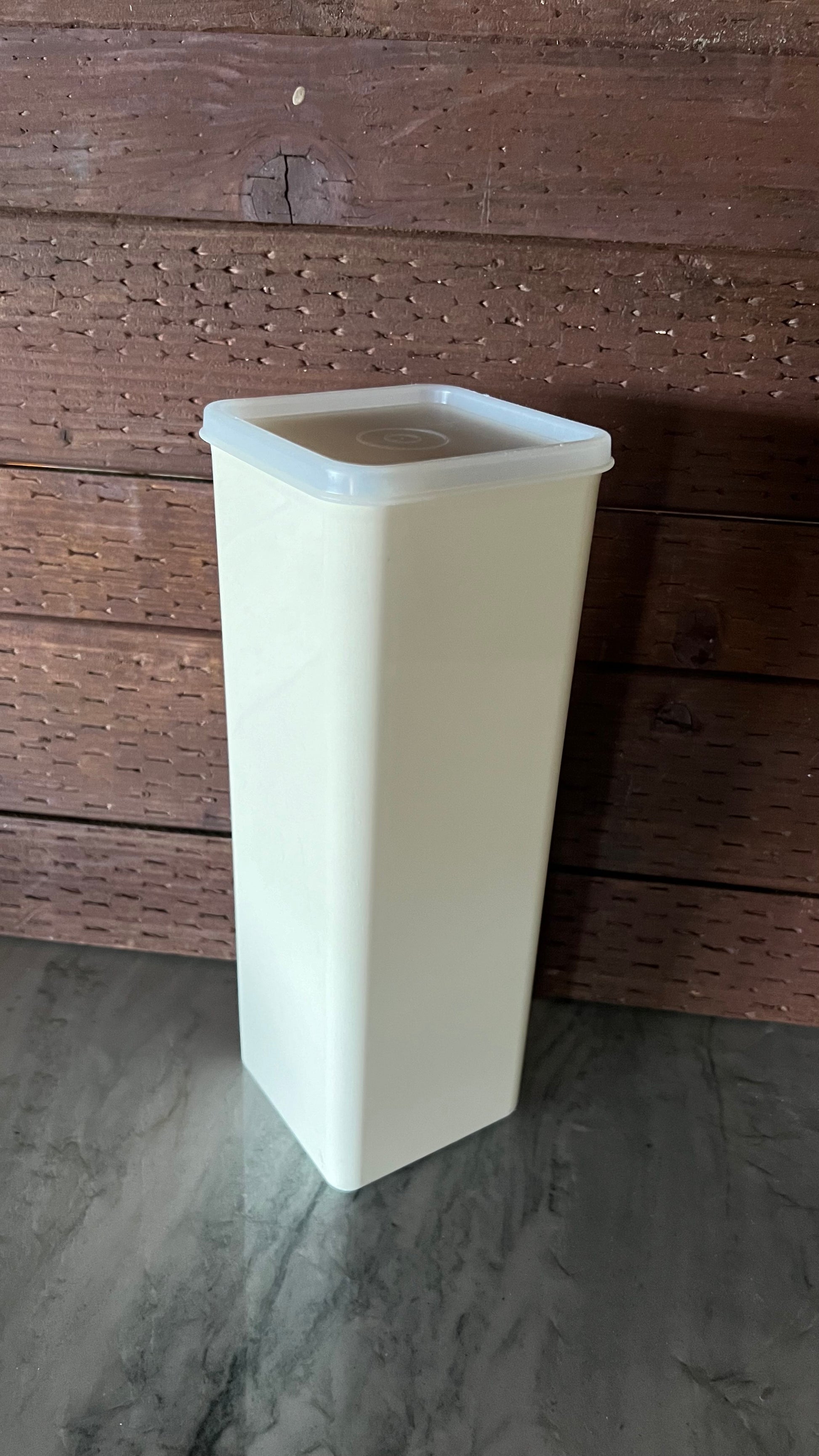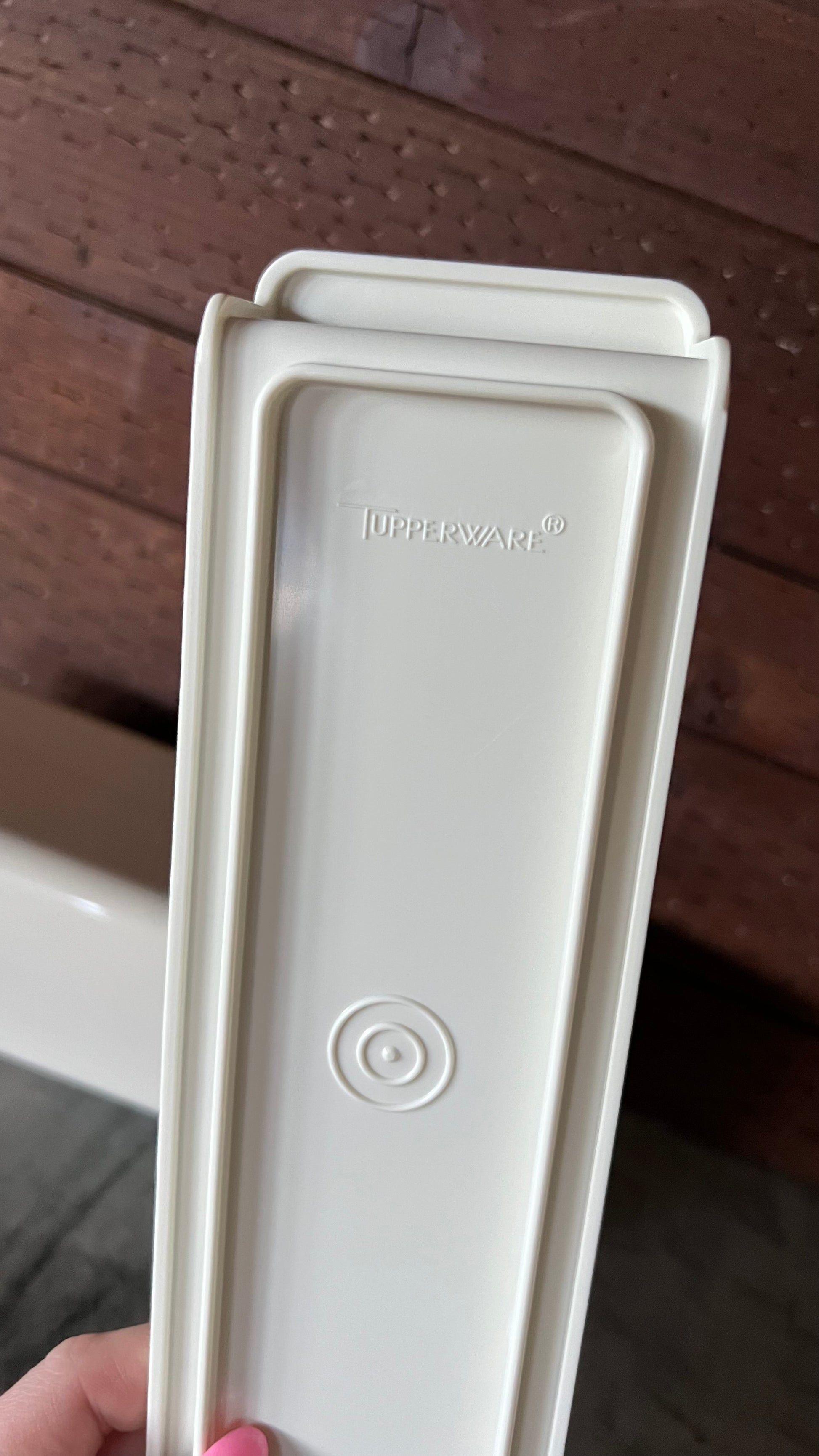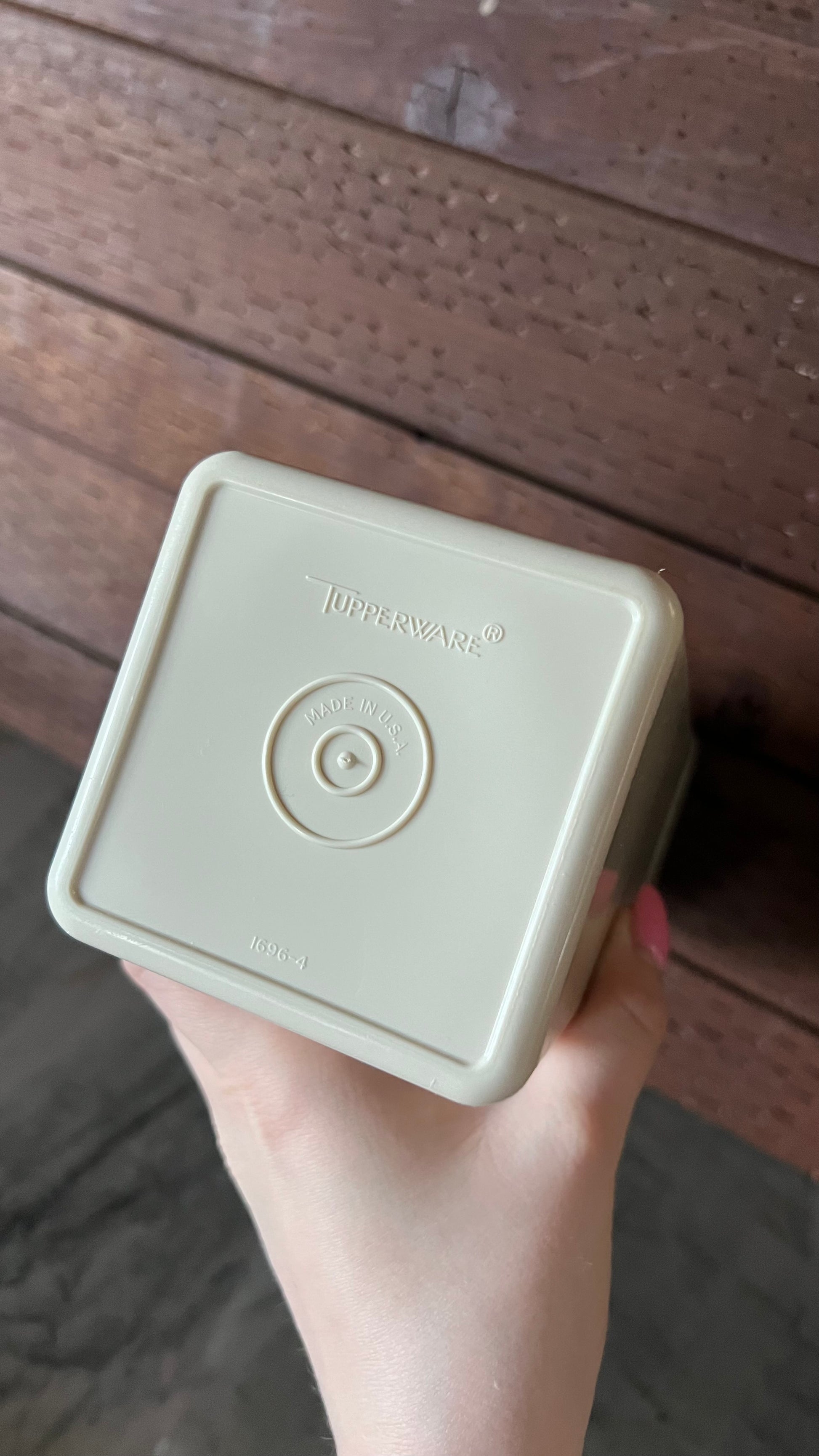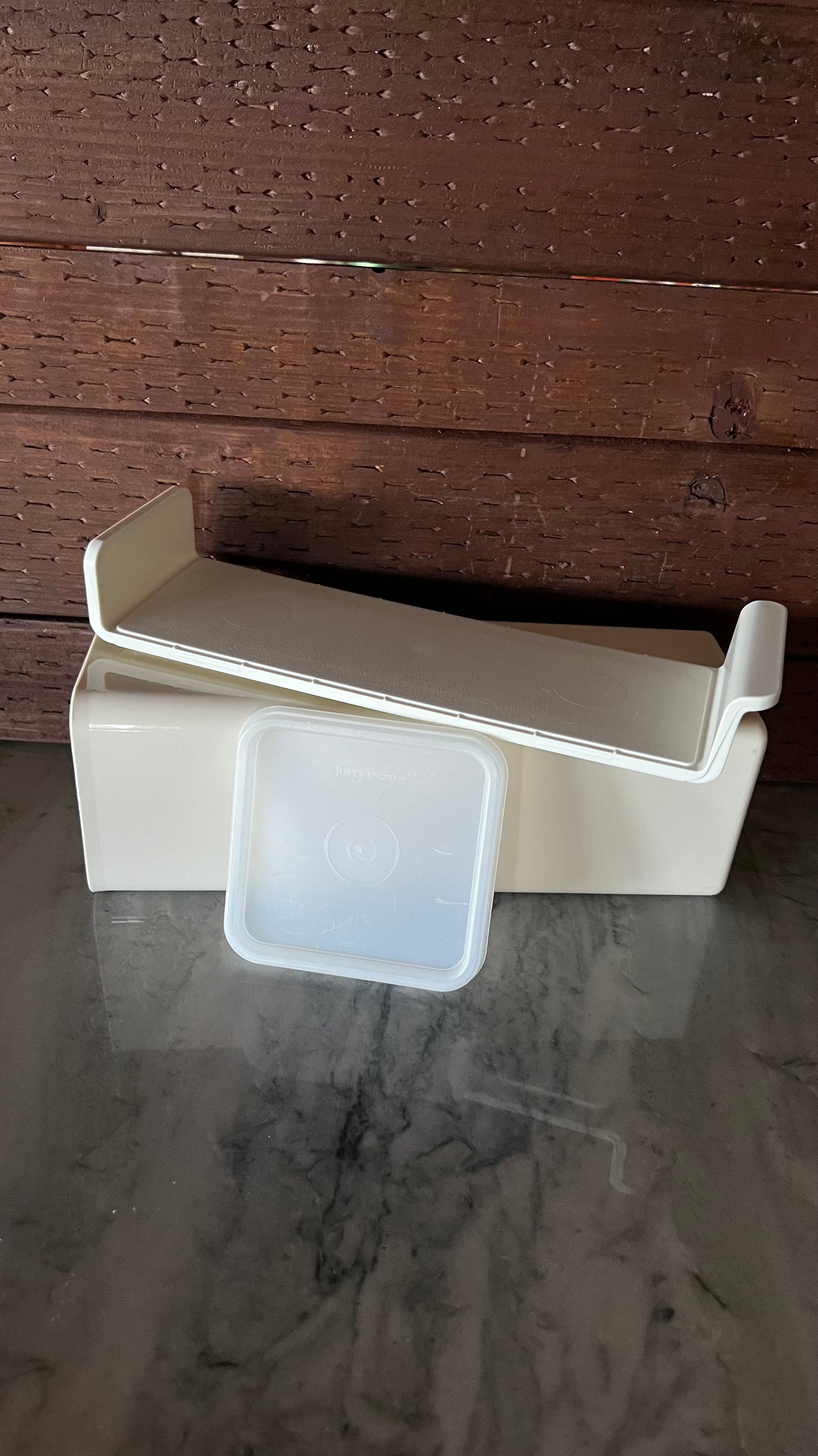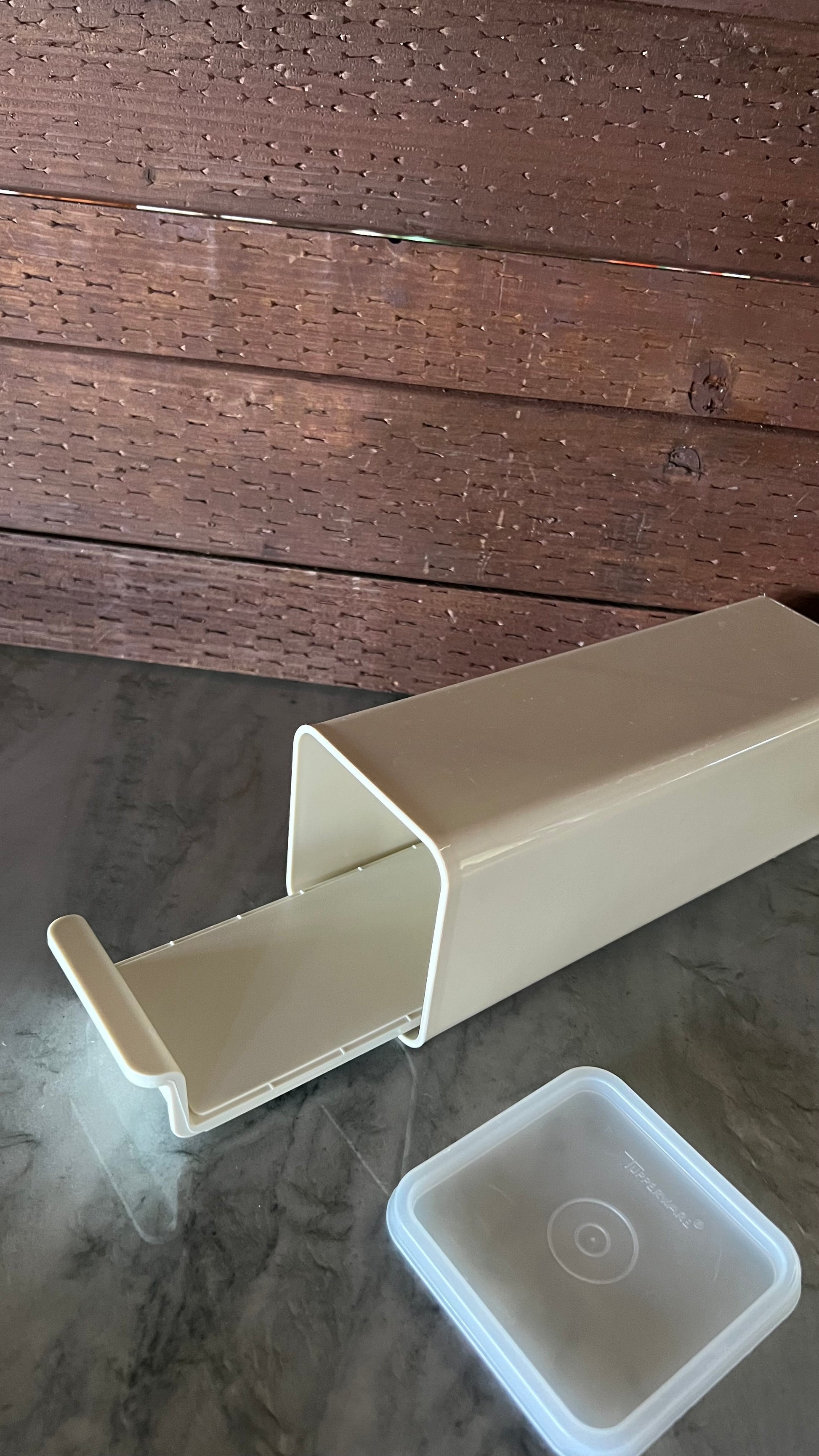 Vintage Tupperware Velveeta cheese holder. This piece comes with the container, a slider, and the lid. Measures 9.5” tall and 3.5” wide. In excellent vintage condition, only showing mild signs of wear.