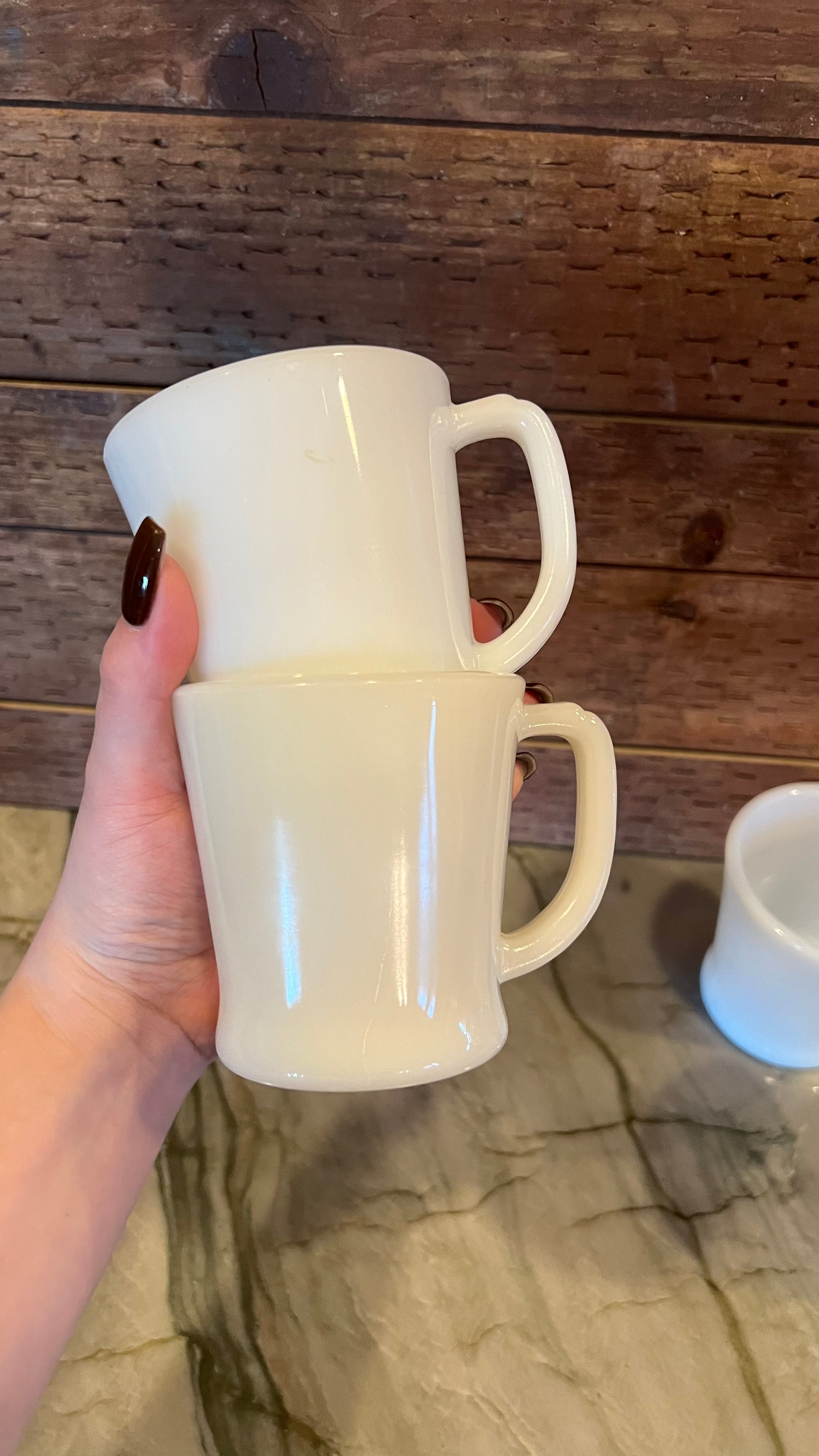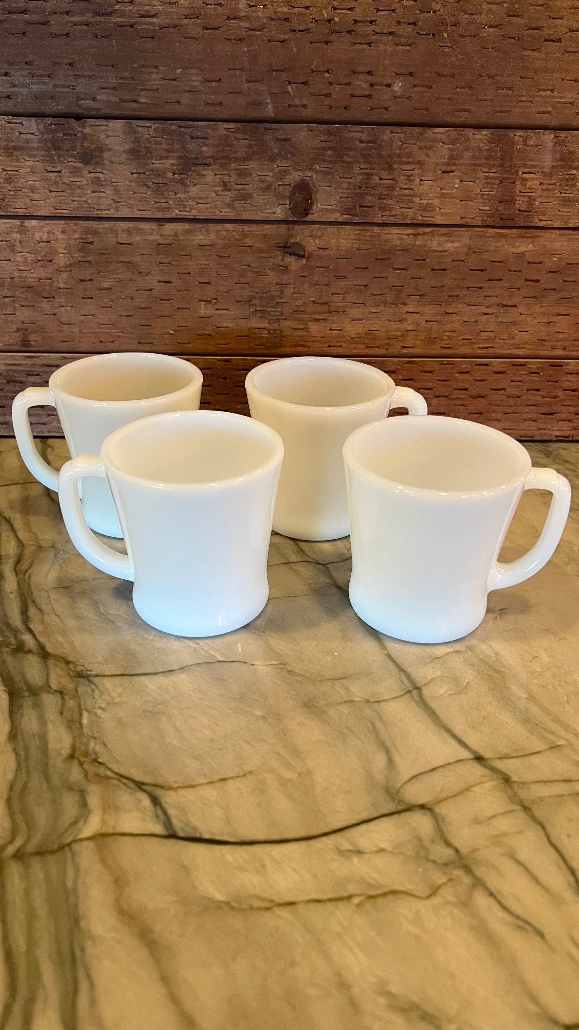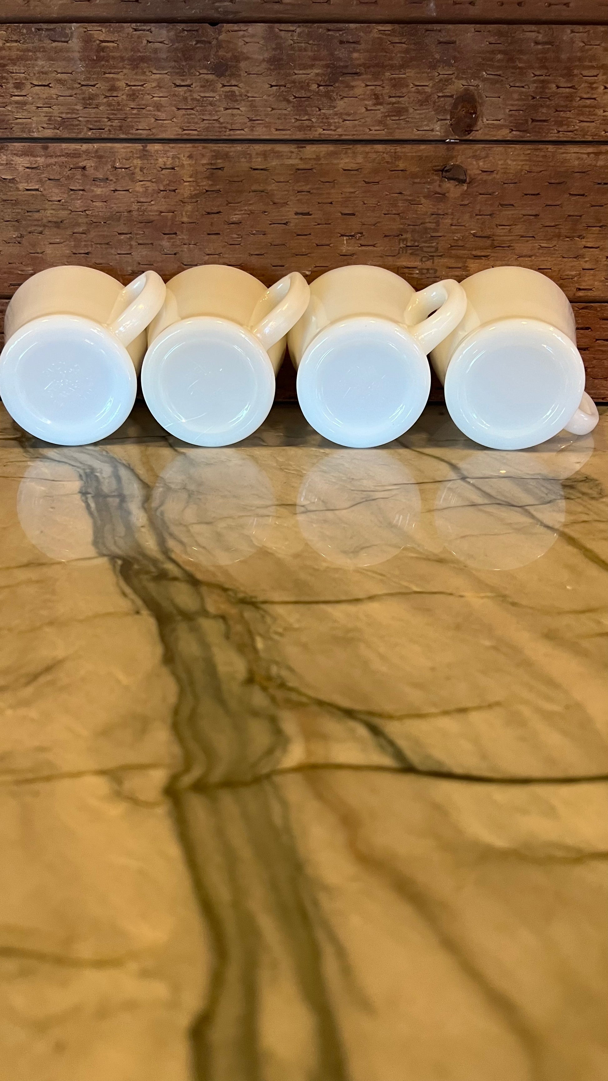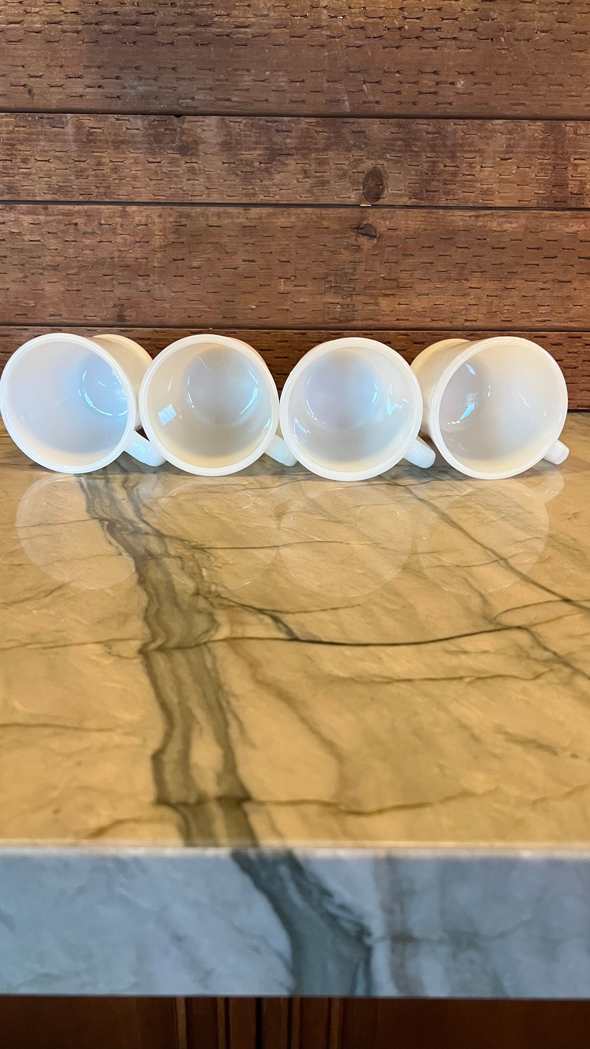 Set of four Fire King milk glass mugs. Likely from the 1950s, in very good vintage condition. One of the mugs is slightly off white compared to the others. Please see photos for comparison. All mugs measure 3.5” tall.