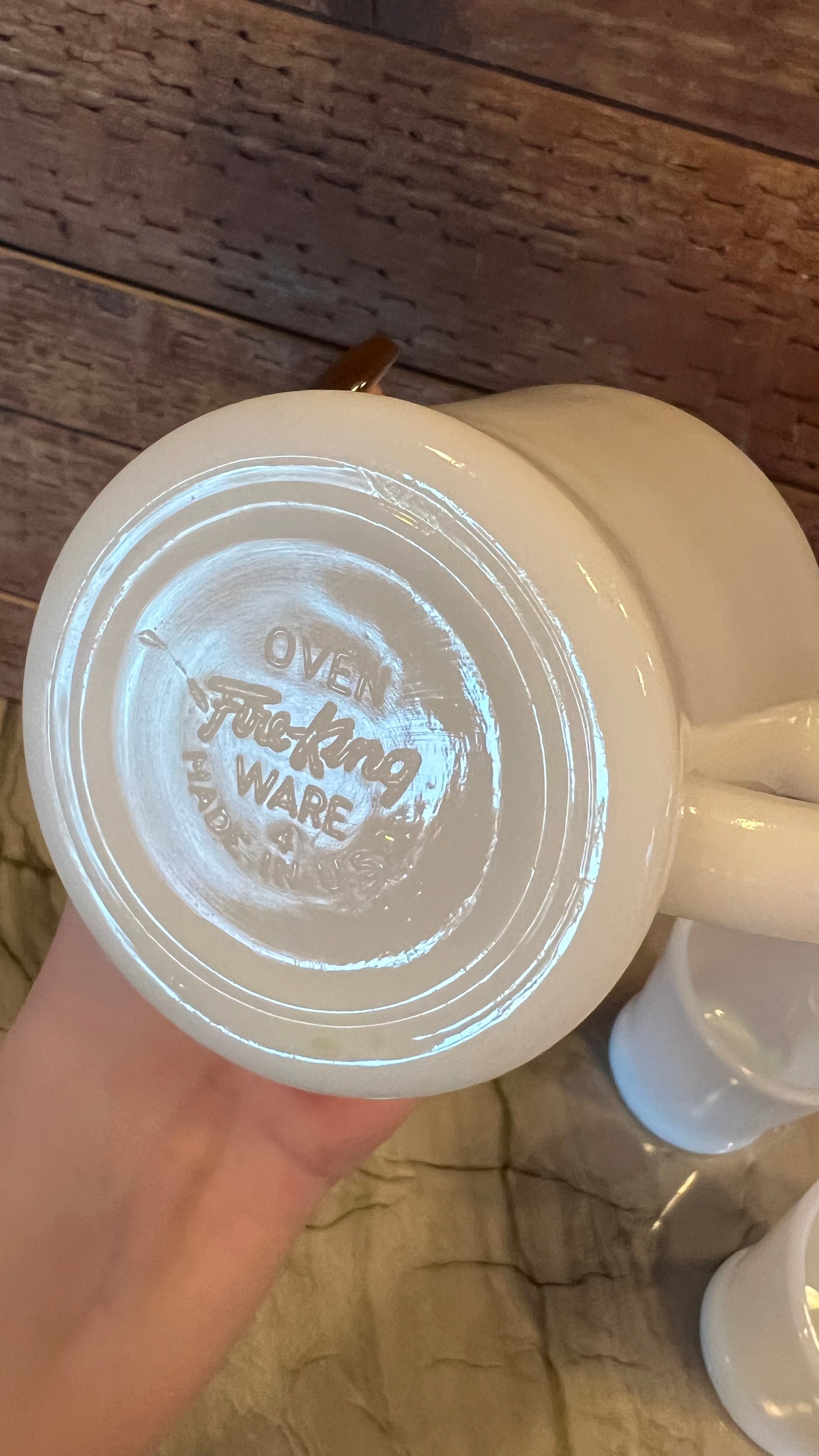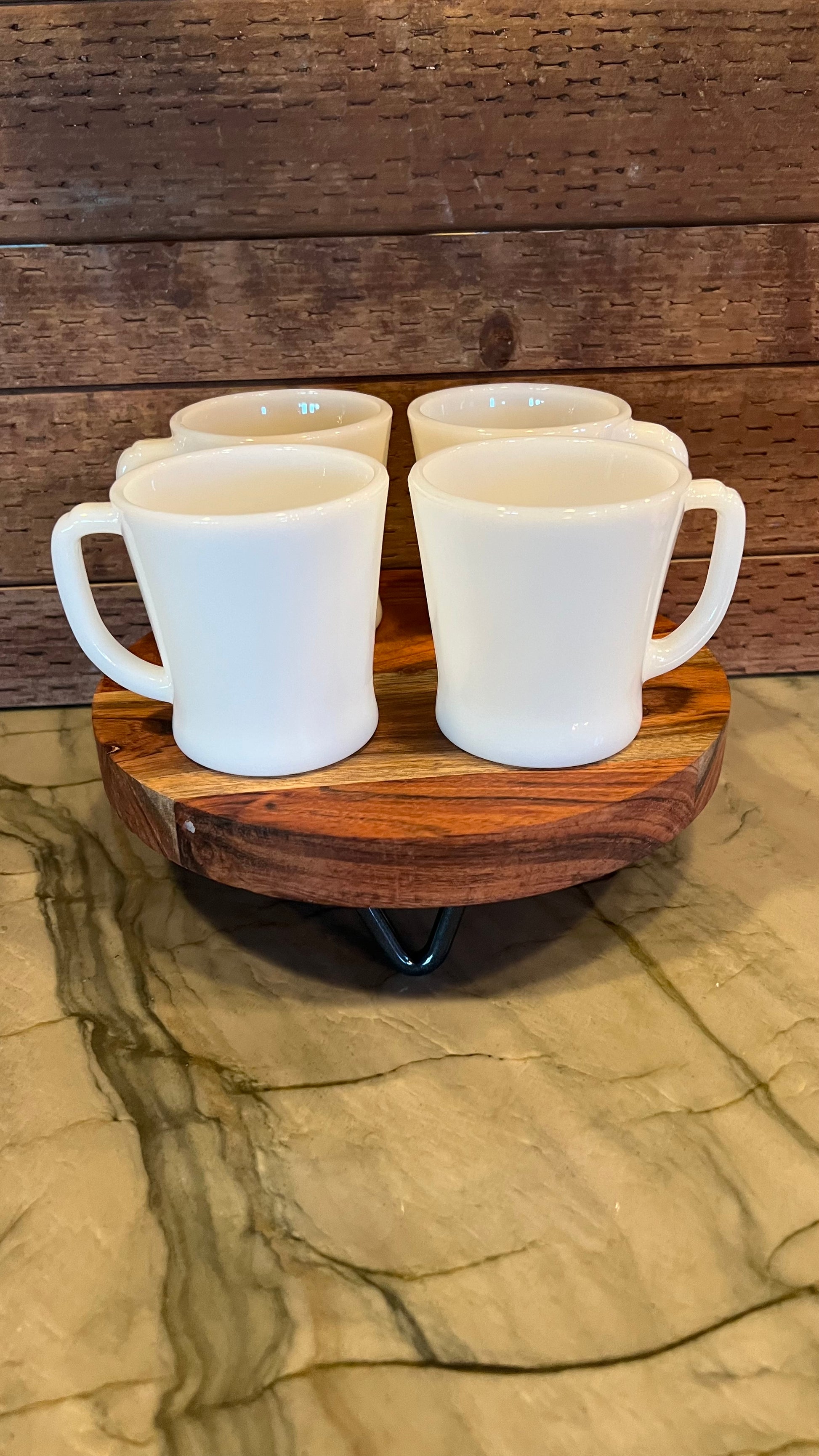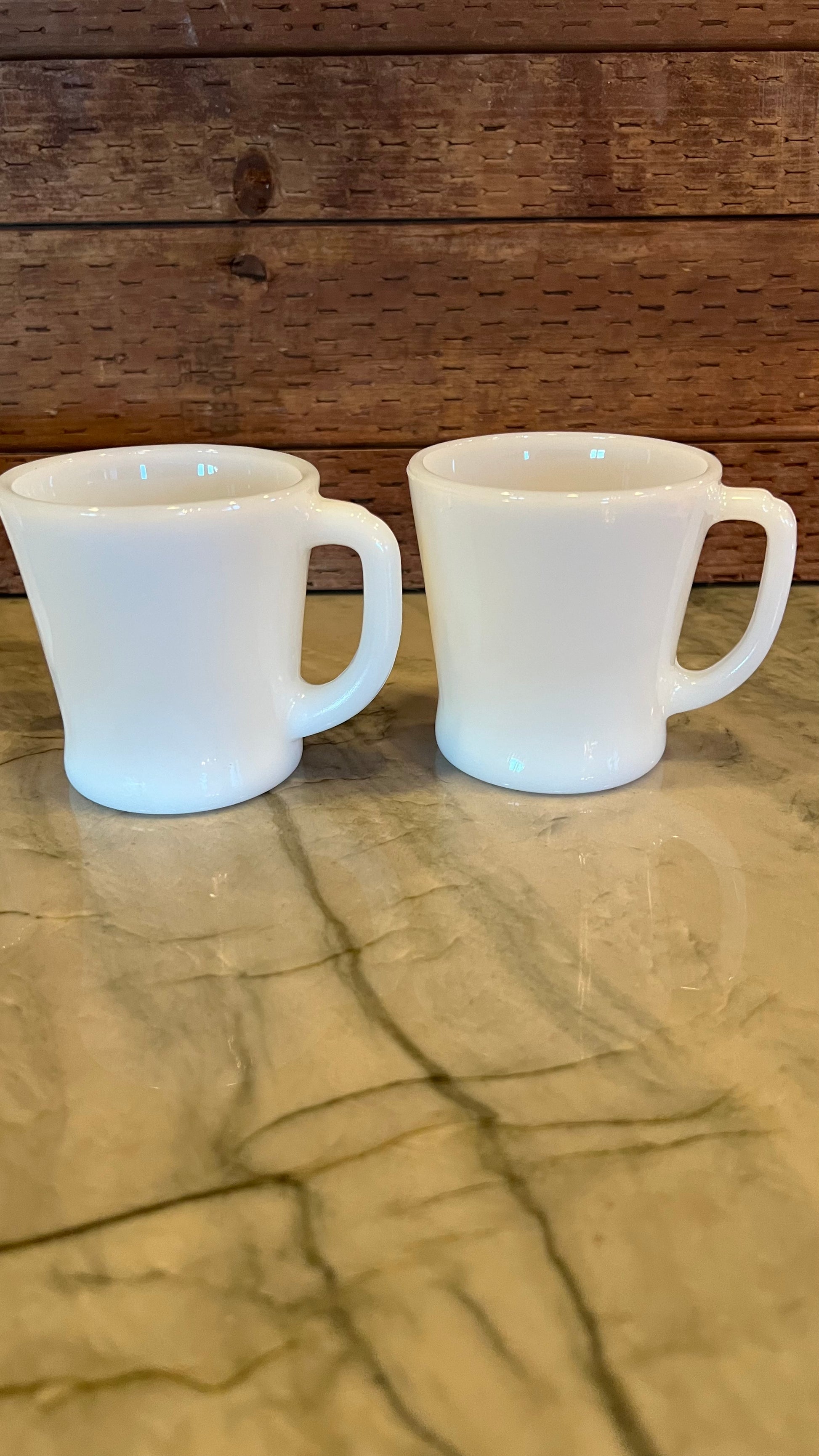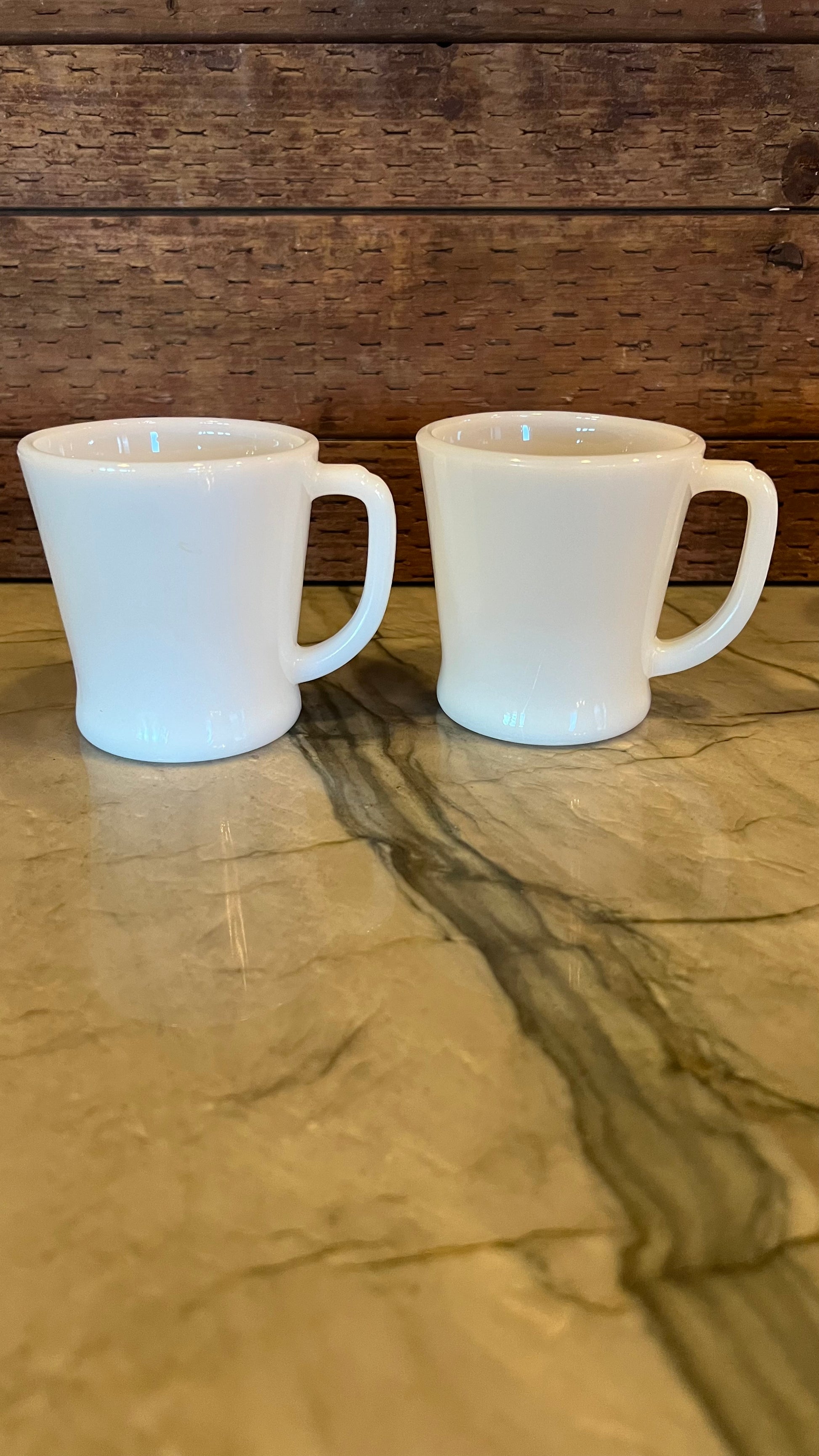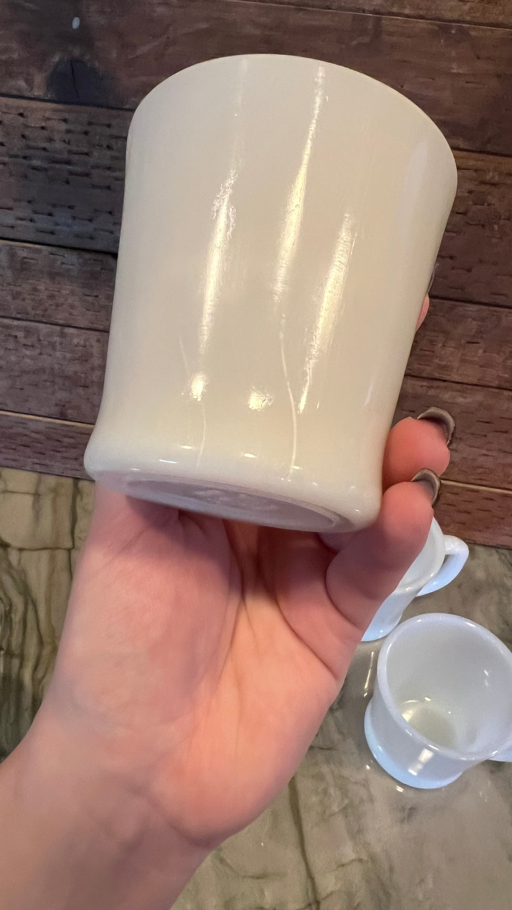 Set of four Fire King milk glass mugs. Likely from the 1950s, in very good vintage condition. One of the mugs is slightly off white compared to the others. Please see photos for comparison. All mugs measure 3.5” tall.