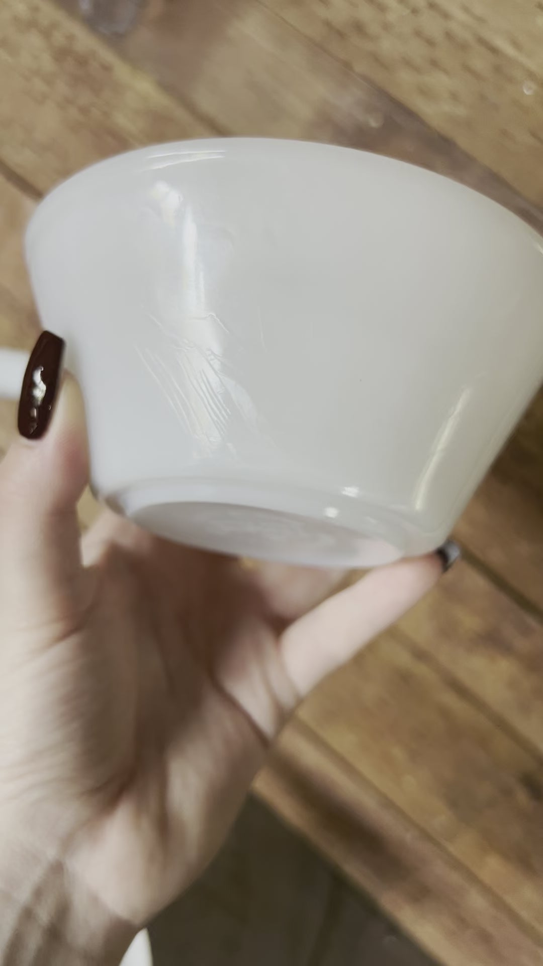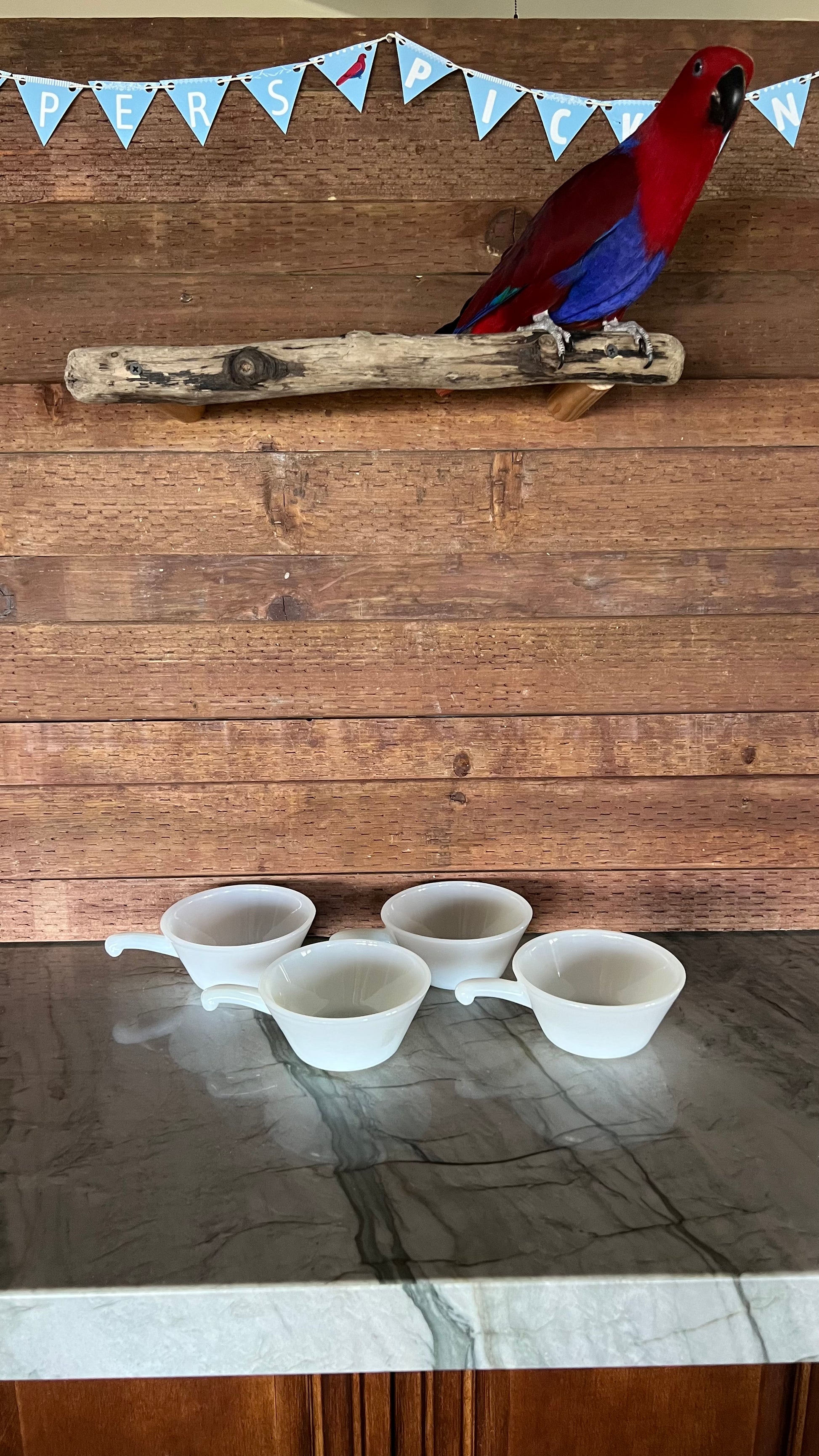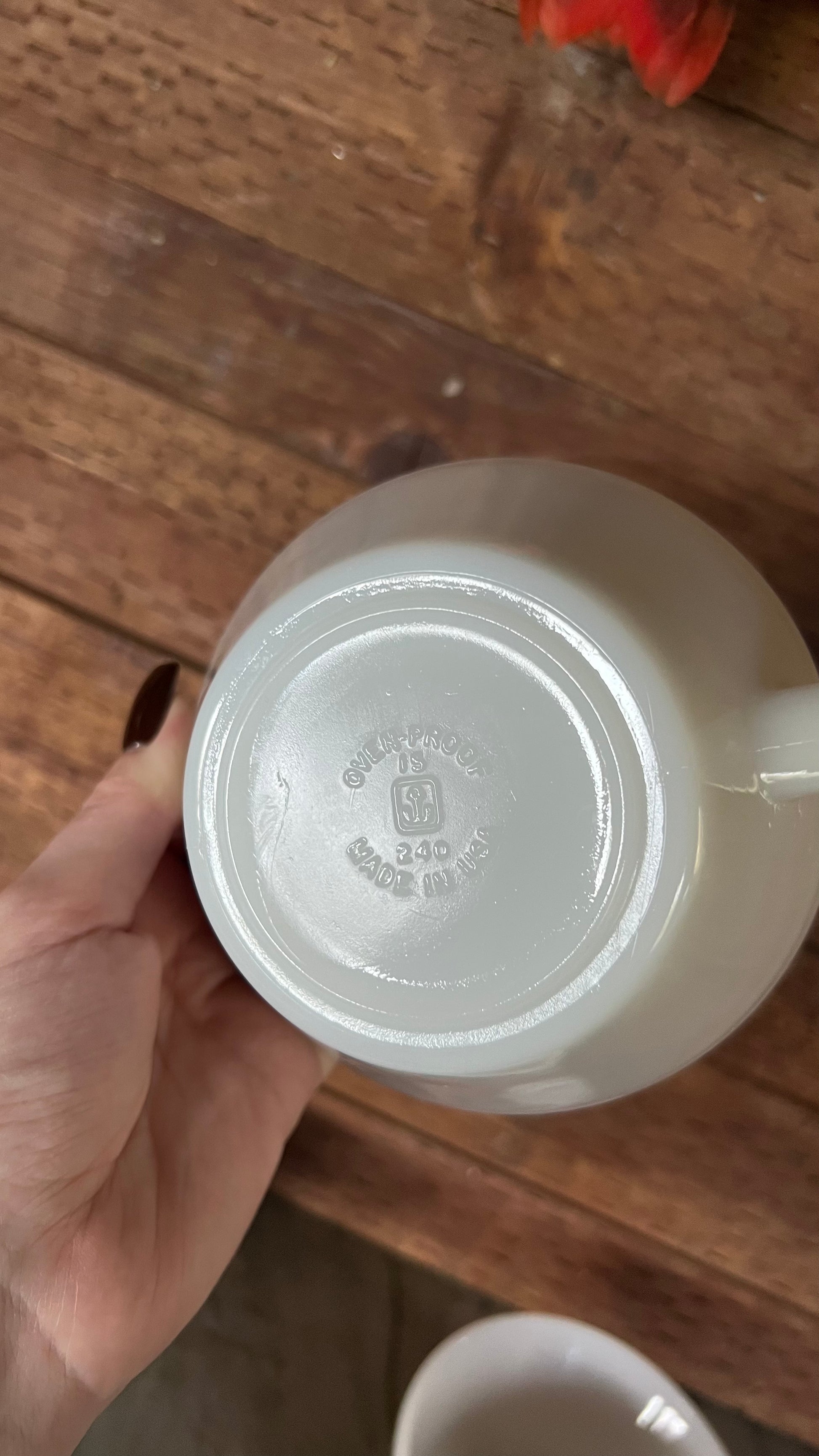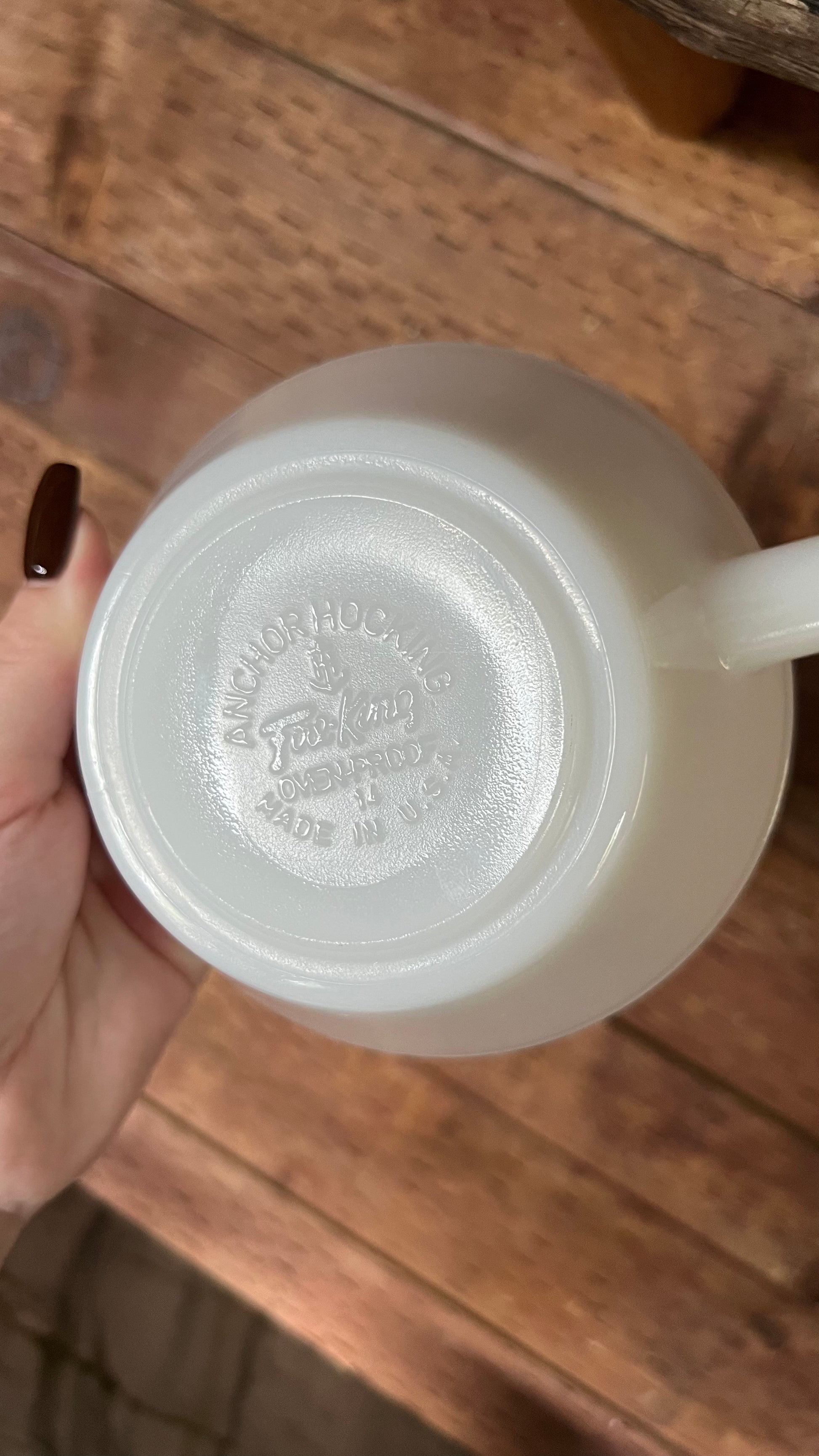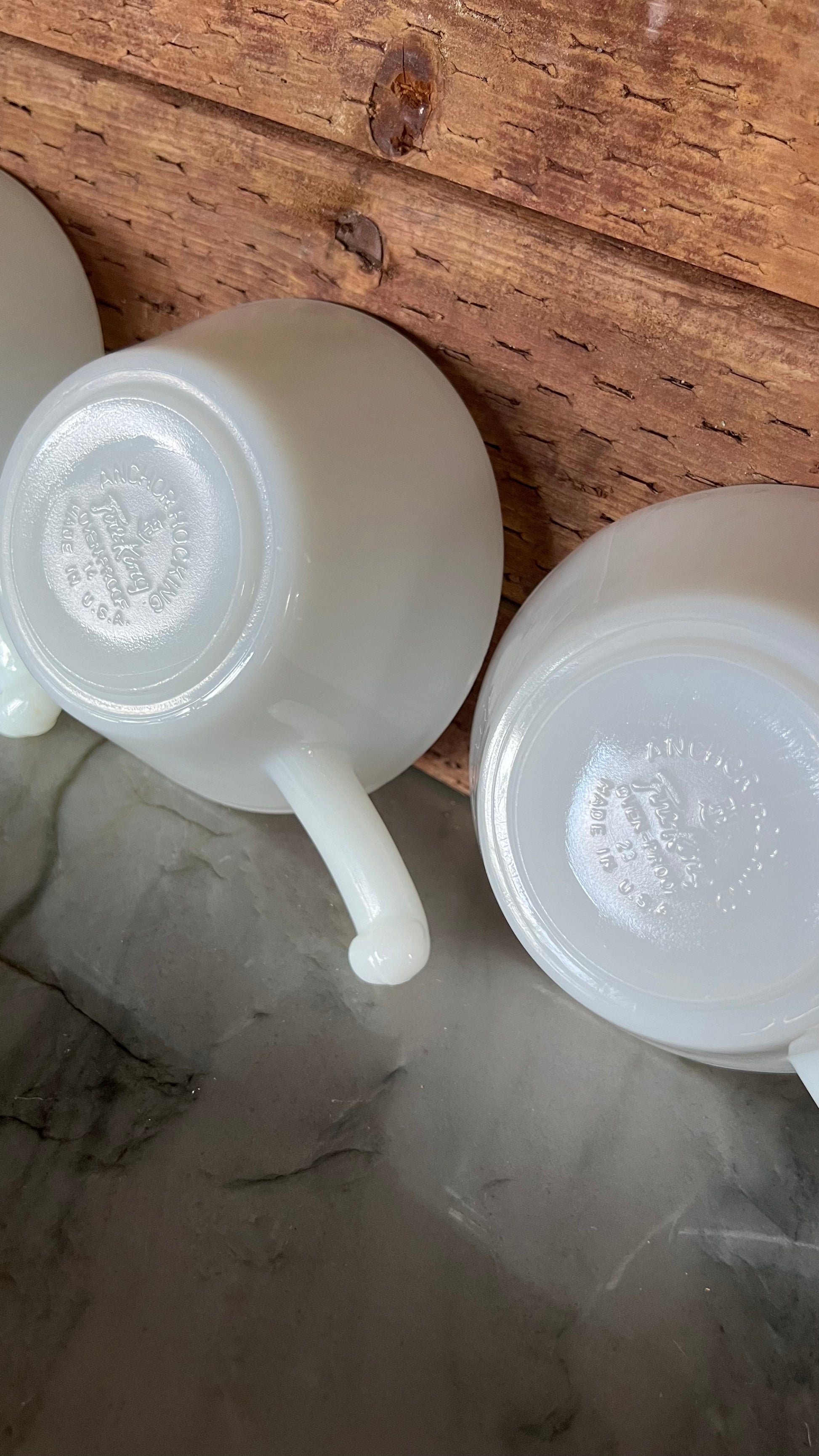 Set of four vintage Anchor Hocking/Fire King milk glass soup bowls. Two have just Anchor Hocking stamps, while the other two have the full Anchor Hocking Fire King stamps. See pictures for comparison. Likely from the 1970s, in excellent vintage condition - one dish has marks from firing, see pictures. Measures 5” across and 2.25” deep. Oven proof!