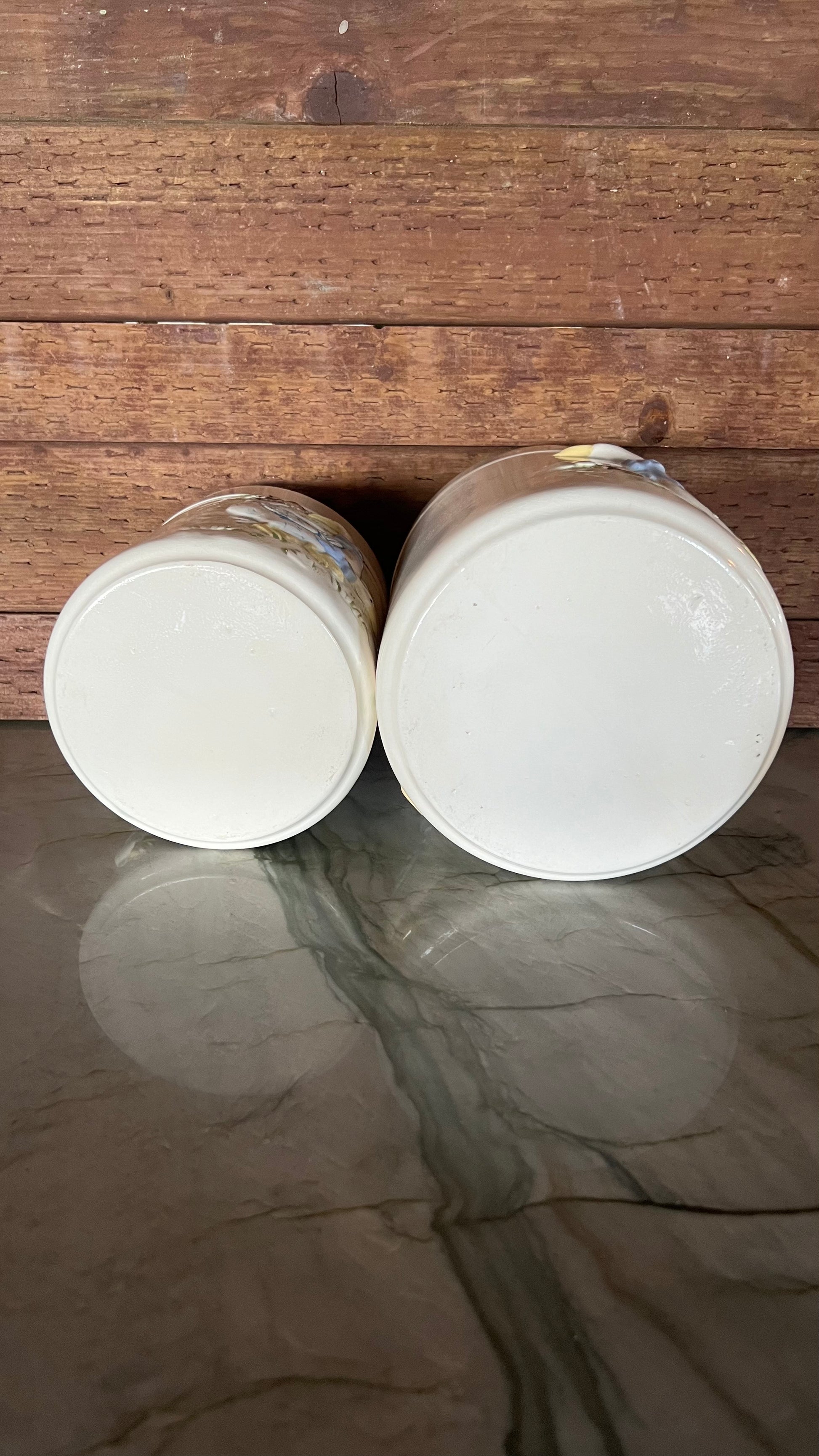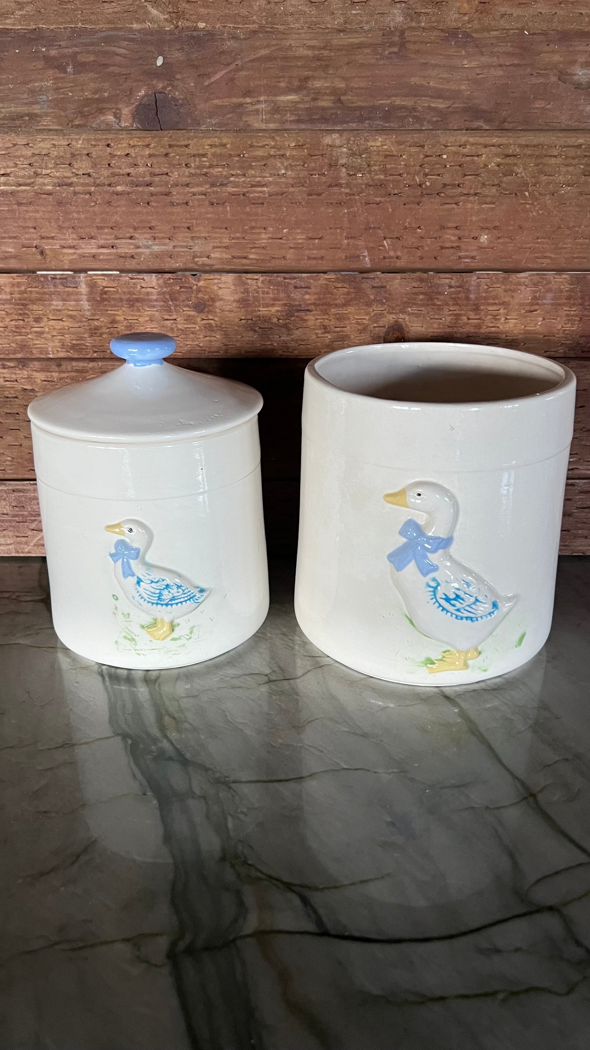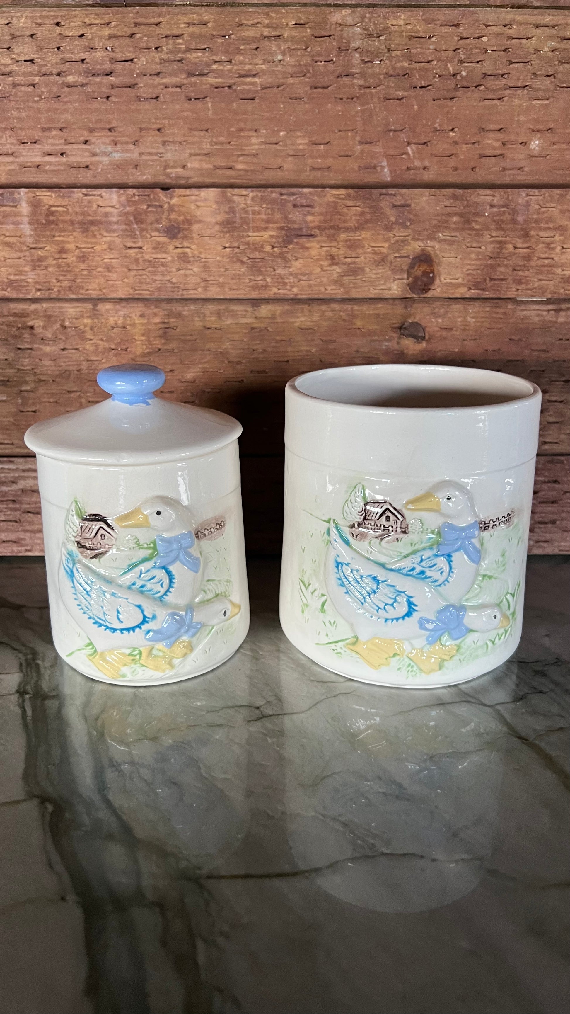 Rare vintage goose canister set with 3D geese and lots of detail! Two lids are missing, but the open canisters can double as utensils holders. All are in very good vintage condition, with a few tiny nips on the paint. Approximate measurements below.