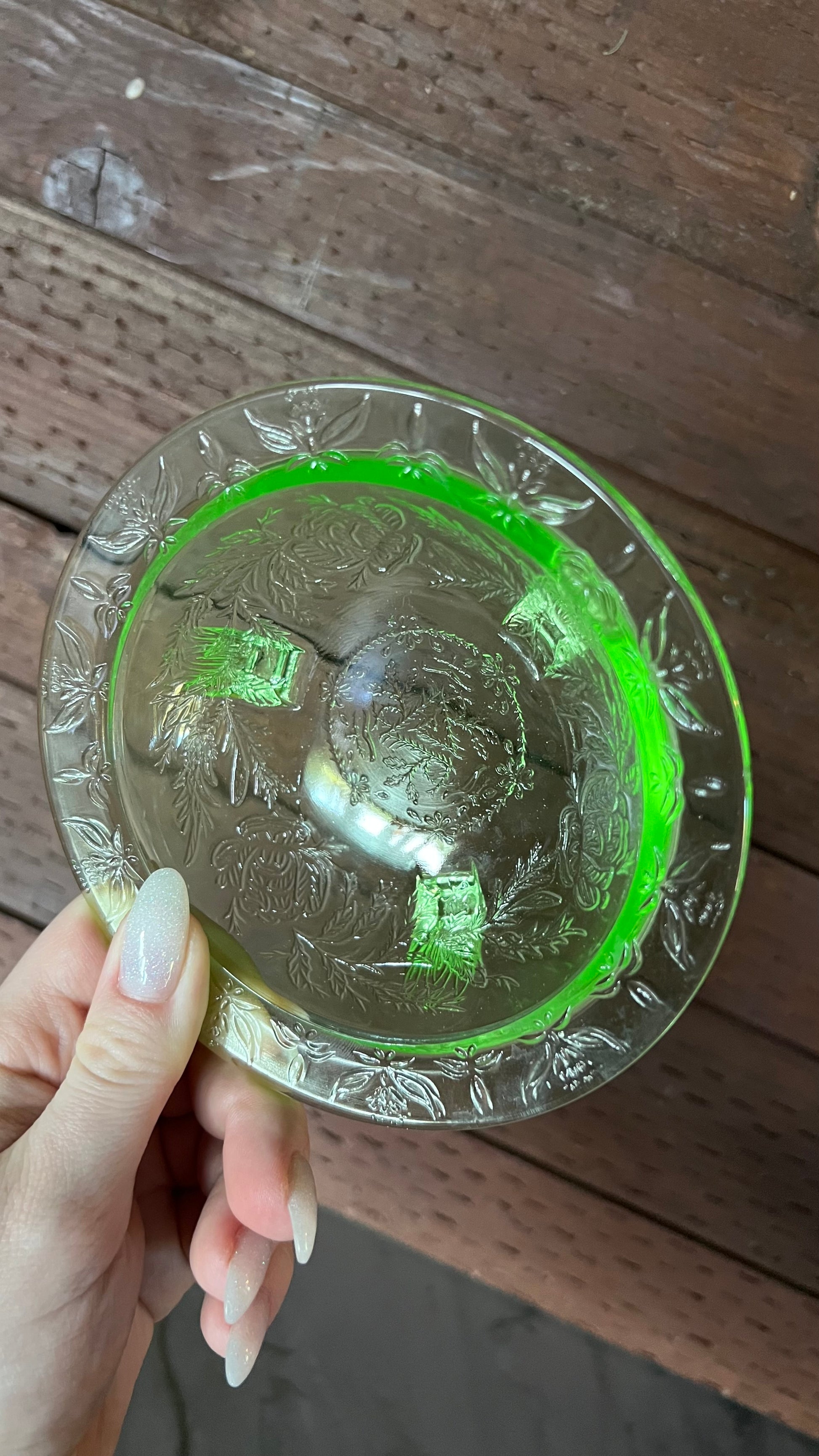 Vintage depression uranium glass bowl. In excellent vintage condition, with no chips or cracks. Measures 1.5” tall with a 5” diameter. The bowl sits on three feet. And yes, it glows under a black light!
