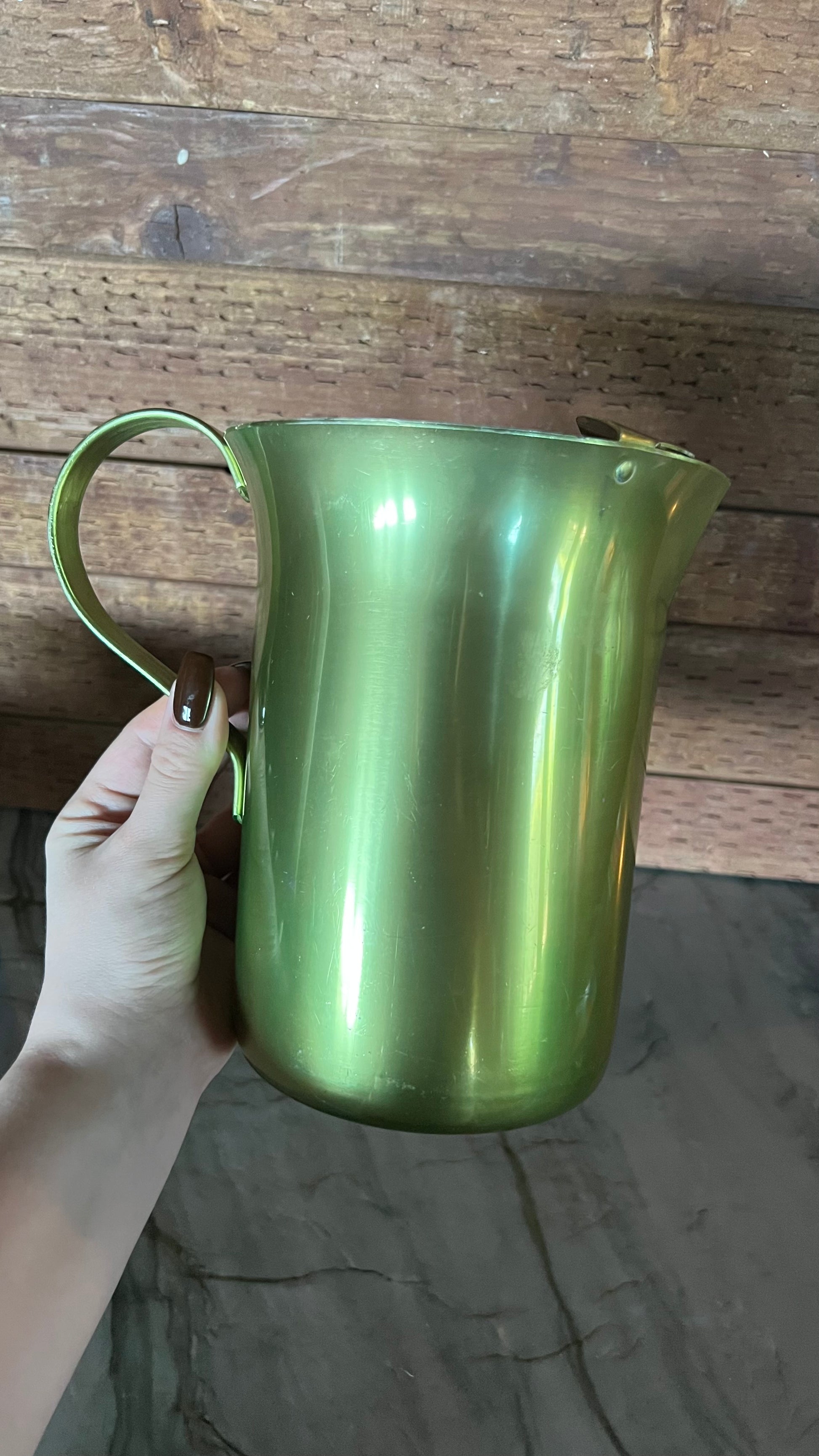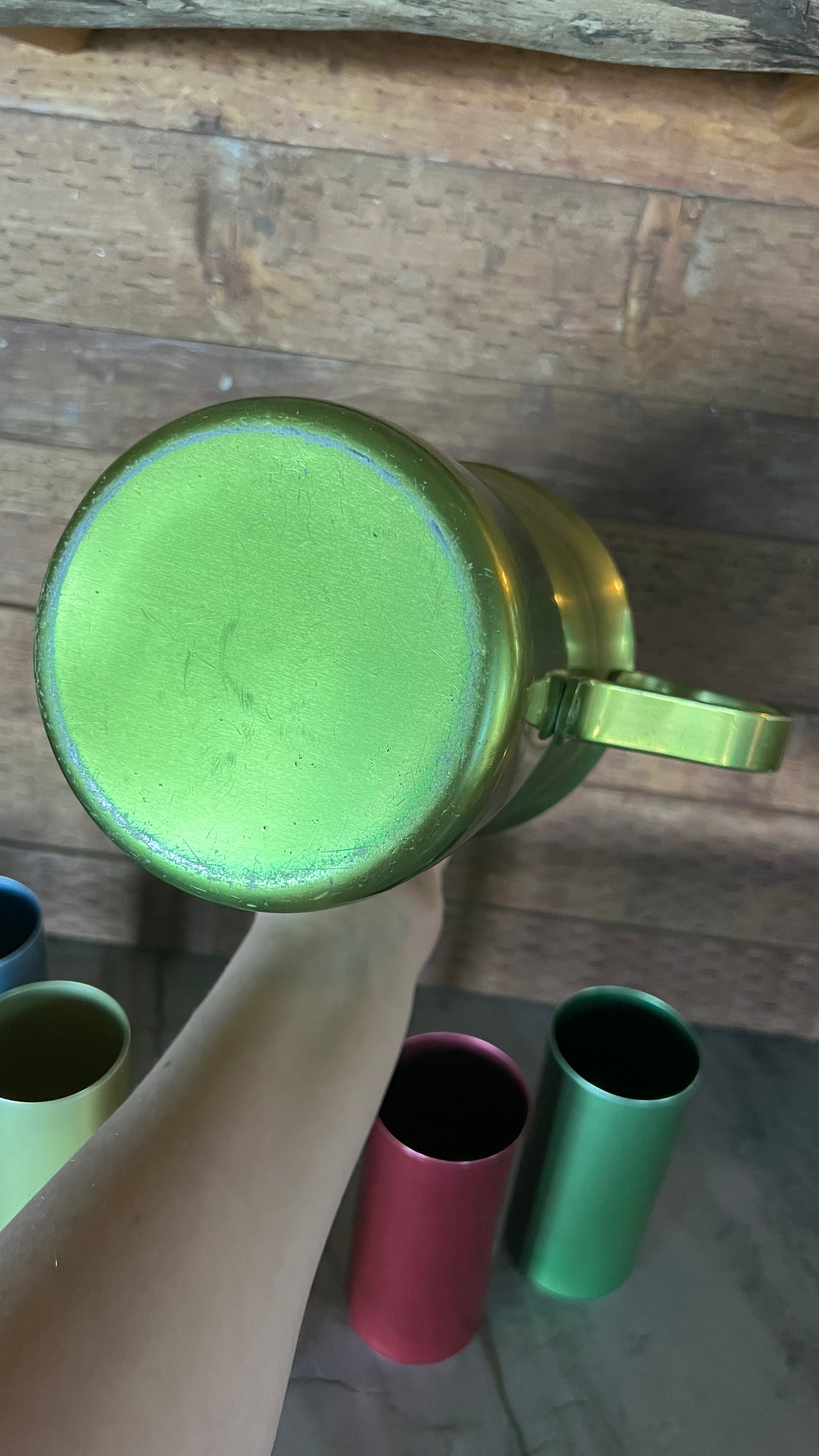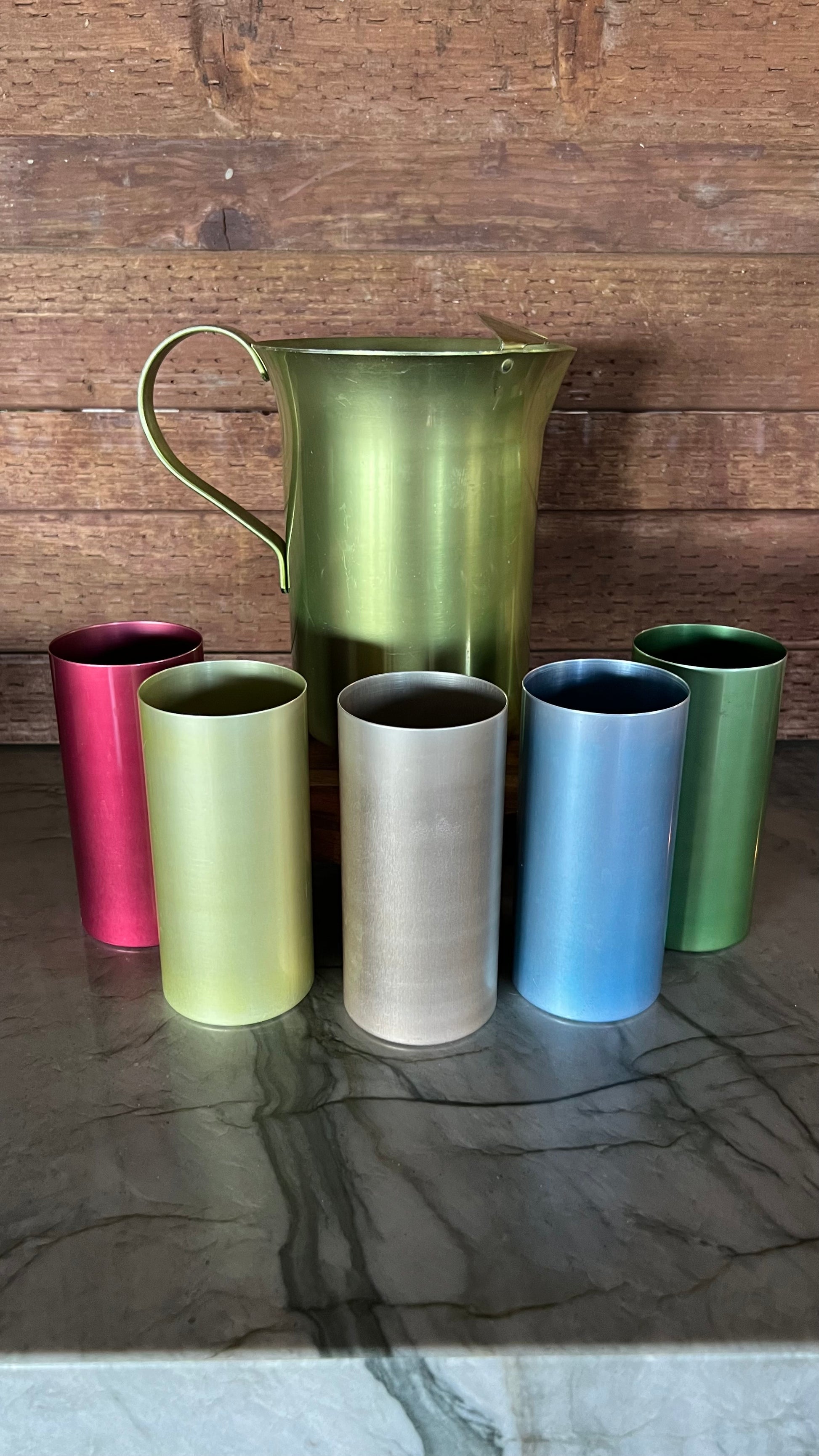 Beautiful vintage aluminum drink ware set, including a pitcher, and five cups. The pitcher measures 4.5” in diameter at the base, and 7.25” tall. The cups measure 2.5” in diameter and 5.25” tall. All pieces are in good vintage condition, colors are nice and vibrant, but do show some signs of wear.