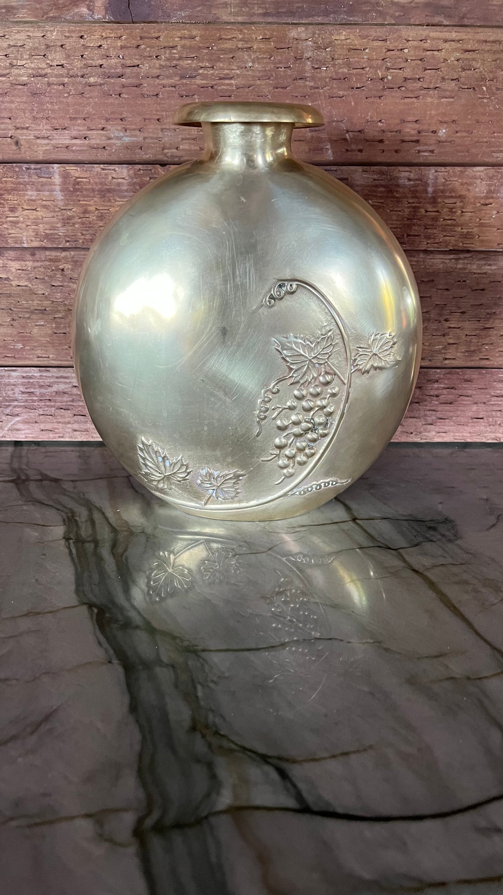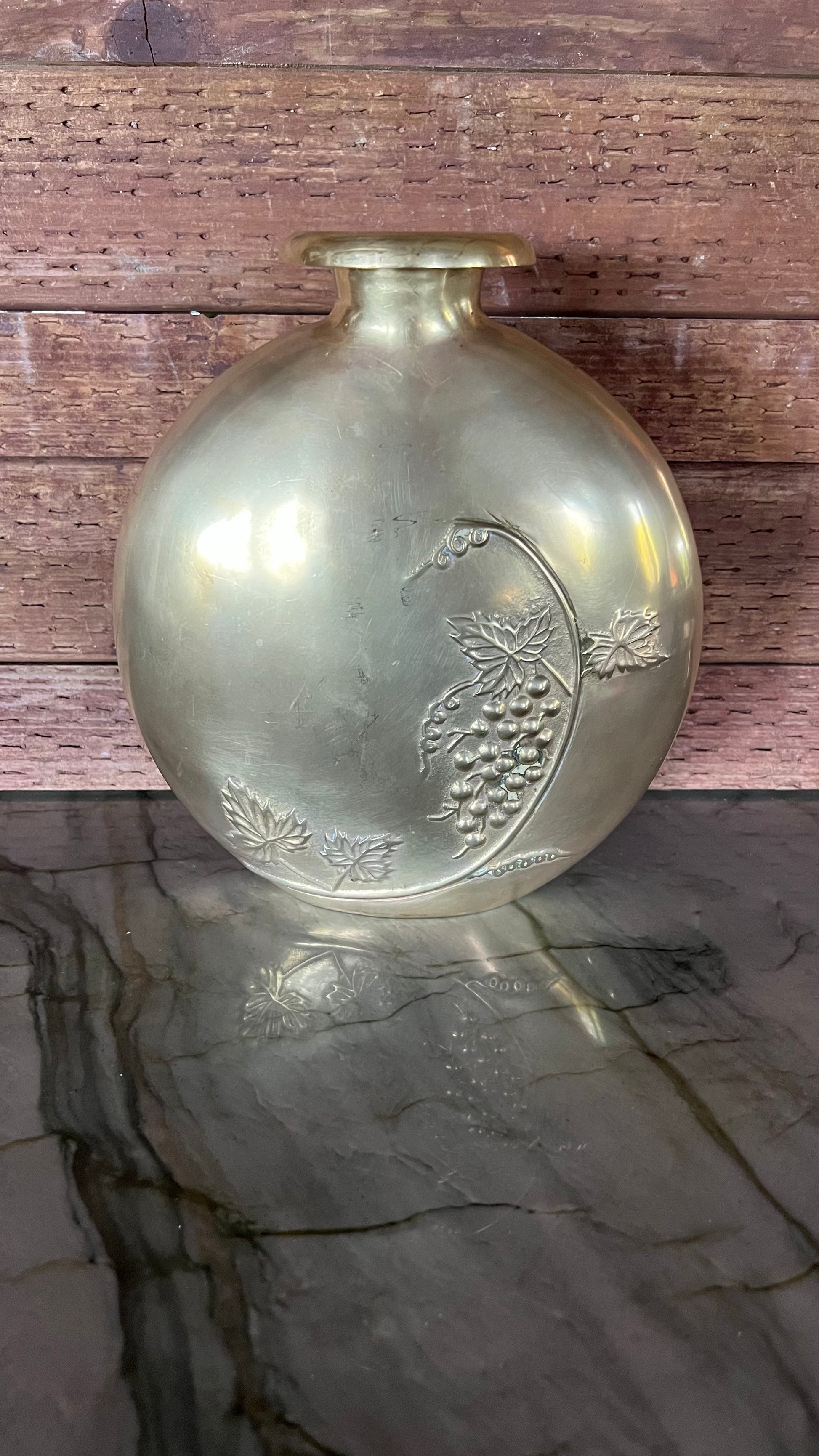 Beautiful, heavy vintage brass flat vase, with grape design on both sides. Likely from the 1970s. Measures approximately 9.35” tall with a 3.25” diameter at the top. Very good vintage condition, showing signs of light surface wear.
